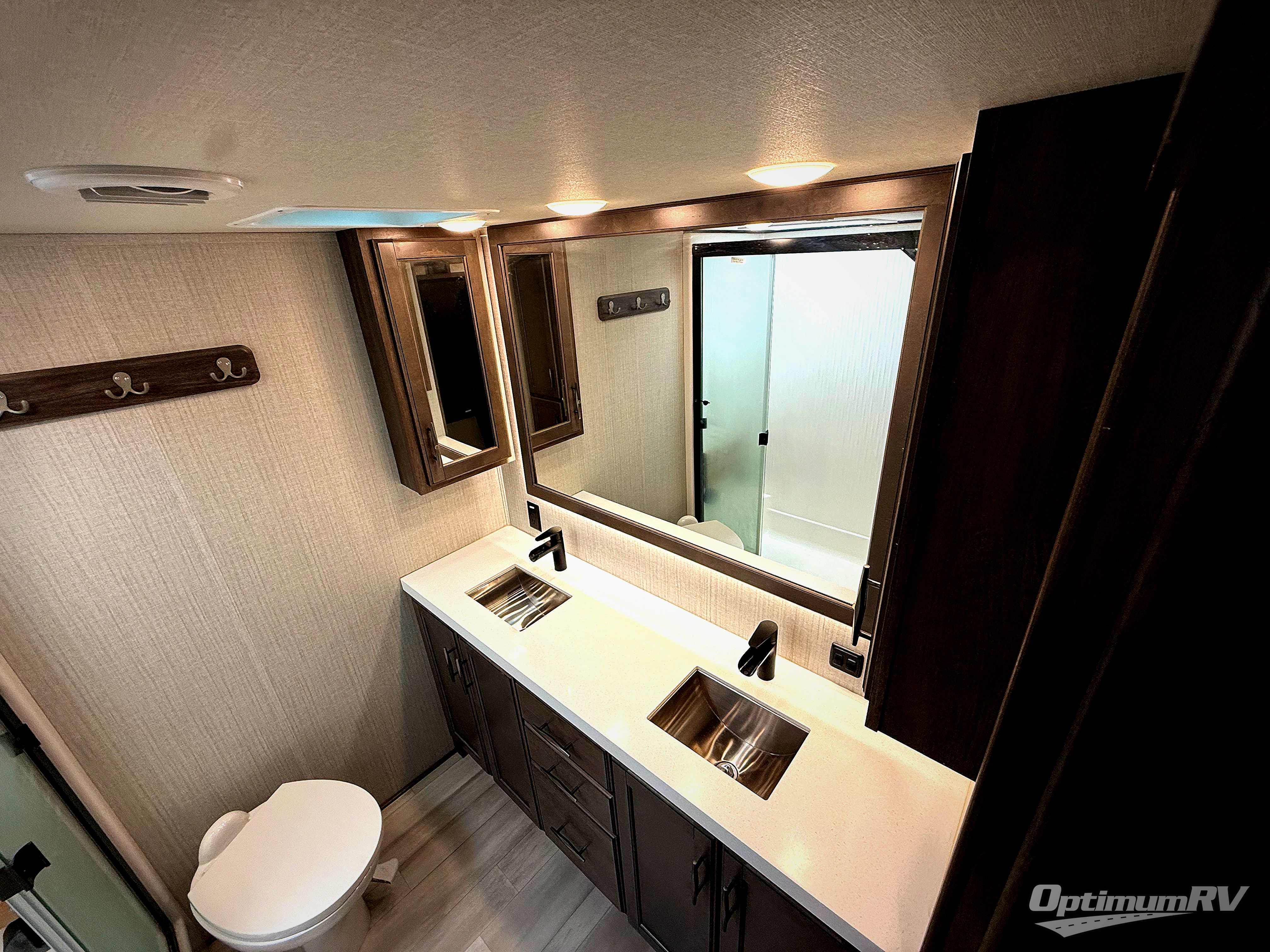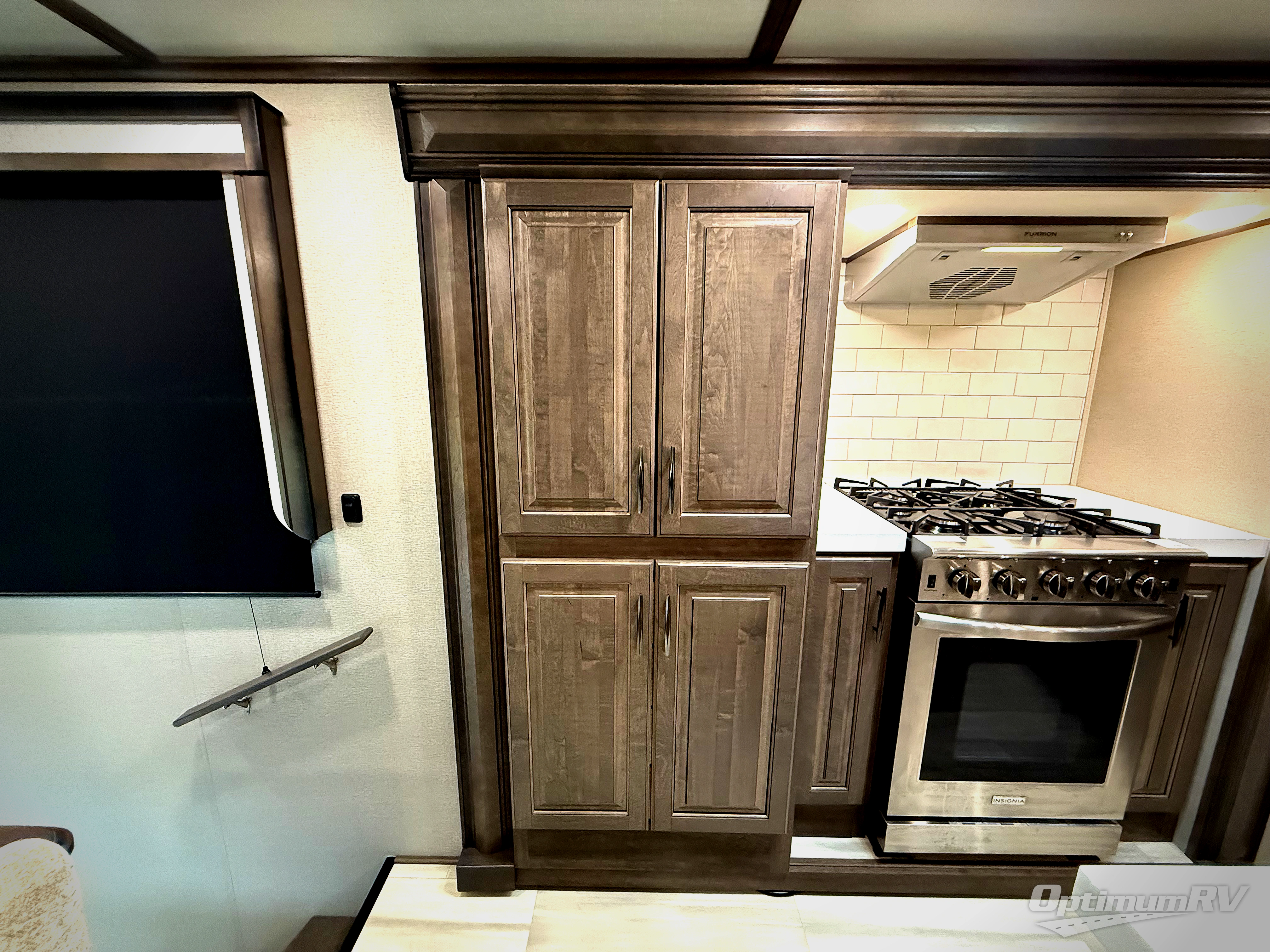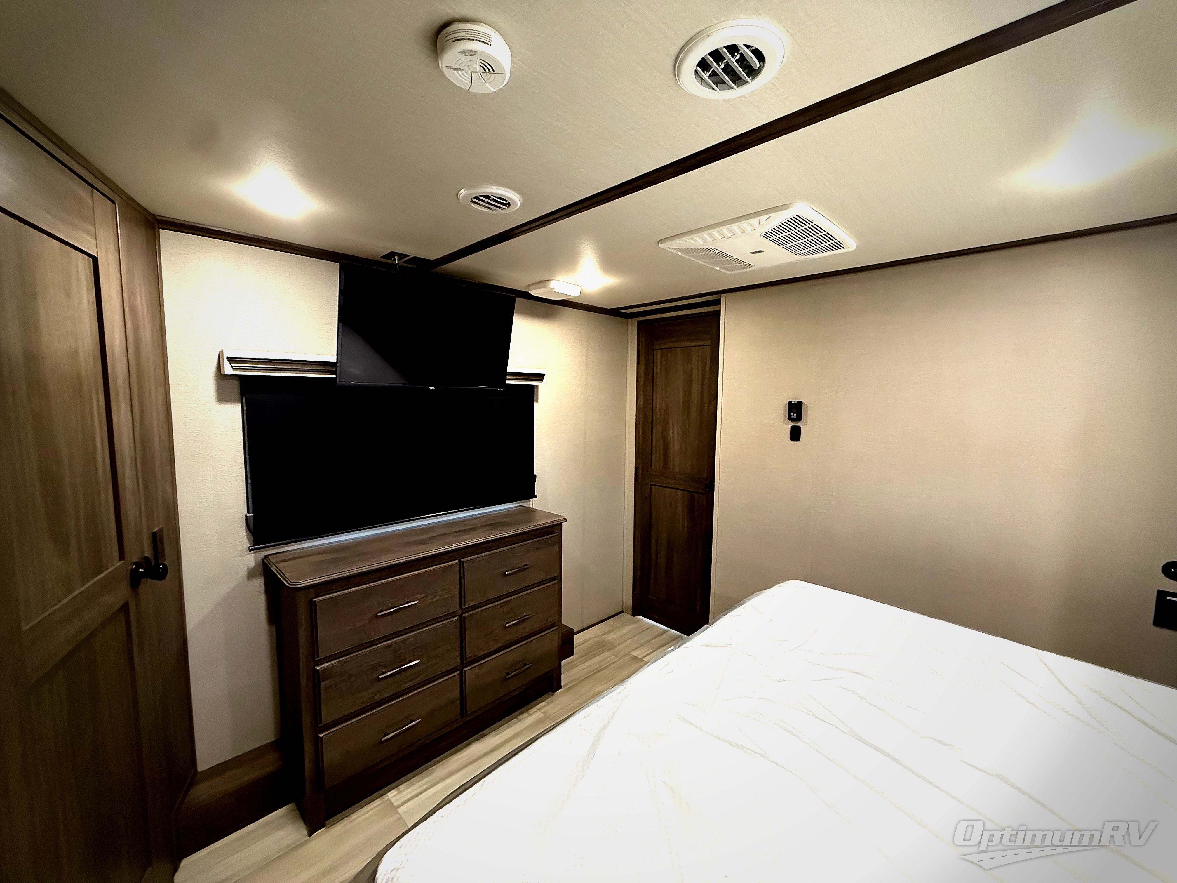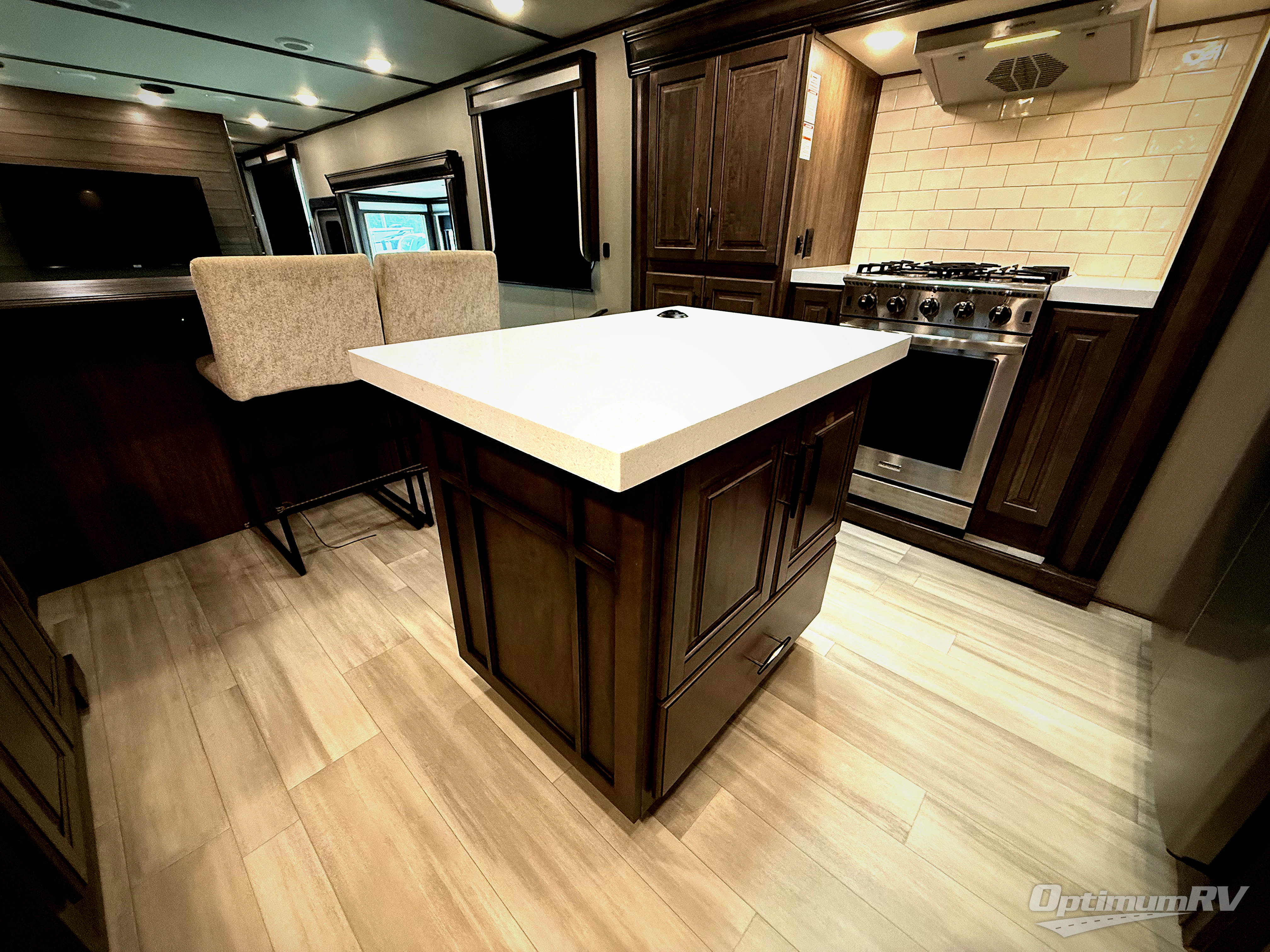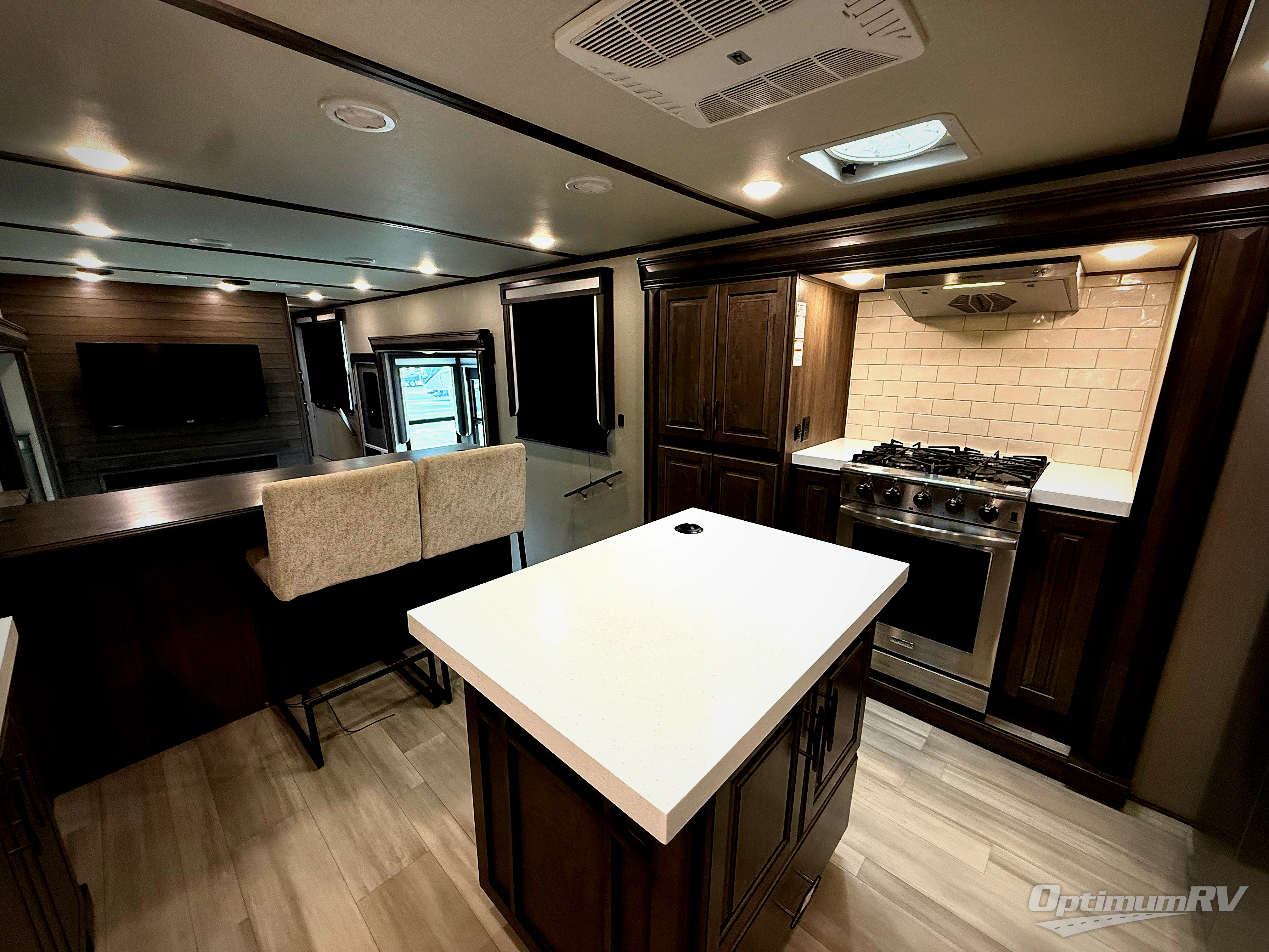 Enjoy each and every vacation, month-long trip or even extended stay at an RV park in this fifth wheel that is spacious from the front to the rear! The raised kitchen gives the cook plenty of room to whip up any type of meal using the stainless steel appliances including the 24" residential oven, the oversized pantry and the raised bar top will provide you even more counter space on top of dining with two chairs that overlook the middle living area. Relaxing is made easy with the two tri-fold sofas and theatre seating while watching the big game on the LED Smart TV and enjoying the fireplace below. Dual sinks in the full bathroom allow two people to easily get ready at once, and the seat in the shower is a nice convenience. At night, retire to your own queen bed slide after sitting on the pull-out ottoman to take your shoes off, and enjoy a show on the LED TV above the flip-top dresser, or wash some linens in the closet with a washer/dryer if you added that option.