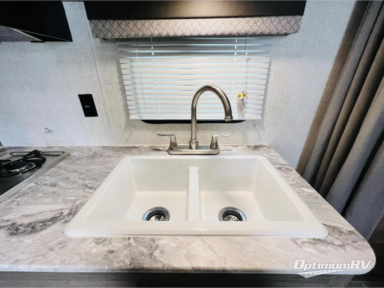 Invite more along with double-size bunks in this travel trailer! The private shower and toilet is close to the bunks if you're camping with little ones, and there is a sink just outside the door so two people can freshen up at once. You and your spouse will get comfortable on the front queen bed, or you can choose the optional Murphy bed to enjoy more seating space during the day. This model includes a booth dinette to dine at each day, or you can sit outside under the electric awning!