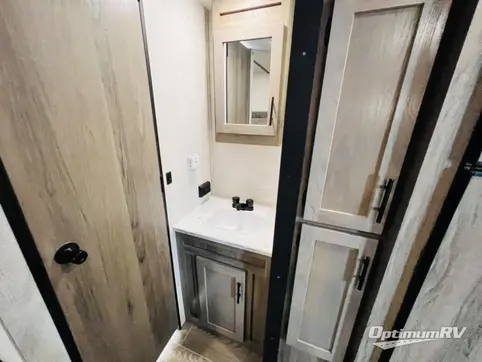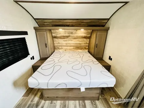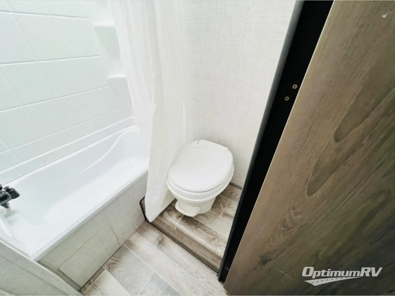 Invite more along with double-size bunks in this travel trailer! The private shower and toilet is close to the bunks if you're camping with little ones, and there is a sink just outside the door so two people can freshen up at once. You and your spouse will get comfortable on the front queen bed, or you can choose the optional Murphy bed to enjoy more seating space during the day. This model includes a booth dinette to dine at each day, or you can sit outside under the electric awning!
