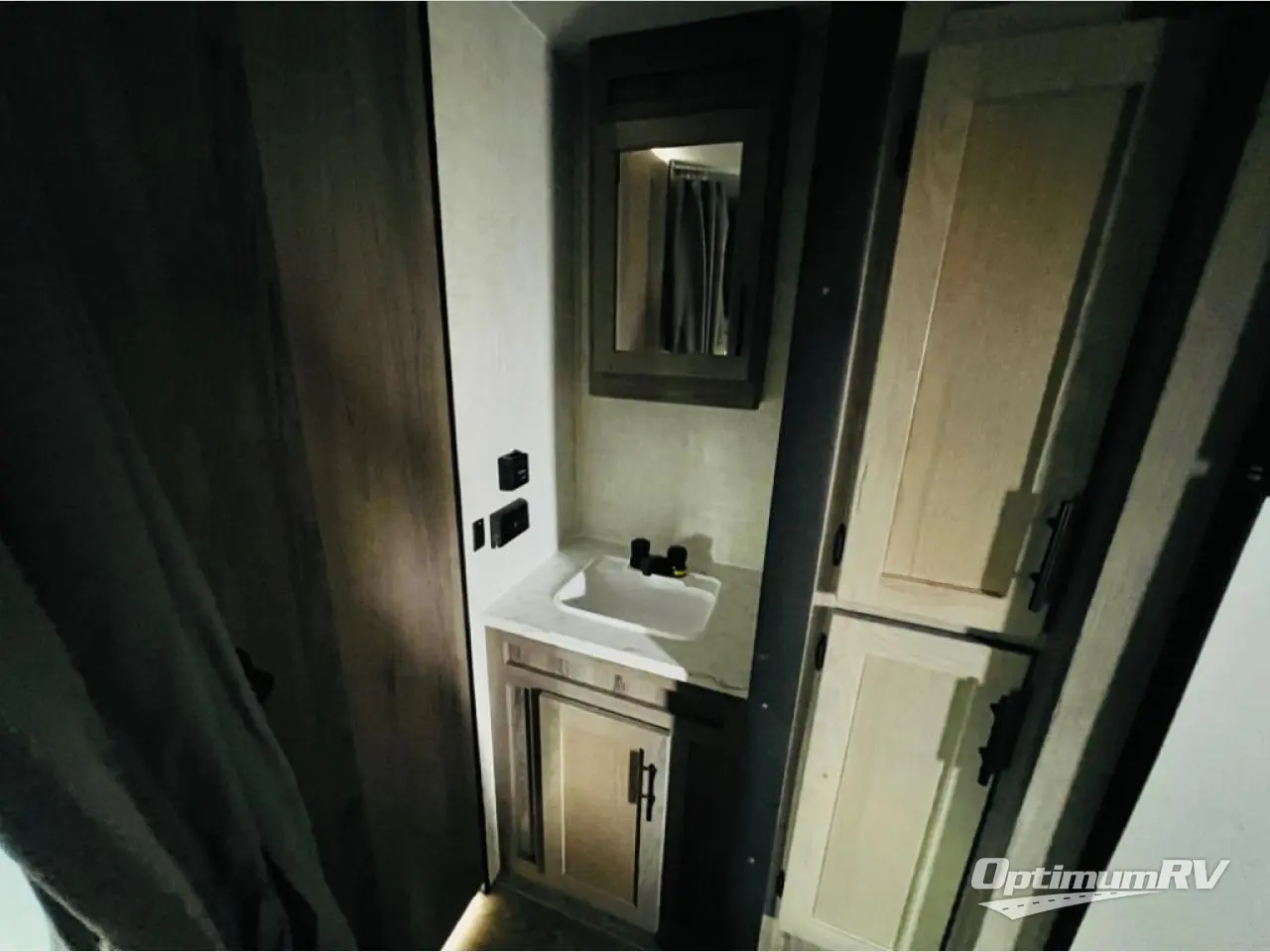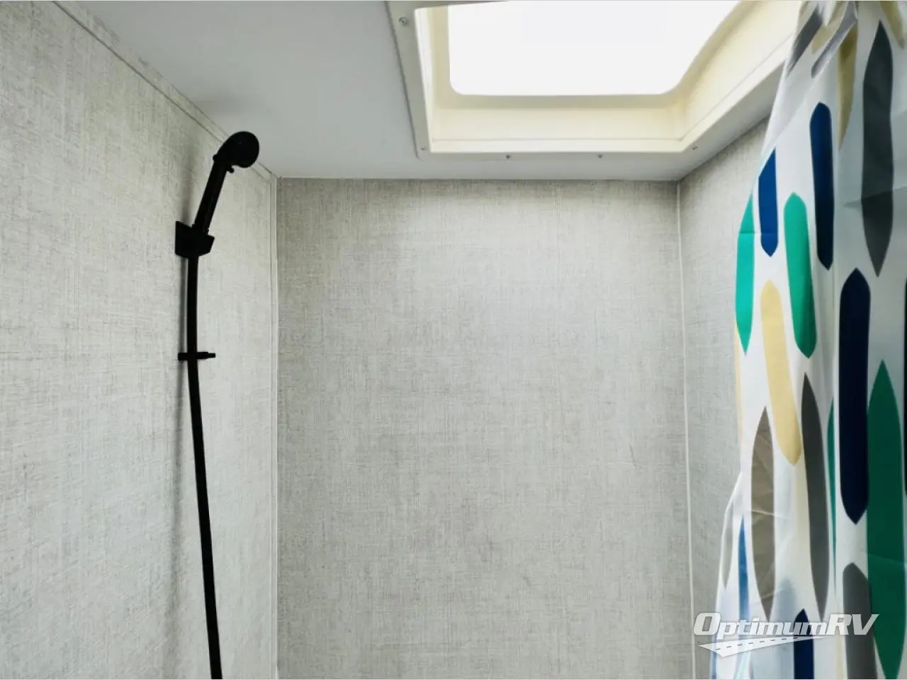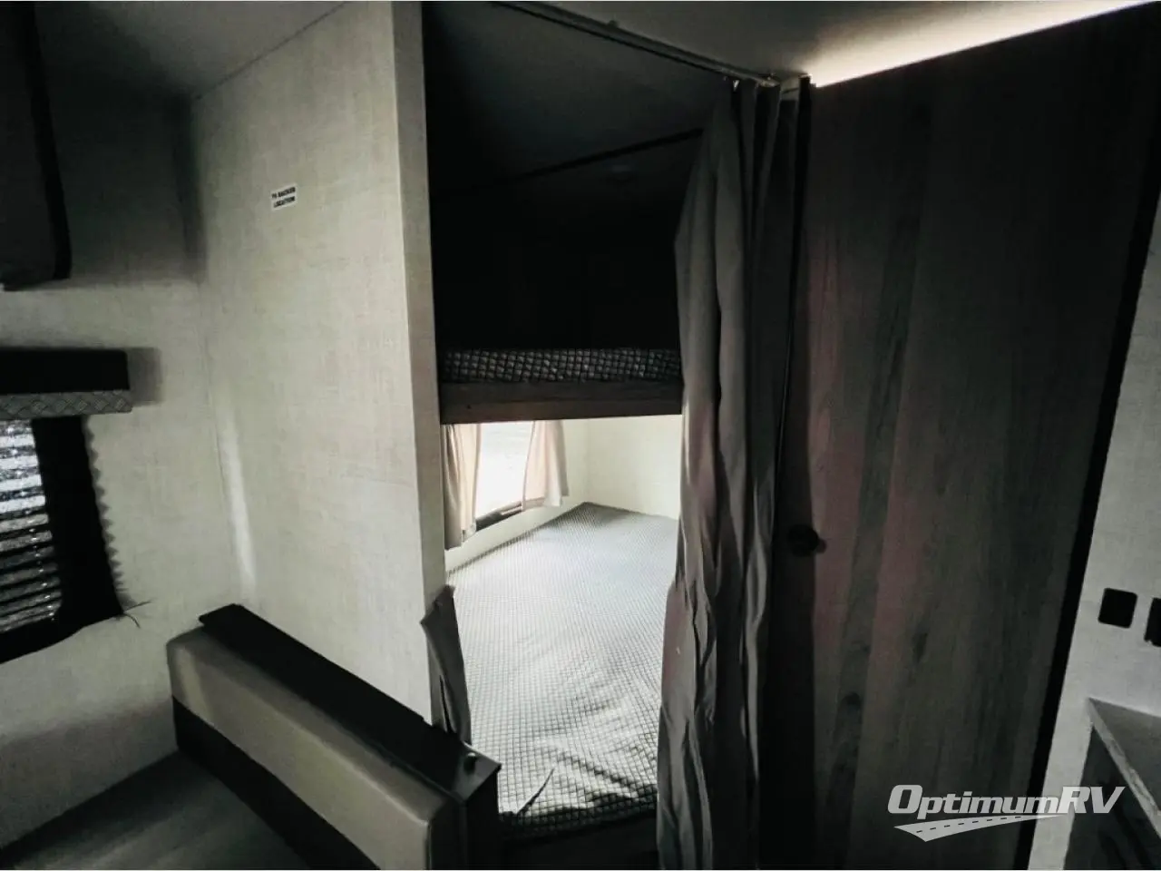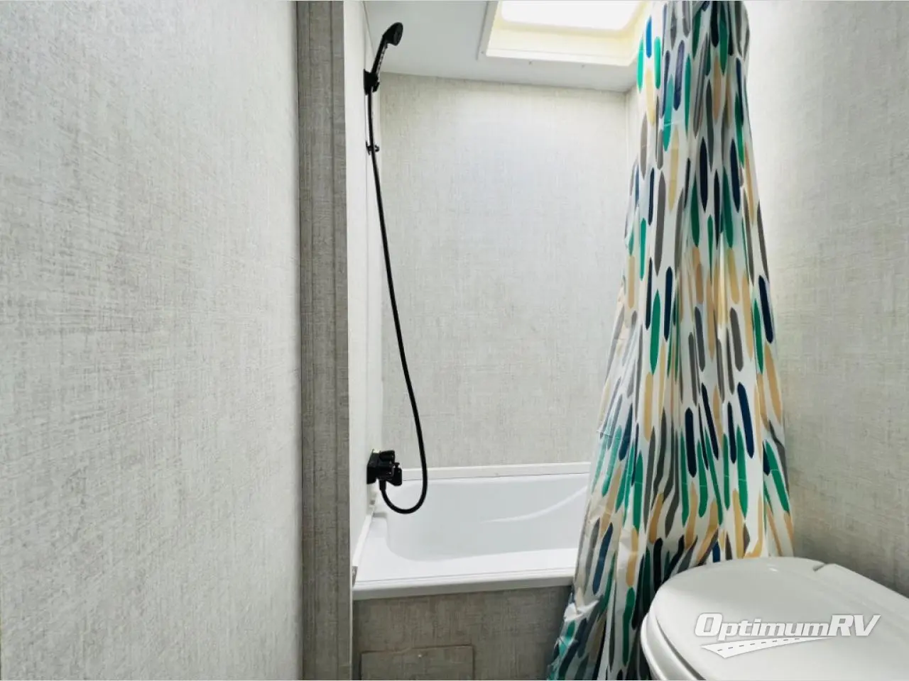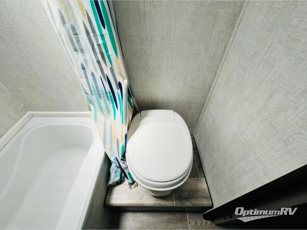 This semi-private front bedroom travel trailer allows you to change in privacy when you close the curtain and sleep on a queen-size bed or choose the optional Murphy bed/sofa for versatility. You will find your own wardrobe and a handy shelf at the head of the bed for your belongings. Your friends or kids will loving sleeping on the double-size bunks in the rear next to the private toilet and tub/shower room. The bathroom sink is just outside the door which is handy when two people need to get ready at once. And the cook will have full amenities, plus a pantry, and overhead storage for all the dishes, pots, and spices.