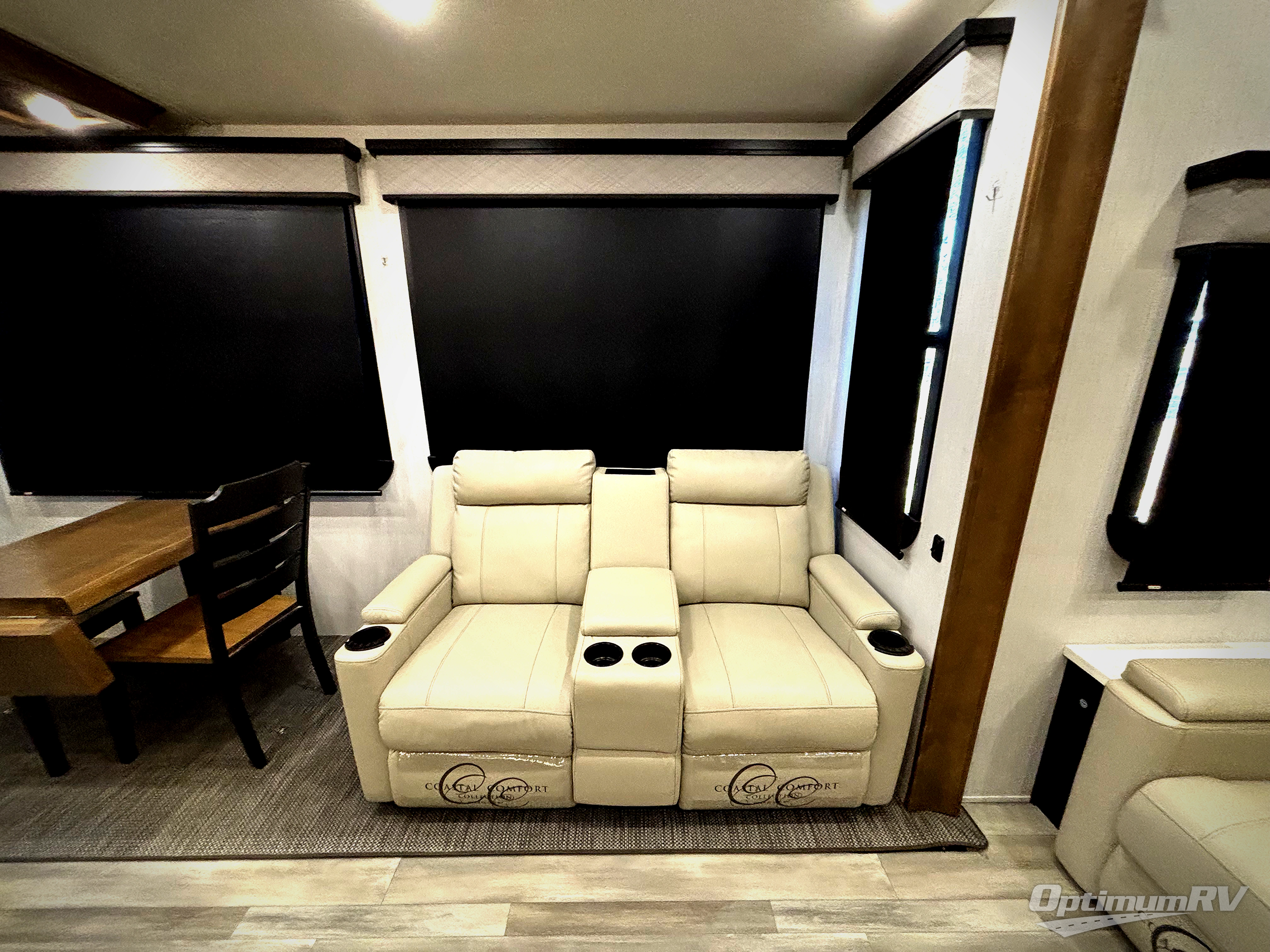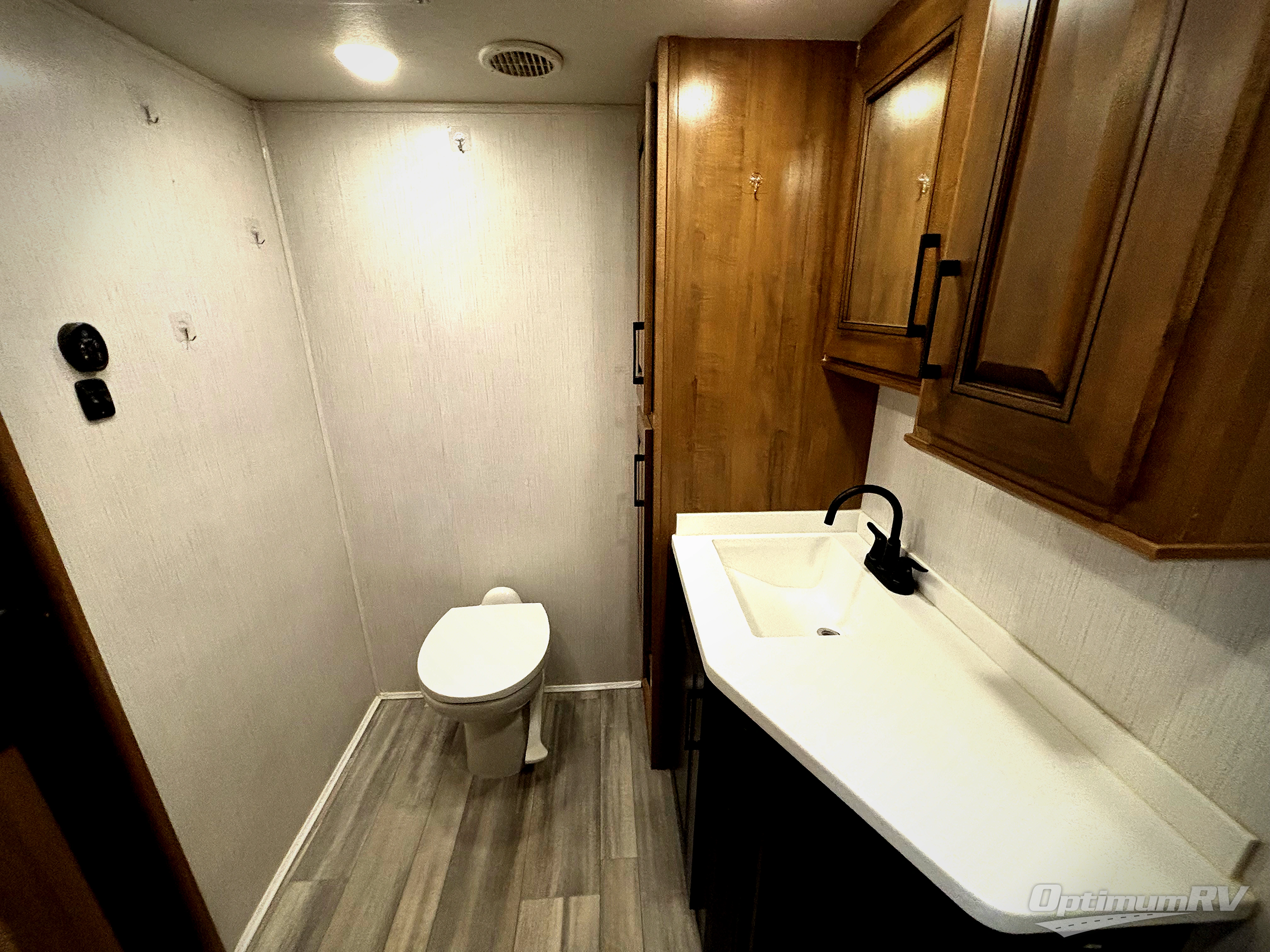 When you camp, you don't have to give up your spacious bathroom and bedroom you are accustom to having when you have this Bighorn! The extended slide in the bedroom stretches to the bathroom, plus you have double entry from either the front bedroom or the hallway. The shower includes a teak seat, and the bathroom closet allows you to hang clothes as well as choose a washer/dryer option for the prepped space. There is more storage for linens, toiletries and such. The front bedroom gives you unique front wall seating with a window, overhead cabinets, and drawer storage plus counter tops to place your phone, books and even display photos and decor. The kitchen and living area is spacious with dual slide outs, and the cook will love the island, the pantry, the residential refrigerator and the four-burner cooktop. The power theater seats with heat and massage as well as the upgraded flip and fold sleeper sofa, and the live edge dinette table with chairs, are just more reasons you will love this RV!