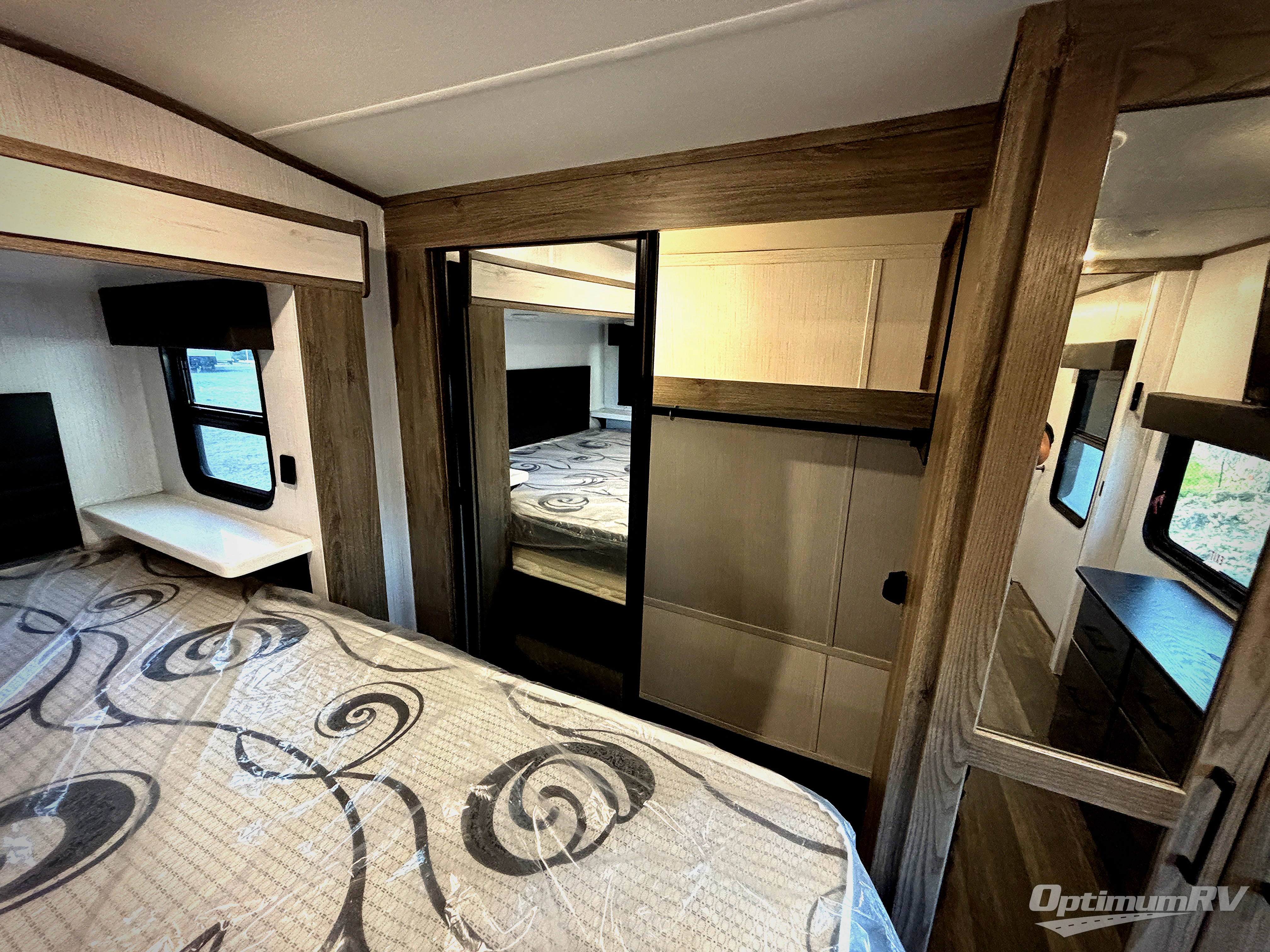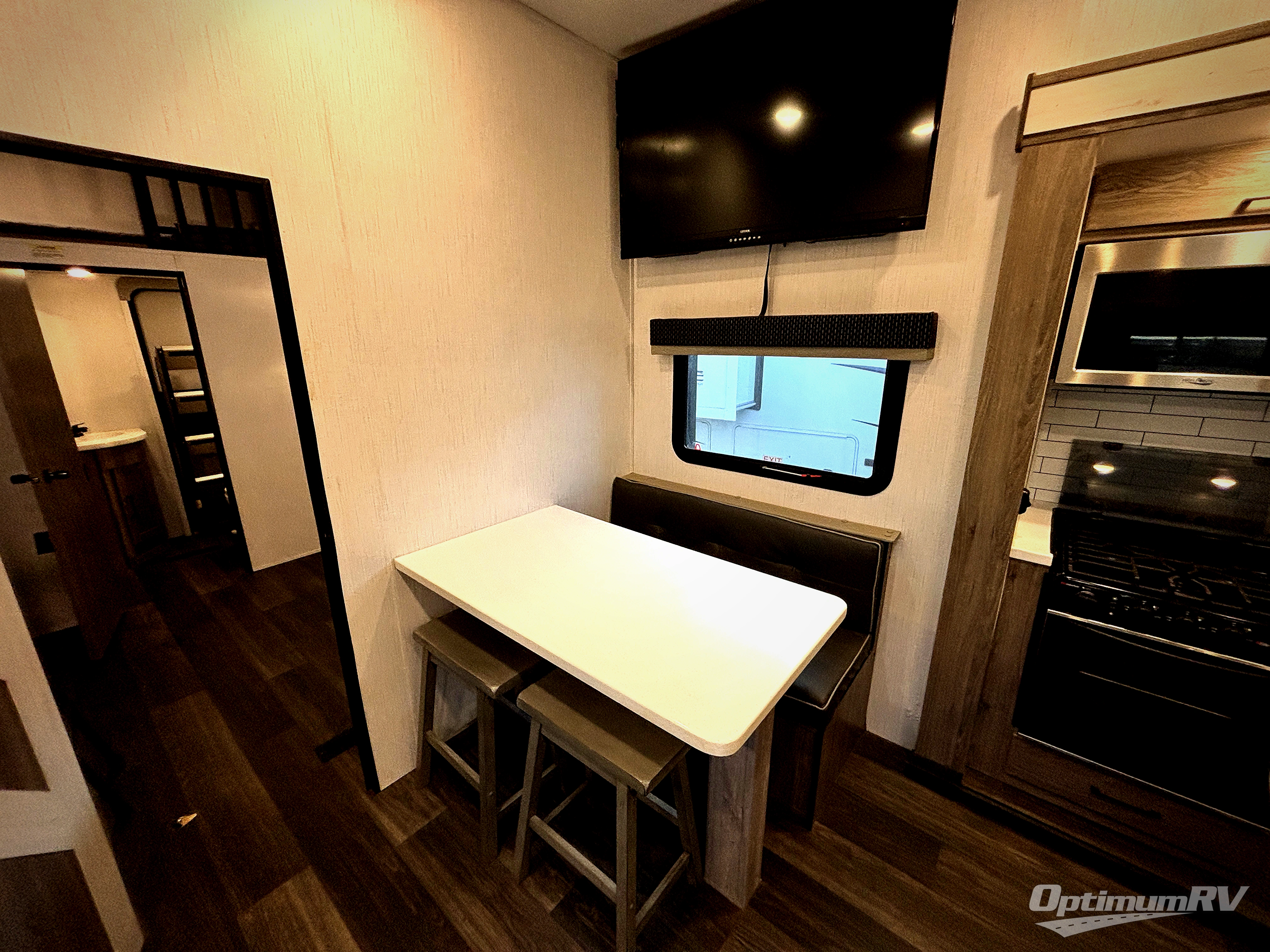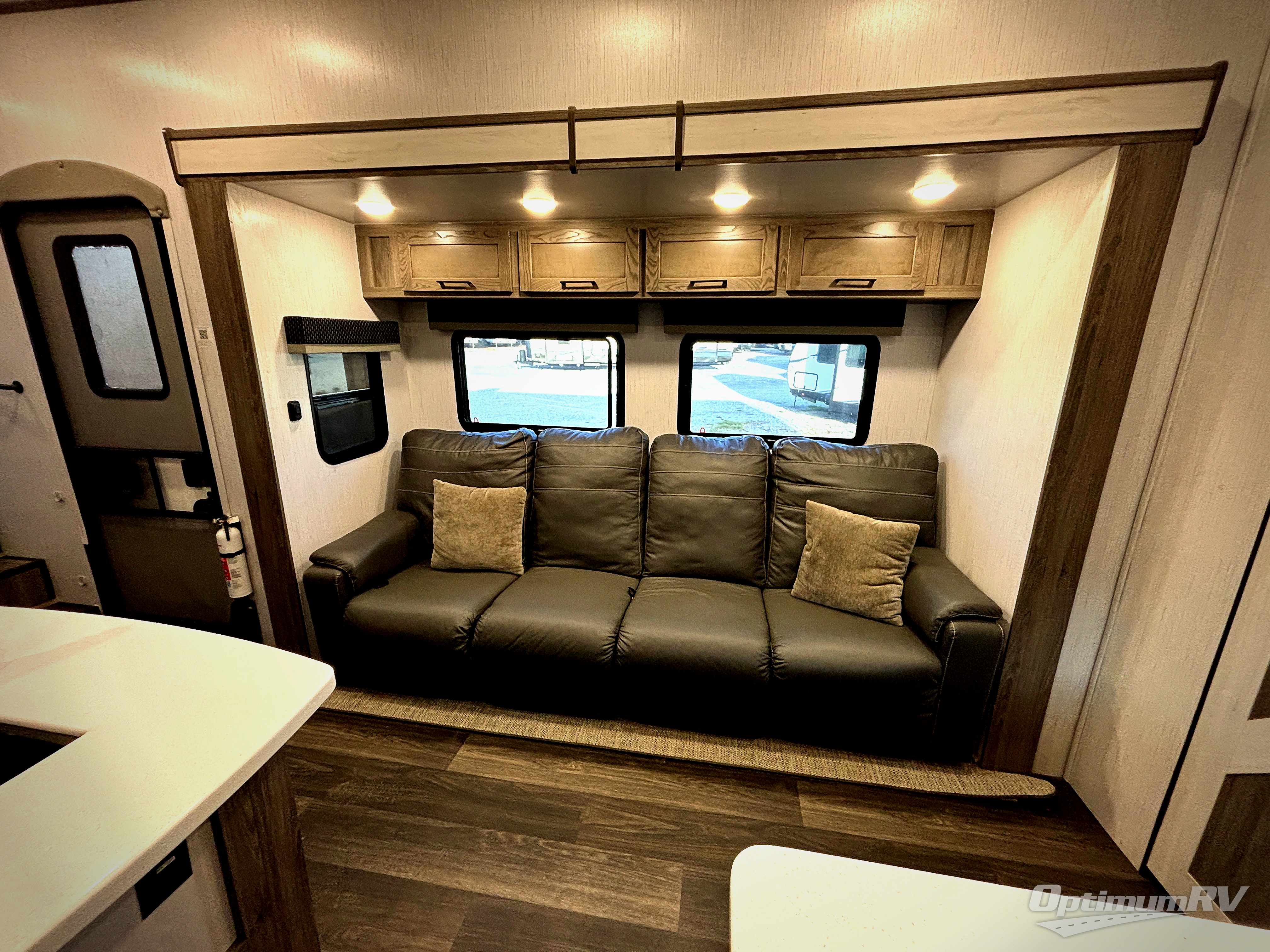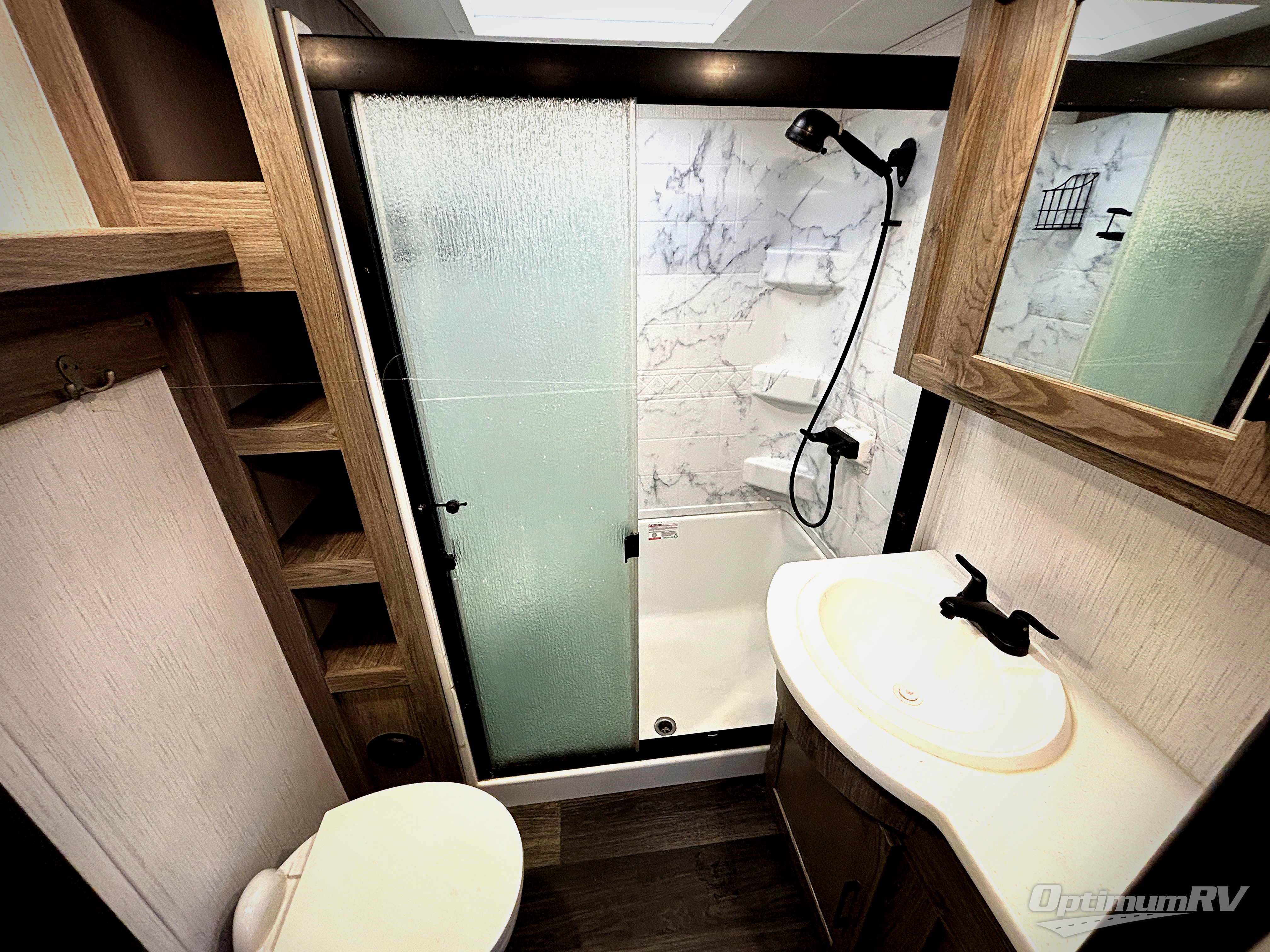 This toy hauler is decked out in features you will love! Starting with the rear entrance that leads directly into the spacious rear private bunkhouse with a sofa slide, a set of bunk beds slide, and a loft above a full bathroom. Everyone's bellies will stay full with the recessed three burner cooktop with oven and the residential French door 14.9 cu. ft. refrigerator with 1000w inverter or you can prepare your delicious home cooked meals while breathing in some fresh air with the outdoor kitchen. Enjoy your meal at the one sided booth dinette then relax on the four person sofa slide by the 40" electric fireplace with accent lighting or freshen up in the second full bathroom which has a shower with a seat. The front private bedroom has a king bed slide to lay your head on at night and a front closet with an area prepped to add an optional washer and dryer!