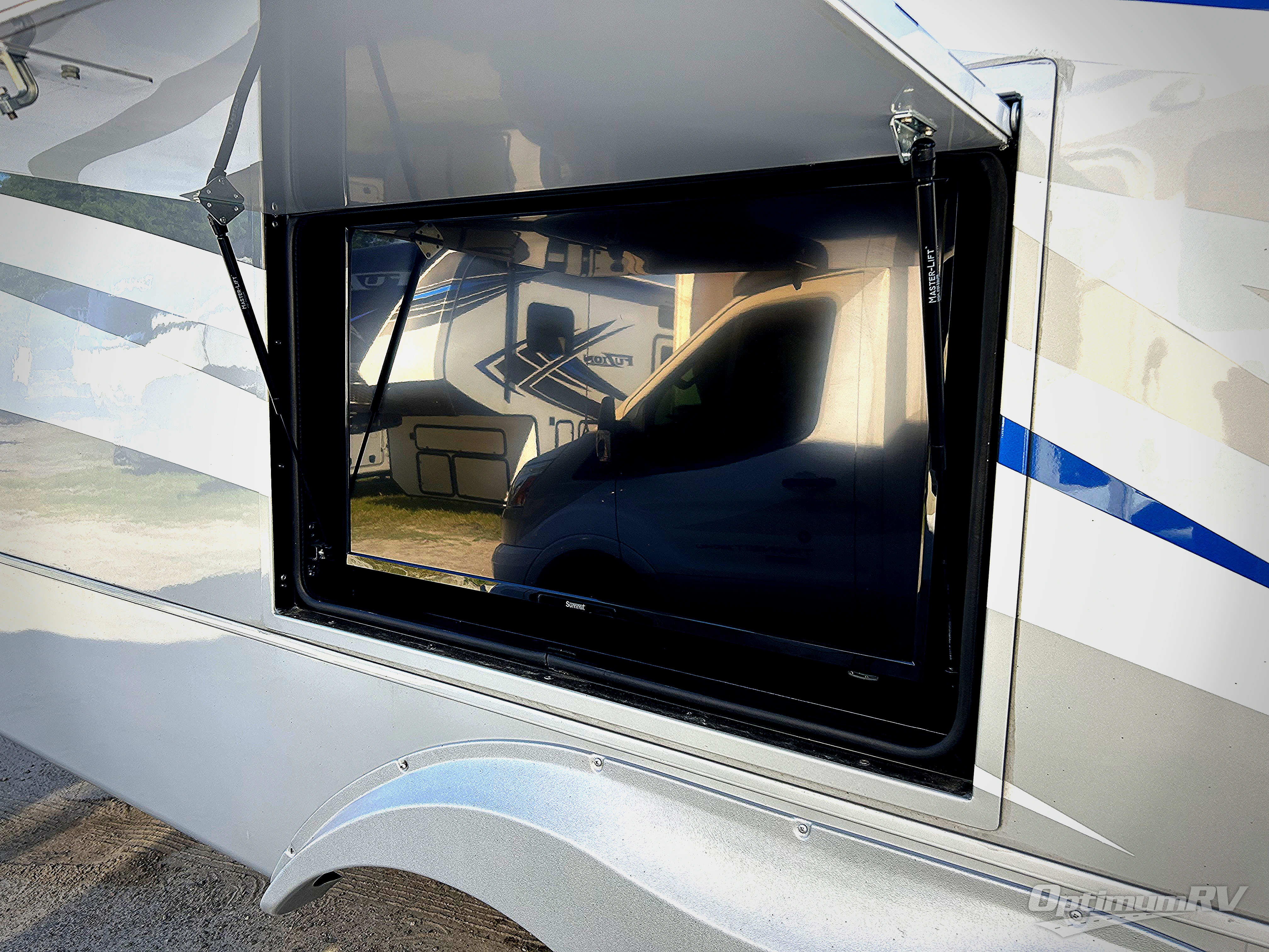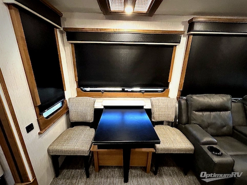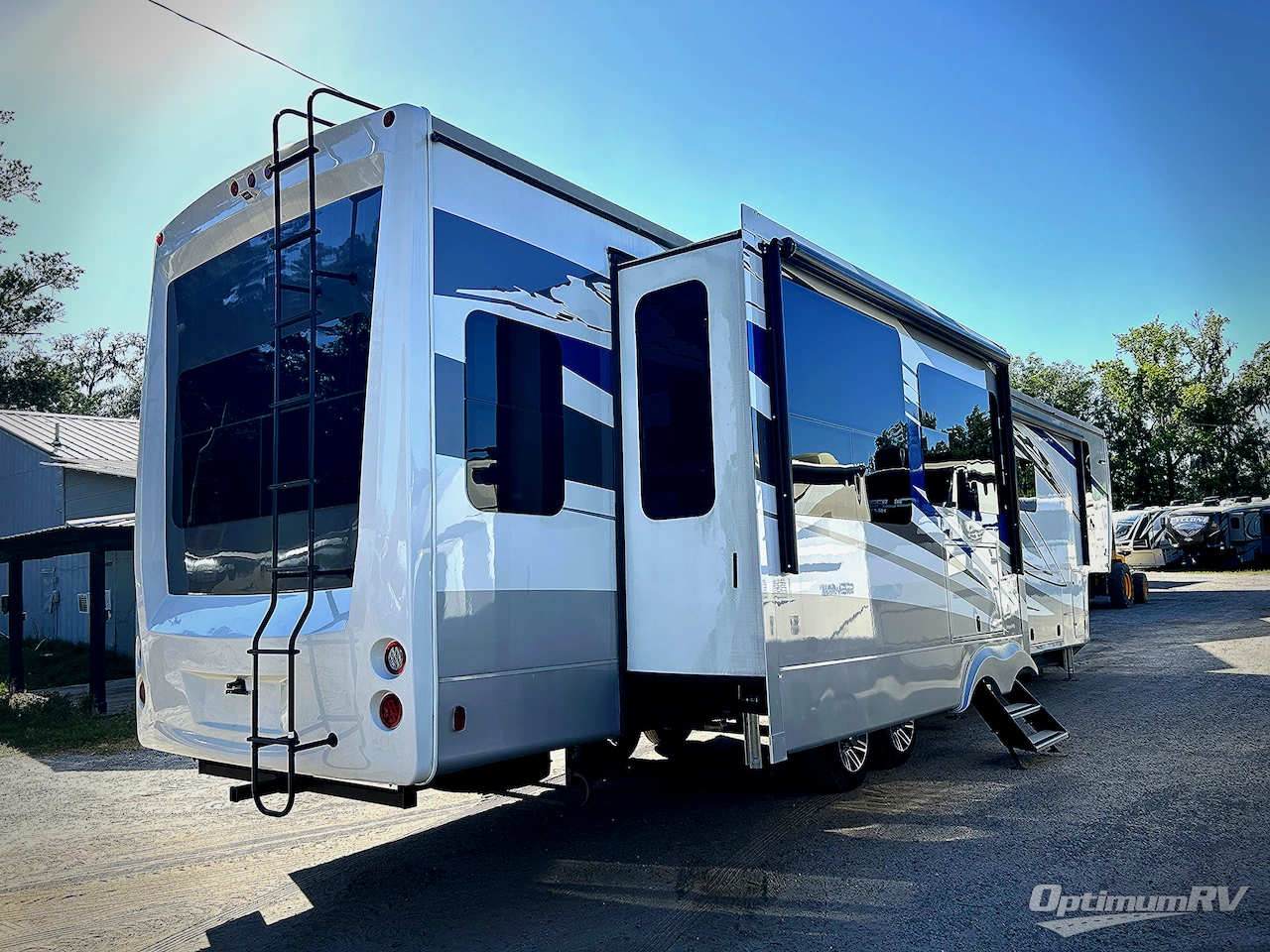 Luxury abounds throughout this fifth wheel! Starting with the rear living area which has a rear sofa and theater seating with heat, massage, and power recline across from the entertainment center with a 5,100 BTU fireplace. Grab some bacon from the 20.8 cu. ft. residential refrigerator and fry it up on the three burner gas cooktop then enjoy it at the two person dinette. There is also a kitchen island for easier meal prepping and a half bathroom for a quick bathroom break while you make dinner. The master suite has a tilting king bed slide to lay your head on at night, as well as paneled under-bed storage and adjustable reading lights. It even leads directly into the front full bathroom which has a shower with foldable teak wood seat and front walk-in closet with an area prepped to add an optional washer and dryer so you can extend your camping trip with clean clothes!