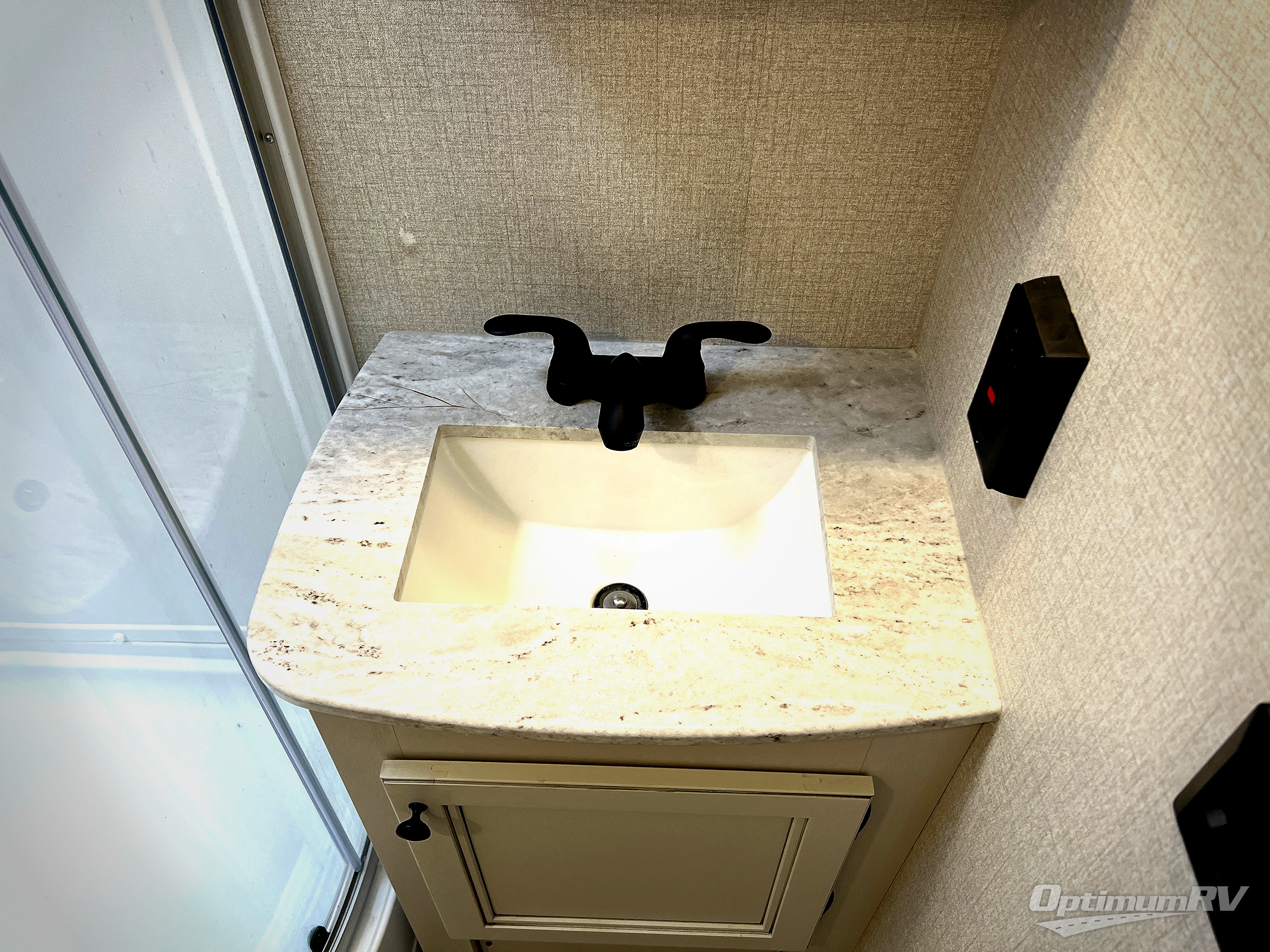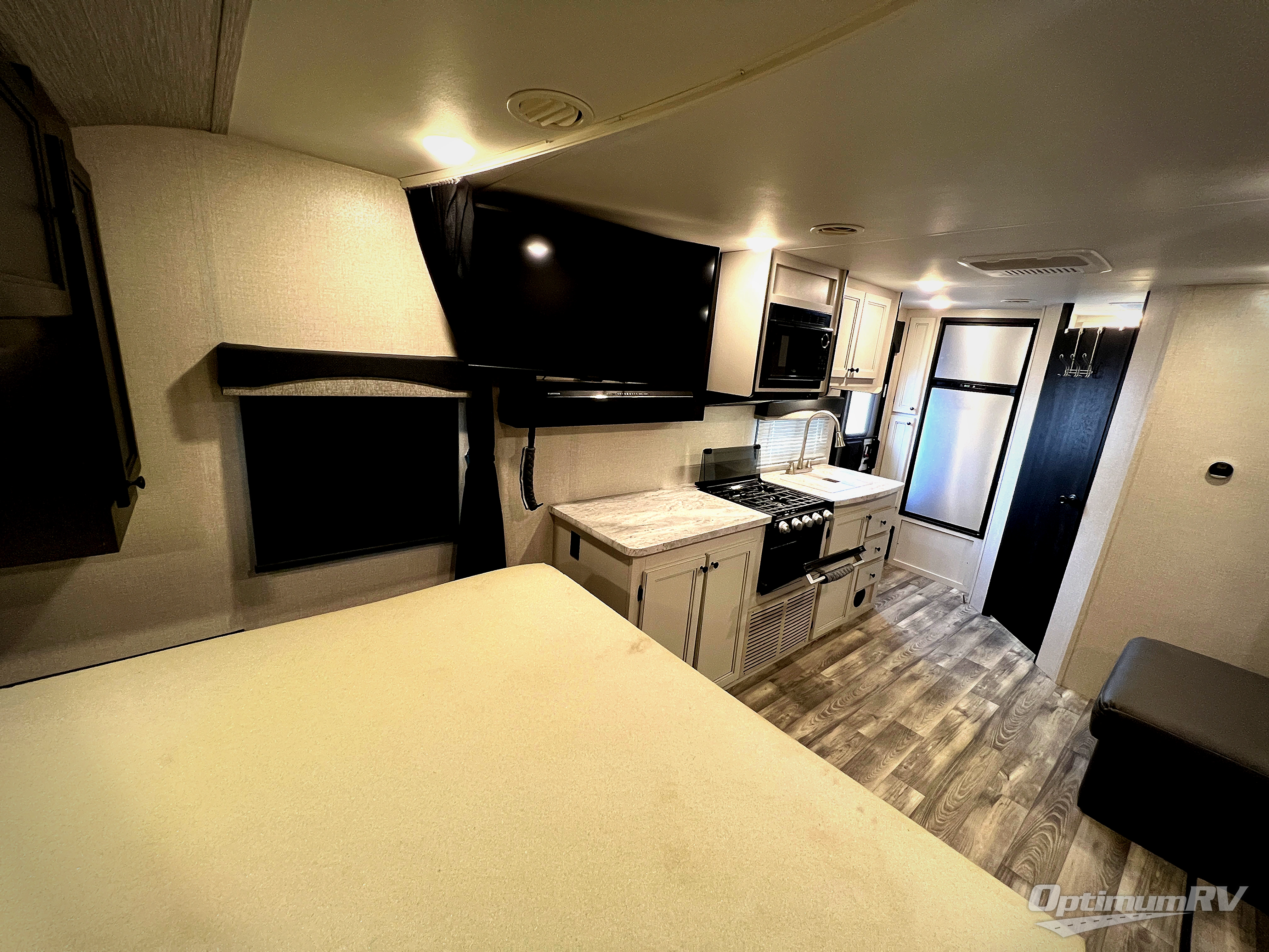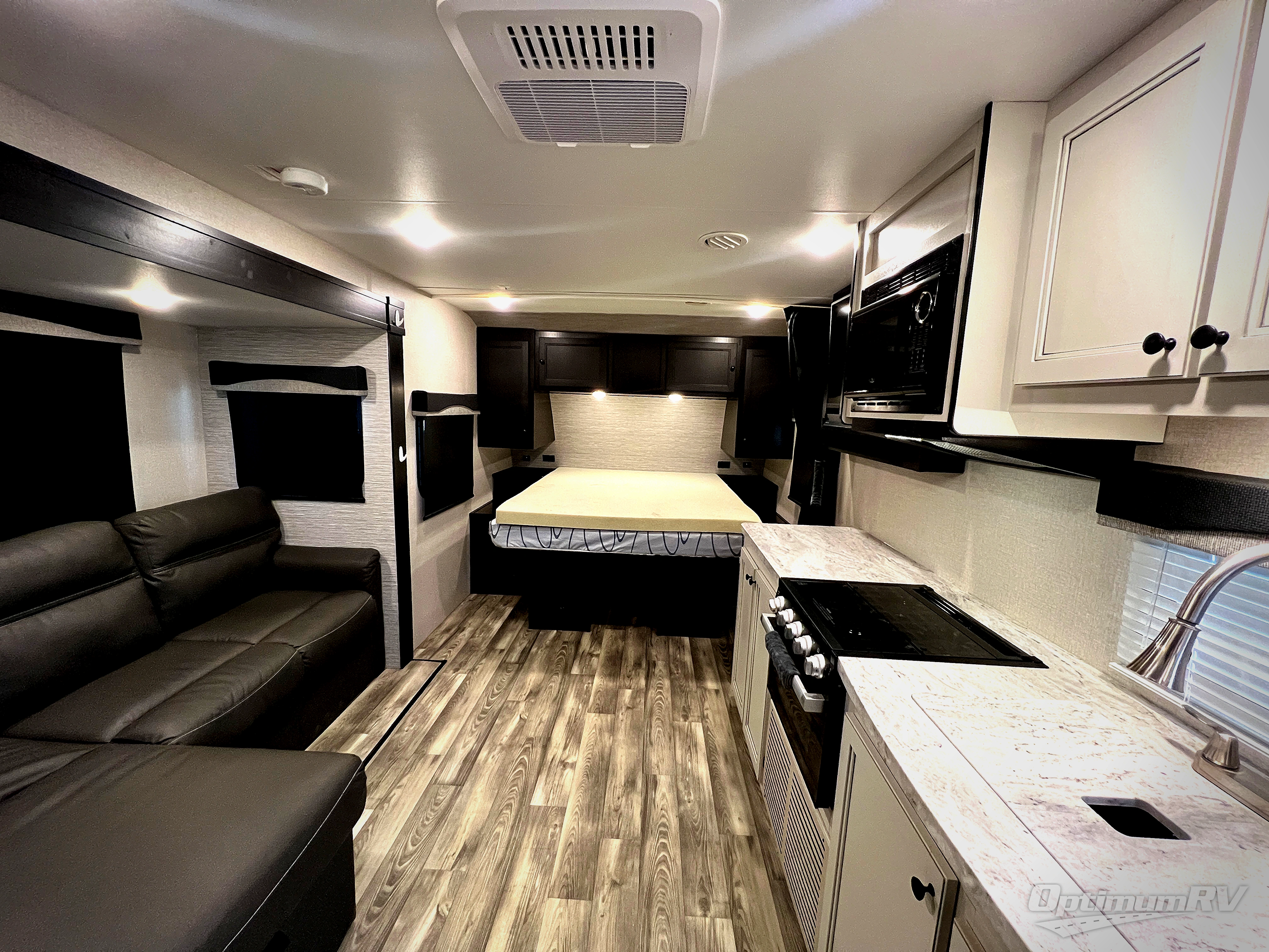 This travel trailer is the perfect couple's getaway! It features a front queen bed with wardrobes on either side for your clothes, a laundry chute on one side, overhead cabinets, and a privacy curtain to draw at night. You can prepare your best meals with the three burner cooktop with a 17" oven, enjoy them at the L-sofa with table which is conveniently across from the entertainment center that has a LED HDTV, and store any leftovers in the 8 cu. ft. refrigerator. The rear corner bathroom has a radius shower to freshen up in each morning, a medicine cabinet to store your toiletries, and a linen closet to keep your towels close.