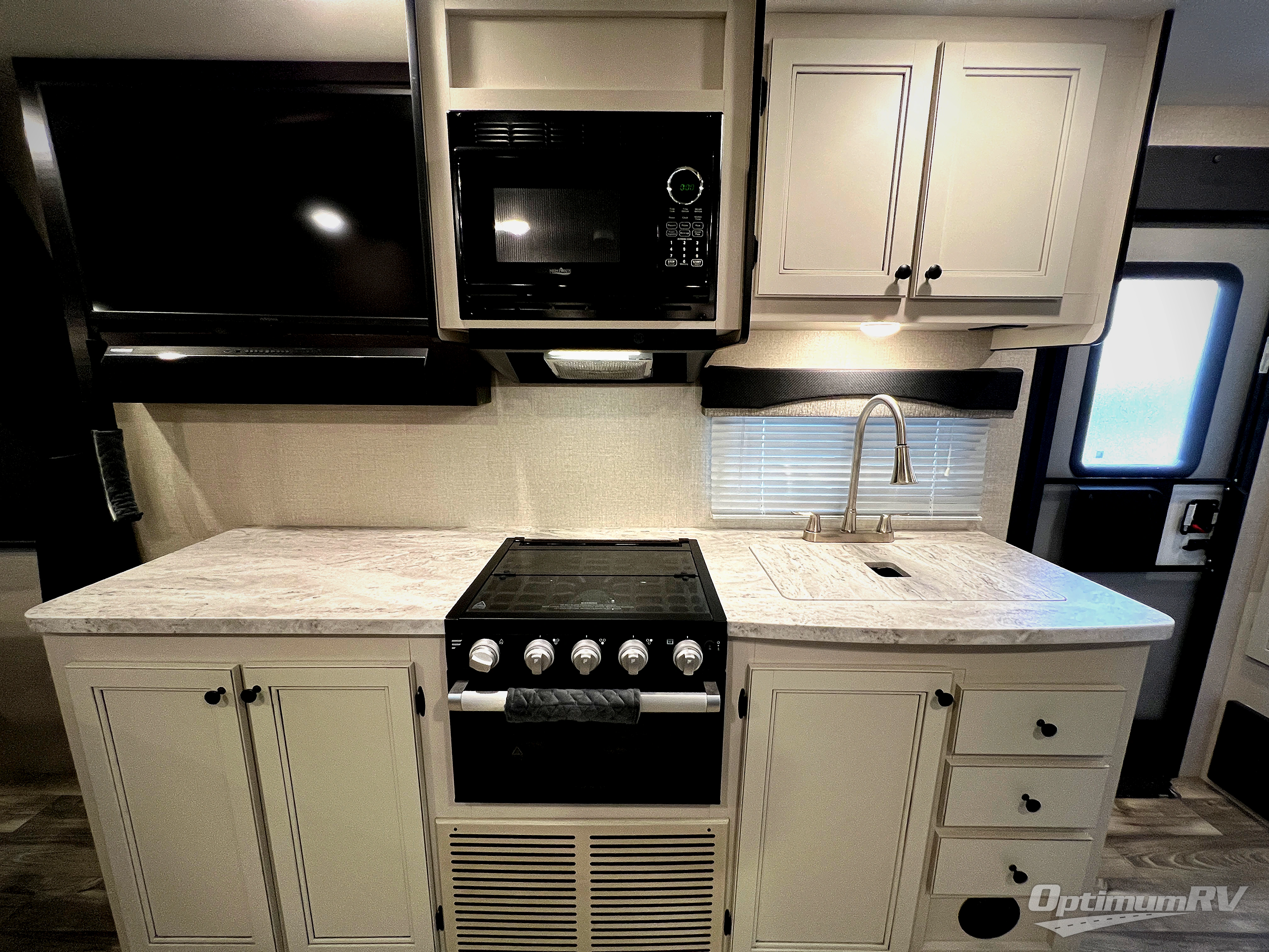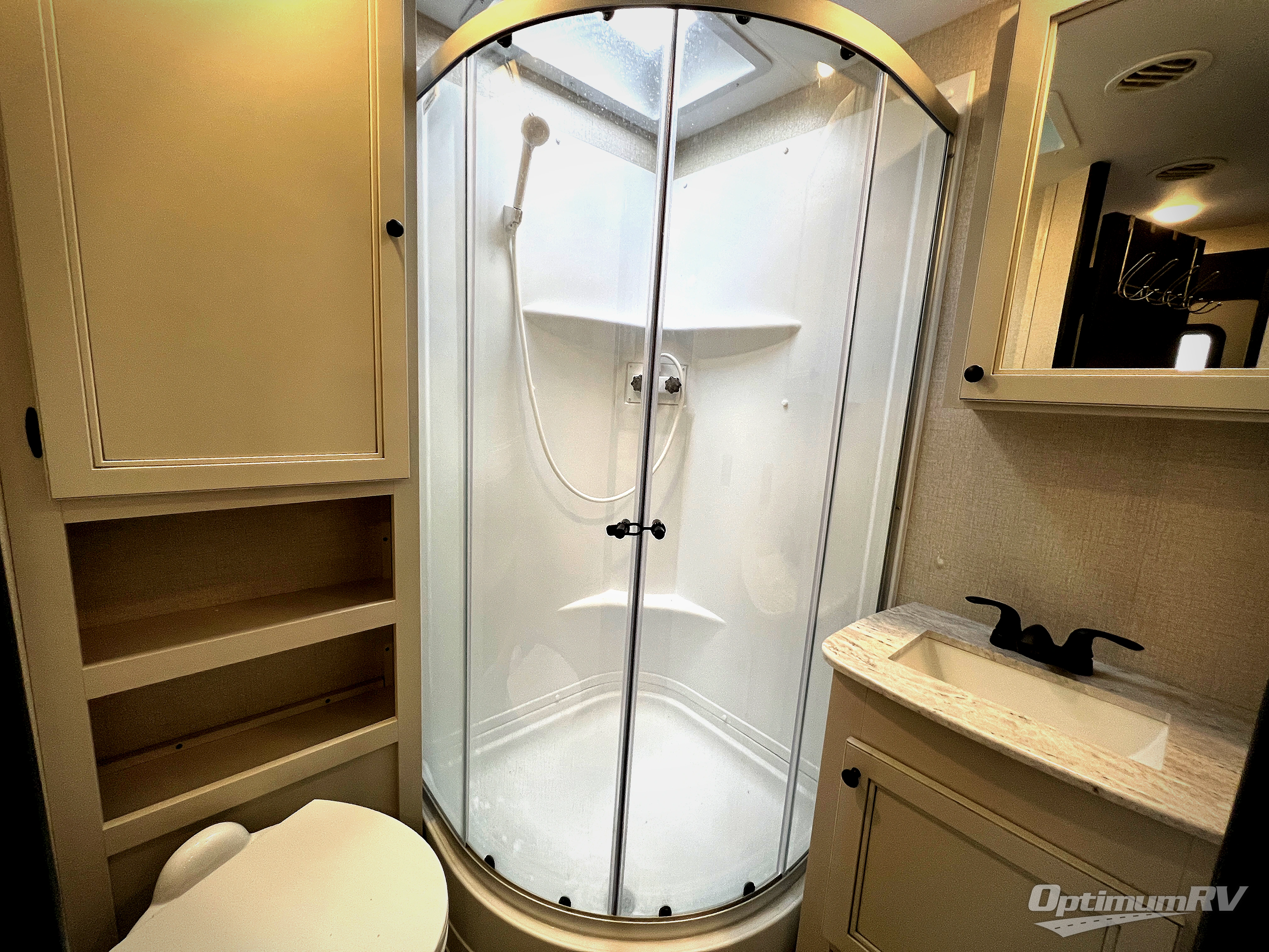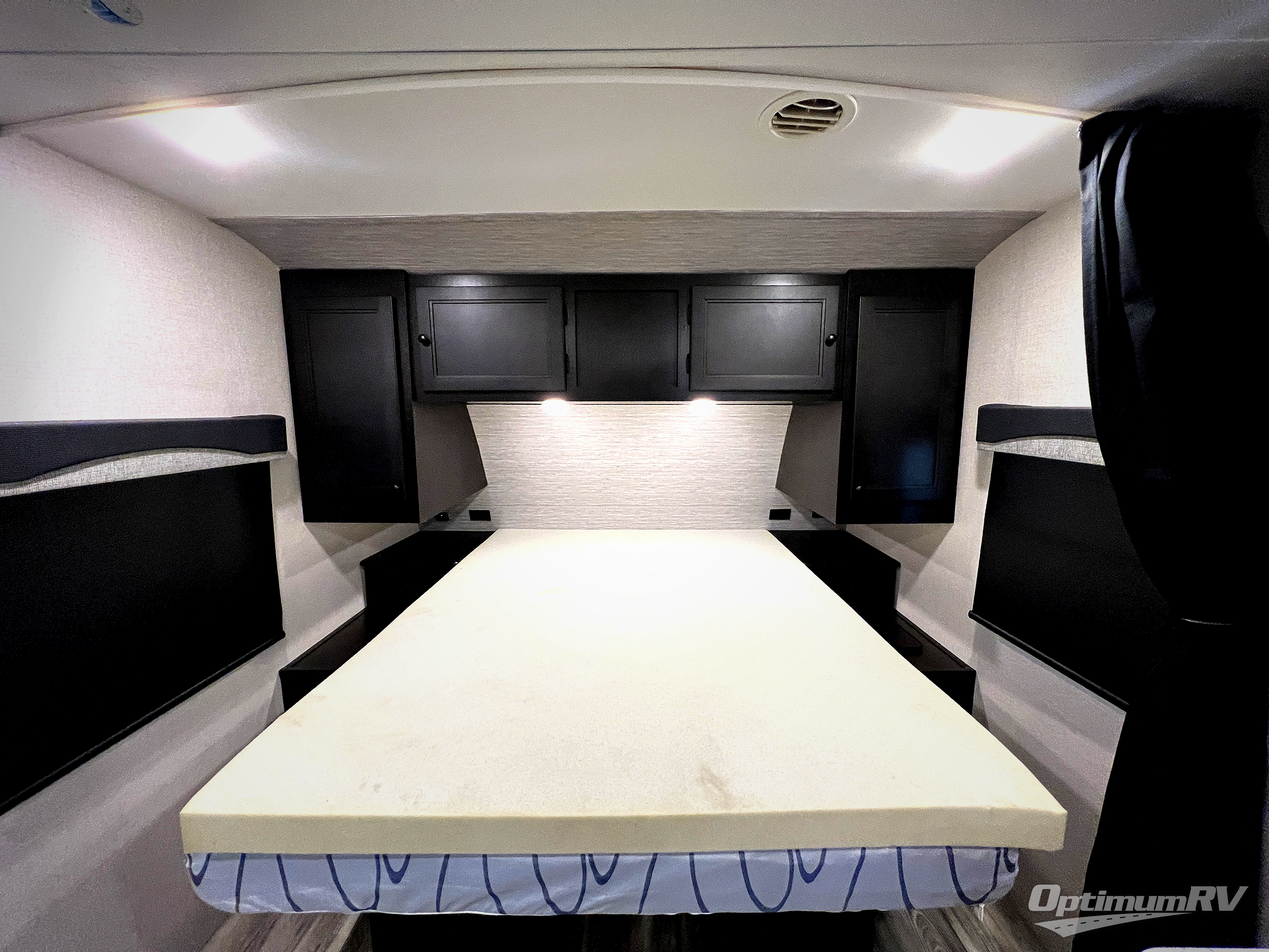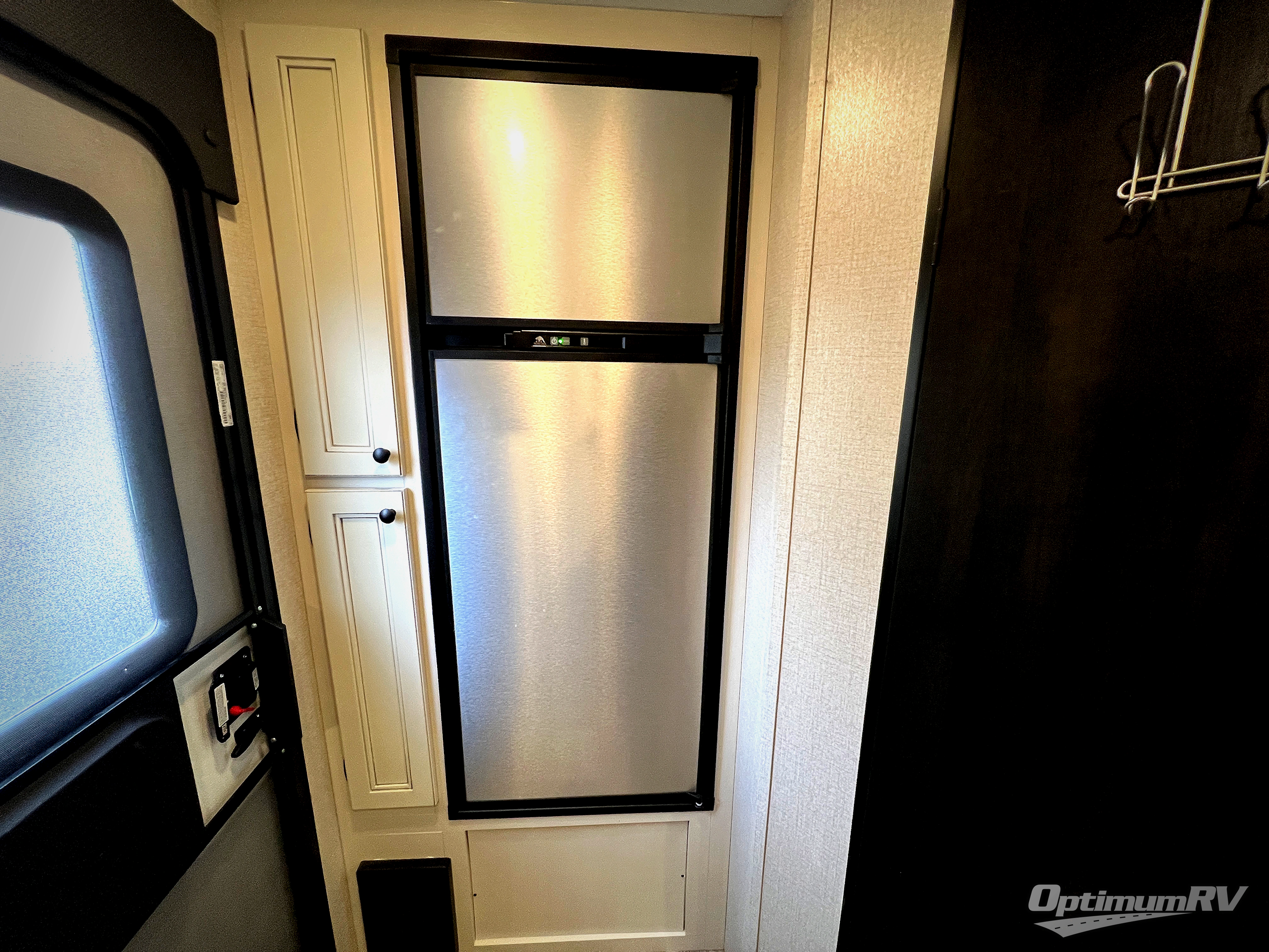 This travel trailer is the perfect couple's getaway! It features a front queen bed with wardrobes on either side for your clothes, a laundry chute on one side, overhead cabinets, and a privacy curtain to draw at night. You can prepare your best meals with the three burner cooktop with a 17" oven, enjoy them at the L-sofa with table which is conveniently across from the entertainment center that has a LED HDTV, and store any leftovers in the 8 cu. ft. refrigerator. The rear corner bathroom has a radius shower to freshen up in each morning, a medicine cabinet to store your toiletries, and a linen closet to keep your towels close.
