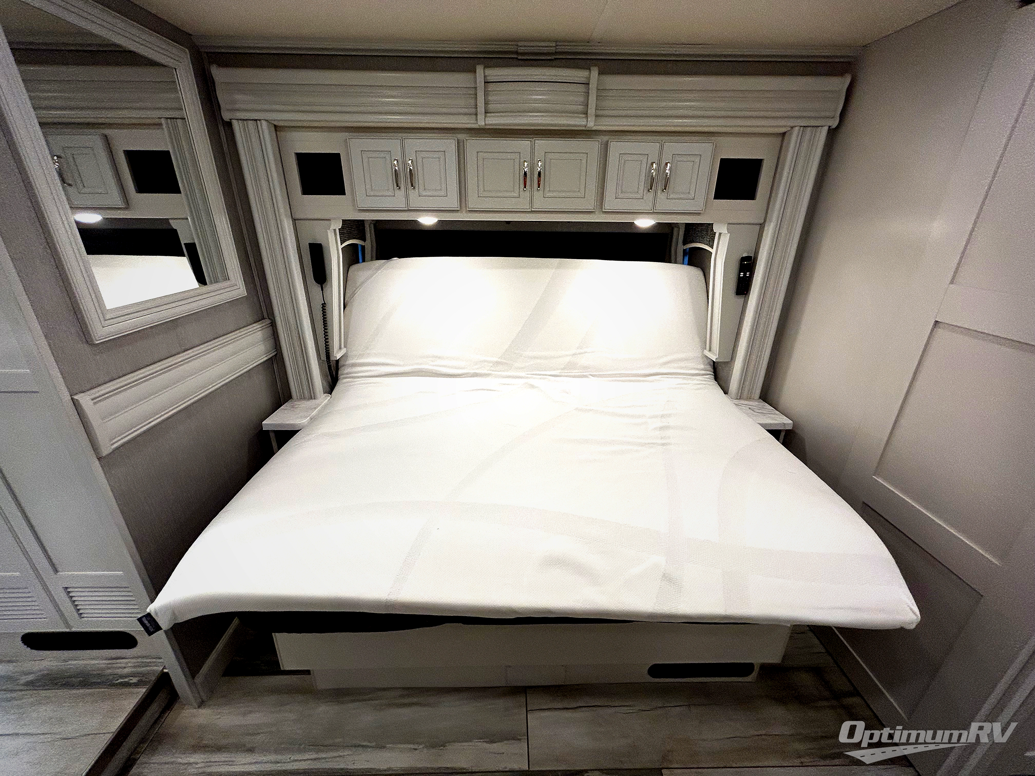 Whether you travel for business, pleasure, or both, you will appreciate all the comforts and luxury found throughout this coach giving you the best experience every trip! From the stunning interior decor, the style of the glass tile galley backsplash and the heat mat in the front porcelain tile floor, you might extend your trips every time! There is a spacious master bedroom with a king bed, dual wardrobes and a 32" LED TV above a dresser, and a rear full bathroom with two sinks, and a fiberglass shower with a seat, glass door and designer shower head assembly. You will be able to keep everything clean using the stackable washer/dryer with drawer, and there is a linen closet for storage. The mid-coach half bath is convenient especially when you have guests, and the sofa sleeper with pull-out full bed and the loveseat offer more sleeping space. And you might like to add the Hide-A-Bed power drop-down overhead bunk option so you can invite more overnight guests. The kitchen will make any cook happy with a convection microwave, a residential refrigerator with ice and water in the door, and the style of the polished solid surface galley countertop with lighting.