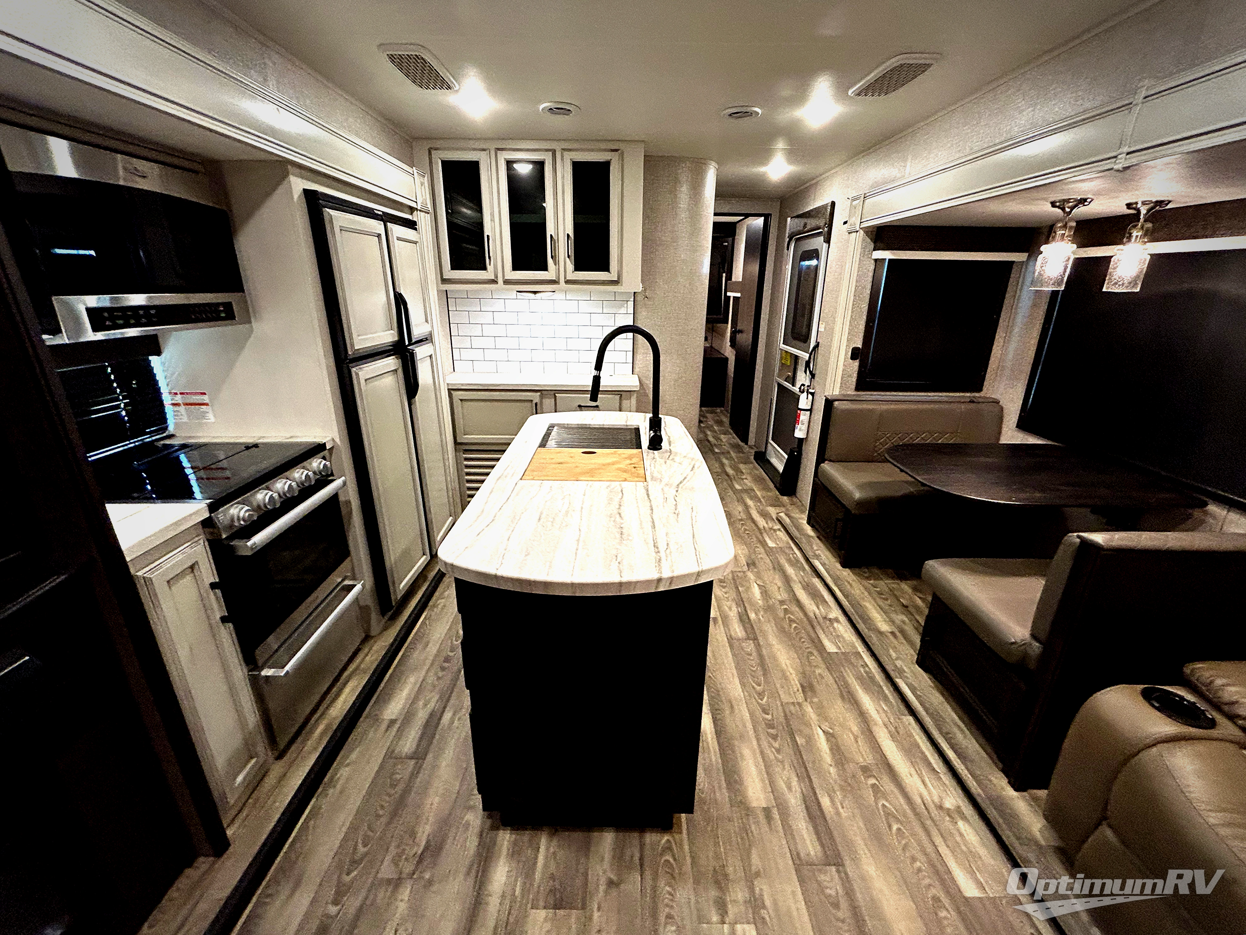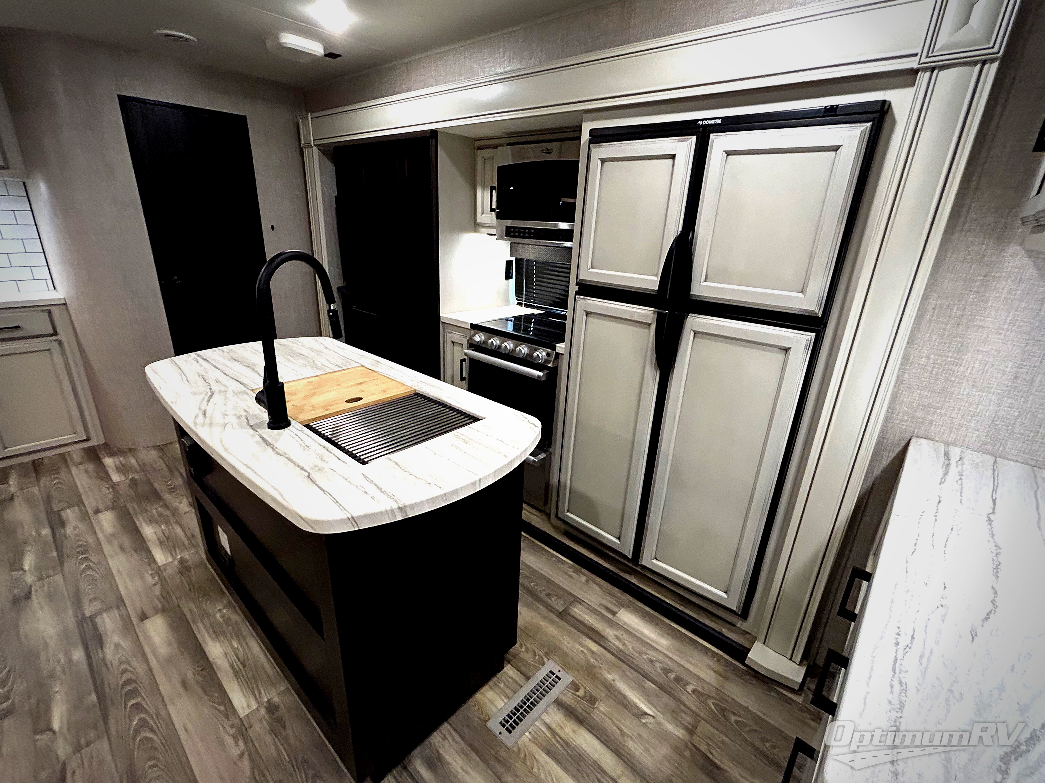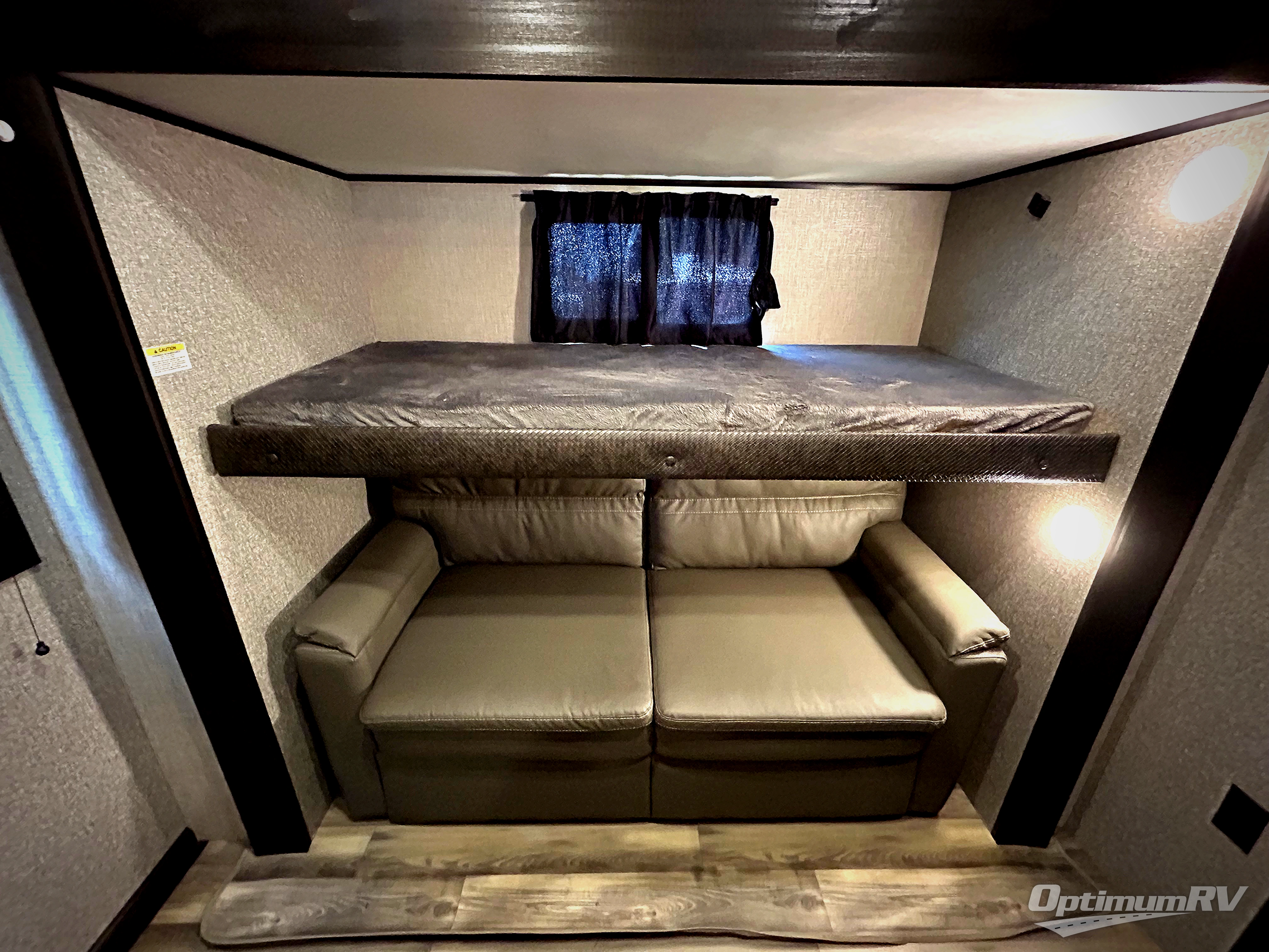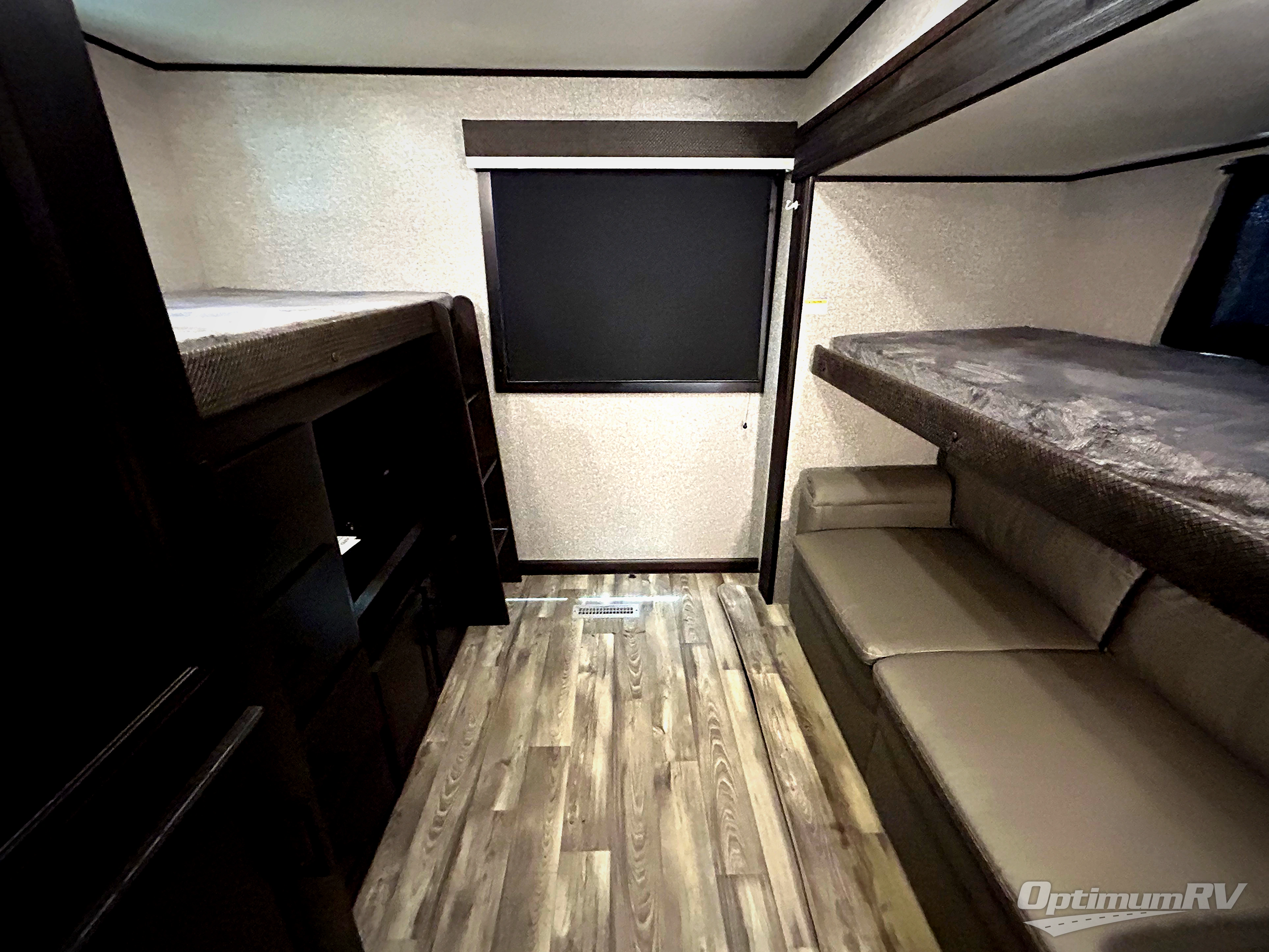 There are sleeping spaces galore in this travel trailer! From the rear private bunkhouse with a 39" x 74" bunk above a wardrobe and a 30" x 74" bunk above a tri-fold sofa slide to the front private bedroom with a queen bed, plus the tri-fold sofa and booth dinette can transform into extra sleeping spaces when you aren't using them to relax or eat a meal. The bedroom also has a wardrobe that is prepped to add an optional washer and dryer so everyone can have clean clothes. The chef can prepare their best meals with the kitchen island and will enjoy having two hutches to store the essentials. They could even cook at the outside kitchen to breathe in some fresh air and enjoy the beautiful scenery!
