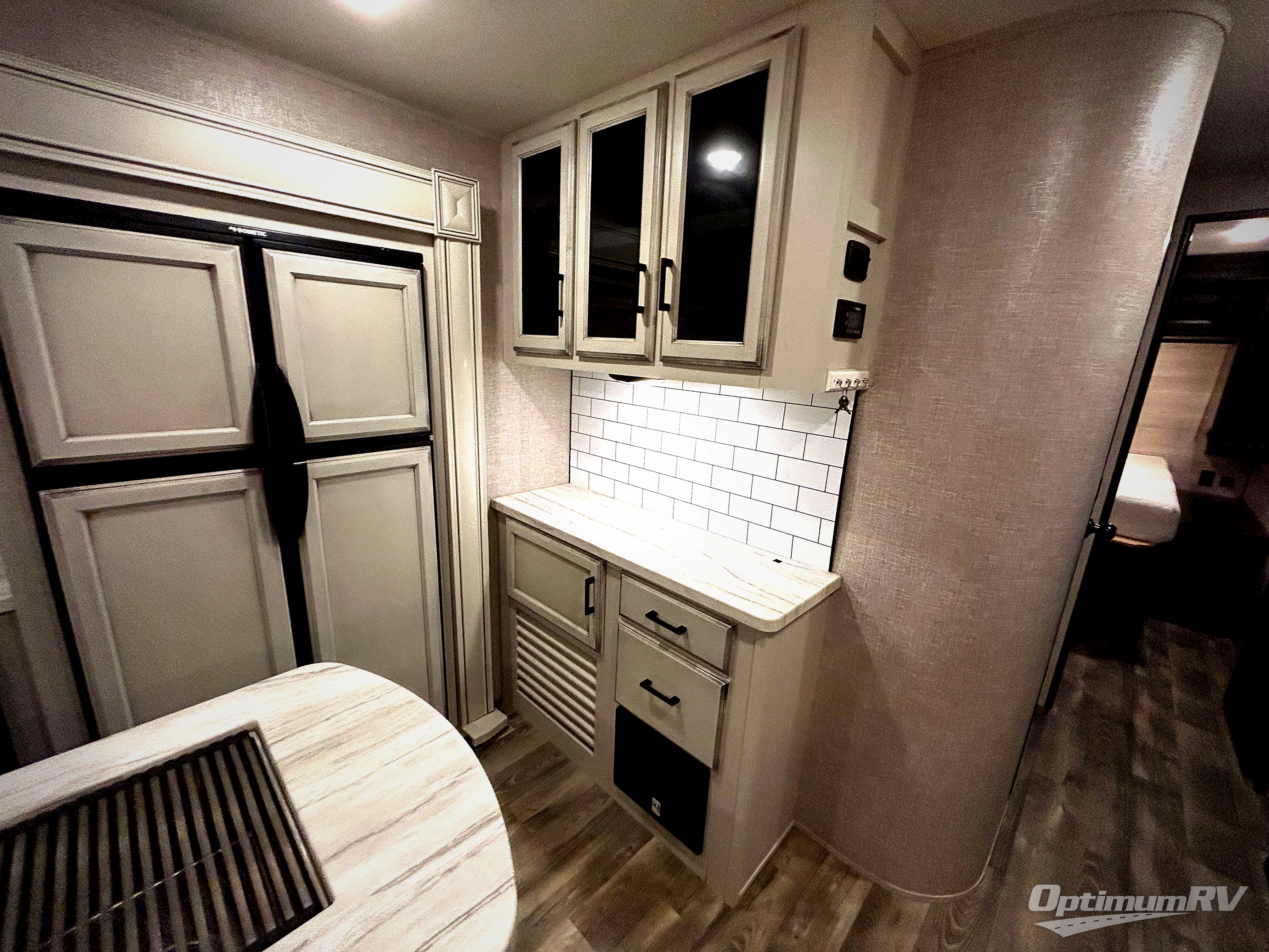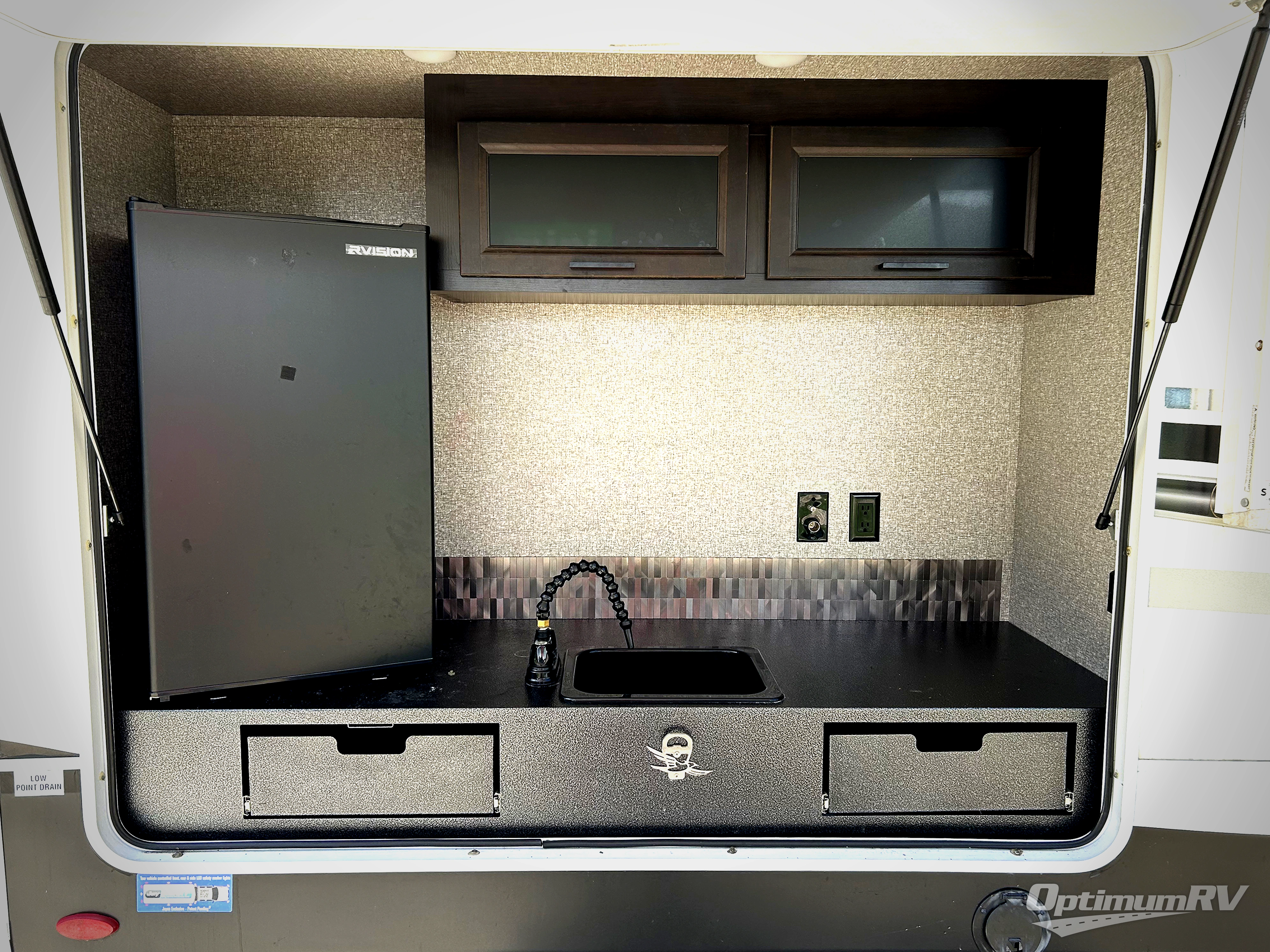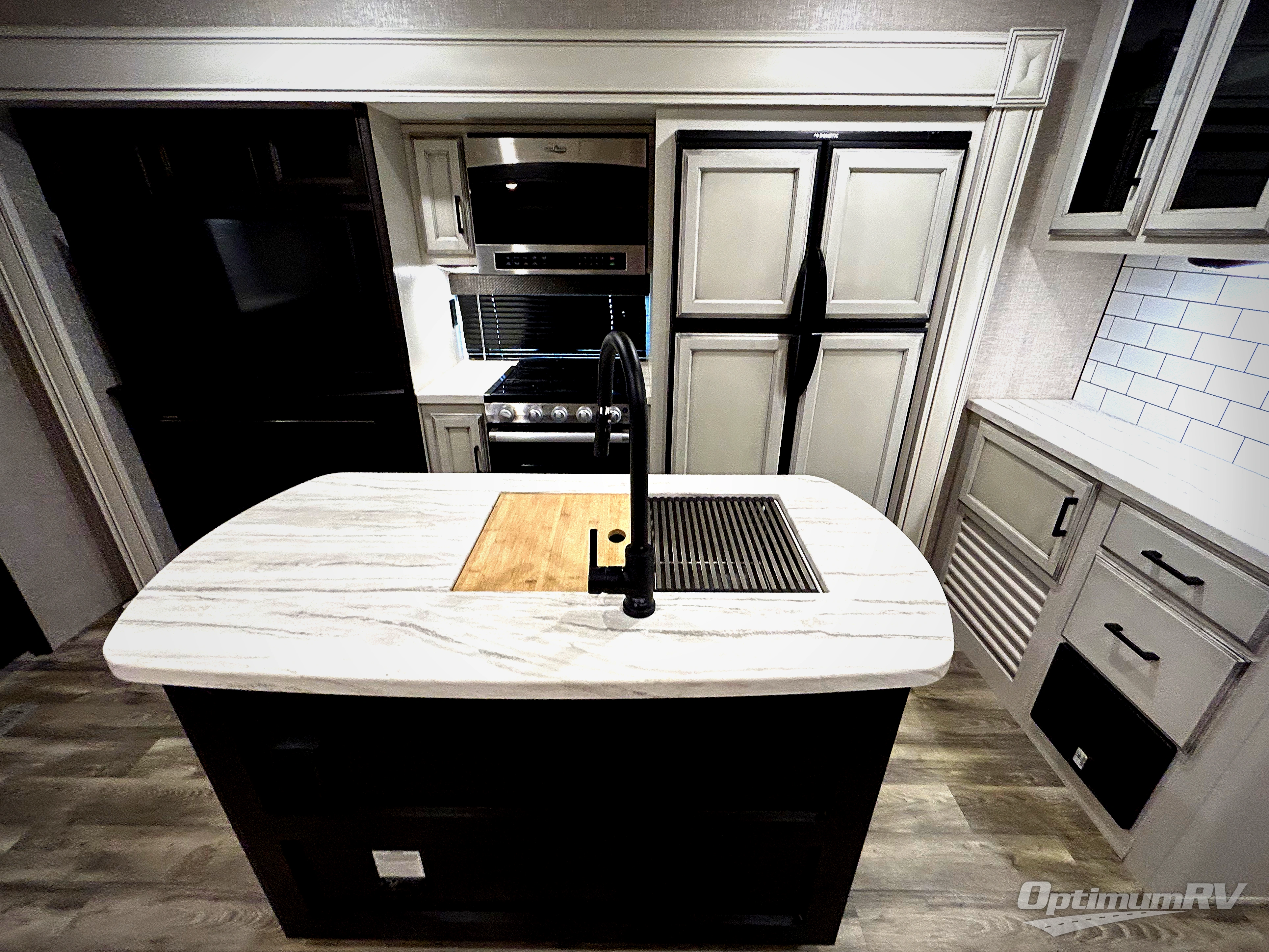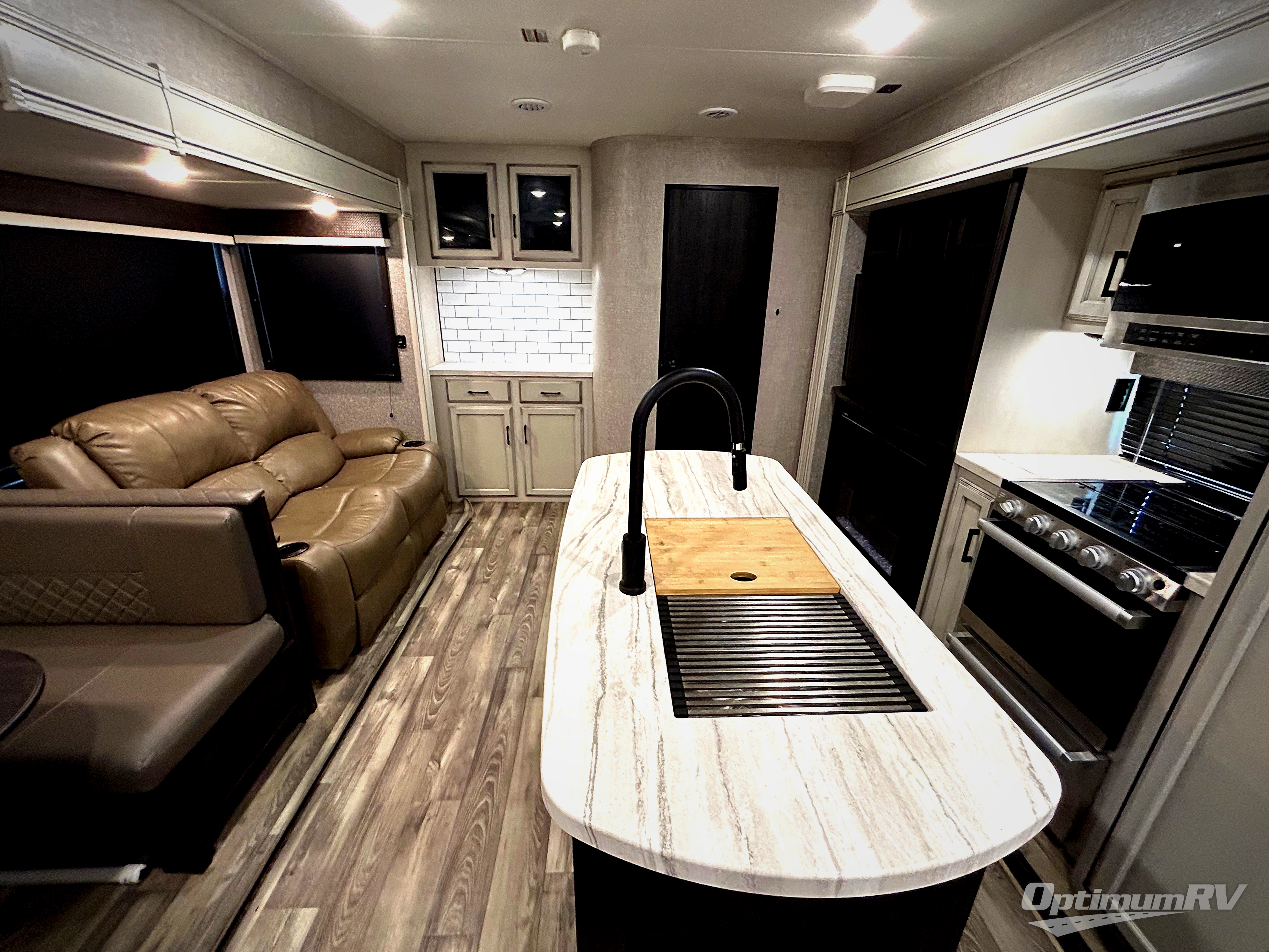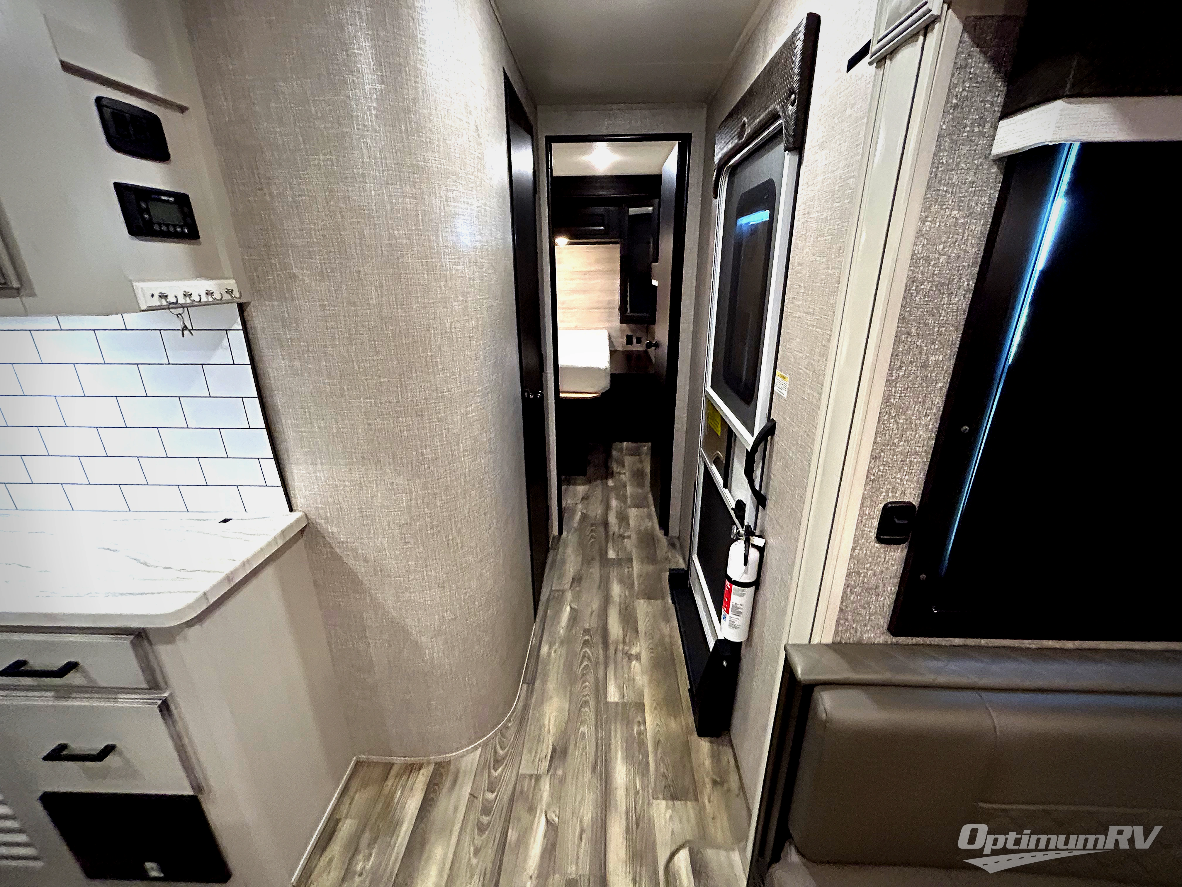 There are sleeping spaces galore in this travel trailer! From the rear private bunkhouse with a 39" x 74" bunk above a wardrobe and a 30" x 74" bunk above a tri-fold sofa slide to the front private bedroom with a queen bed, plus the tri-fold sofa and booth dinette can transform into extra sleeping spaces when you aren't using them to relax or eat a meal. The bedroom also has a wardrobe that is prepped to add an optional washer and dryer so everyone can have clean clothes. The chef can prepare their best meals with the kitchen island and will enjoy having two hutches to store the essentials. They could even cook at the outside kitchen to breathe in some fresh air and enjoy the beautiful scenery!