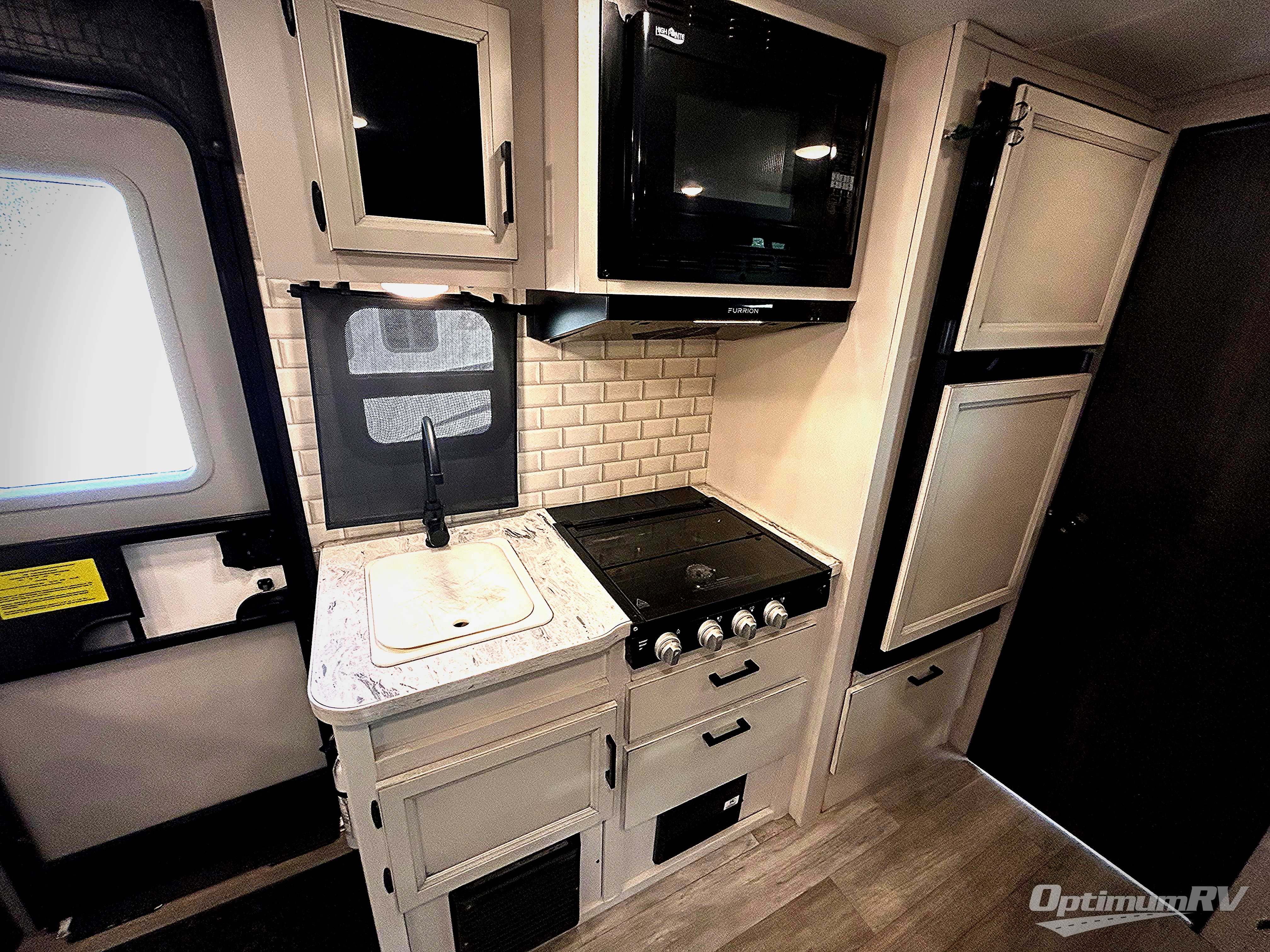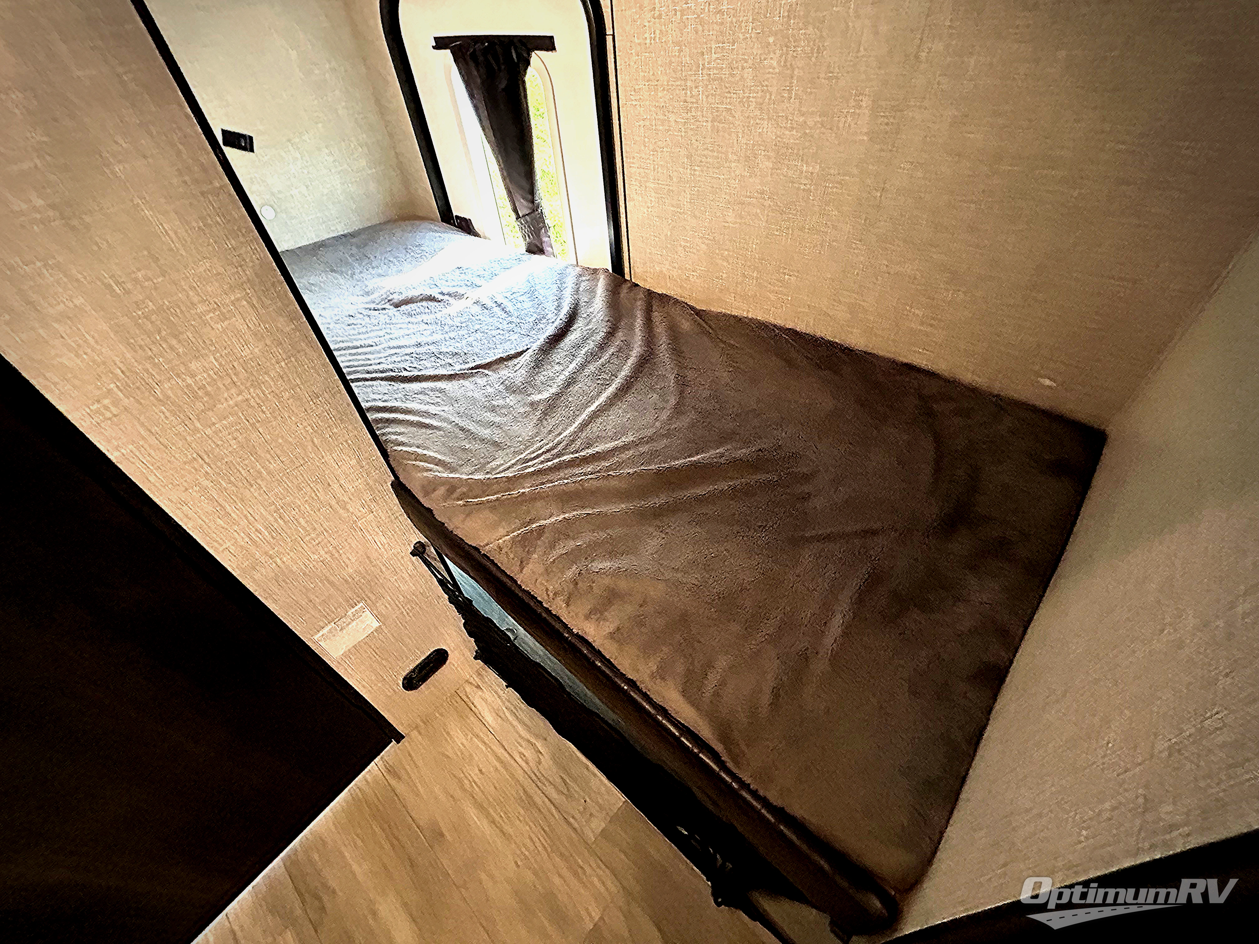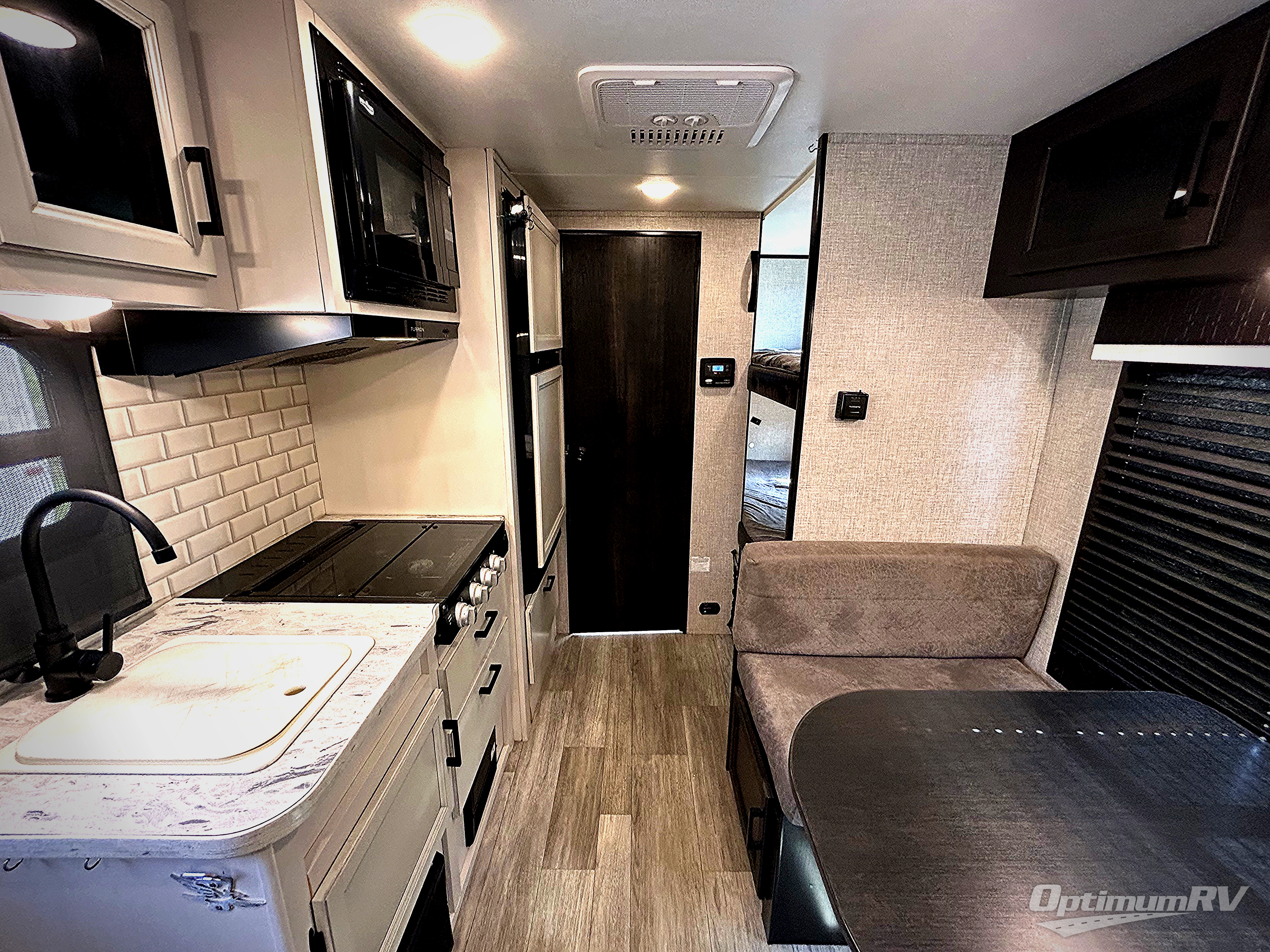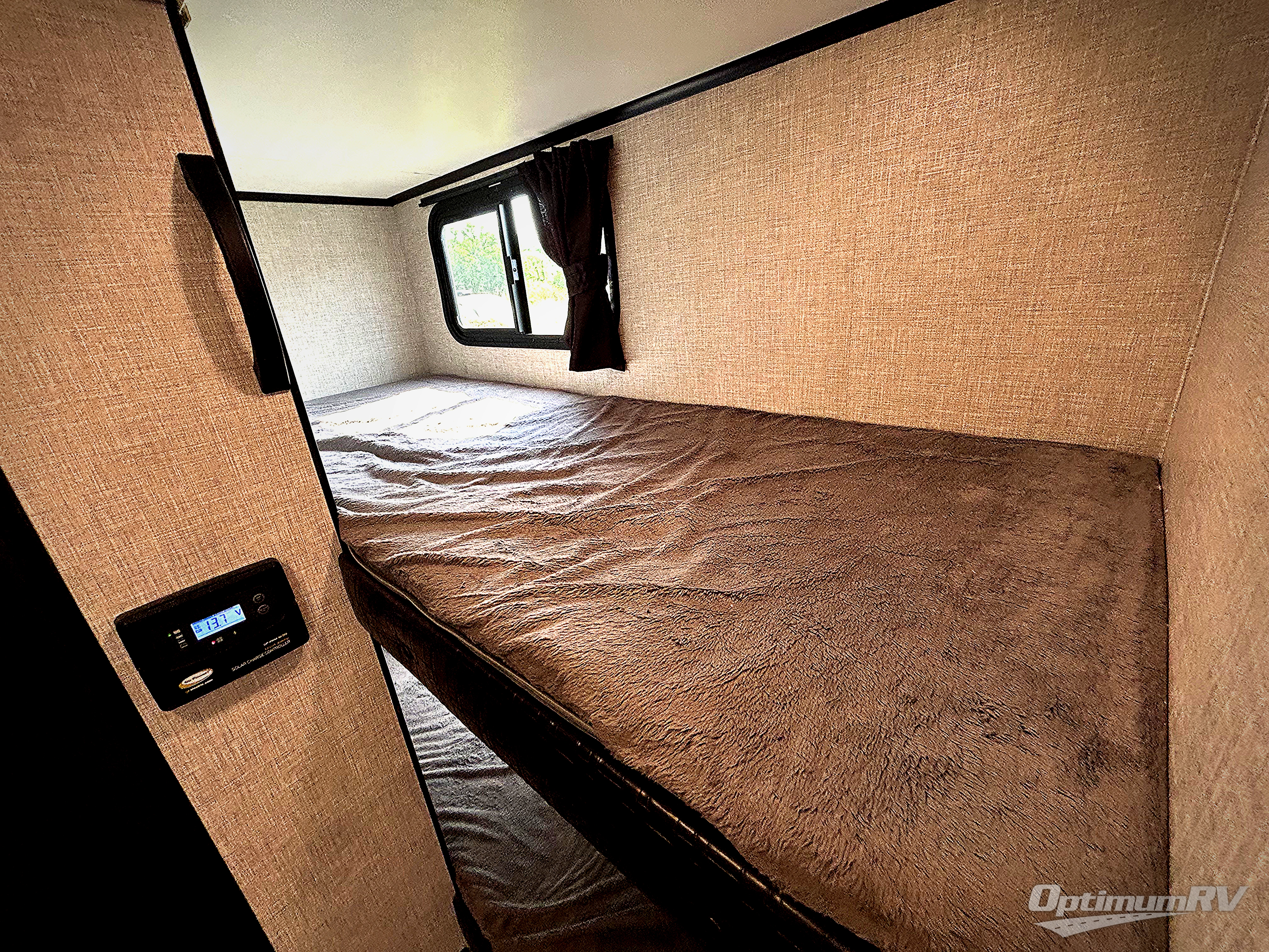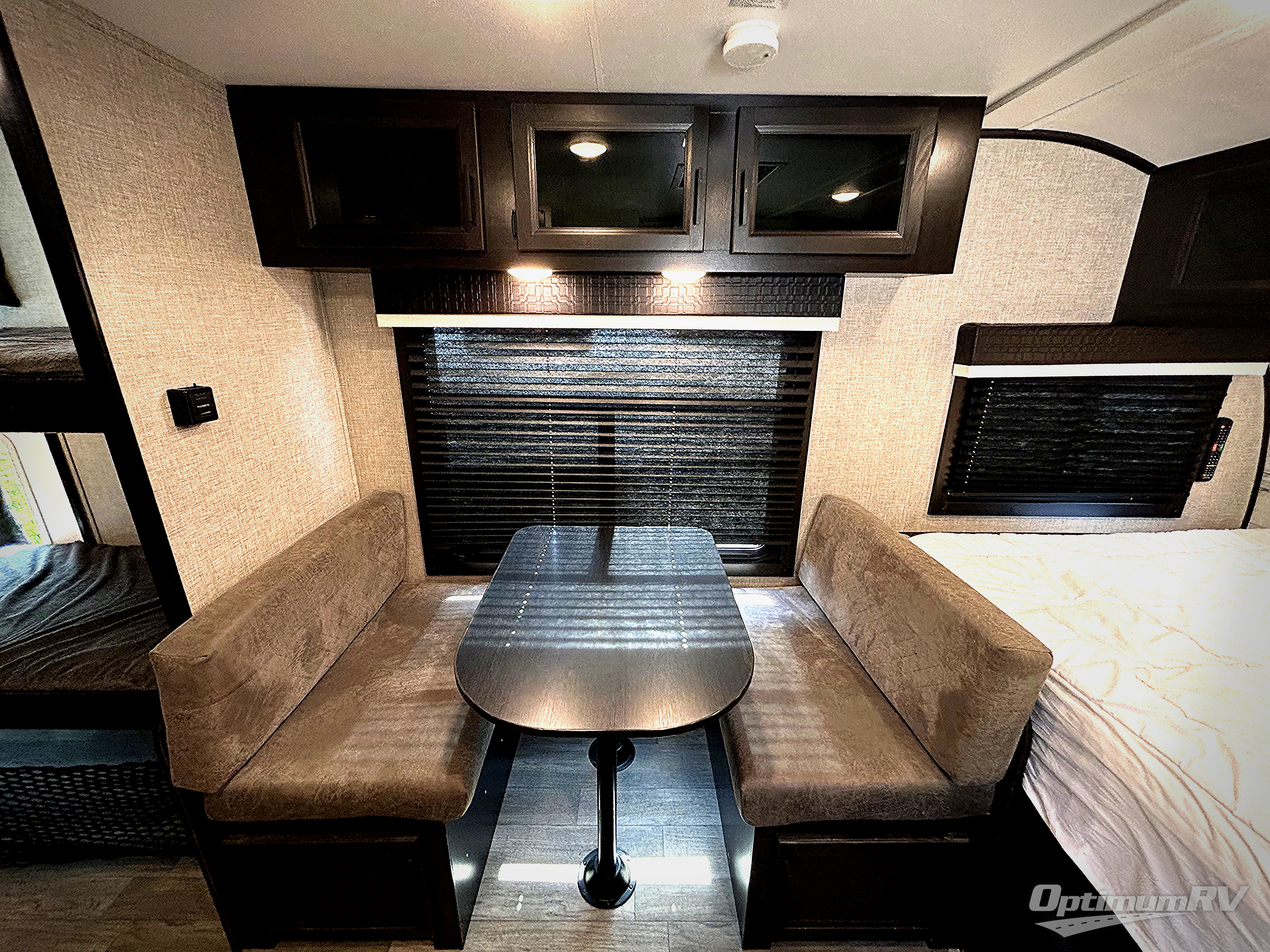 If you've been looking for a lightweight travel trailer with more sleeping space, your search is over with this model! There are bunk beds in the back near the full bath for convenience, a front queen bed, plus a booth dinette that will double as dining and sleeping space. This model also includes overhead compartments for your belongings, plus exterior storage for you fishing poles or tackle boxes.