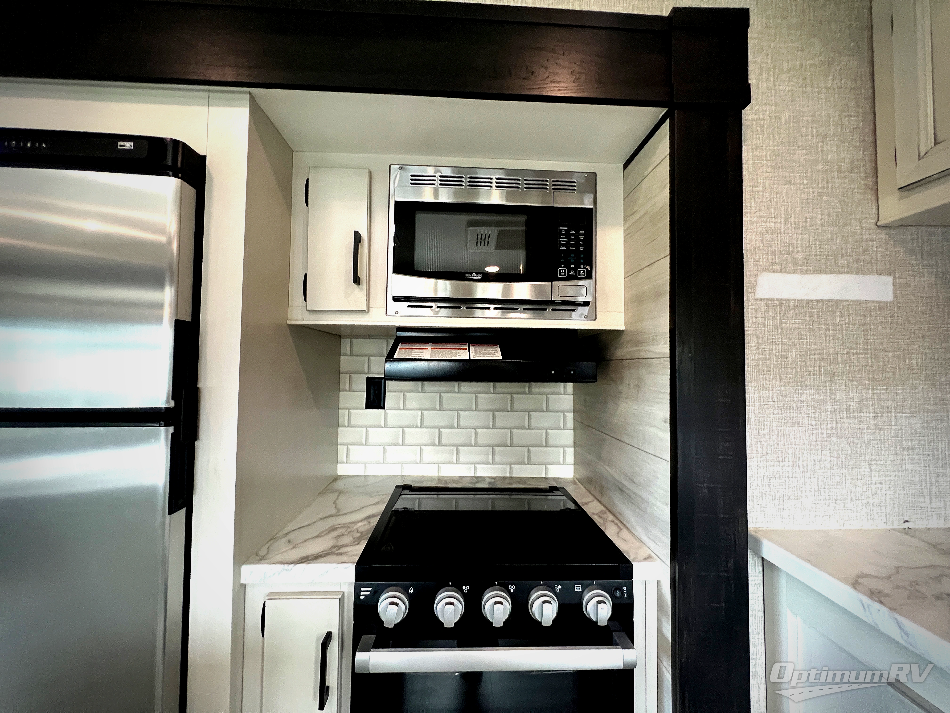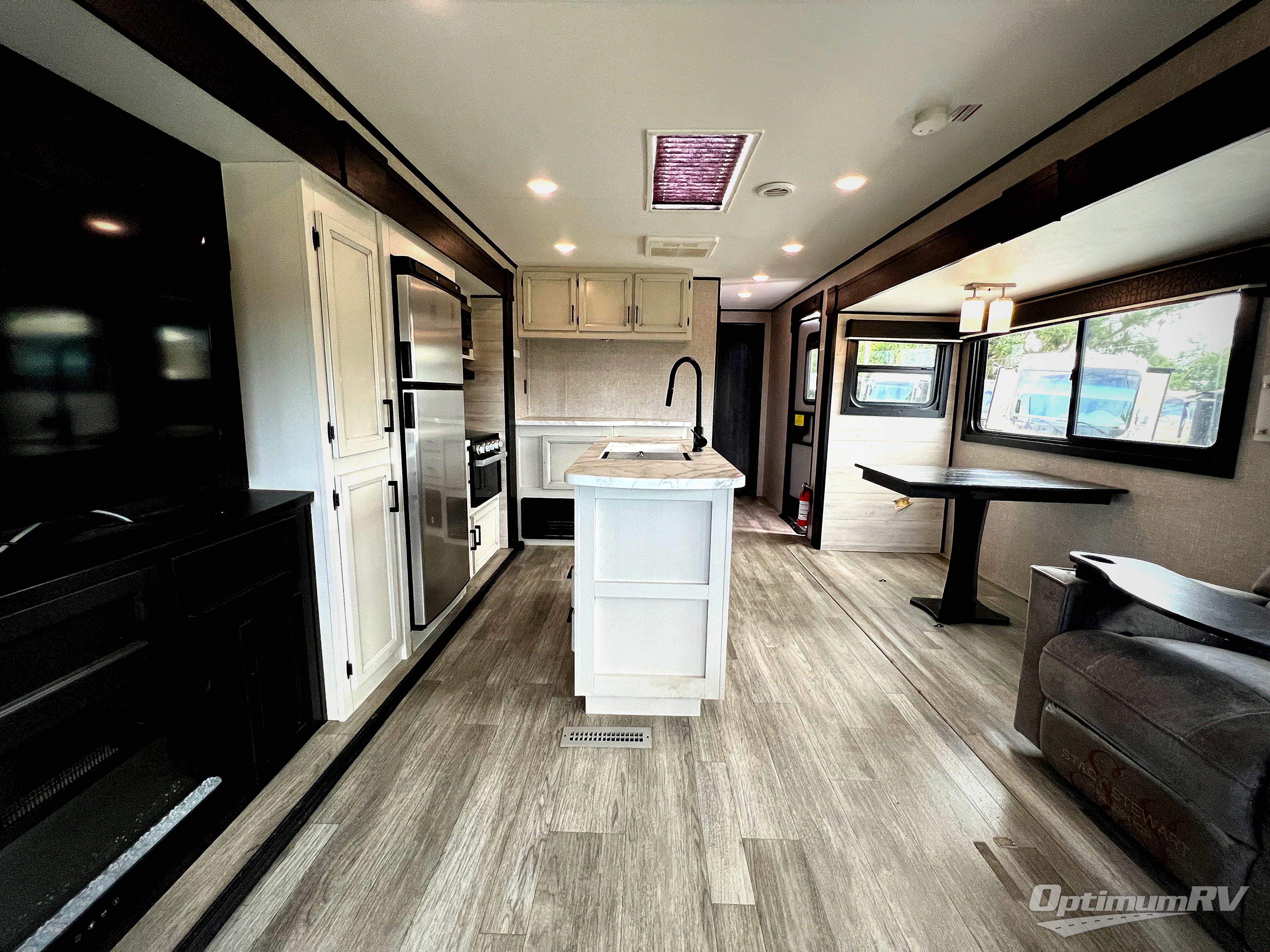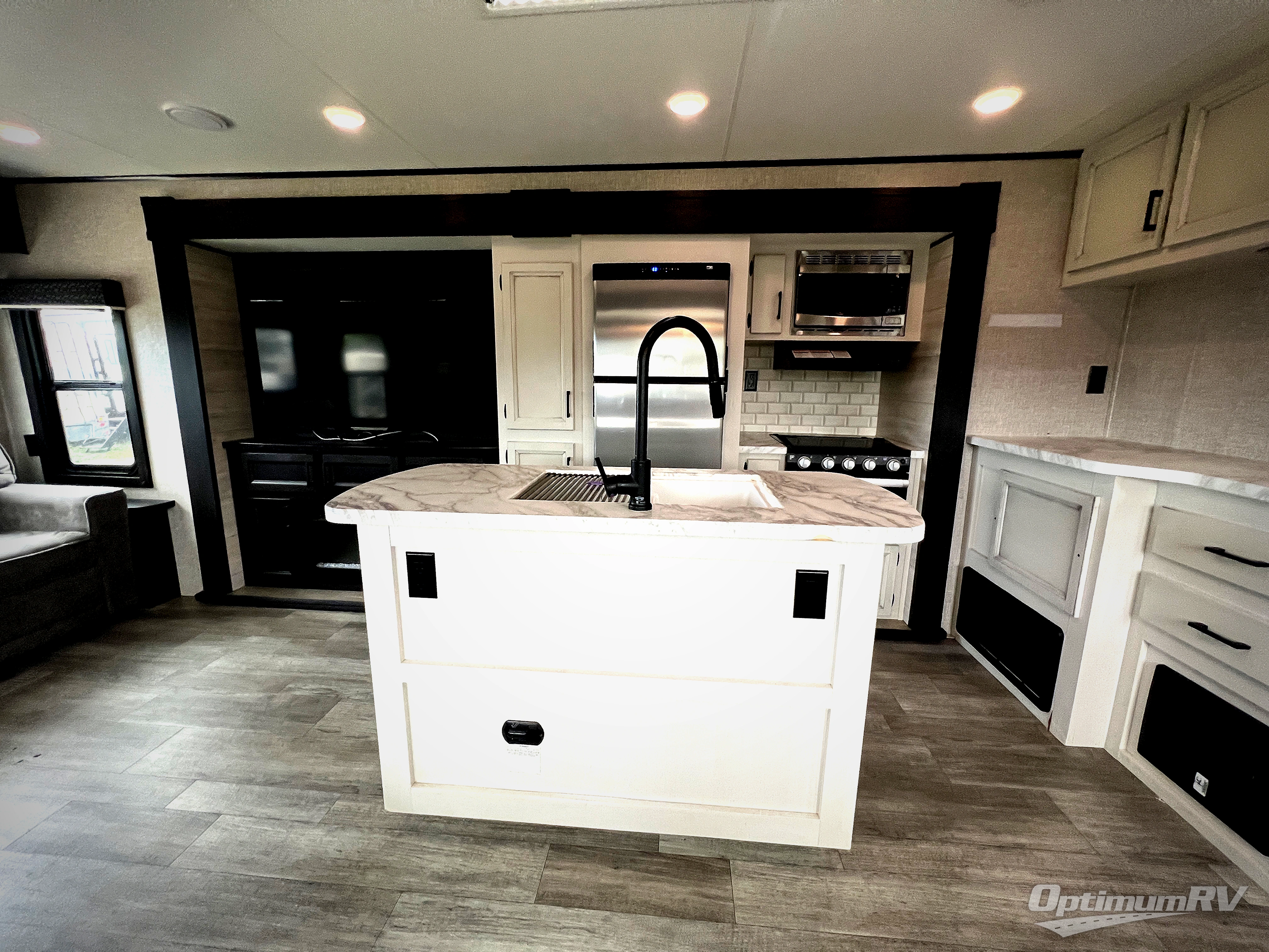 This Jay Flight travel trailer is very similar to model 34RLOK with just a few tweaks! The fireplace sits below the entertainment center, and both items are across from the theater seating. You'll also have a jackknife sofa right there so that others can join in on the relaxation, and the booth dinette is situated next to the theater seating so that it can also be used as seating during movie nights. A kitchen island adds function to the kitchen, and it also serves as a great dishwashing station. You can cook just about anything on the three-burner range, and the pantry will help you store your snacks. You'll also be able to access the dual-entry bathroom from the main hallway or the front bedroom.