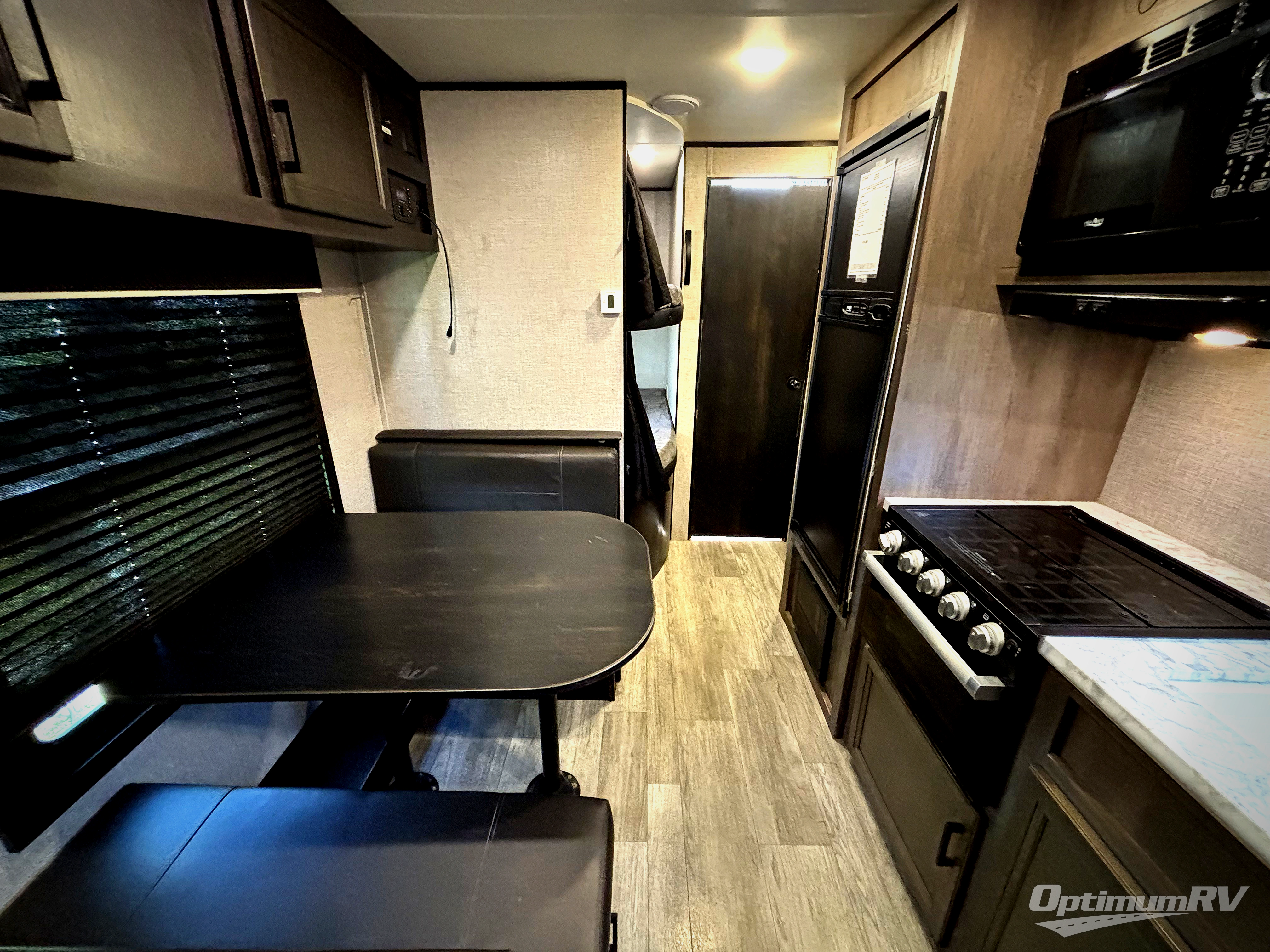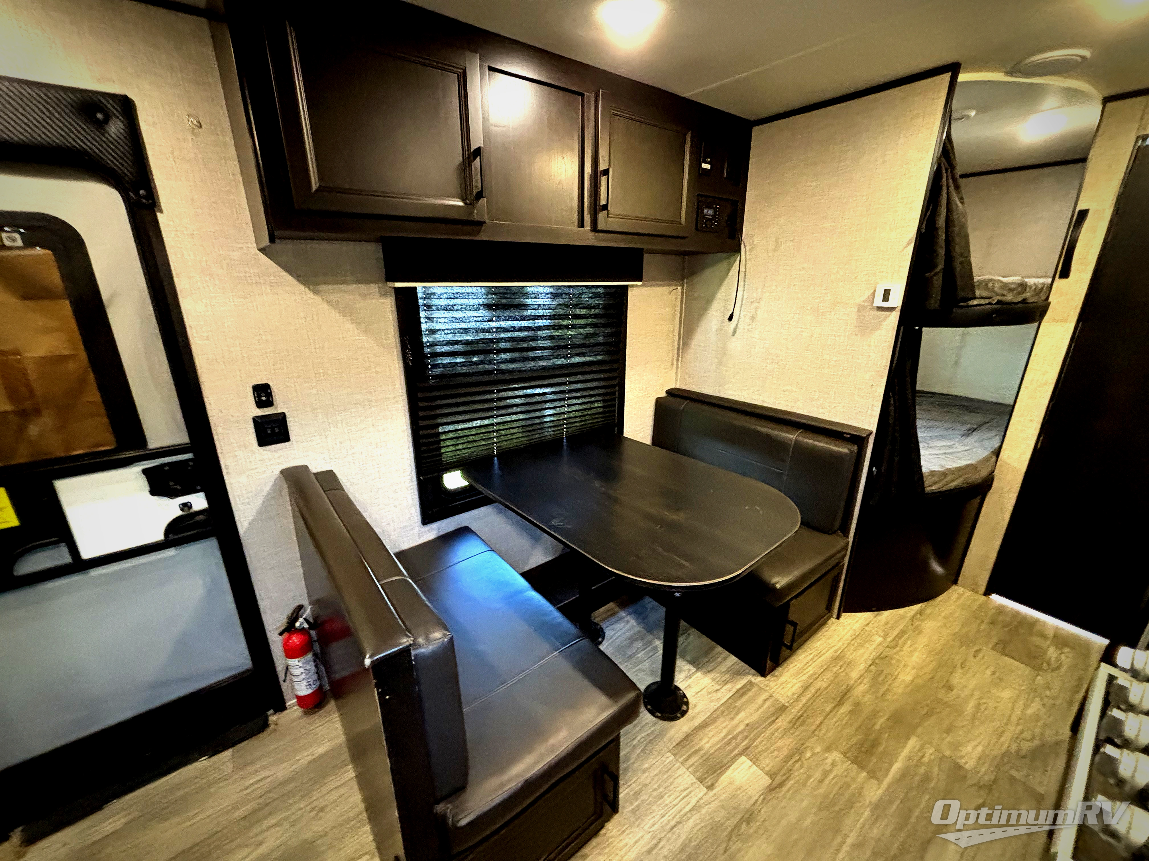 This easy to setup trailer offers a semi-private bedroom up front with a queen bed, semi-private double size bunks in the rear thanks to the curtains, and a private toilet and tub/shower room. The bathroom sink is just outside the door allowing two people to get ready for bed at once. The galley kitchen offers full amenities, and two can dine at the booth dinette and some can relax on the jack-knife sofa. Both furnishings offer extra sleeping space. And you might like to add the Chil N' Stor option which adds a fridge and counter space along the exterior to serve meals outside and store extra beverages.