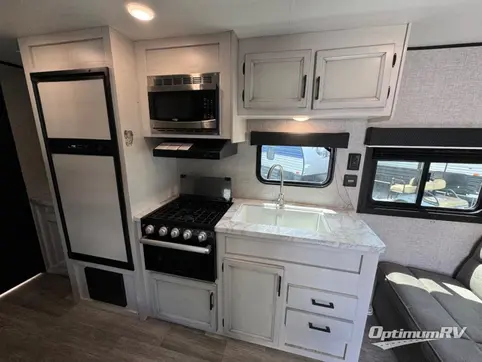 This easy to setup trailer offers a semi-private bedroom up front with a queen bed, semi-private double size bunks in the rear thanks to the curtains, and a private toilet and tub/shower room. The bathroom sink is just outside the door allowing two people to get ready for bed at once. The galley kitchen offers full amenities, and two can dine at the booth dinette and some can relax on the jack-knife sofa. Both furnishings offer extra sleeping space. And you might like to add the Chil N' Stor option which adds a fridge and counter space along the exterior to serve meals outside and store extra beverages.