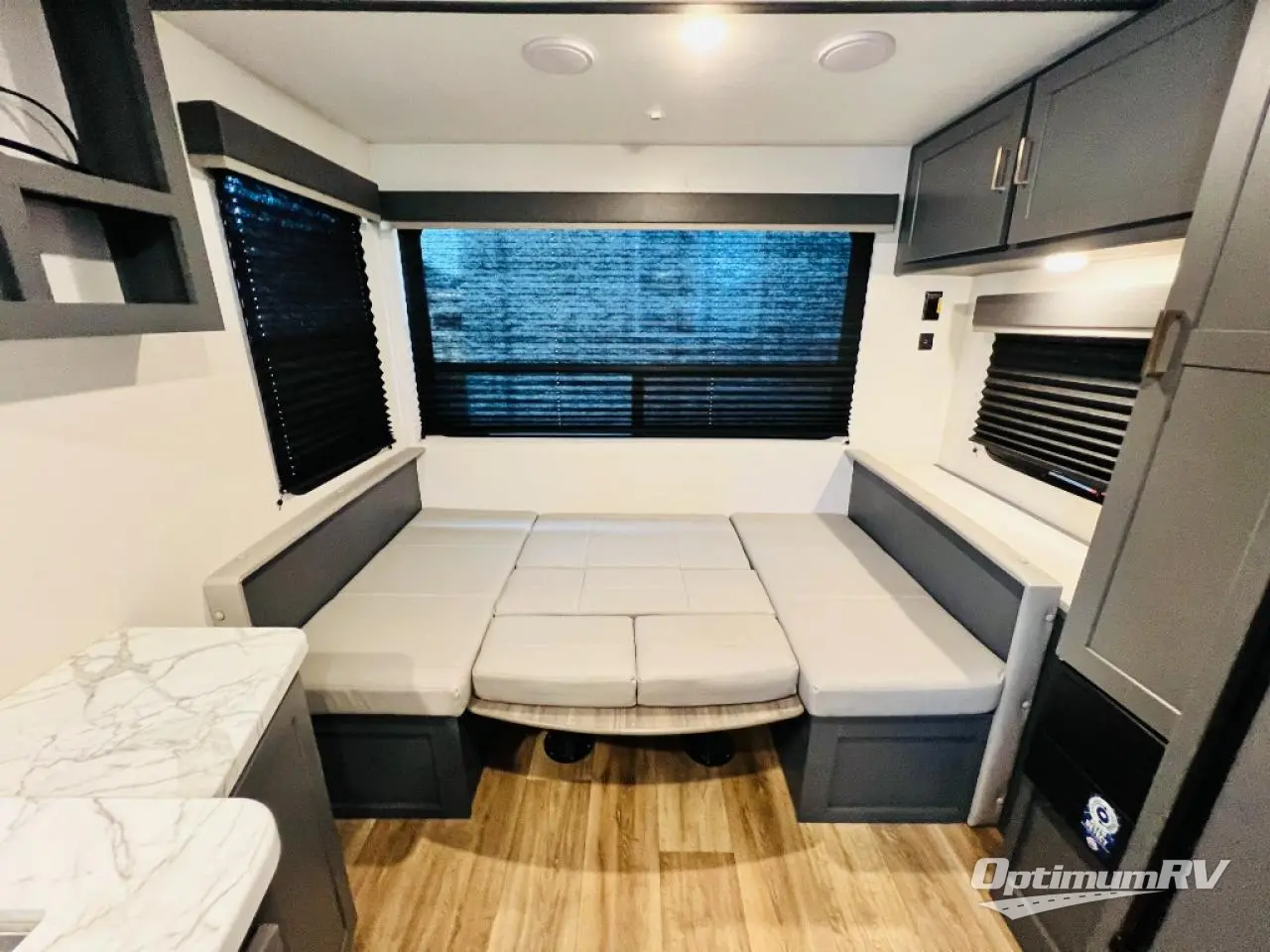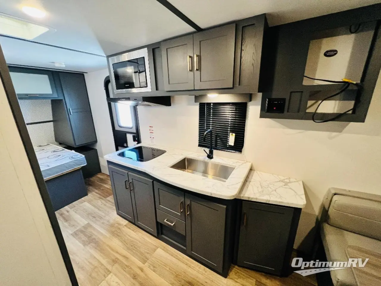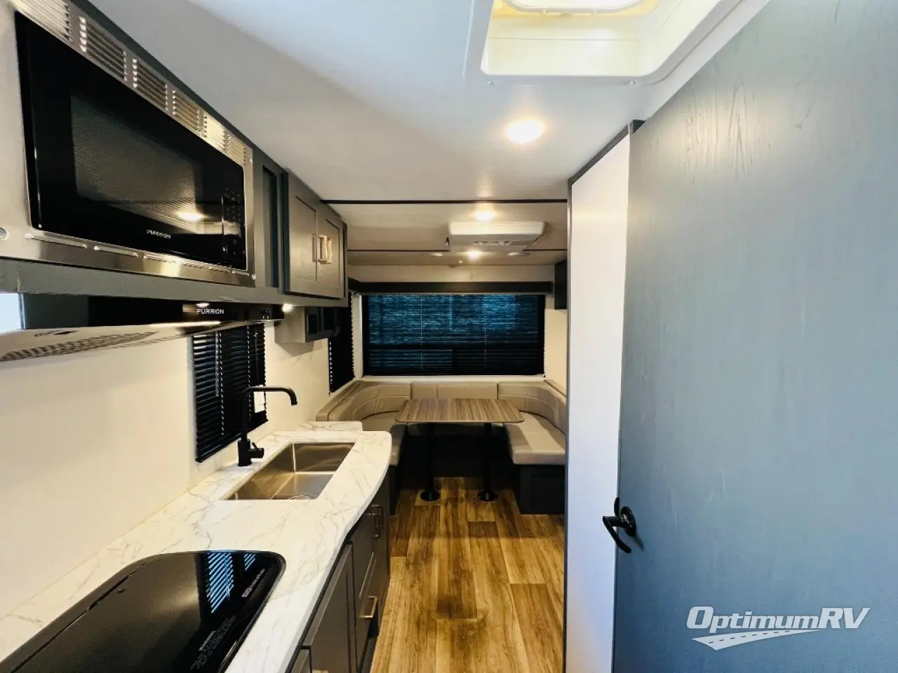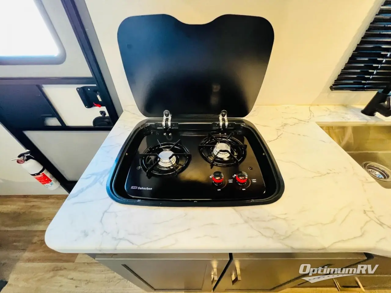 Simple and lightweight; this travel trailer is the unit you've been searching for! Once you arrive at your destination, unload the pass-through storage, then head inside to start lunch in the full kitchen. Here, you'll find a single basin stainless steel sink with a cover for more prep space, a Furrion microwave, plus a two burner gas range to cook meals on. The rear U-shaped dinette can serve as dining and sleeping space for your guests, while you take the front corner queen bed. Don't let this travel trailer slip away!