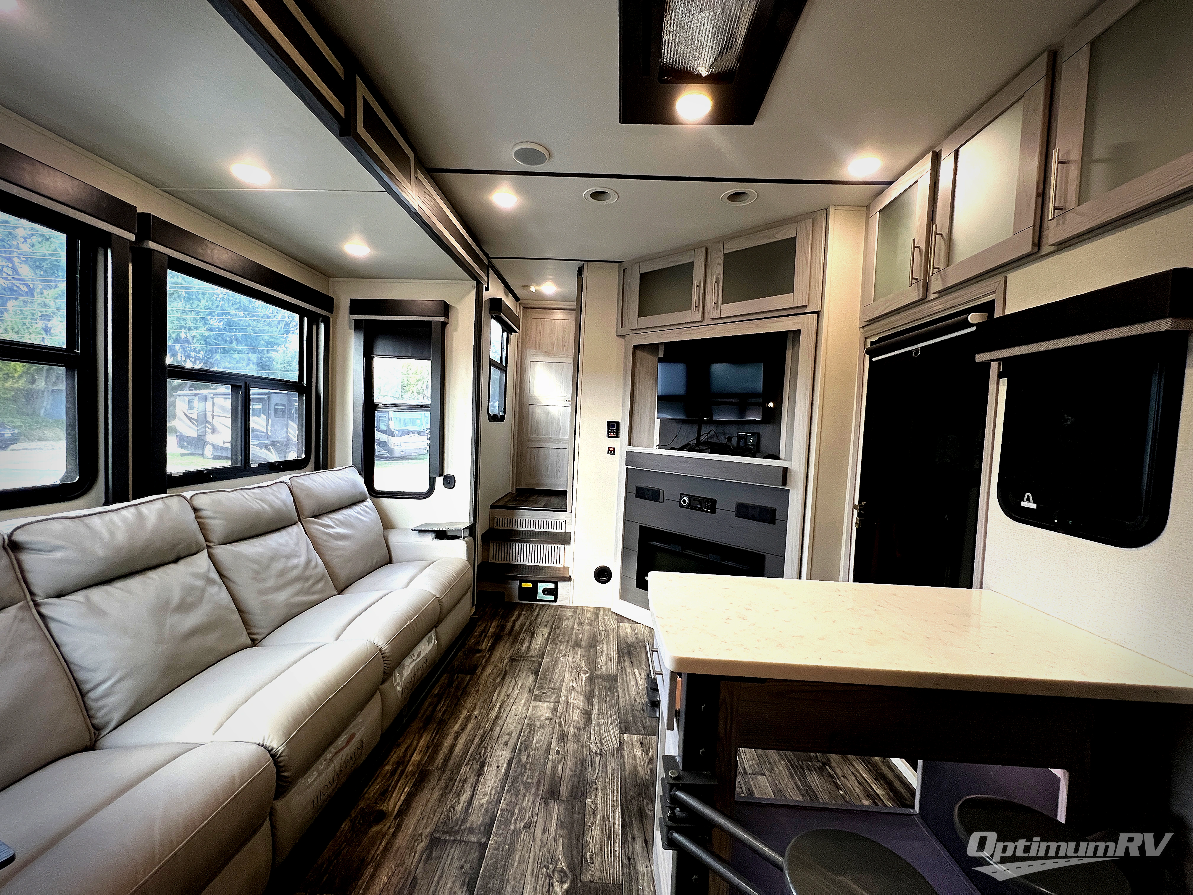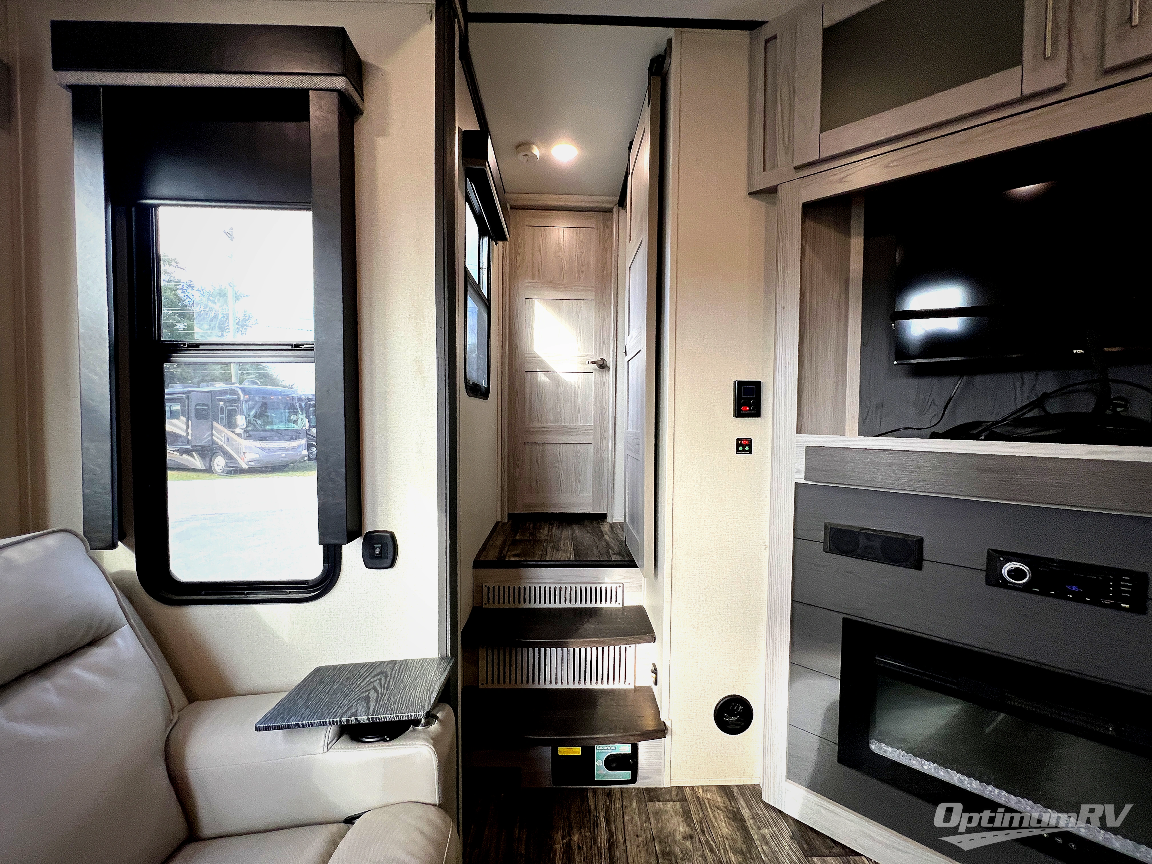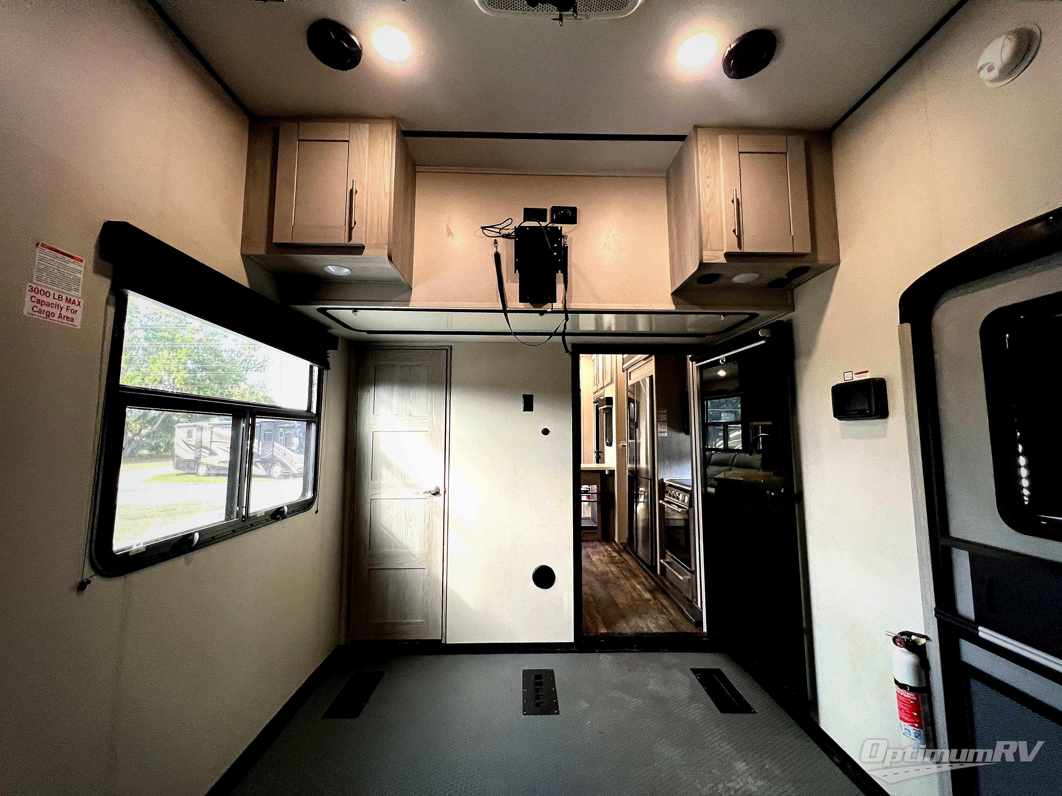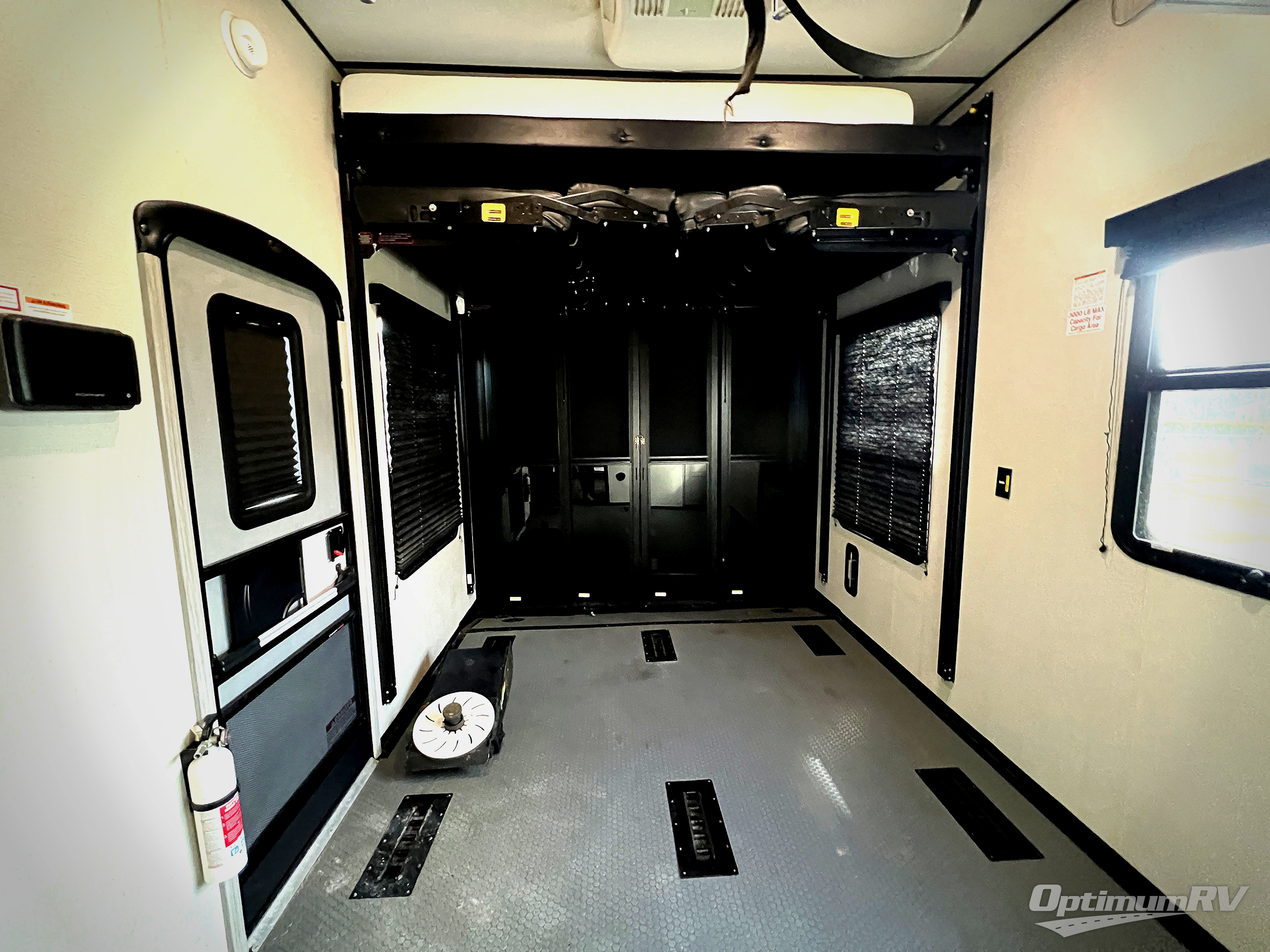 You're going to be the talk of the campground with a side patio on this toy hauler! As you walk-through the patio entry door, you will notice a table with swing-out stools to your left and a swiveling entertainment center with an LED TV, a fireplace, and a hidden pantry to your right, plus a residential four person sofa with heat, massage, and 110V/USB ports to charge your electronics. You will enjoy your own privacy with the front private bedroom which has a residential queen bed slide, a dresser with an LED TV, and a front master closet prepped to add an optional washer and dryer, plus an entrance into the dual entry bathroom. The rest of your gang will enjoy a good night's rest in the 13' garage area with dual opposing sofas with a queen bed above them and a loft with bunk mat. The garage also has a half bathroom for their convenience, an LED TV for entertainment, and a 8' MORryde zero gravity ramp door to easily load an unload your toys!