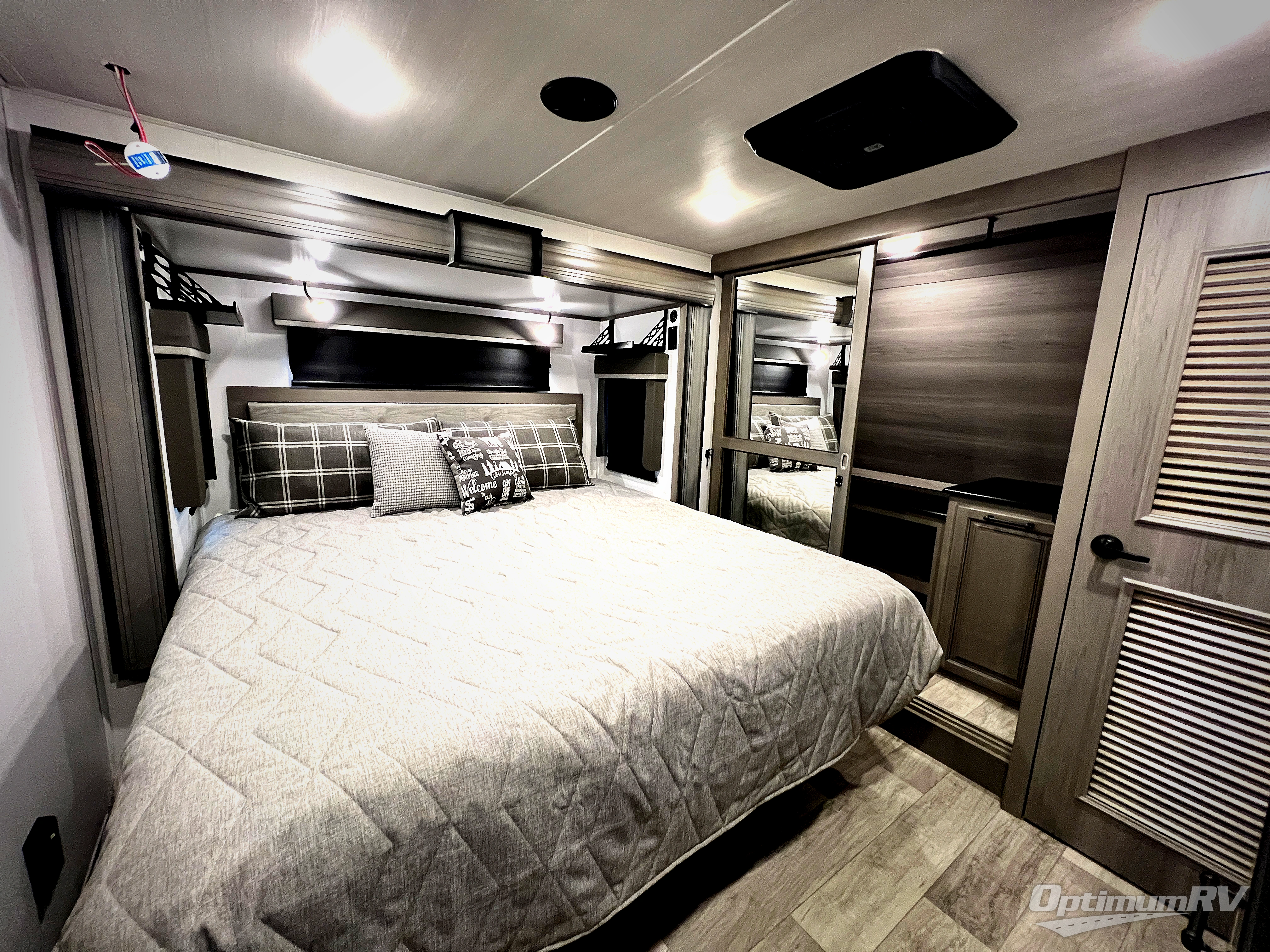 The coffee lover will enjoy camping in this fifth wheel with the coffee station in the kitchen! The kitchen also has an island, a large pantry, a glass top range with convection microwave and range hood that has a pull-down spice rack, a 18 cu. ft. residential refrigerator, and floor cabinets for your storage needs. Eat your meals and play card games at the free standing legless dinette with 110V outlets to charge your electronics. The separated living area has opposing hide-a-bed sofas and power Thomas Payne theater seating across from a rear entertainment center with a telescoping 50" LCD HDTV and a 5,000 BTU decorative fireplace heater with storage on either side. When you're ready to wind down your nights, head to the front private bedroom to enjoy a good night's rest on the king bed slide with storage underneath and there is a front closet with a clothing hamper and an area to add the optional stackable washer and dryer to have clean clothes for your longer trips!