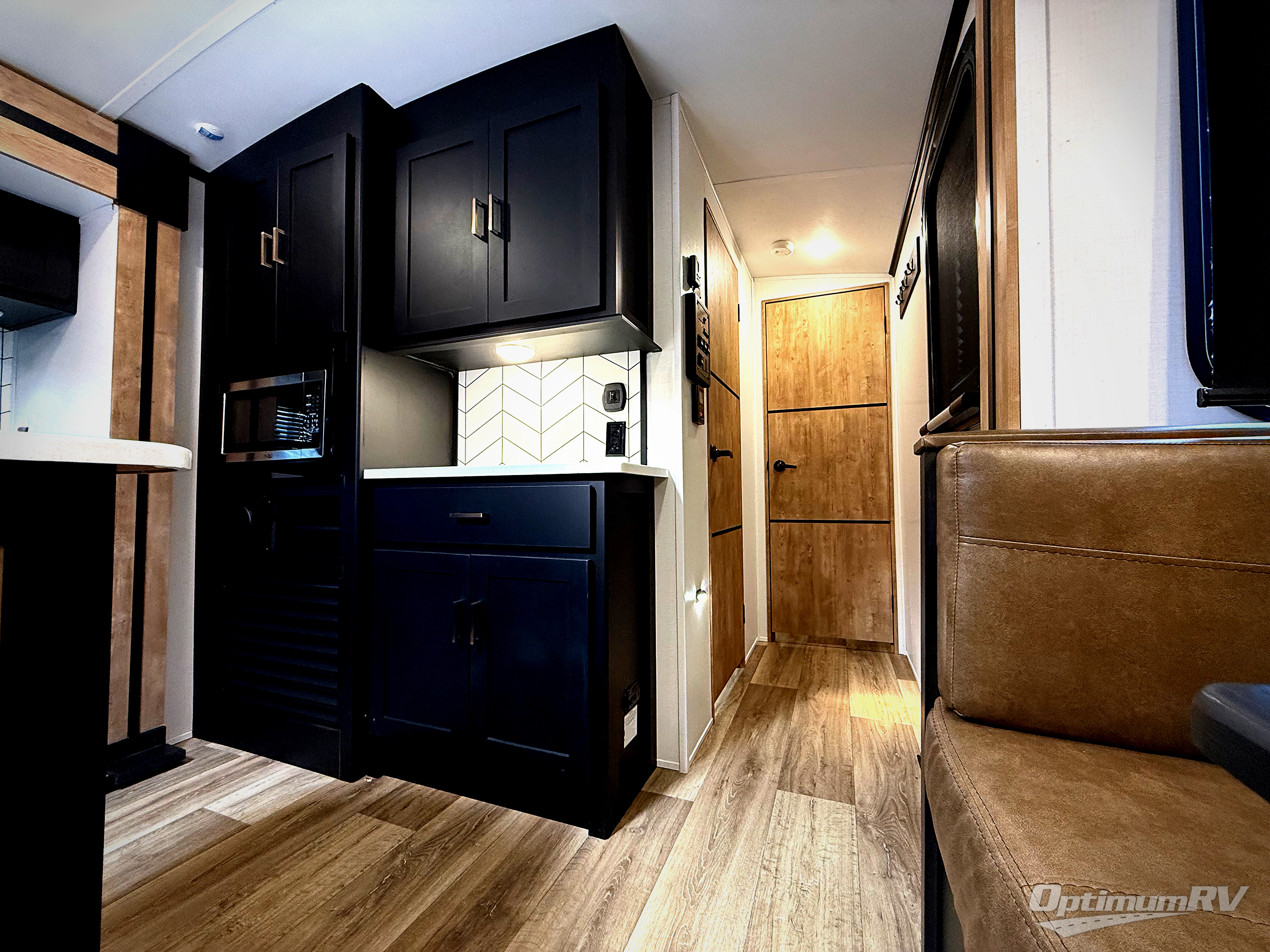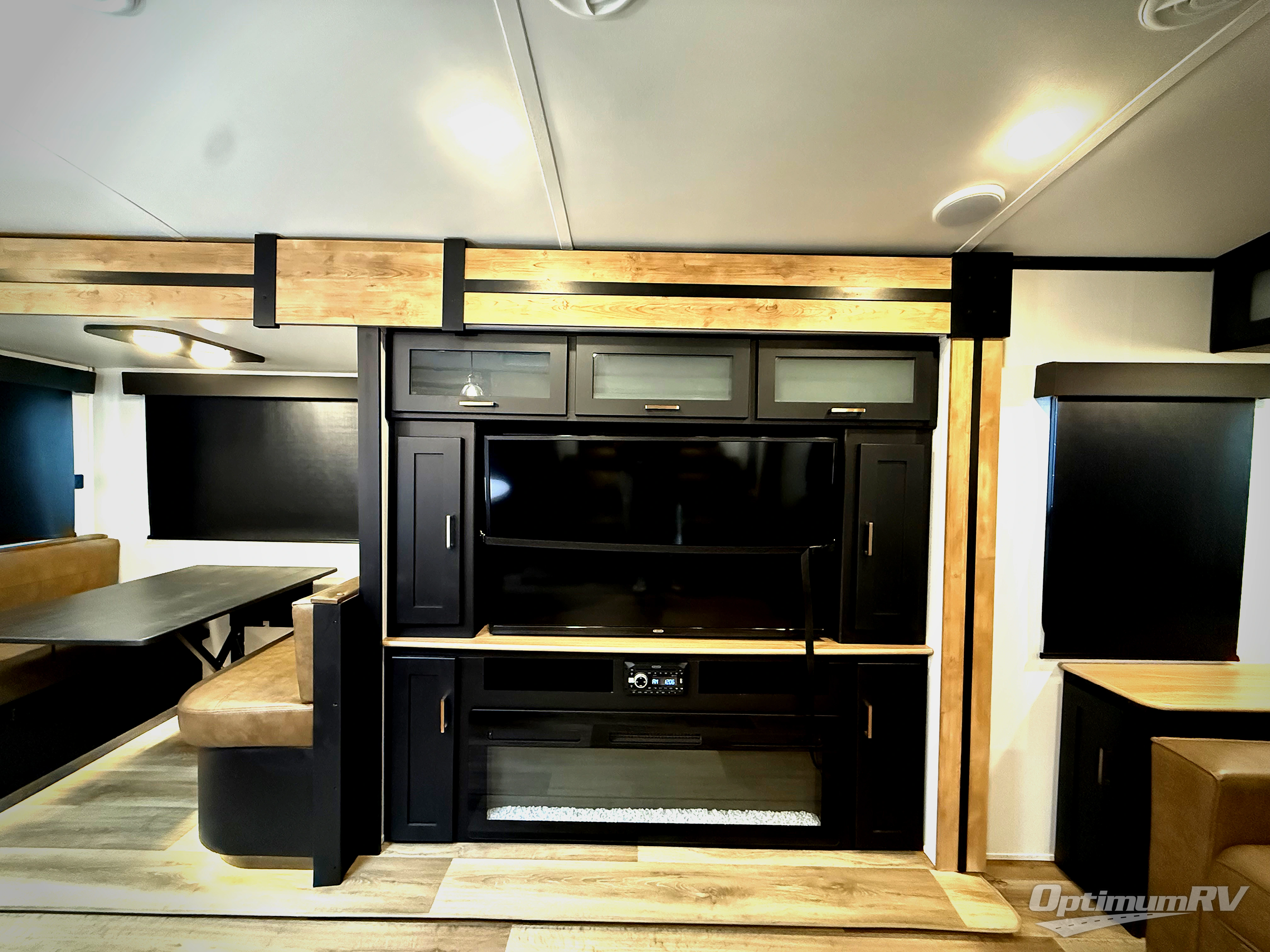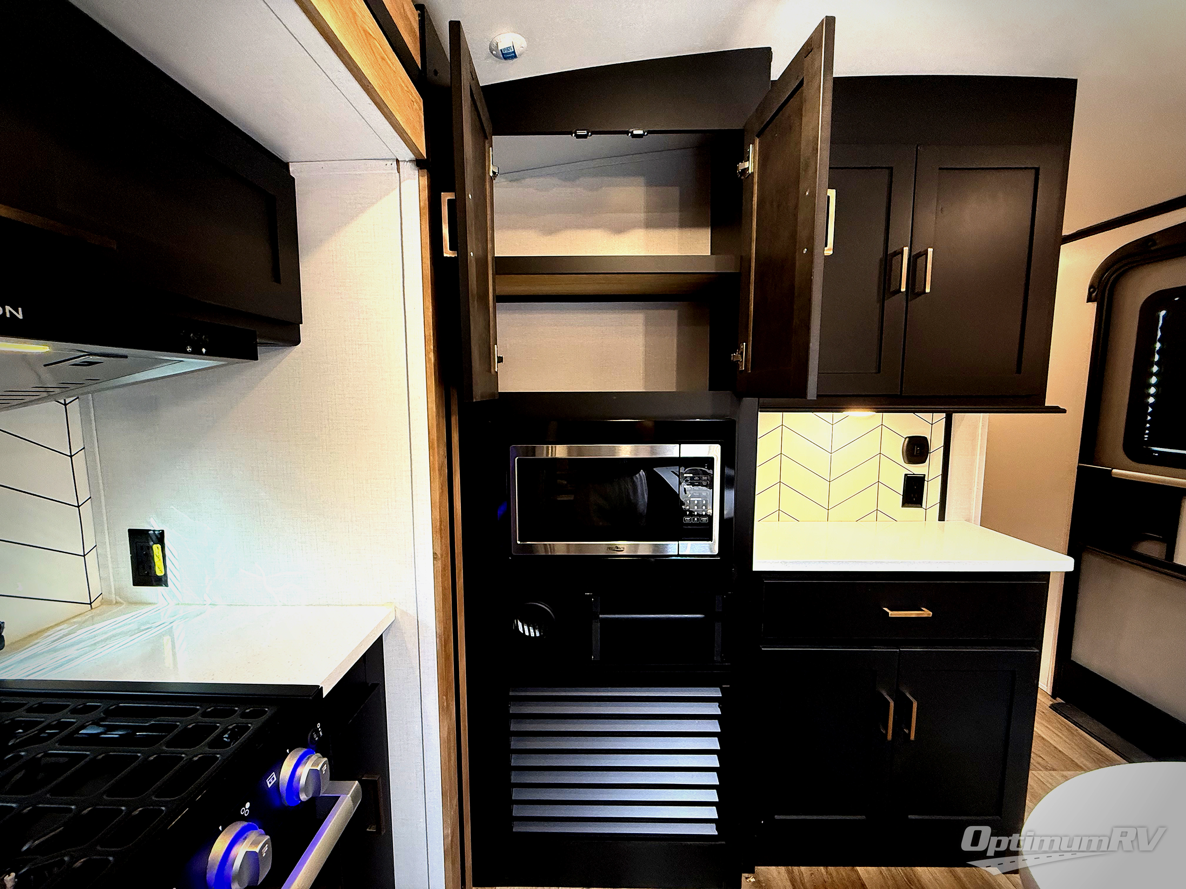 A spacious rear living area is created by two opposing slide outs giving everyone plenty of floor space to move from the sofa sleeper to the double entry bathroom and front private bedroom. You can relax on the theater seats while watching the 50" HDTV with fireplace below, and dine at the booth dinette. The kitchen island is a great place to wash the veggies and fruit, and prepare meals. The cook will have full amenities including more counter space near the microwave. And there is an outside kitchen with a flip-out stove and more. The slide out king bed gives you more space in the front bedroom, and you will find plenty of storage and a place for your best friend in the built-in pet kennel. You may choose to change the 10 cu. ft. refrigerator to an 8 cu. ft. option and/or replace the dinette that comes standard with a table and chairs option.