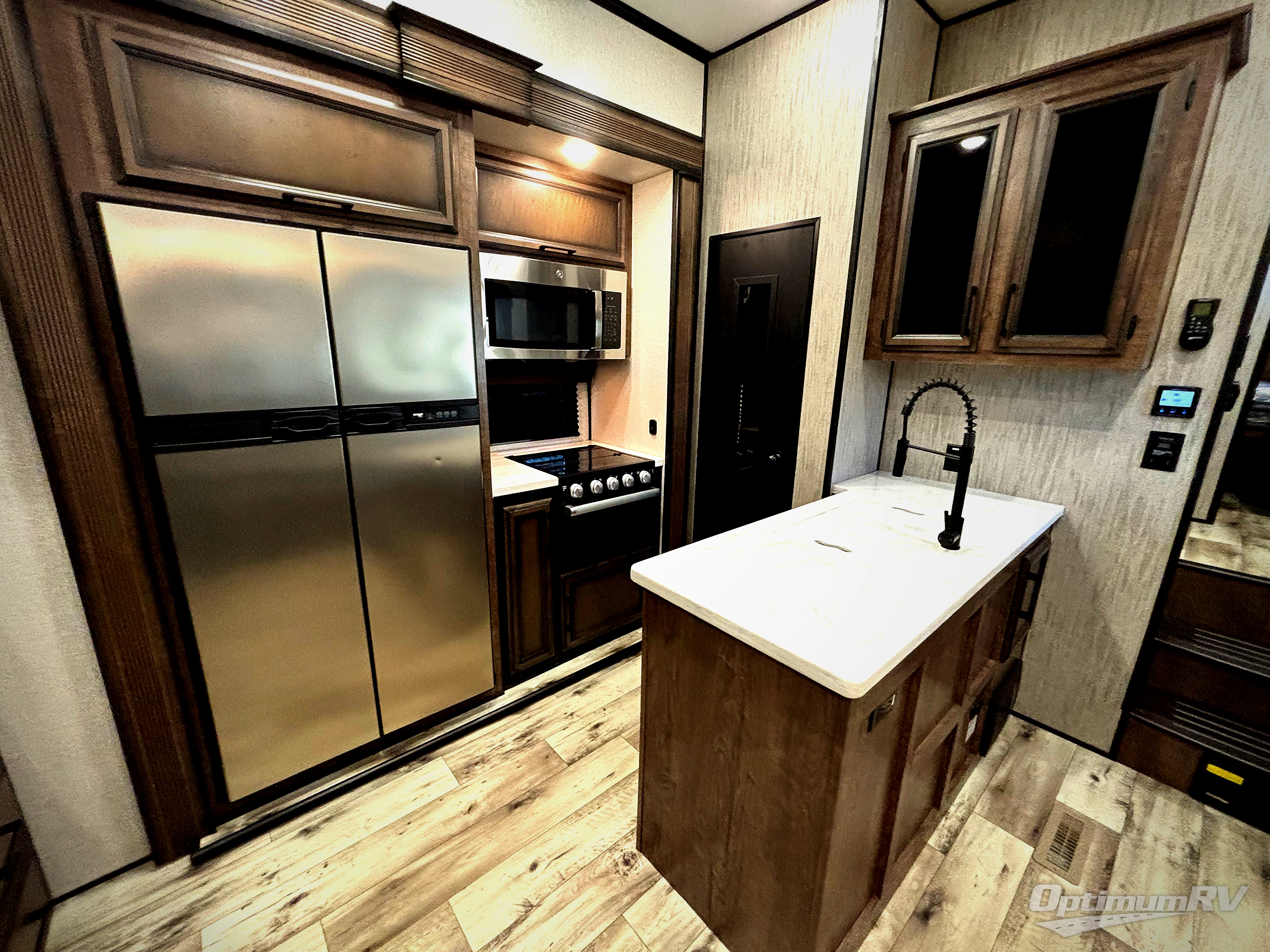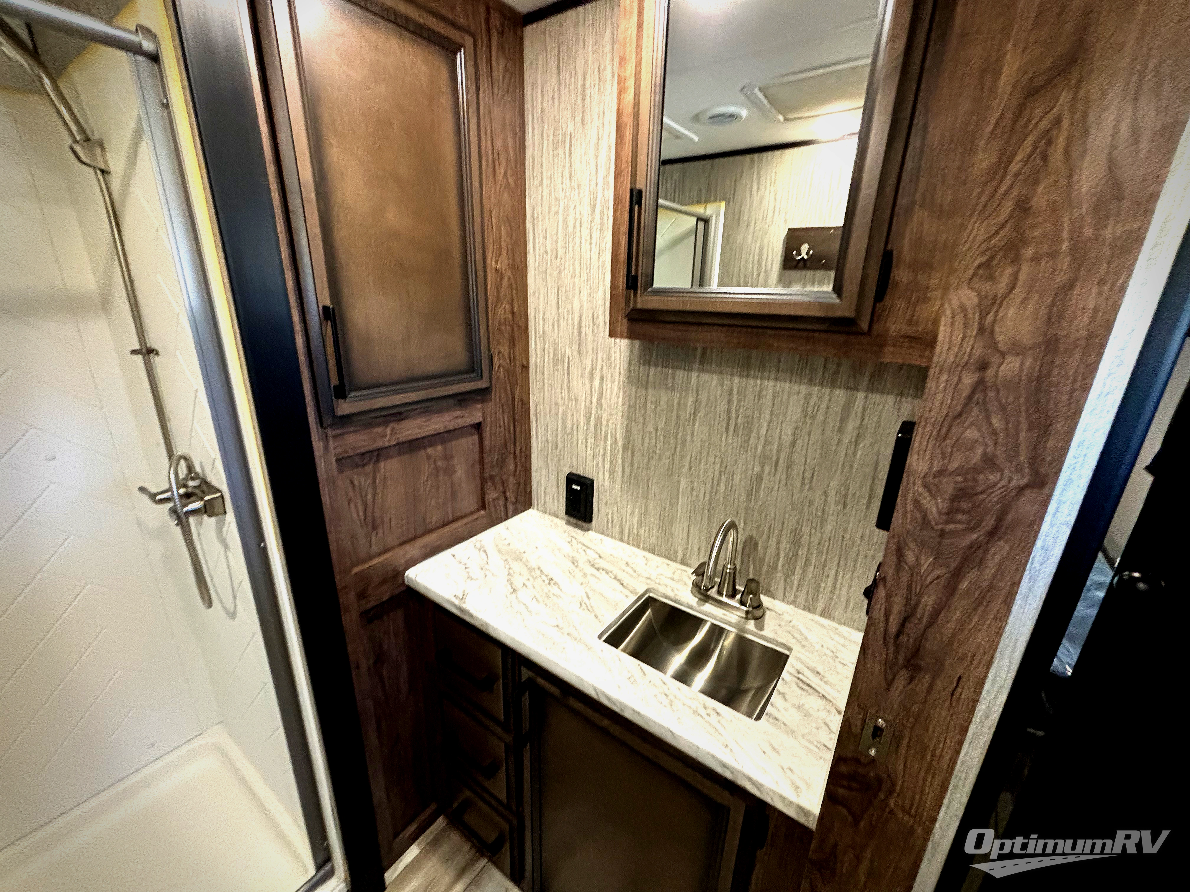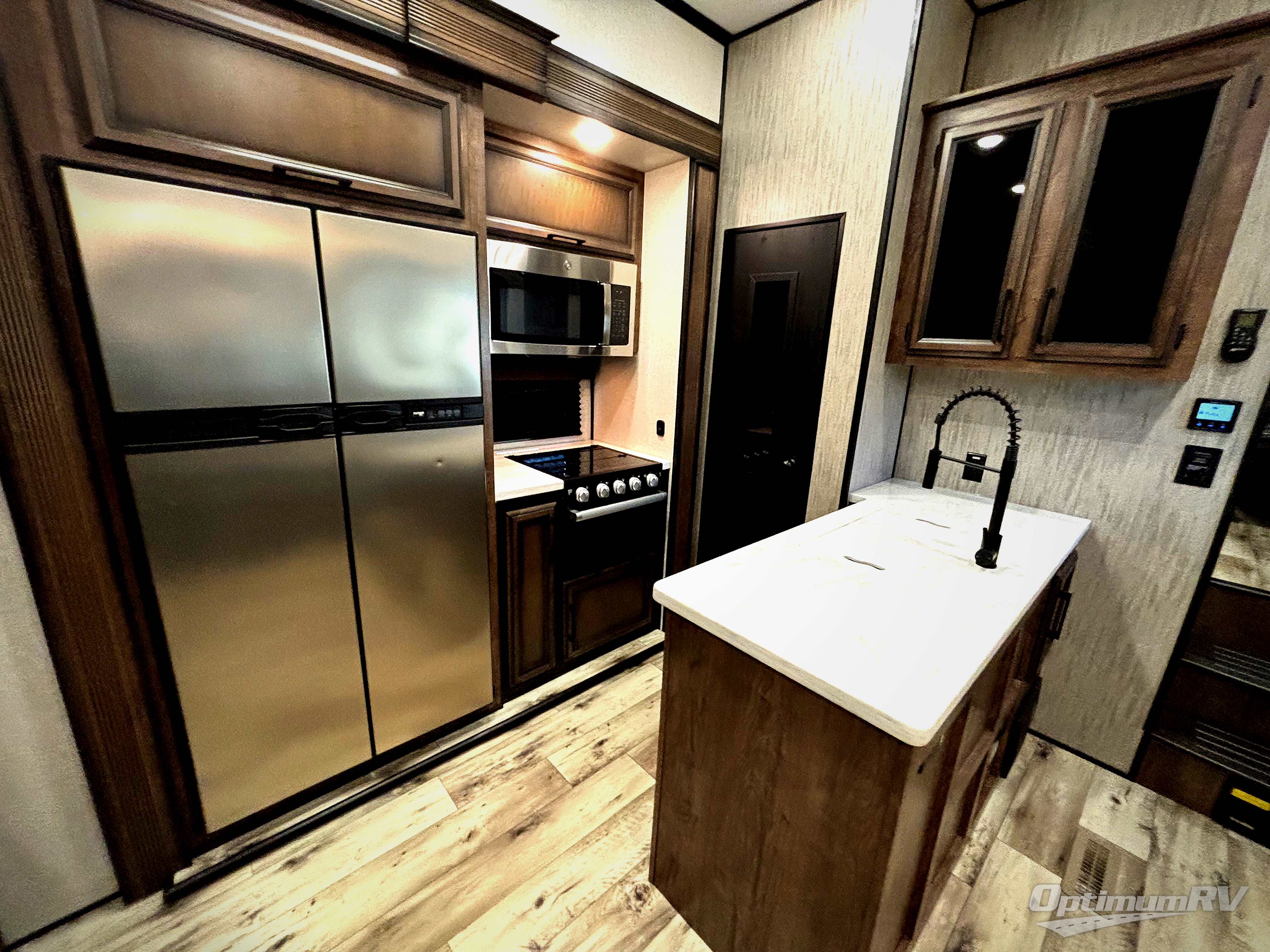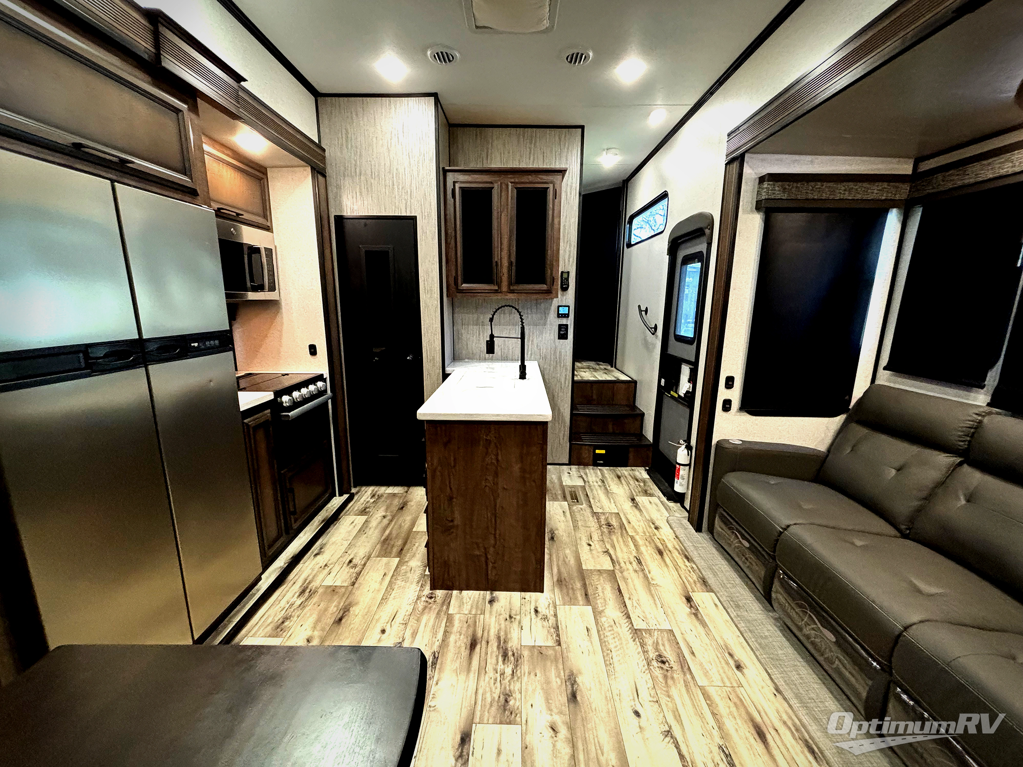 Spacious, luxurious and convenient are a few words you will be thinking each trip you take with this fifth wheel in tow! From the 15'9" separate garage to load up every toy you want, and the dual slides in the main living and kitchen area to the front master bedroom with a slide out wardrobe, there is lots of floor space. The garage also offers storage, access to the loft bed, plus the option to add a power bed with Sit and Sleep making this space a great area to relax after the rides. The 30 gallon fuel tank will keep the toys running, and the side man door is handy when you have the ramp cargo door closed. In the main living and kitchen area you can relax on the four-person super sofa with footrests, dine at the table with booth and chair seating, and watch the 43" Smart LED TV. The cook will love the counter peninsula to prepare and serve meals, and all the kitchen appliances in the slide out. Everyone can take turns getting cleaned up in the full bathroom, and you can retire to the master bedroom with a walk-around electric-tilt king bed or choose the queen option, and there is plenty of storage for your clothing plus a closet prepped for a washer/dryer option. You will find even more storage in the pass-through compartment along the exterior.