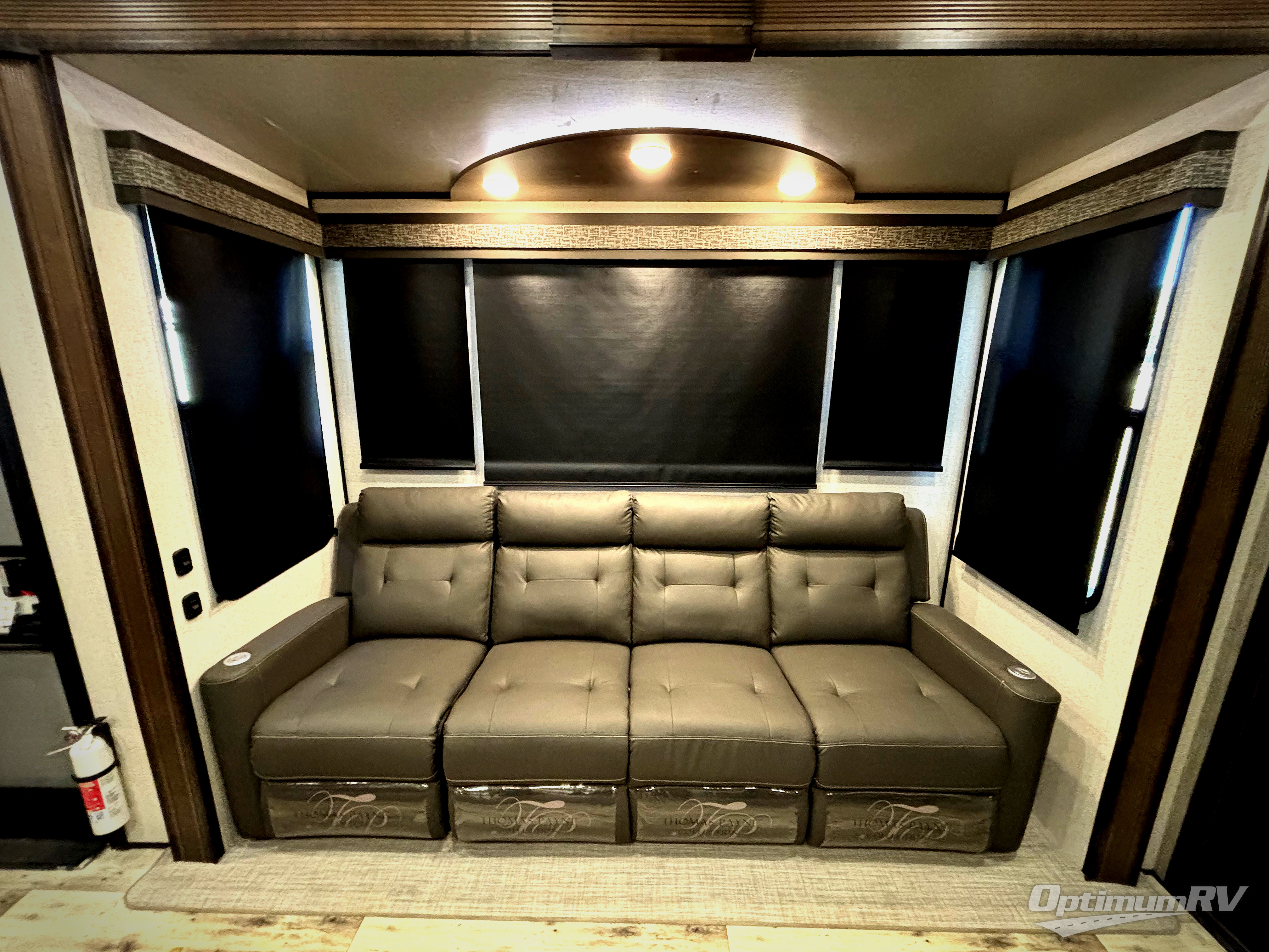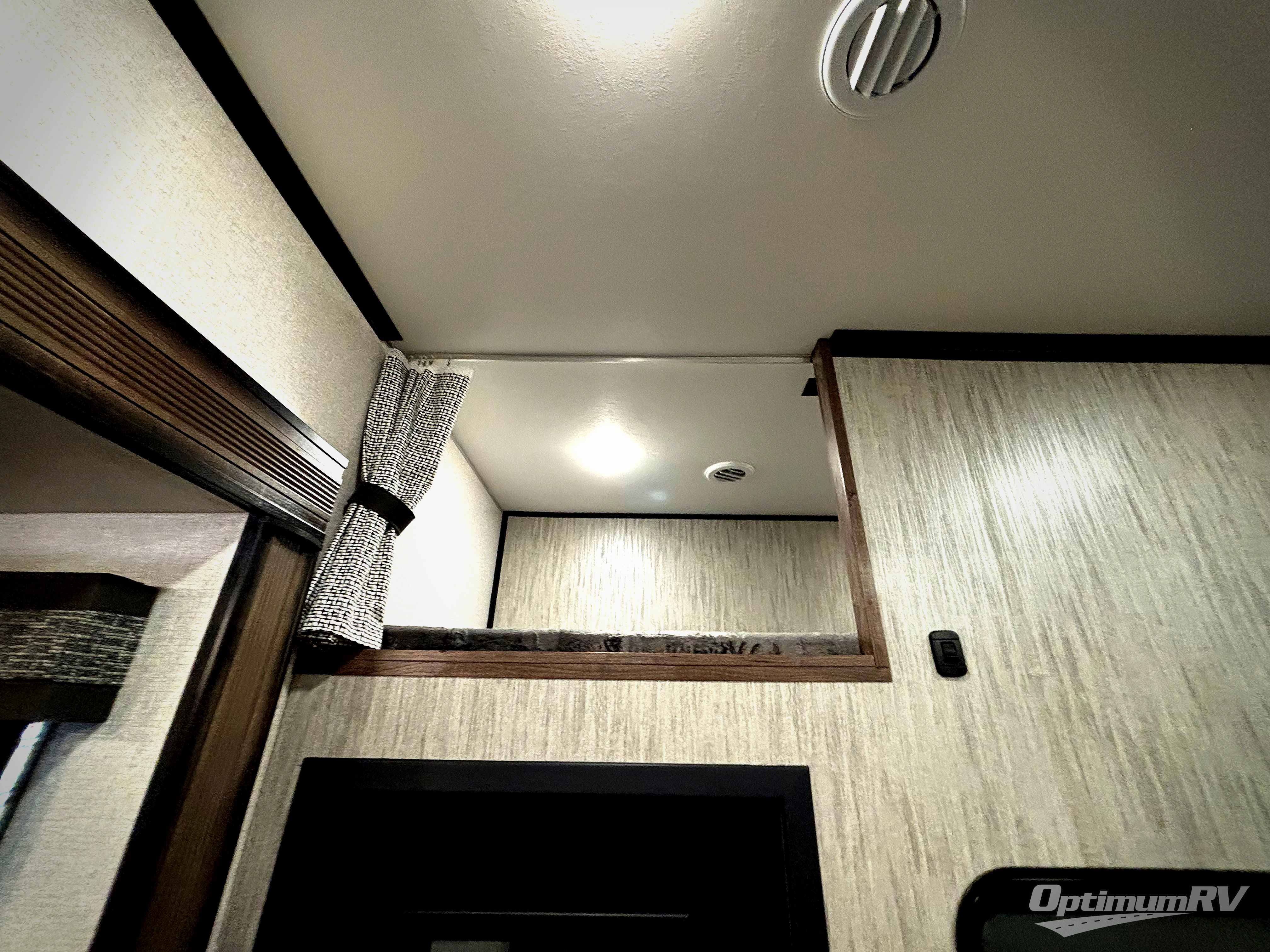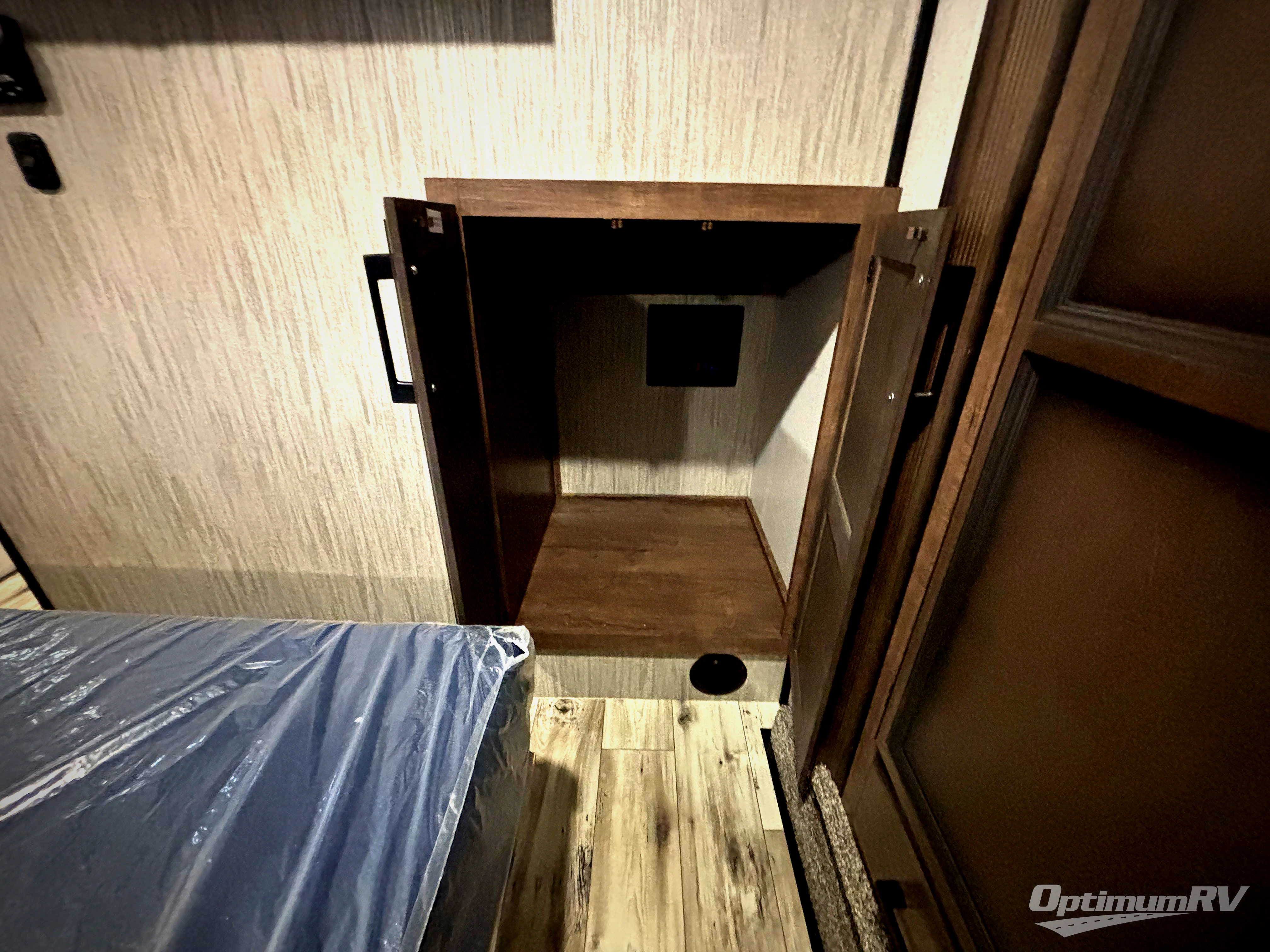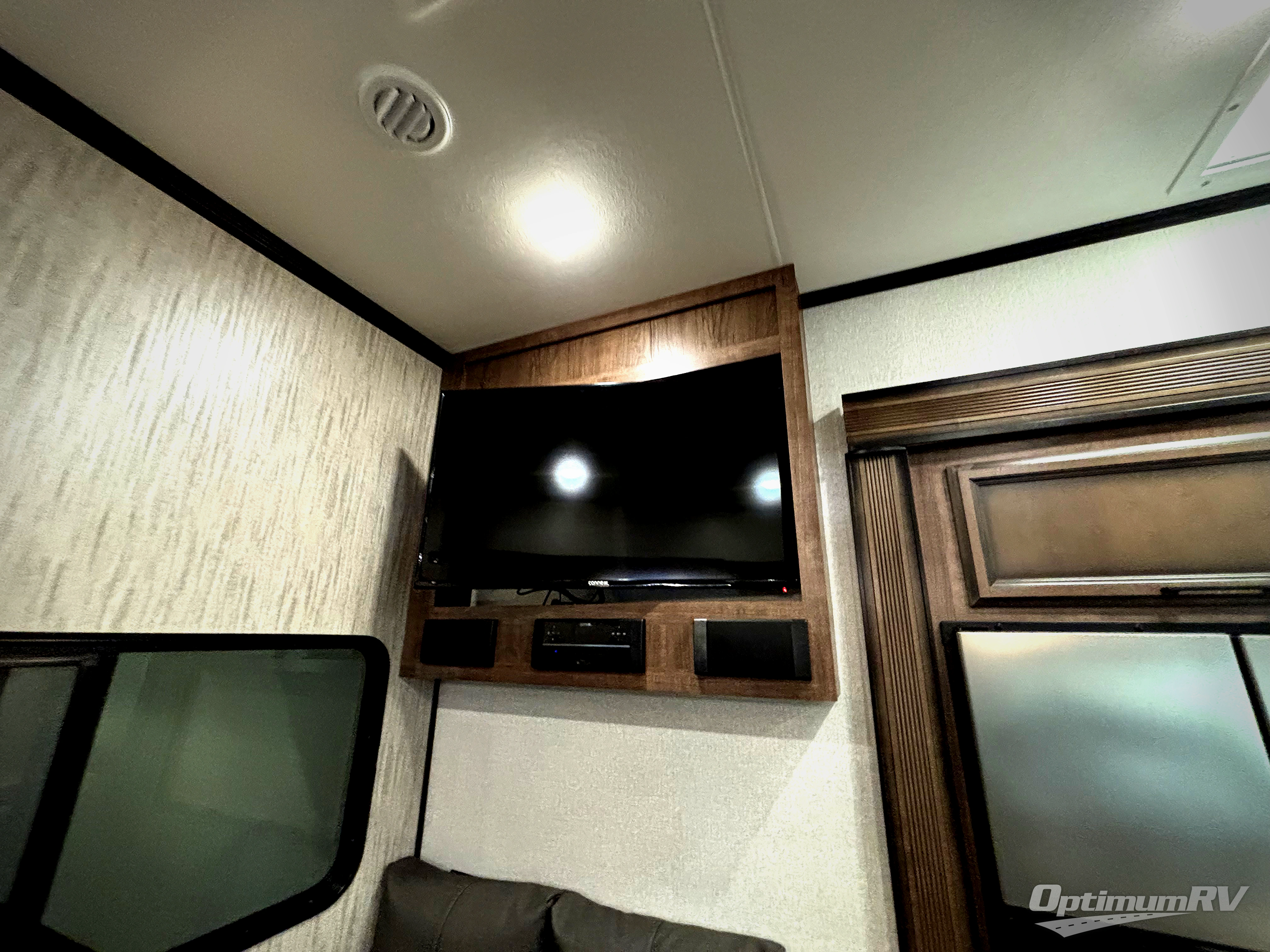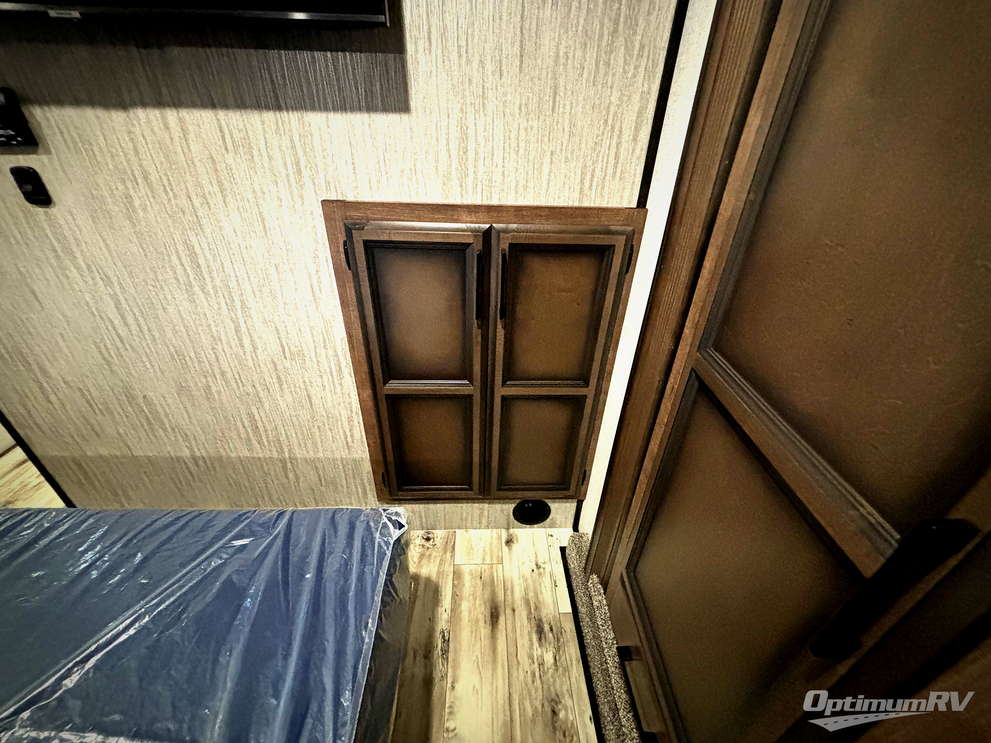 Spacious, luxurious and convenient are a few words you will be thinking each trip you take with this fifth wheel in tow! From the 15'9" separate garage to load up every toy you want, and the dual slides in the main living and kitchen area to the front master bedroom with a slide out wardrobe, there is lots of floor space. The garage also offers storage, access to the loft bed, plus the option to add a power bed with Sit and Sleep making this space a great area to relax after the rides. The 30 gallon fuel tank will keep the toys running, and the side man door is handy when you have the ramp cargo door closed. In the main living and kitchen area you can relax on the four-person super sofa with footrests, dine at the table with booth and chair seating, and watch the 43" Smart LED TV. The cook will love the counter peninsula to prepare and serve meals, and all the kitchen appliances in the slide out. Everyone can take turns getting cleaned up in the full bathroom, and you can retire to the master bedroom with a walk-around electric-tilt king bed or choose the queen option, and there is plenty of storage for your clothing plus a closet prepped for a washer/dryer option. You will find even more storage in the pass-through compartment along the exterior.