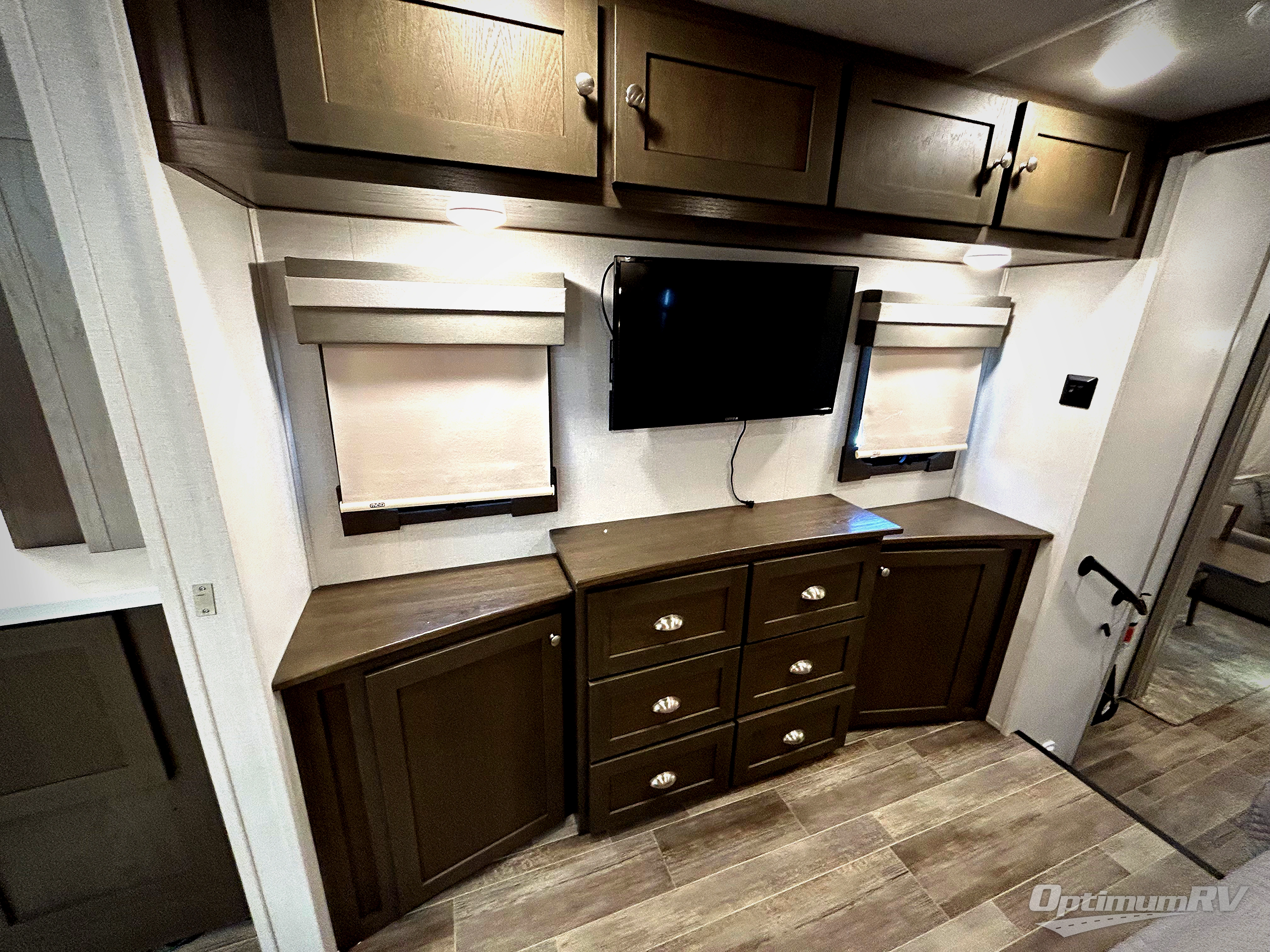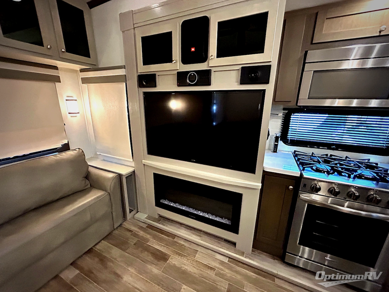Everyone will stay clean with a bath and a half in this fifth wheel! The kitchen has a pantry big enough for everyone's favorite snacks, a four burner Insignia cooktop, and a kitchen island to prepare your best meals. You can have game night indoors at the table and chairs or set up a table and chairs underneath the two power awnings. The rear living area offers a comfortable place to watch the big game too with a 88" split tri-fold sofa and 65" power theater seating directly across from the entertainment center which has overhead cabinets with hidden storage, an electric fireplace, and a 50" TV with JBL sound system. Two can get ready at once in the front bathroom with the dual sink vanity and you can even add an optional washer and dryer!