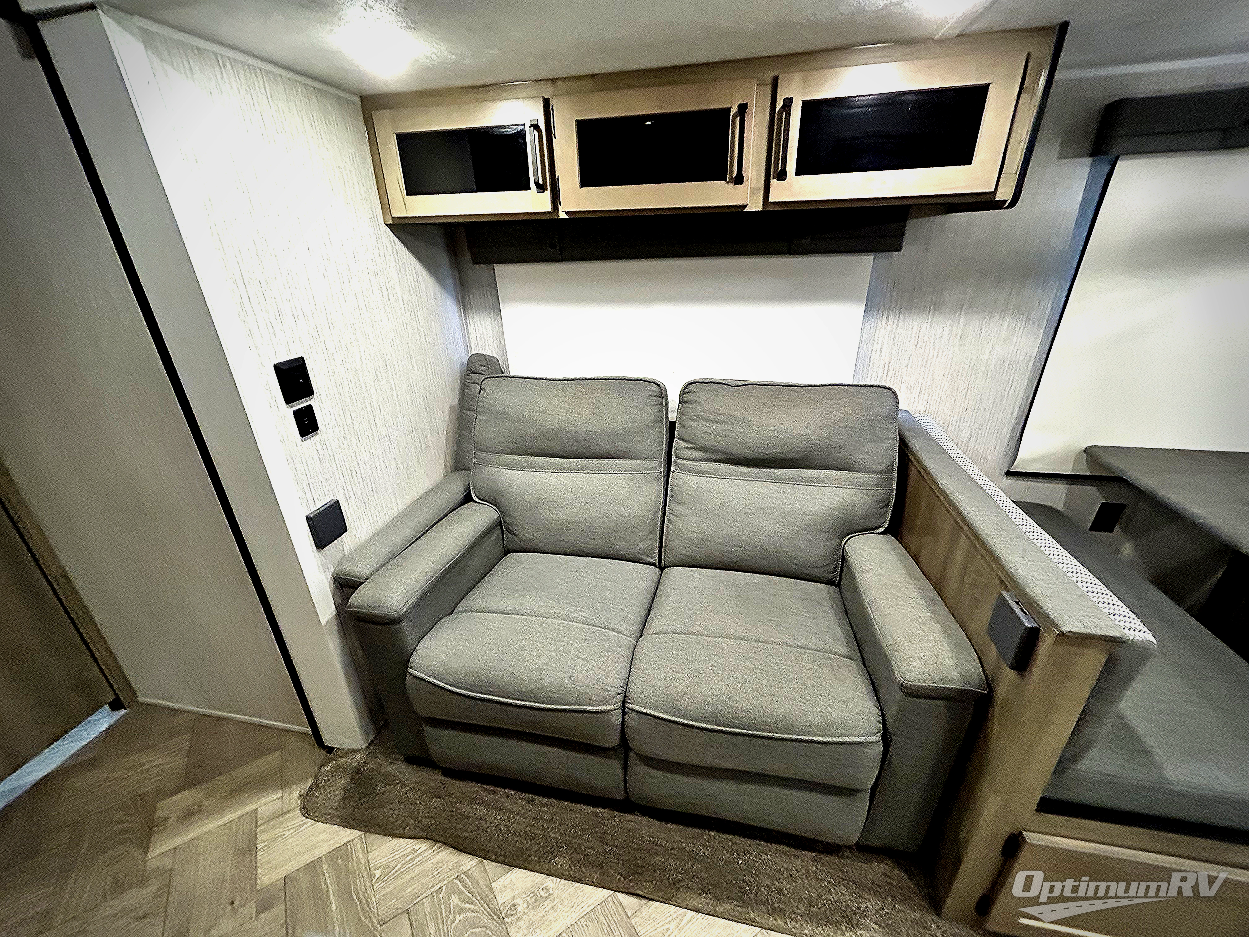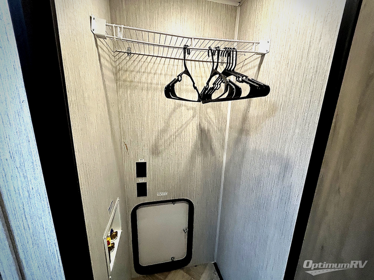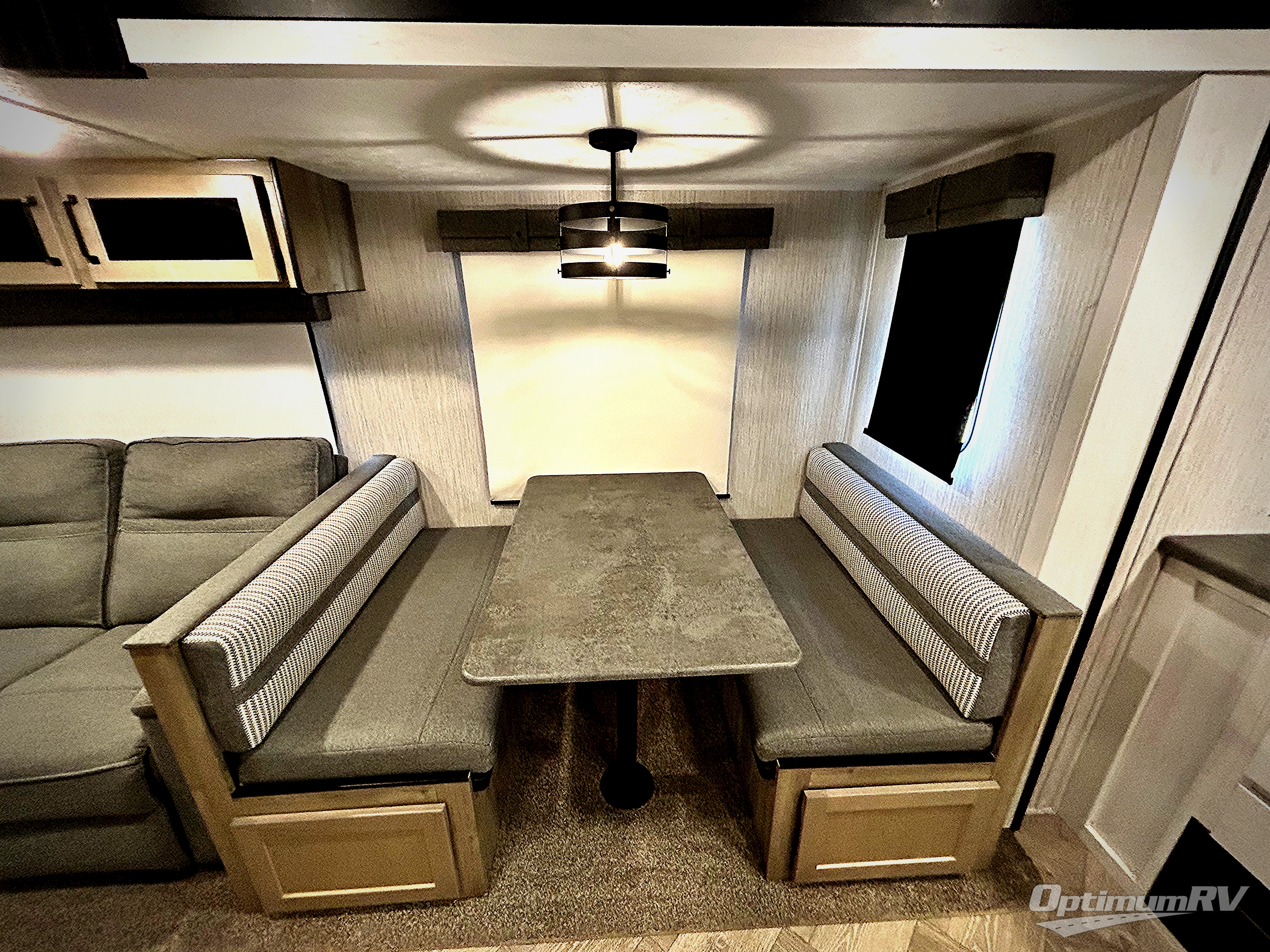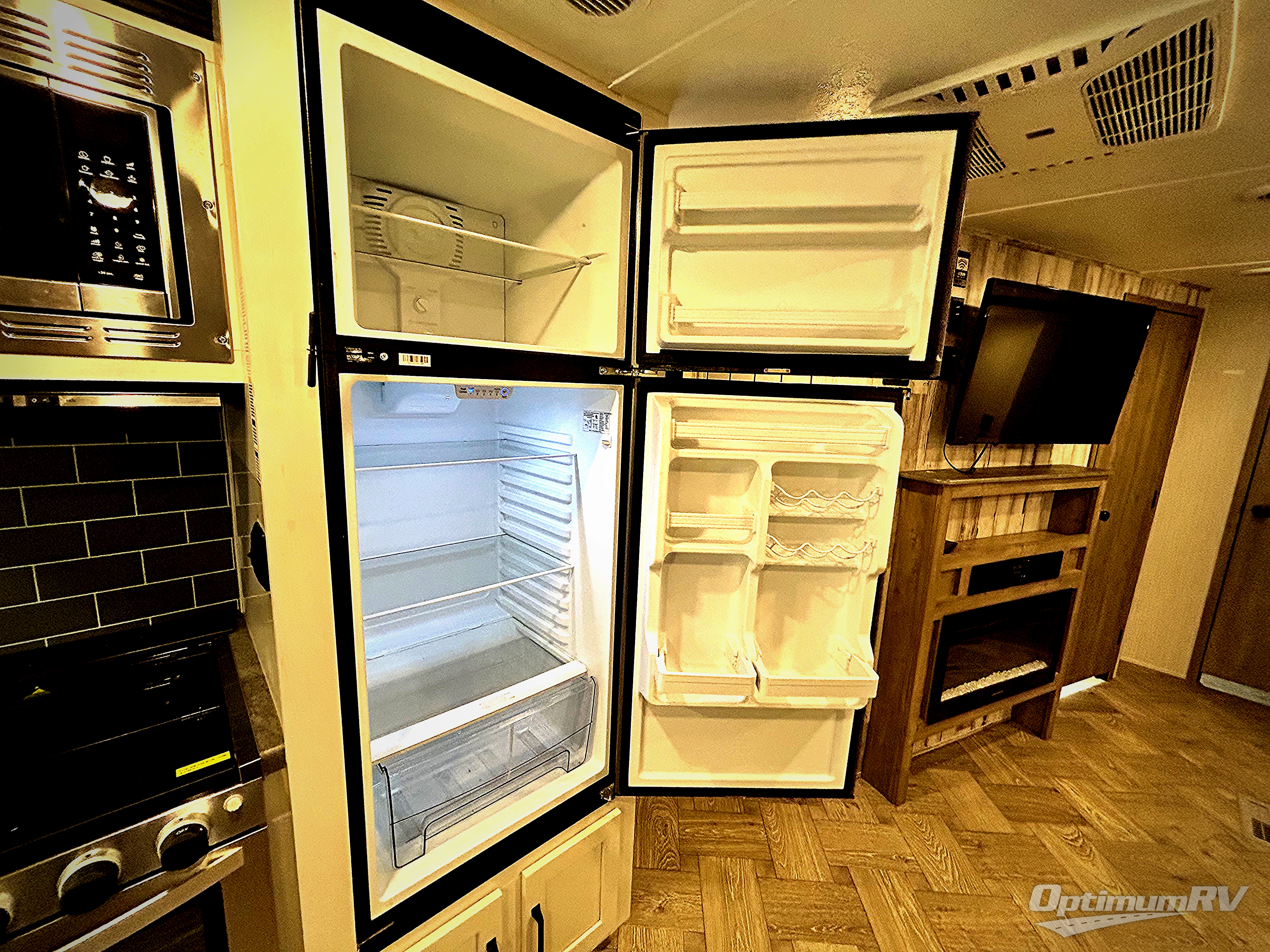 Walk into this travel trailer with one of the dual entry doors for a great camping trip! One entrance enters directly into the rear private bedroom which has a queen bed slide, a walk-in closet that is prepped for an optional washer and dryer, a wardrobe, and even an entrance into the dual entry bathroom. Grab a snack from the walk-in pantry then relax on the sofa while you watch a movie with the entertainment center or play a game at the booth dinette. The front kitchen has everything you will need to prepare your best home cooked meals including lots of countertop space, and you could even add an optional exterior micro kitchen with griddle for dinner outdoors!