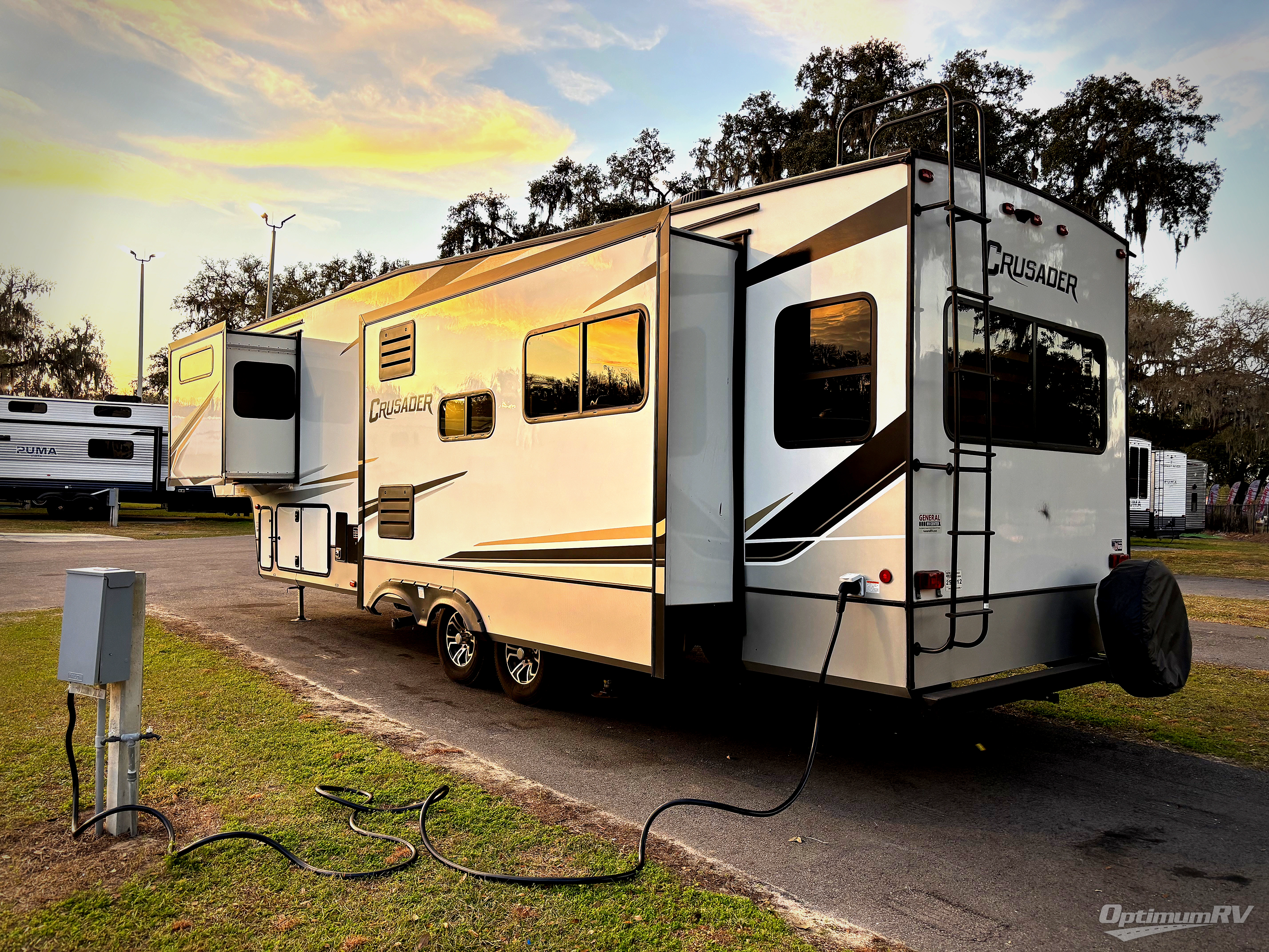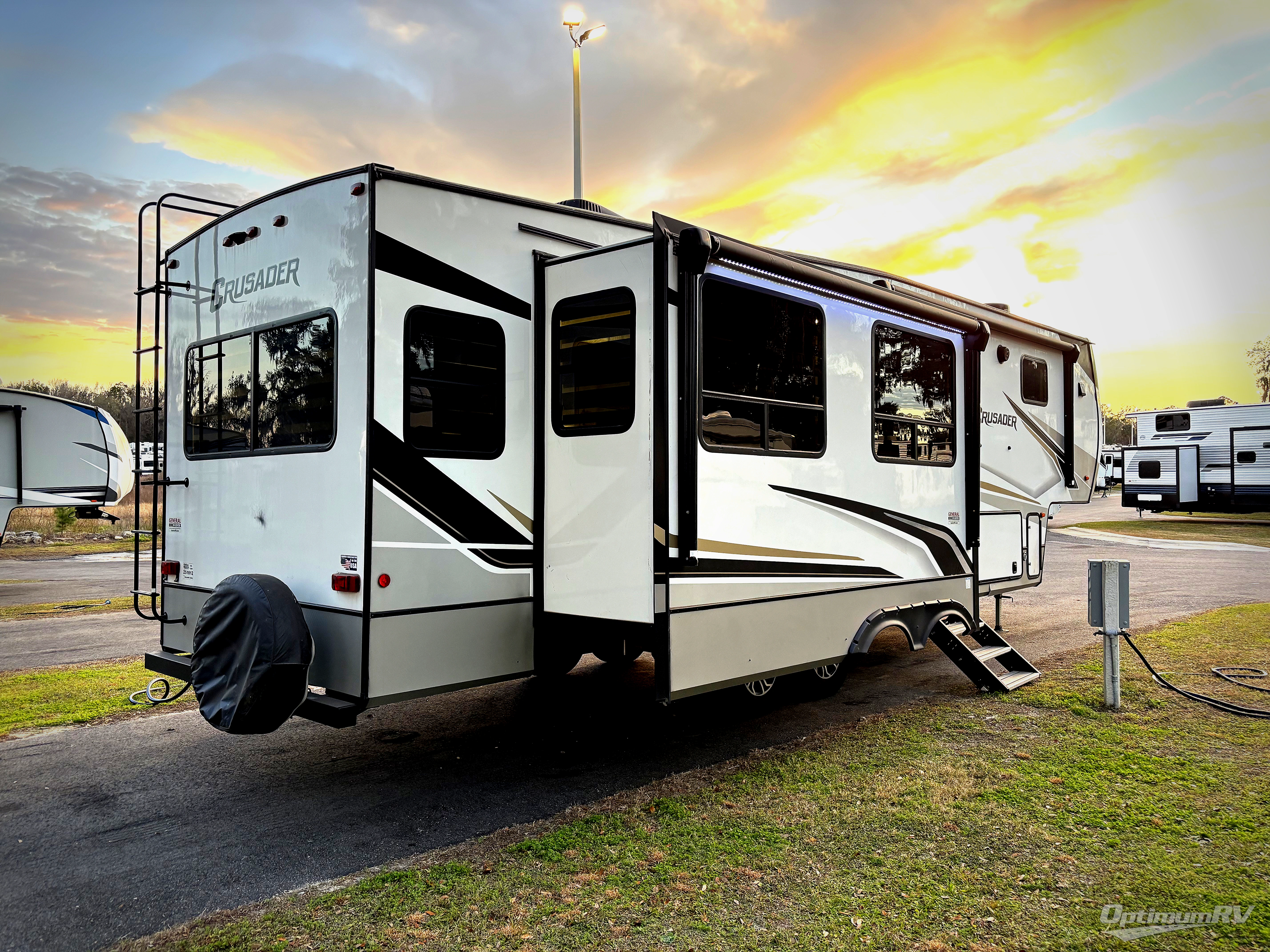 The Crusader fifth wheels by Prime Time RV are a step above the rest and it's not hard to see why. Each model has been constructed to last with its exclusive Eternabond construction, a one-piece TPO roof, and high gloss gel coat fiberglass exterior. The auto leveling system and the central docking center will have you set up to camp in no-time, and there is a convenient bottle opener and Doggy D-ring for your furry companions. You will fall in love with the interior that includes solid surface countertops, premium vinyl flooring, hardwood cabinet doors, and many more residential comforts. The Crusader also comes standard with a 15,000 BTU "Quiet Cool" A/C, a 35,000 BTU high capacity gas furnace, and the Extreme Thermal Package Plus, making your camping season year-around!