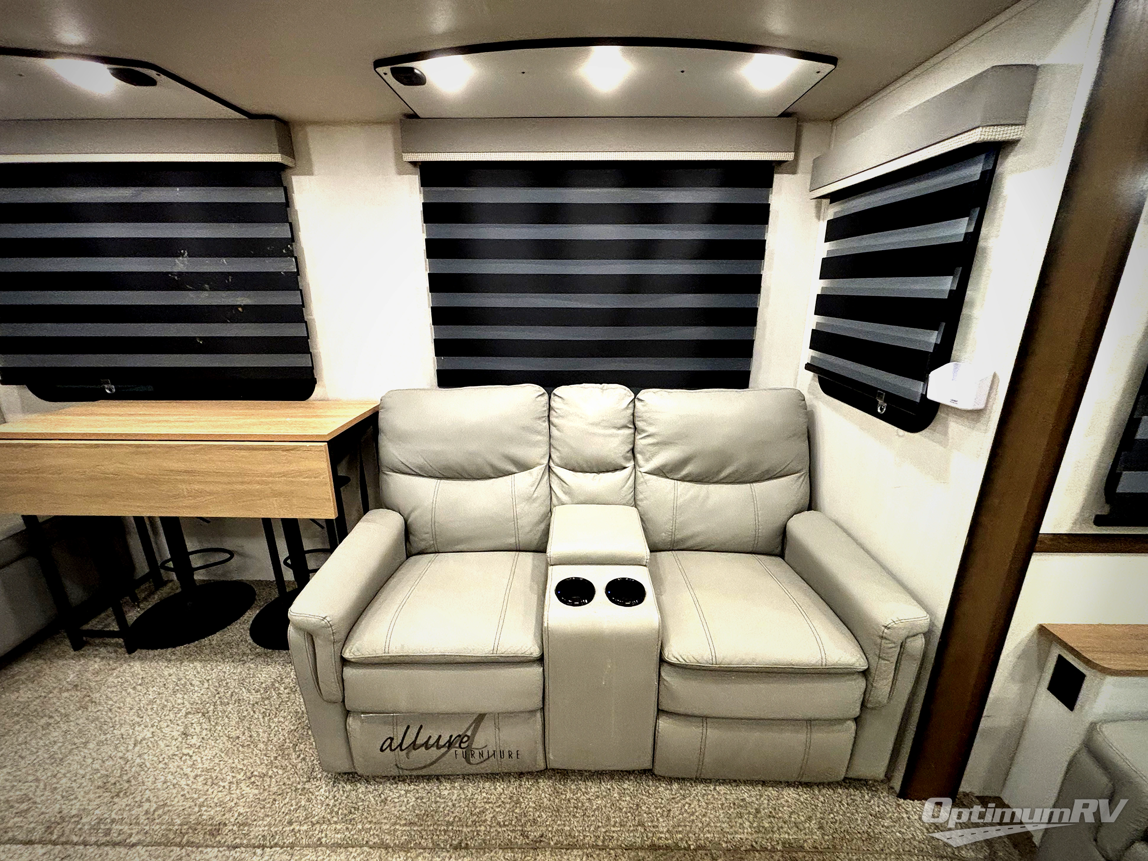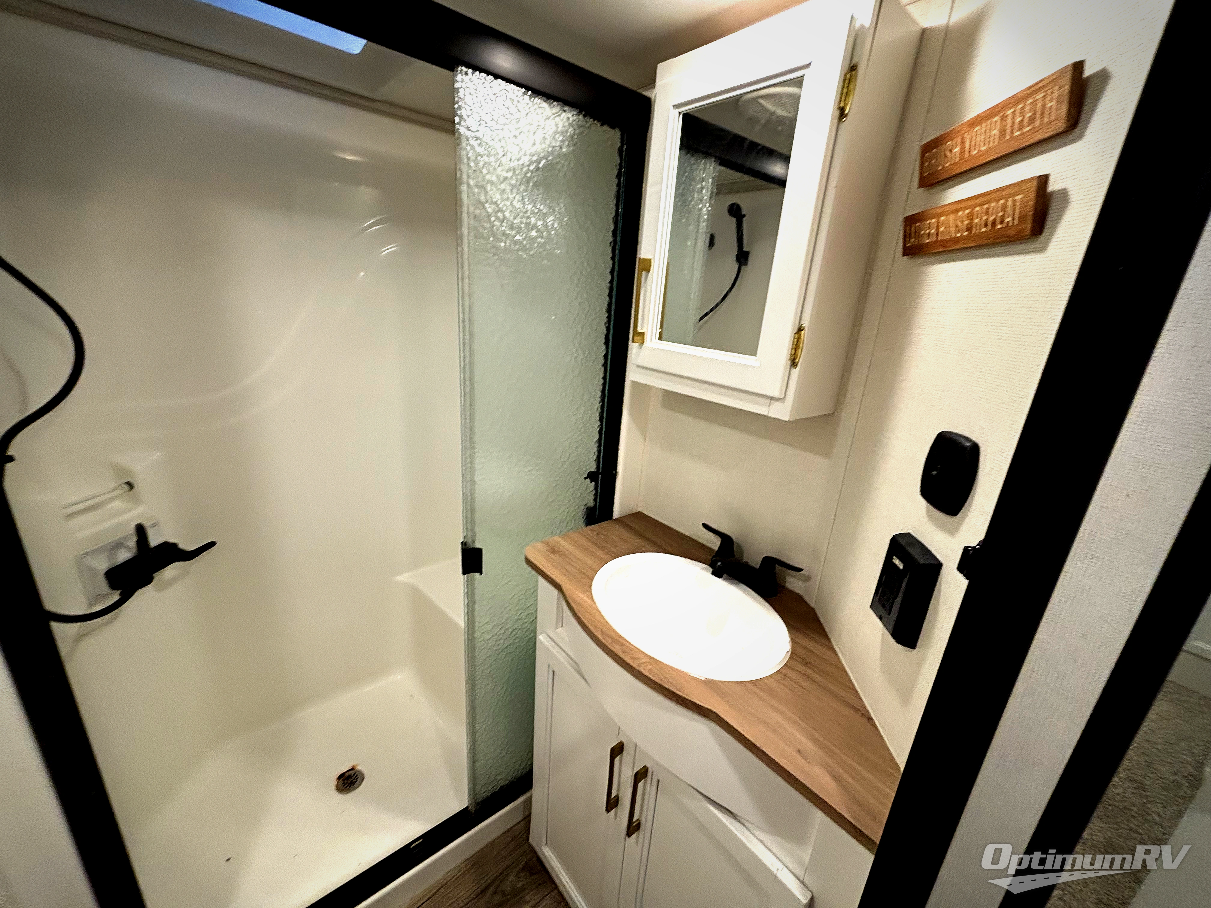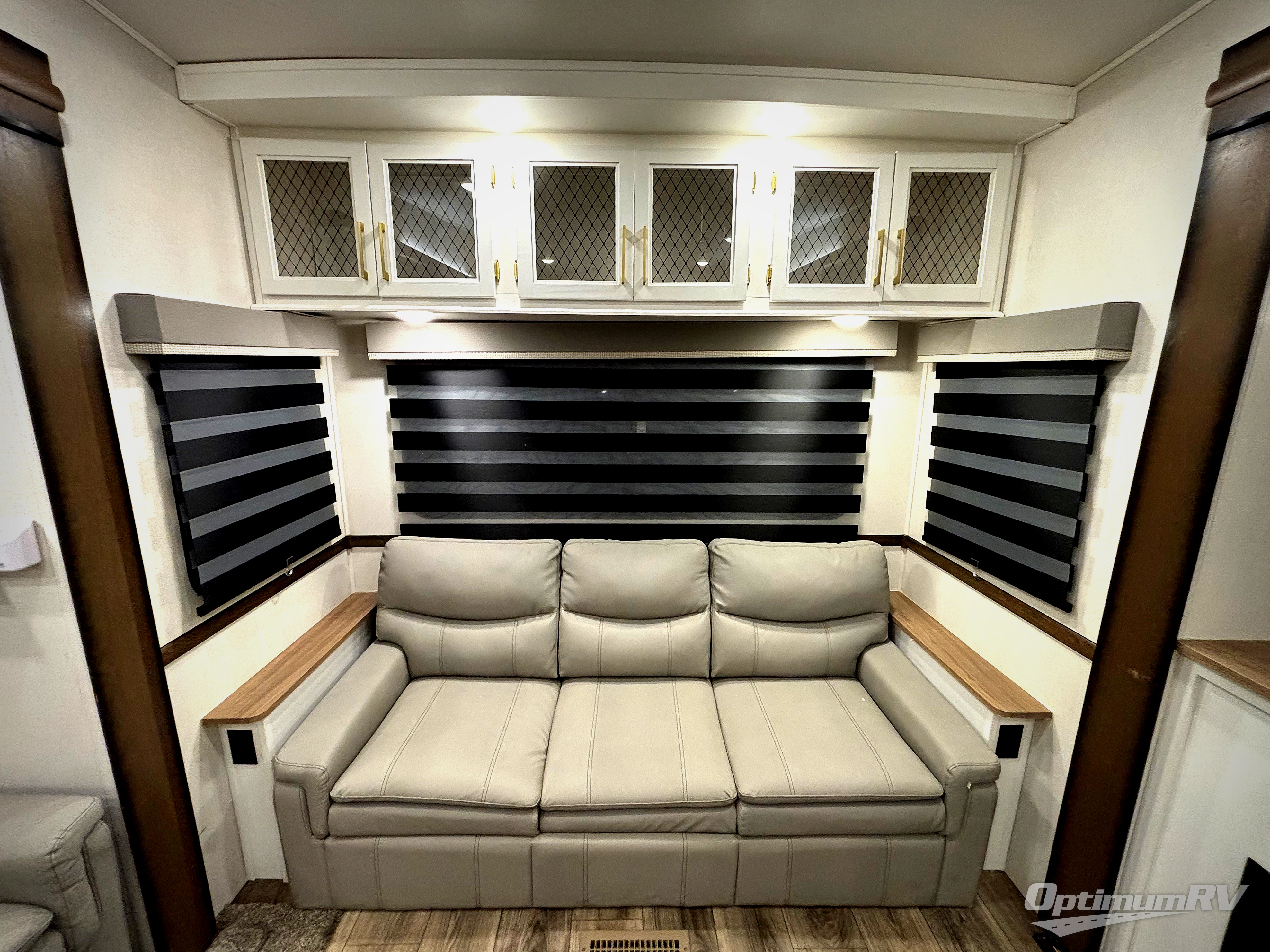 From the front private bedroom with a king bed slide out to the rear living area with theater seating and a fireplace, you'll love every minute spent in this fifth wheel. The dual opposing slides in the main living area provide tons of space to stretch out, and the kitchen island here will tie the whole room together. Your crew can spend the evenings watching a movie on the large LED TV, or head outdoors to relax under the 15' electric awning with LED lights. The full bath features a shower with a seat and glass doors, plus a Deluxe Skyview skylight for added natural lighting. You won't have to worry about sacrificing storage space thanks to the bedroom walk-in closet with mirrored doors, the kitchen walk-in pantry, plus the exterior pass-through storage!