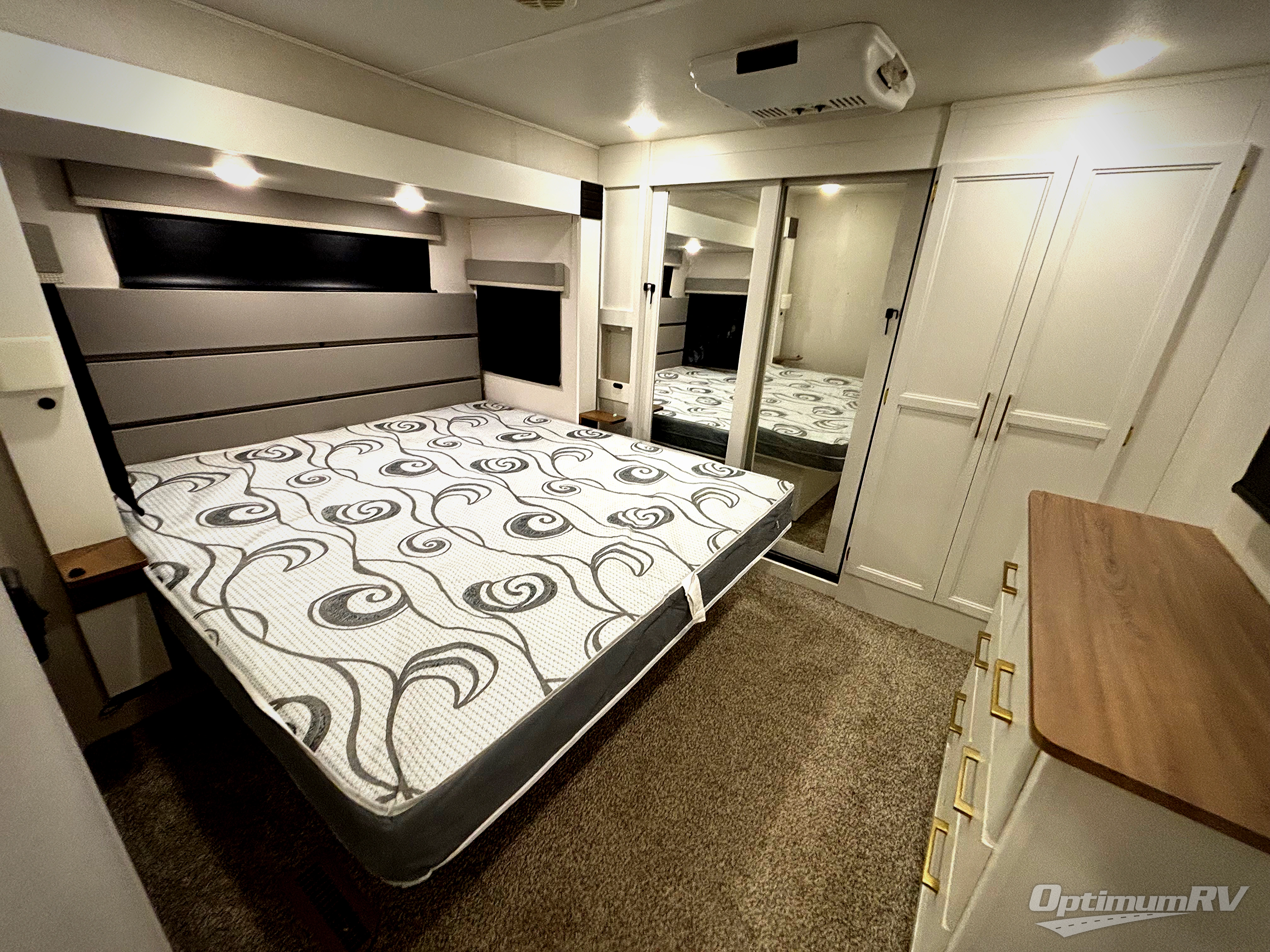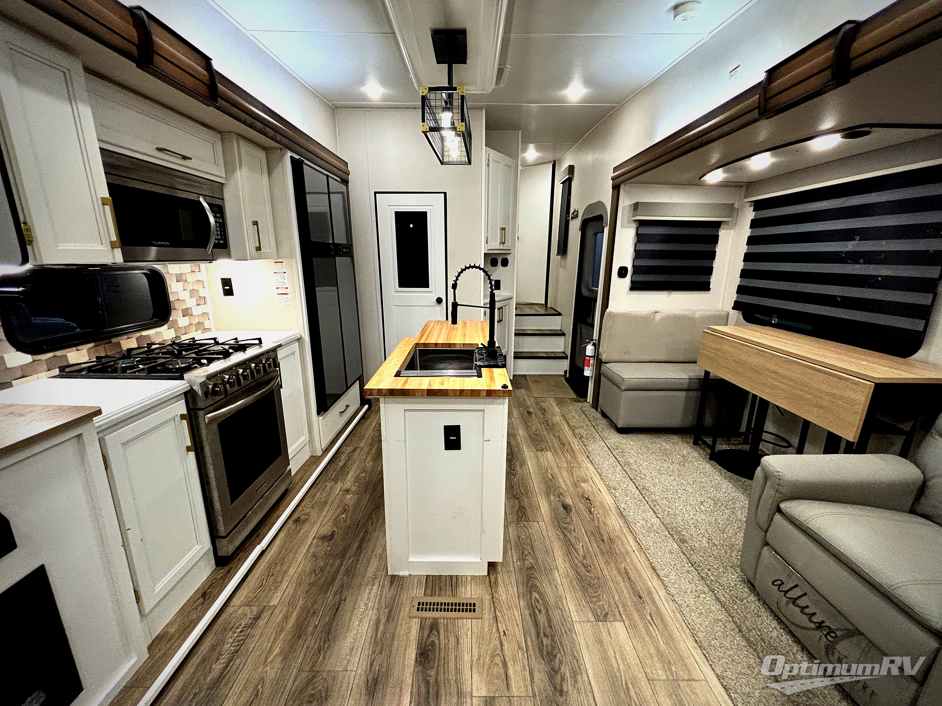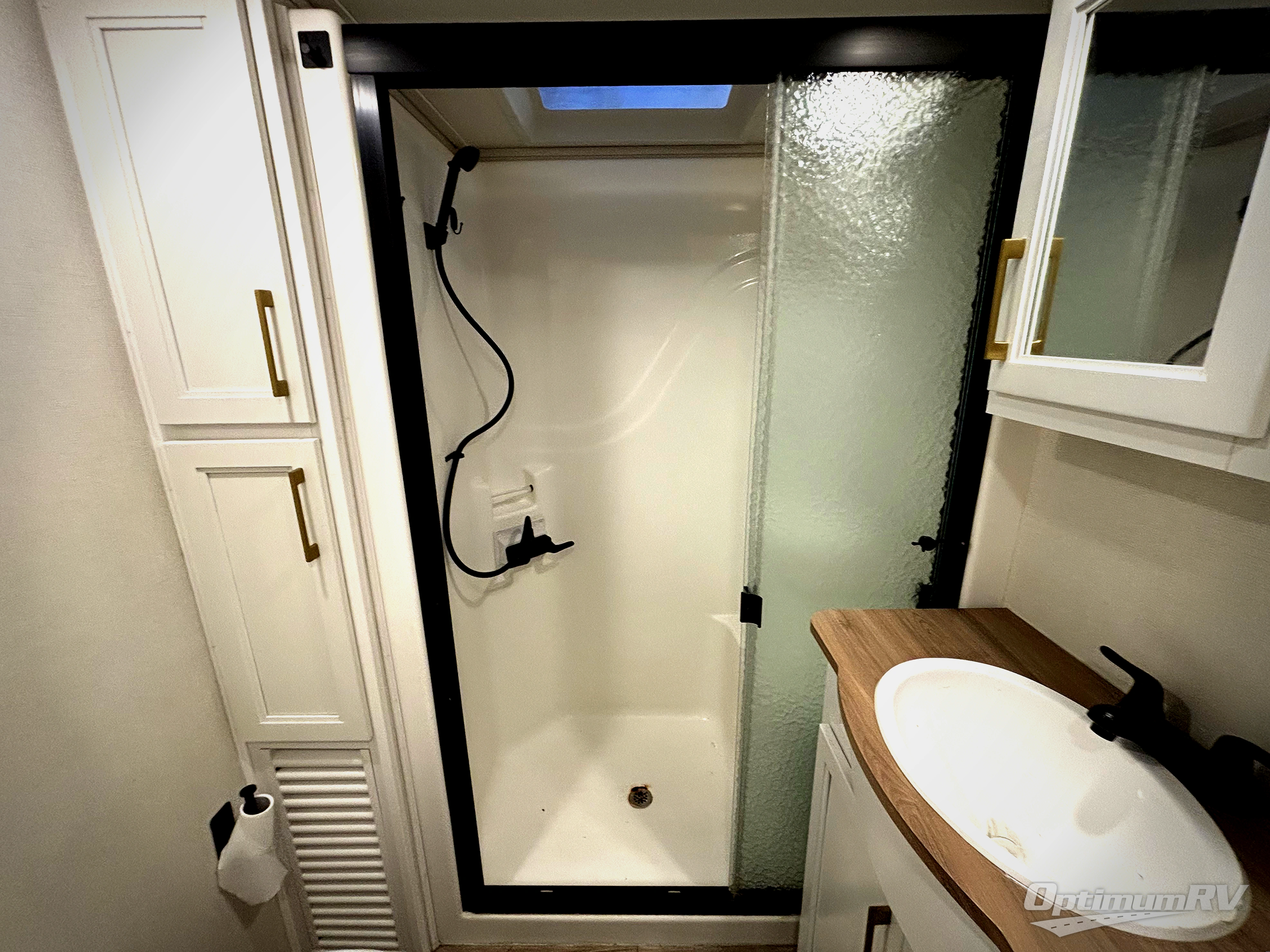 From the front private bedroom with a king bed slide out to the rear living area with theater seating and a fireplace, you'll love every minute spent in this fifth wheel. The dual opposing slides in the main living area provide tons of space to stretch out, and the kitchen island here will tie the whole room together. Your crew can spend the evenings watching a movie on the large LED TV, or head outdoors to relax under the 15' electric awning with LED lights. The full bath features a shower with a seat and glass doors, plus a Deluxe Skyview skylight for added natural lighting. You won't have to worry about sacrificing storage space thanks to the bedroom walk-in closet with mirrored doors, the kitchen walk-in pantry, plus the exterior pass-through storage!
