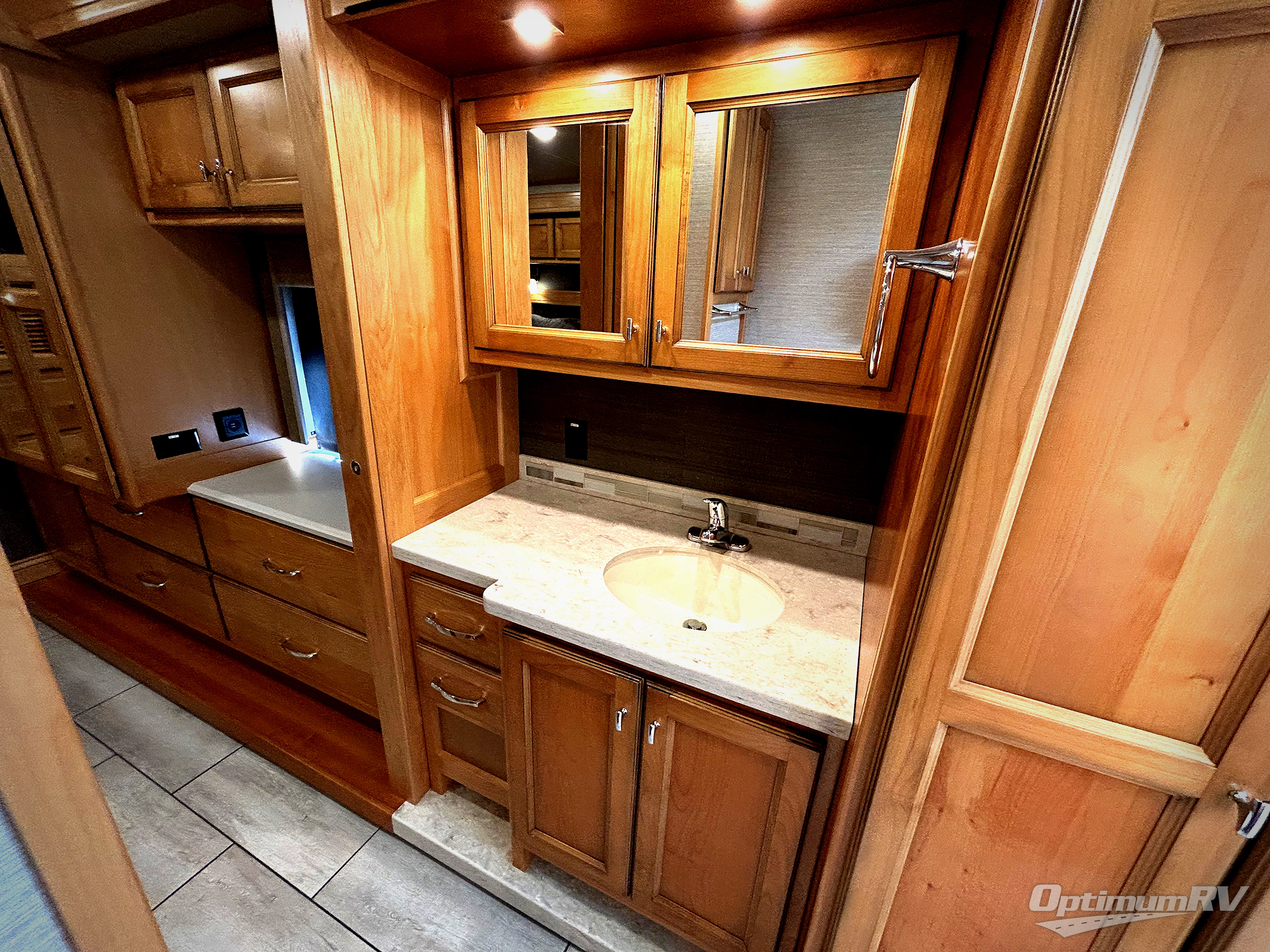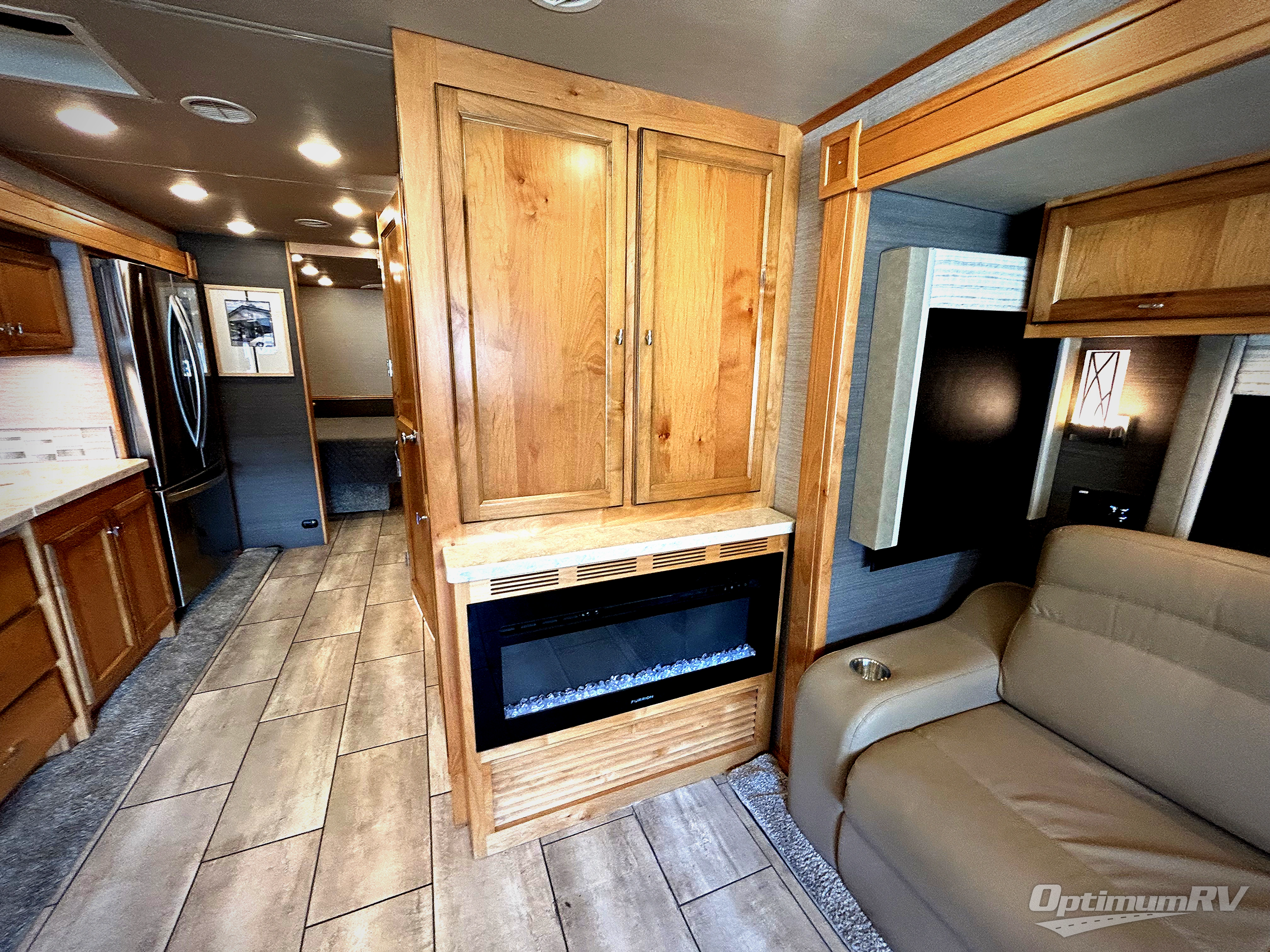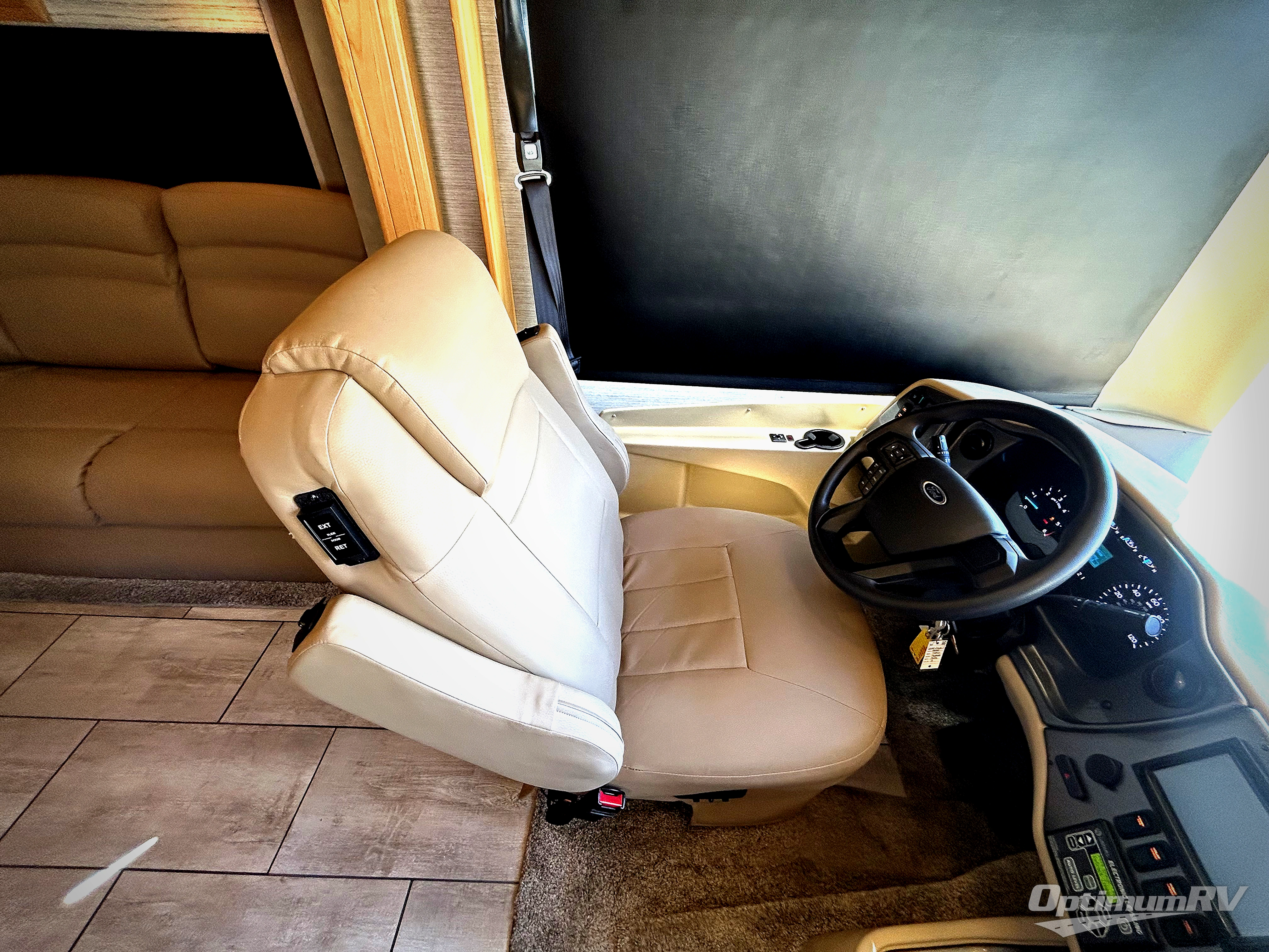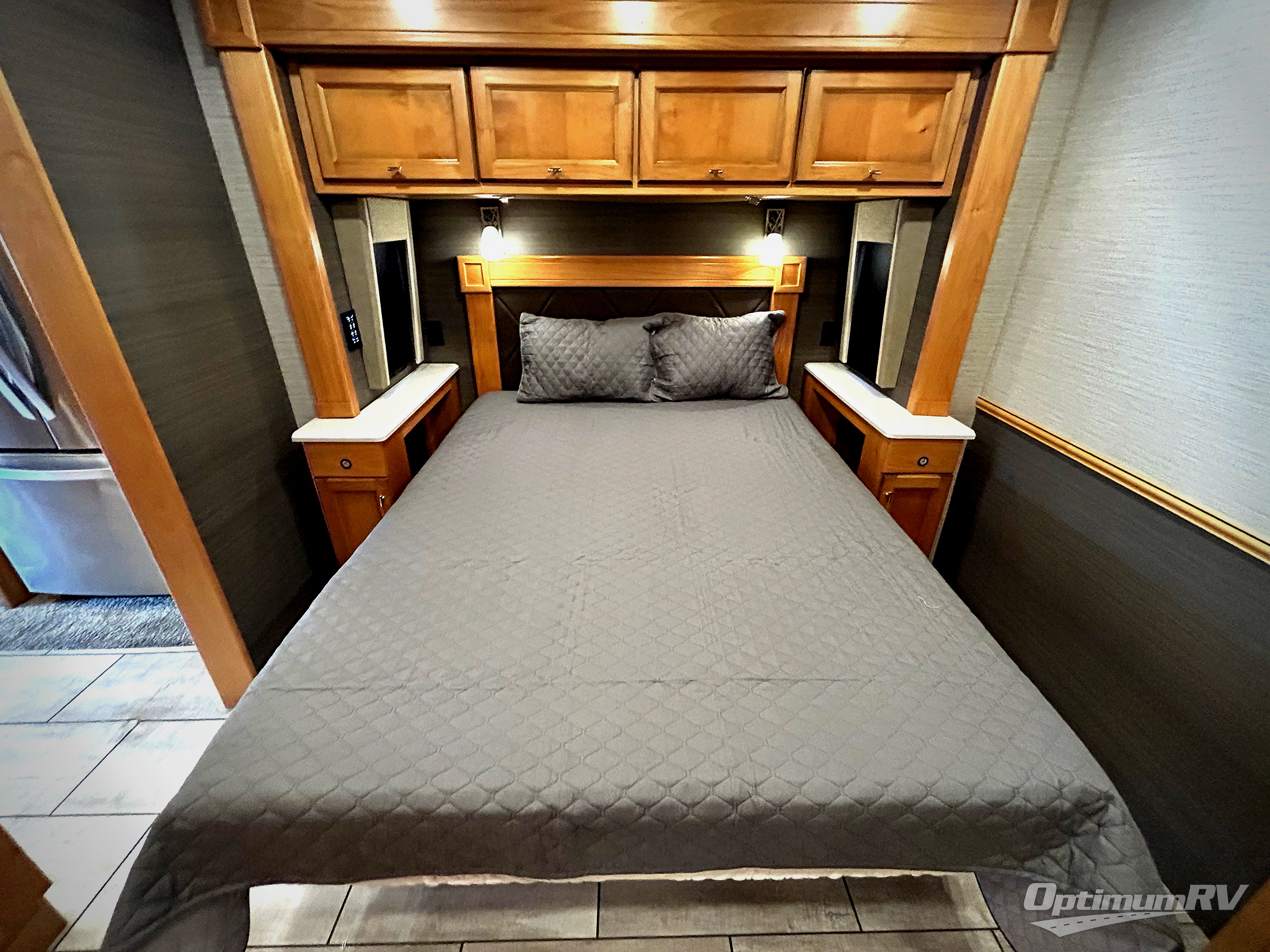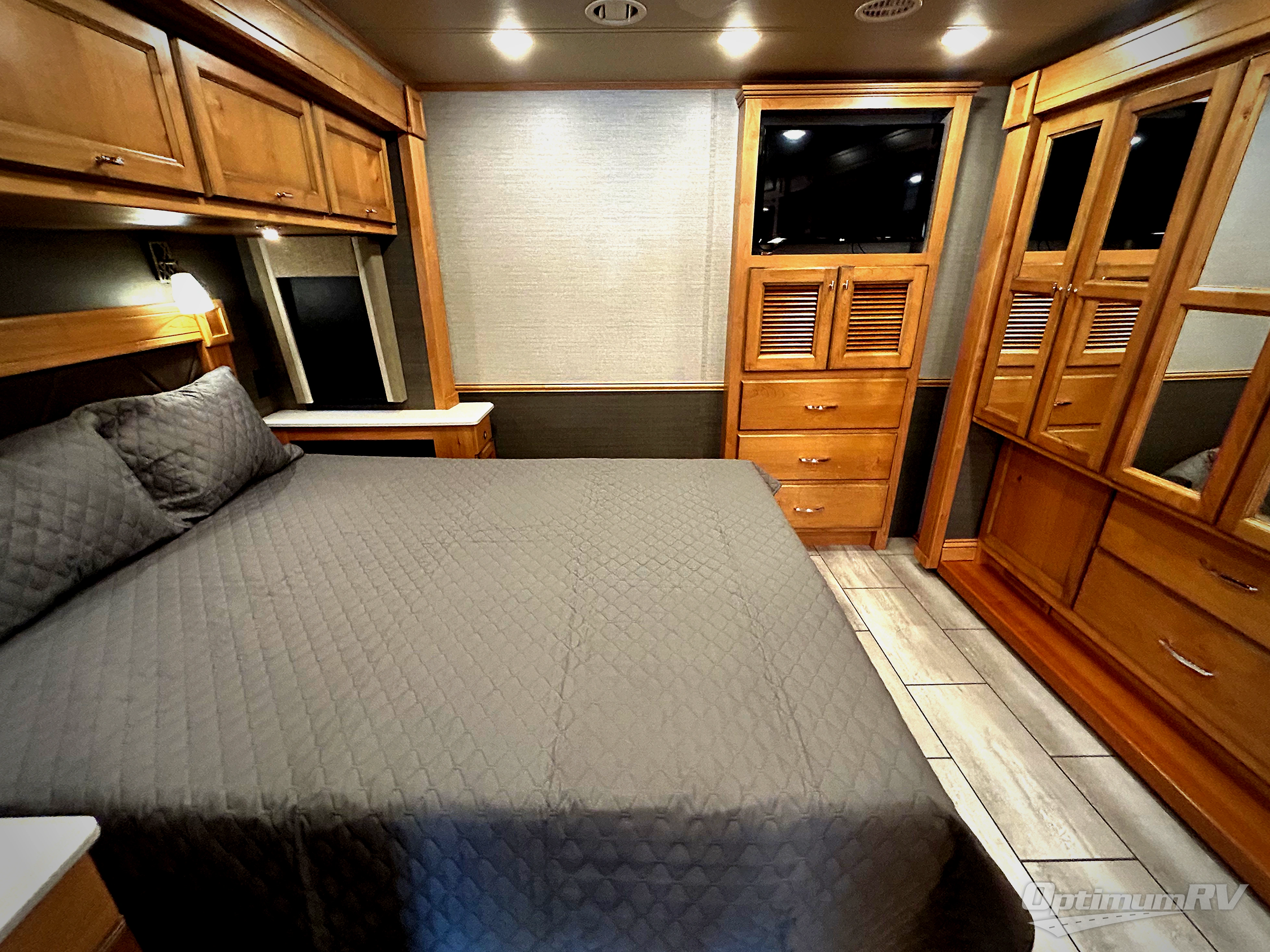 There are many standard luxurious features you will love about this motorhome! It also has many optional features you can add like the optional drop-down front bunk, the super sofa, the air coil sofa bed, the dinette with computer work station, and the dining bar with cabinet, printer, shelf, and file drawer below for an office on wheels. The king bed slide in the rear private bedroom offers a comfortable place to sleep, as well as the ultraleather flip and fold sofa bed and even the booth dinette once converted. The bedroom has lots of places to store your clothes between the bank of drawers below the single cabinet with TV, the wardrobe with drawers below, and the overhead cabinet with drawers below it. Plus, it has an entrance into the dual entry bathroom which has a shower with a seat and an area prepped to add an optional washer and dryer so you can extend your trip with clean clothes!