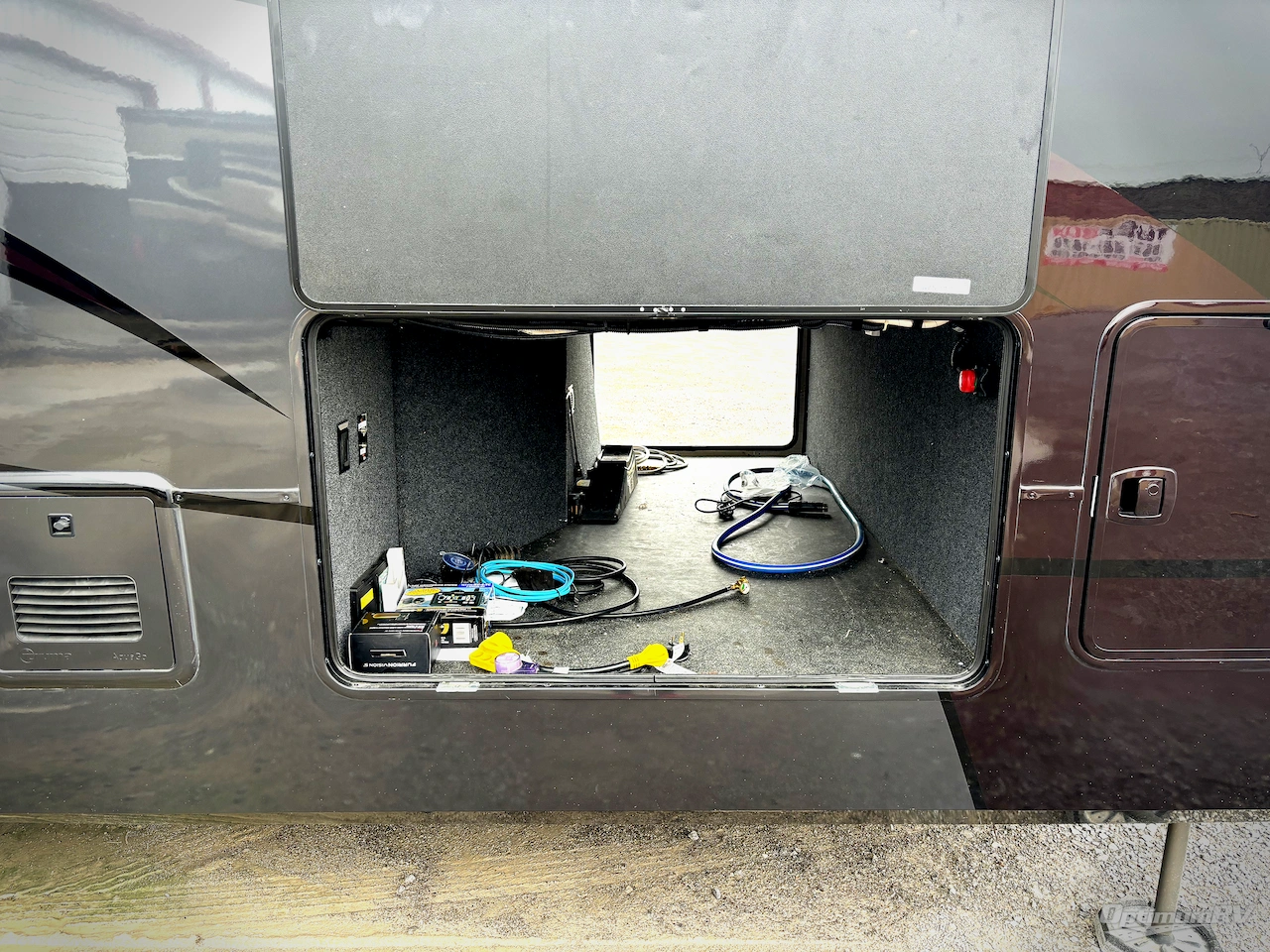 Your family vacations just got a whole lot sweeter in this fifth wheel that can sleep four people each night. Once you arrive at the campground, put out the four slides, then enjoy lunch on the dinette with chairs. The dual opposing slides here will let the kids play a board game on the floor if they want, and you and your spouse can relax on the theater sofa. Prep and cook all your meals in the rear kitchen that includes ample counter space, an Insignia oven and cooktop, plus an optional dishwasher to make cleaning up easier than ever. The master bedroom includes sliding doors to save on space, a king bed, plus a bedroom fireplace for a cozy evening indoors. You will love the front bath with its dual bath sinks, spacious shower with a Teak Wood seat, plus a large front closet with tons of storage space. This model also includes a convenient half bath for your guests, now that's what I call luxury!