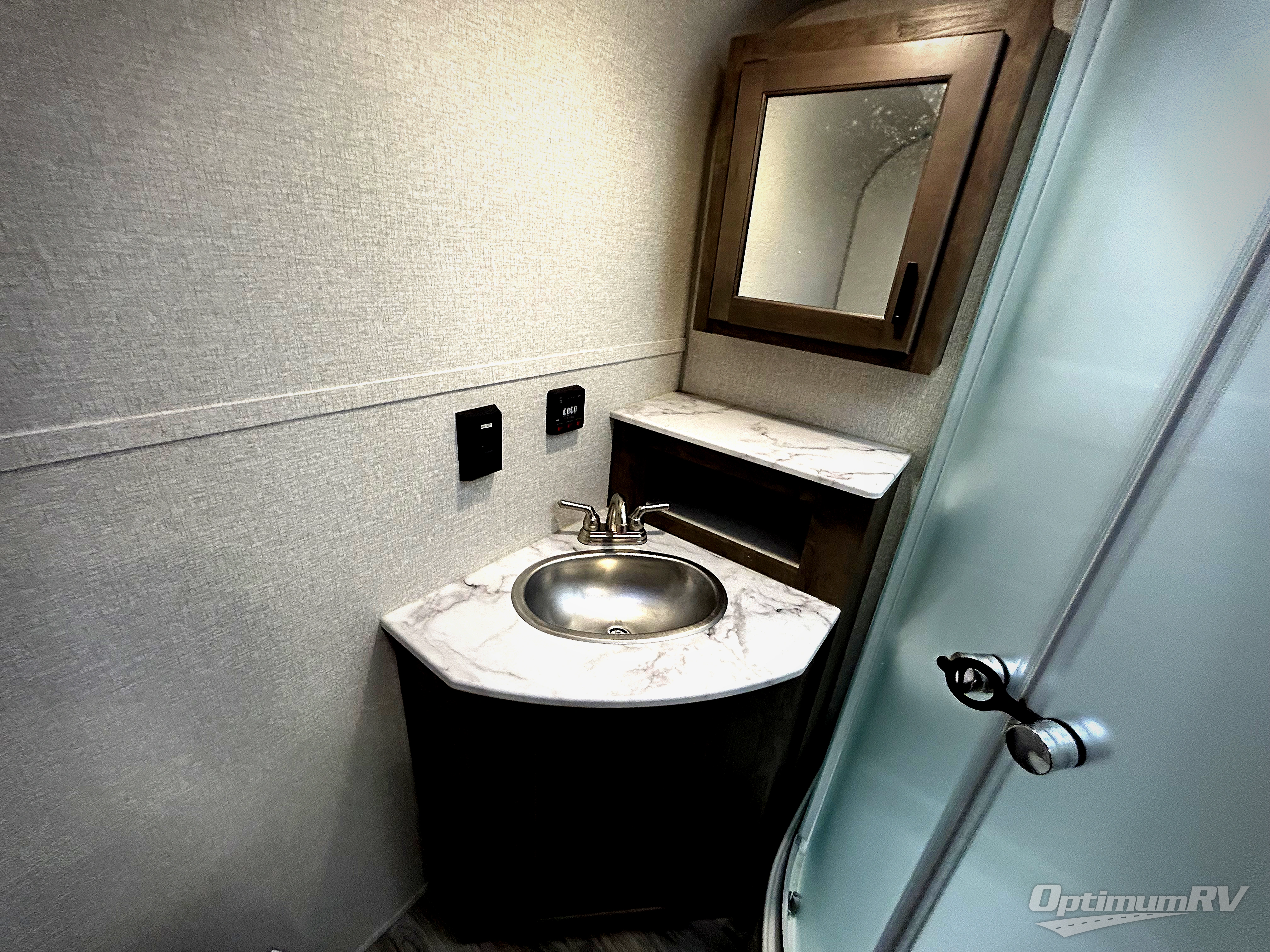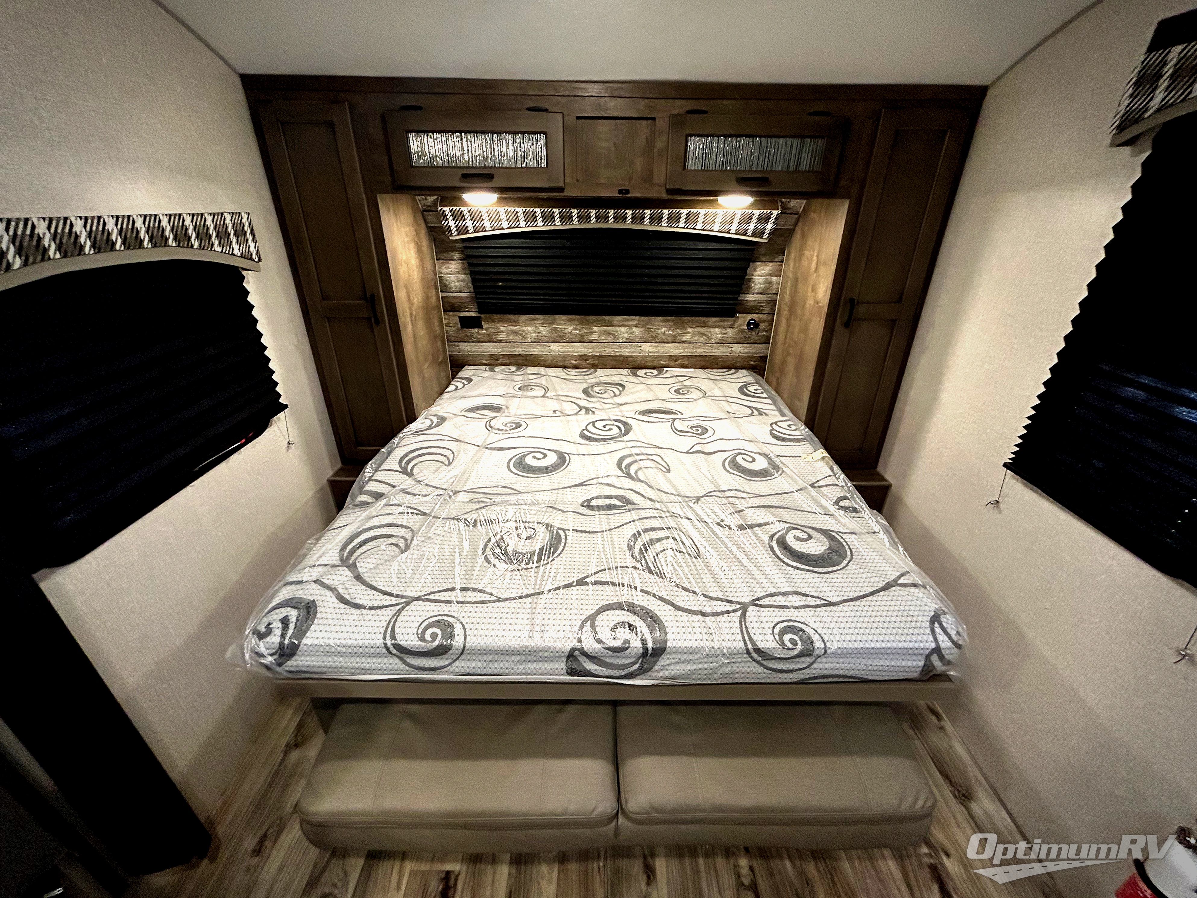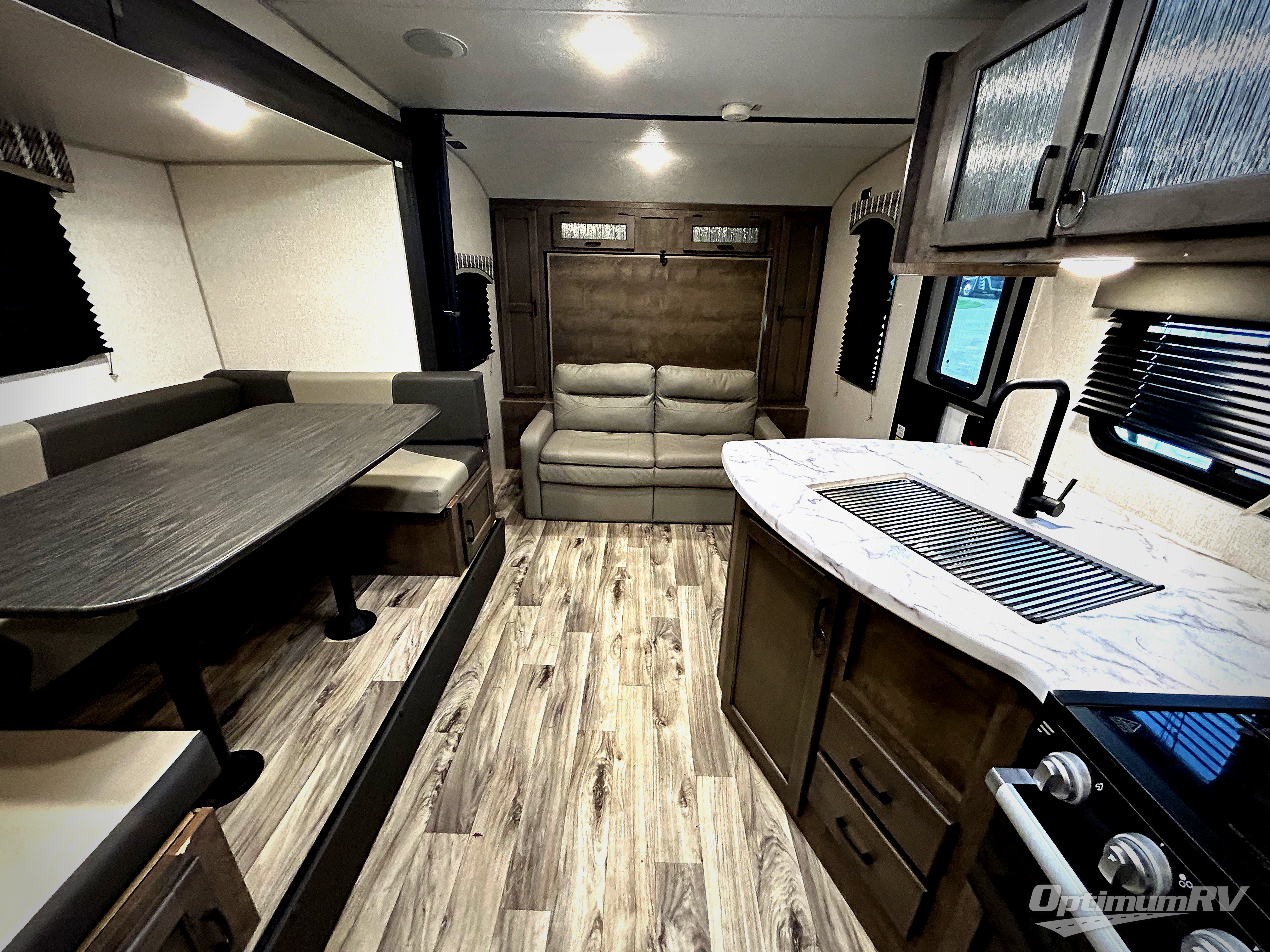 A cook will love this trailer with the choice to make meals inside with full amenities including an 8 cu. ft. refrigerator and a pantry, or outside while using the campfire cafe which offers a griddle and refrigerator, plus counter space to prepare and serve meals. There is sleeping space for four when you utilize the U-shaped dinette slide out that also provides more interior floor space along with the versatile Murphy bed and sofa up front. You will also find a privacy curtain that will section off this area that also features StorMore bedside nightstands with a 110V outlet and USB charging, and two wardrobes.