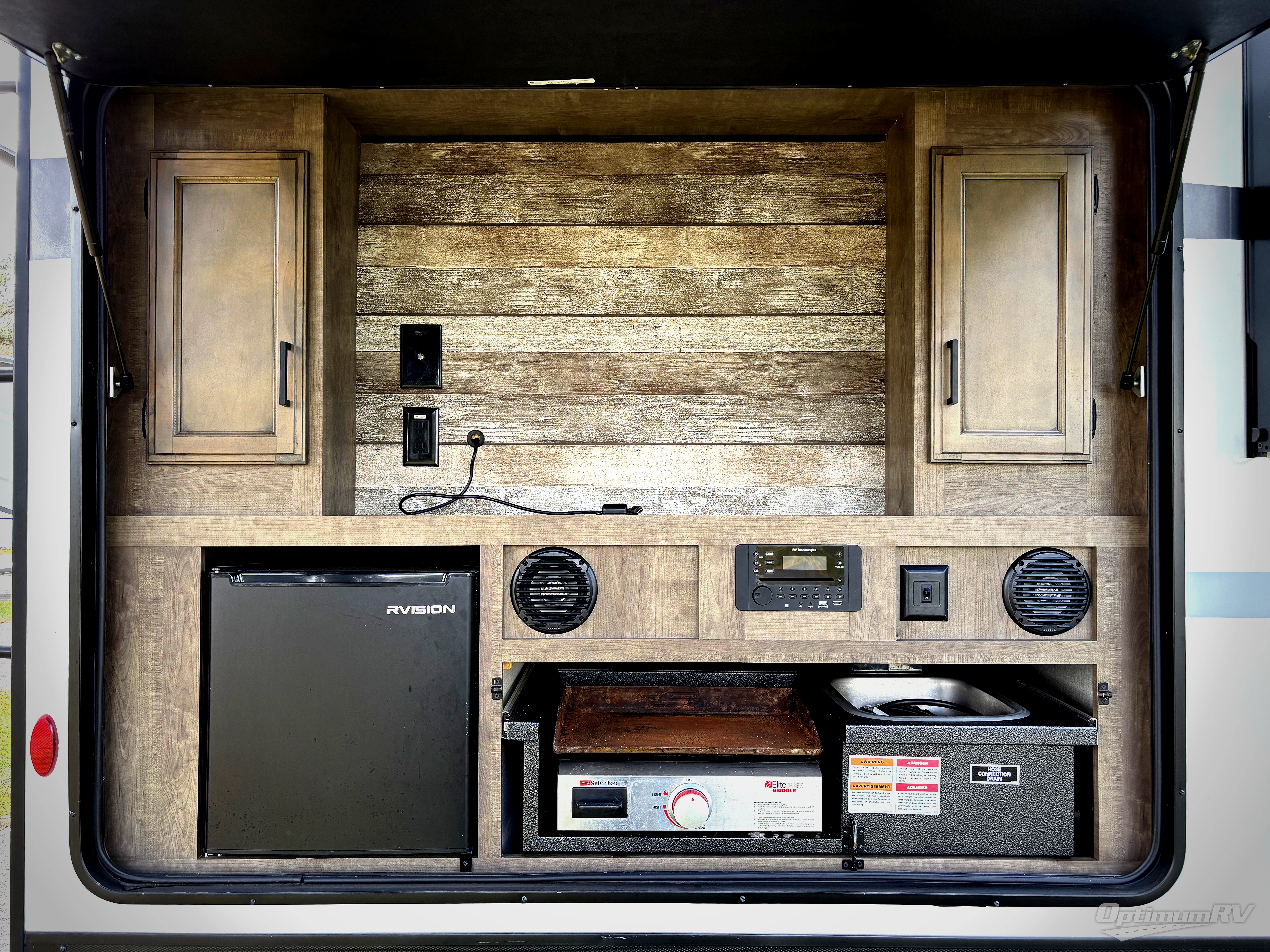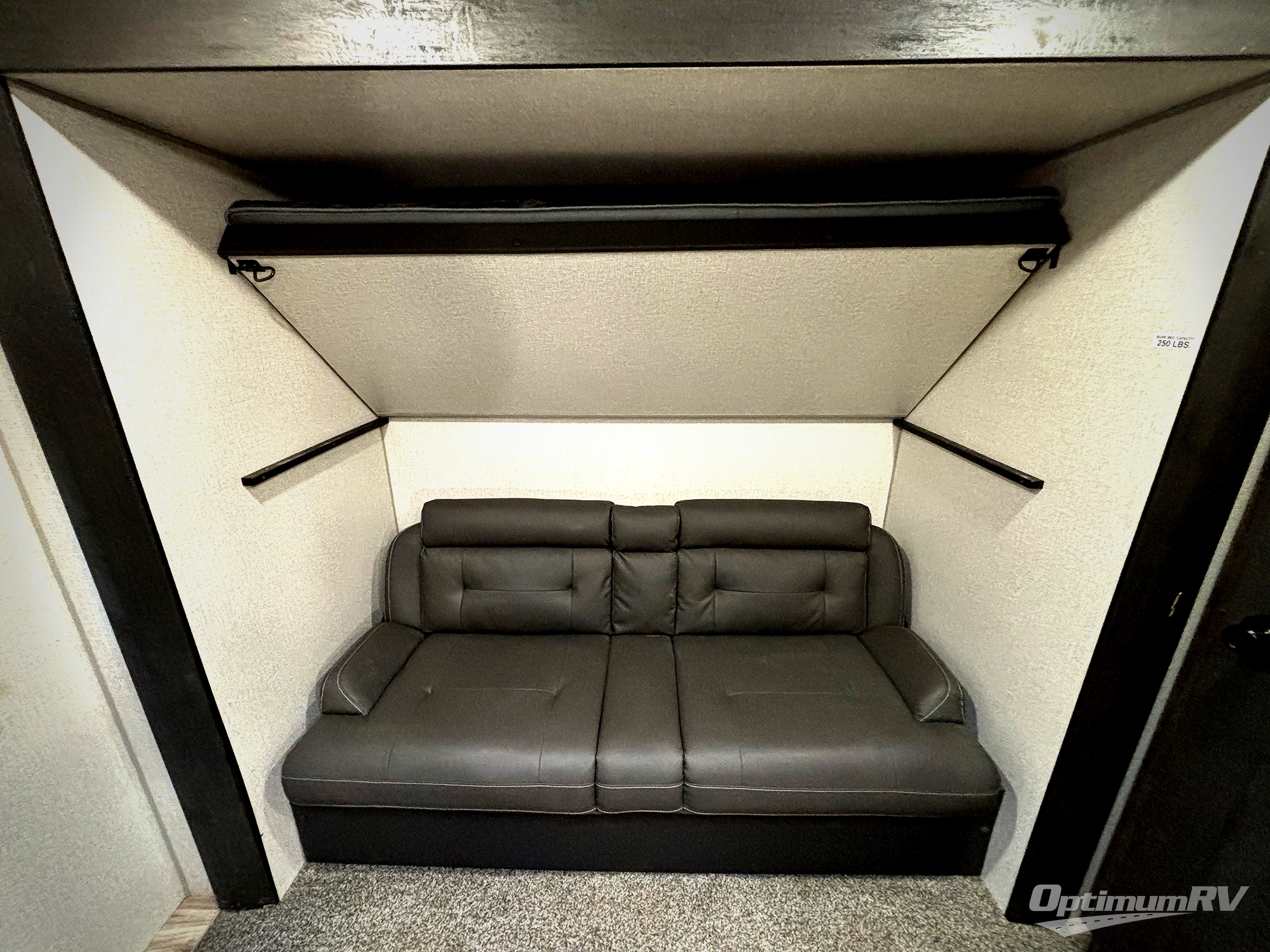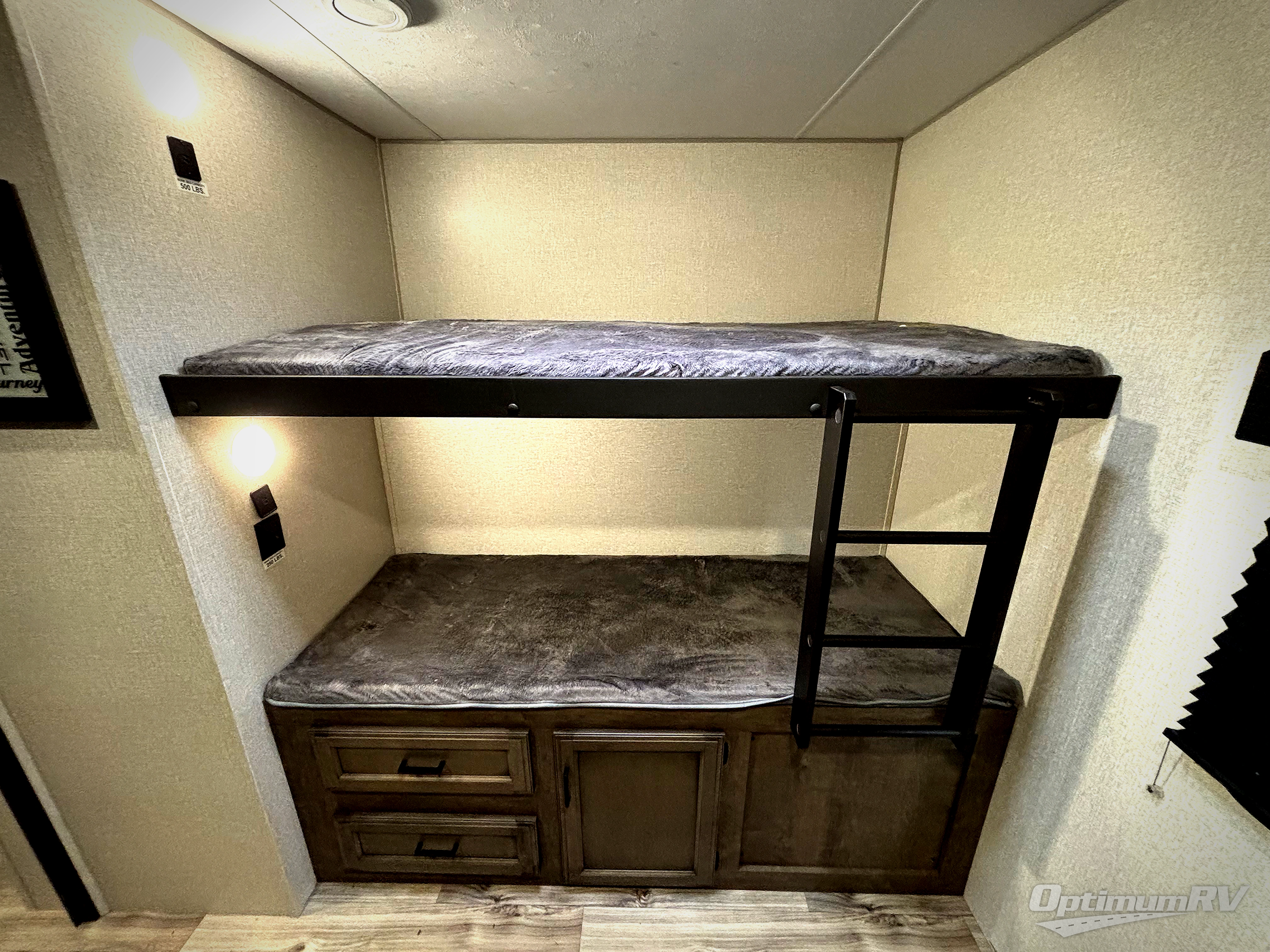 The whole family can camp together in this travel trailer! It features a rear private bunkhouse with a 28" x 70" top bunk above a 40" x 70" bottom bunk, a closet, and a 28" x 73" flip up top bunk above a 70" sofa with table slide. One of the dual entry doors leads directly into the half bathroom with fold-out aluminum steps so you can get back to having fun faster. The chef can prepare their best meals for the crew either indoors with the three burner cooktop or at the exterior campfire café with a 40" TV/DVD/speakers to entertain them while they cook. Everyone can gather together at the 42" grand dinette and 70" tri-fold sofa across from the entertainment center with a fireplace for a cozy evening. The dual entry bathroom is easy to access, especially for those staying in the front private bedroom. You even have a coat closet next to the main entrance to limit the clutter!