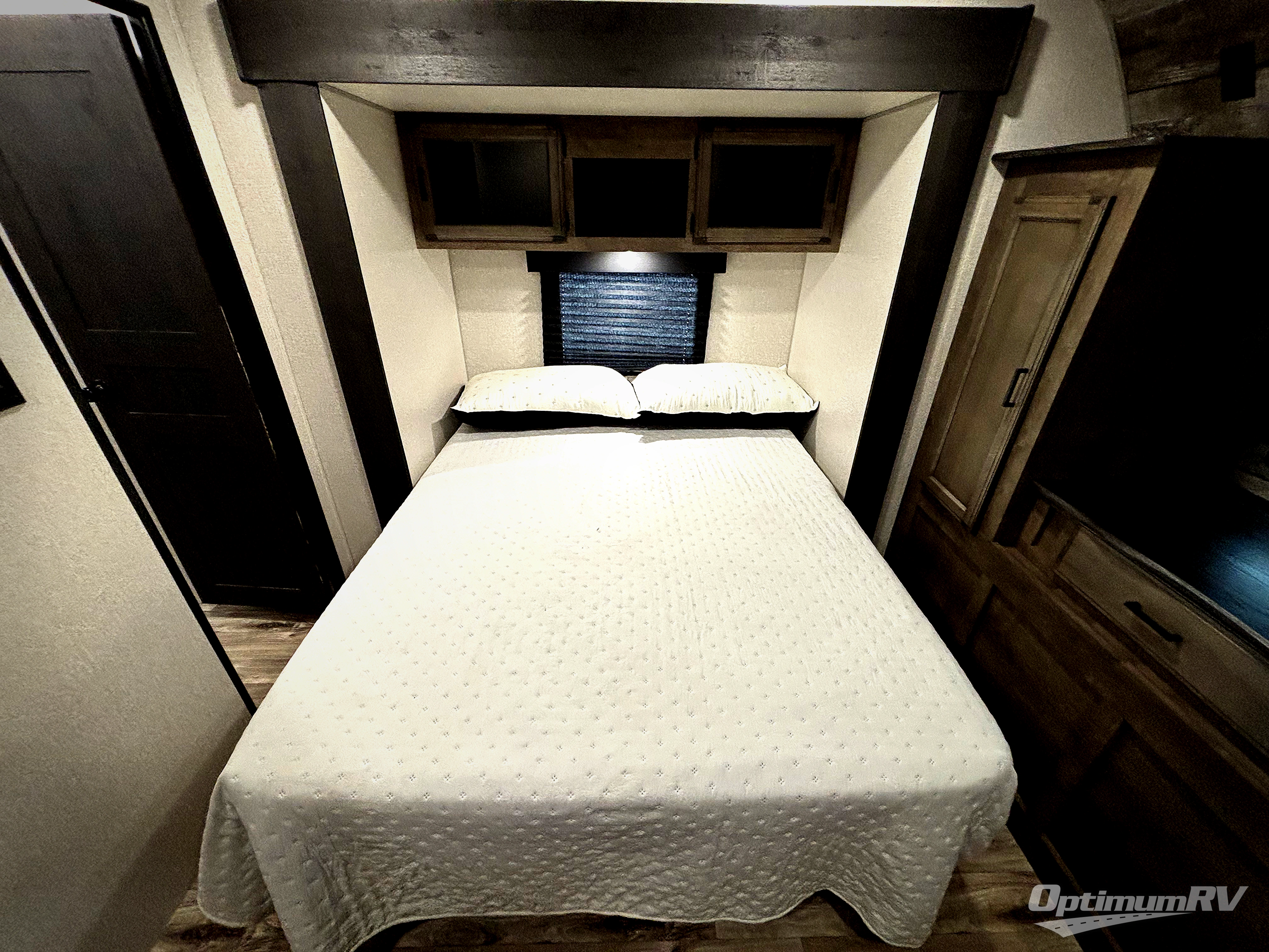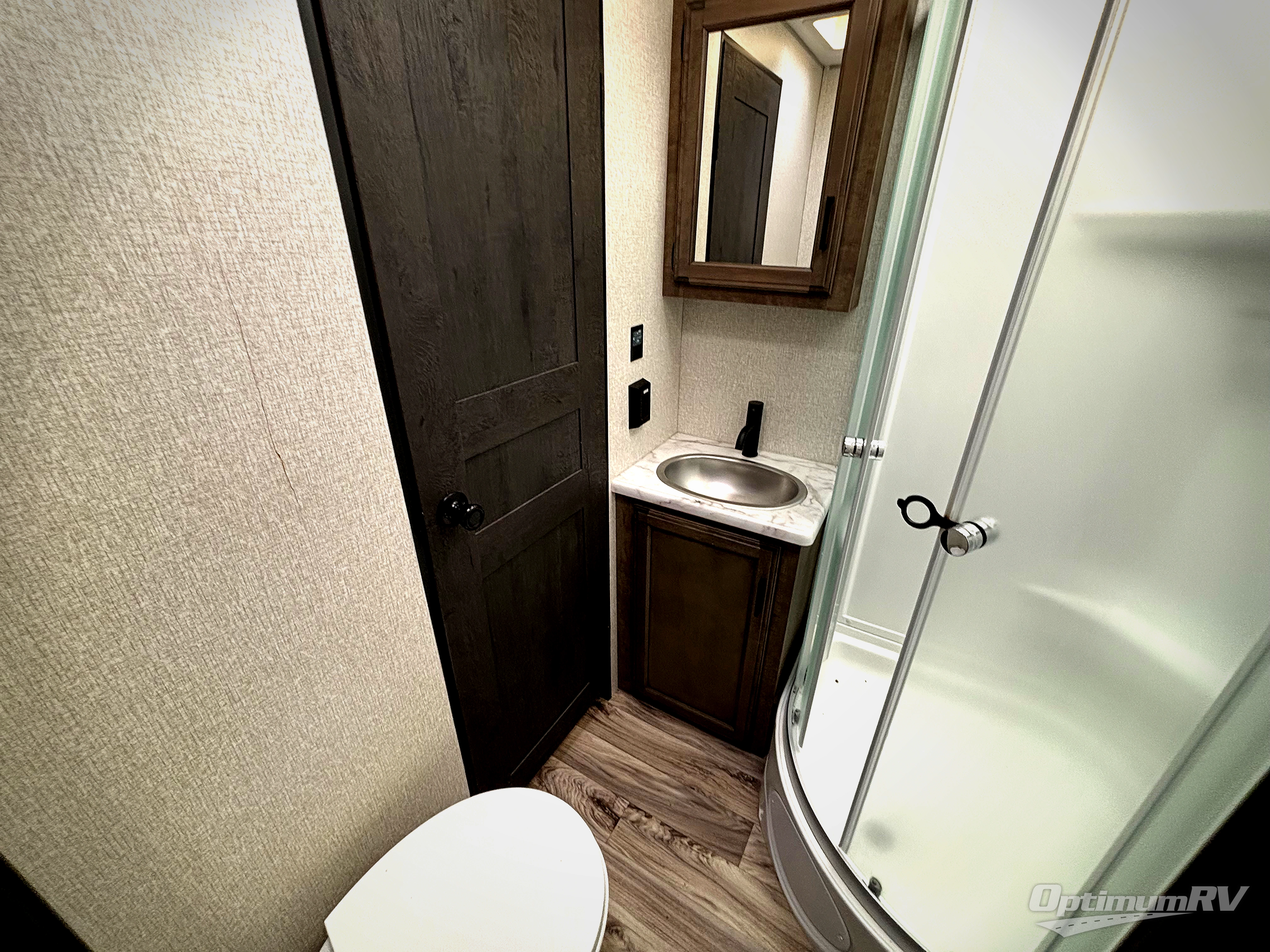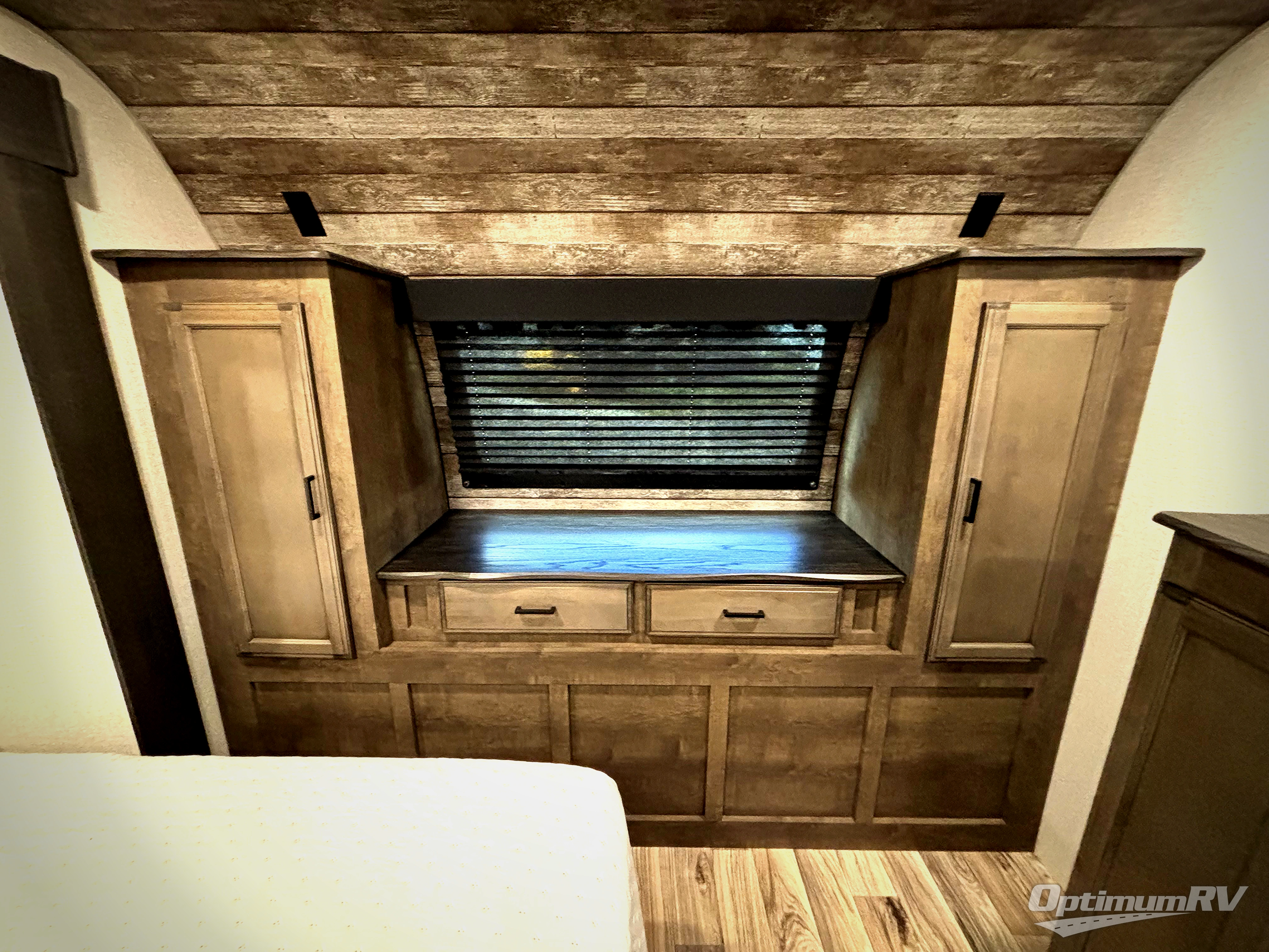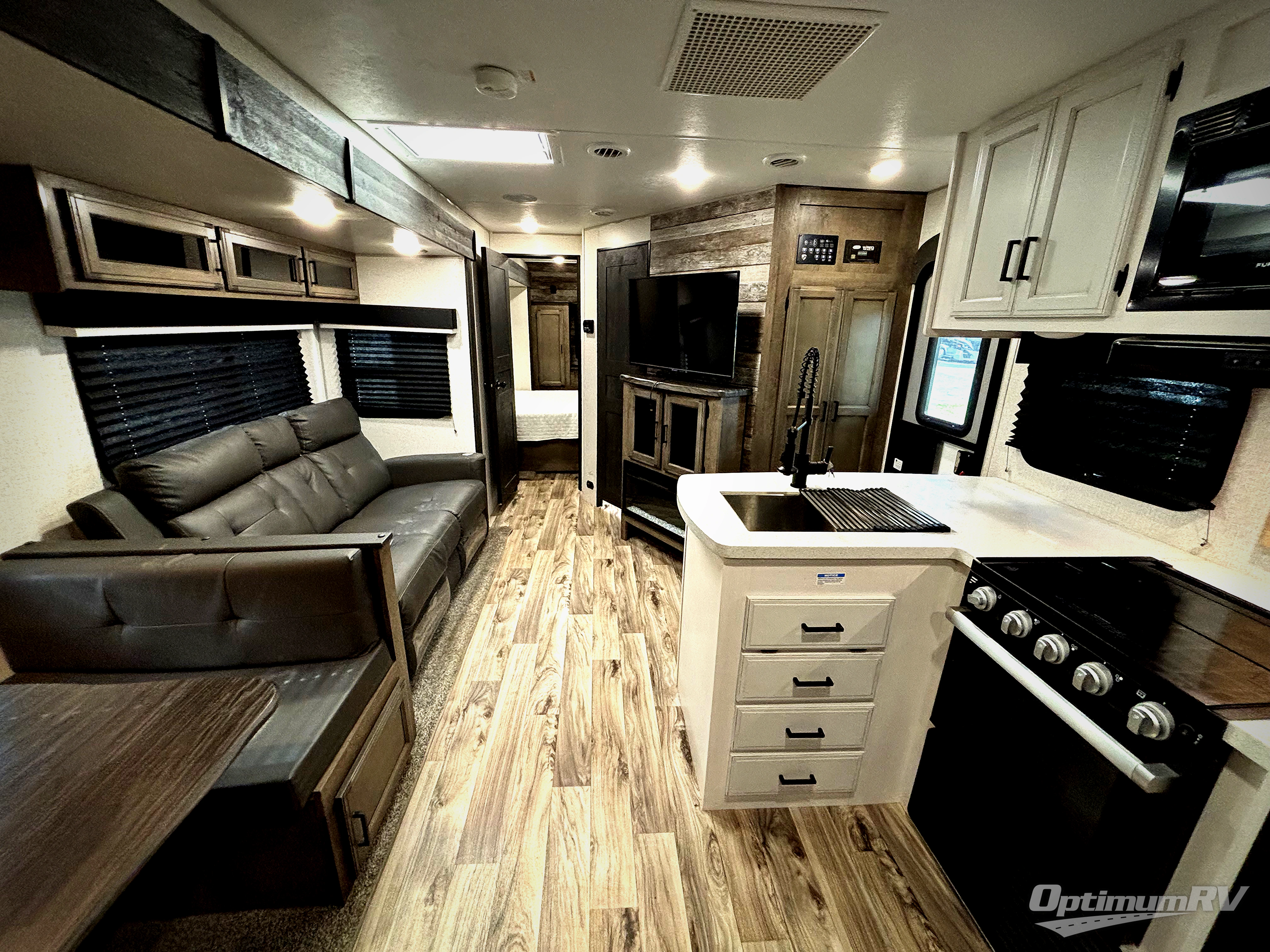 The whole family can camp together in this travel trailer! It features a rear private bunkhouse with a 28" x 70" top bunk above a 40" x 70" bottom bunk, a closet, and a 28" x 73" flip up top bunk above a 70" sofa with table slide. One of the dual entry doors leads directly into the half bathroom with fold-out aluminum steps so you can get back to having fun faster. The chef can prepare their best meals for the crew either indoors with the three burner cooktop or at the exterior campfire café with a 40" TV/DVD/speakers to entertain them while they cook. Everyone can gather together at the 42" grand dinette and 70" tri-fold sofa across from the entertainment center with a fireplace for a cozy evening. The dual entry bathroom is easy to access, especially for those staying in the front private bedroom. You even have a coat closet next to the main entrance to limit the clutter!