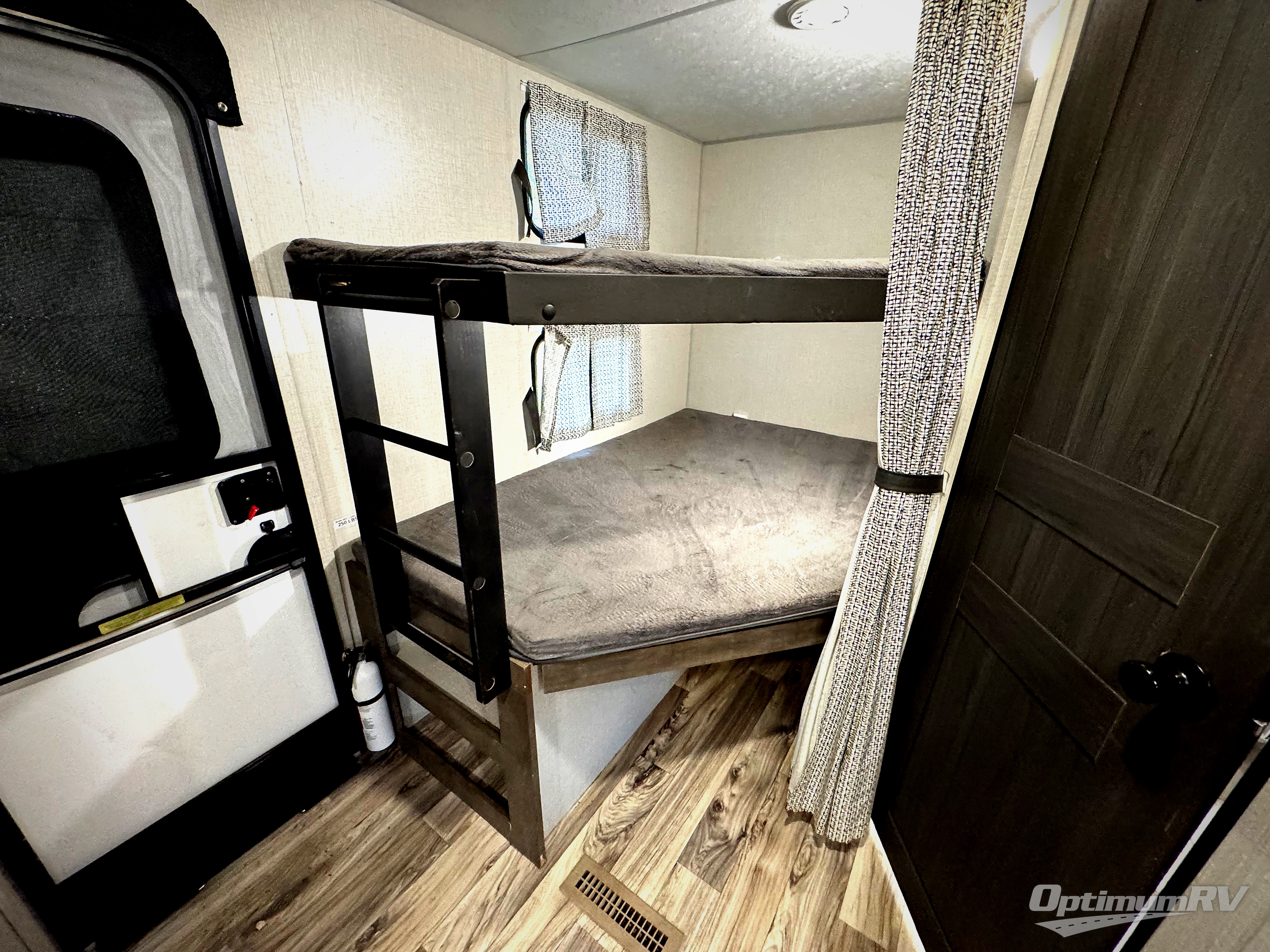 The whole family will have a fun time camping in this travel trailer! You will appreciate having your own privacy with the front private bedroom that has a sleep tight queen bed to lay your head at night and wardrobes on either side to hang your clothes. The kids can sleep on the set of 51" x 75" double bed over double bunk beds and can even invite a friend or two to tag along and sleep on either the 70" sofa or the 42" booth dinette once they are converted. Everyone can freshen up in the rear corner bathroom with the 30" x 36" shower. Behind the entertainment center is a walk-in pantry with coat hooks so you can store your jacket and canned goods in one place. The chef will enjoy cooking at the outside campfire café with the griddle, the refrigerator, and the sink!