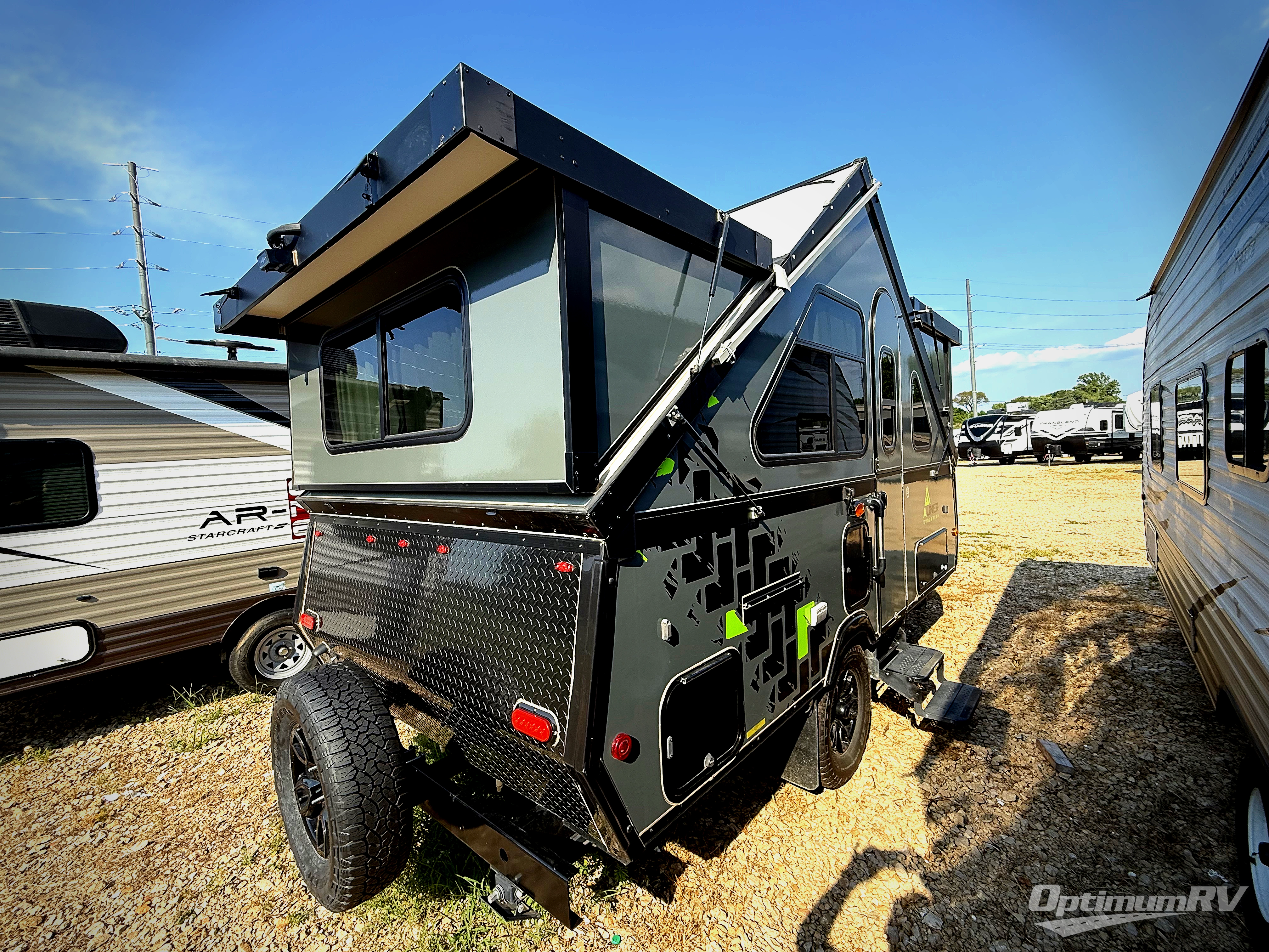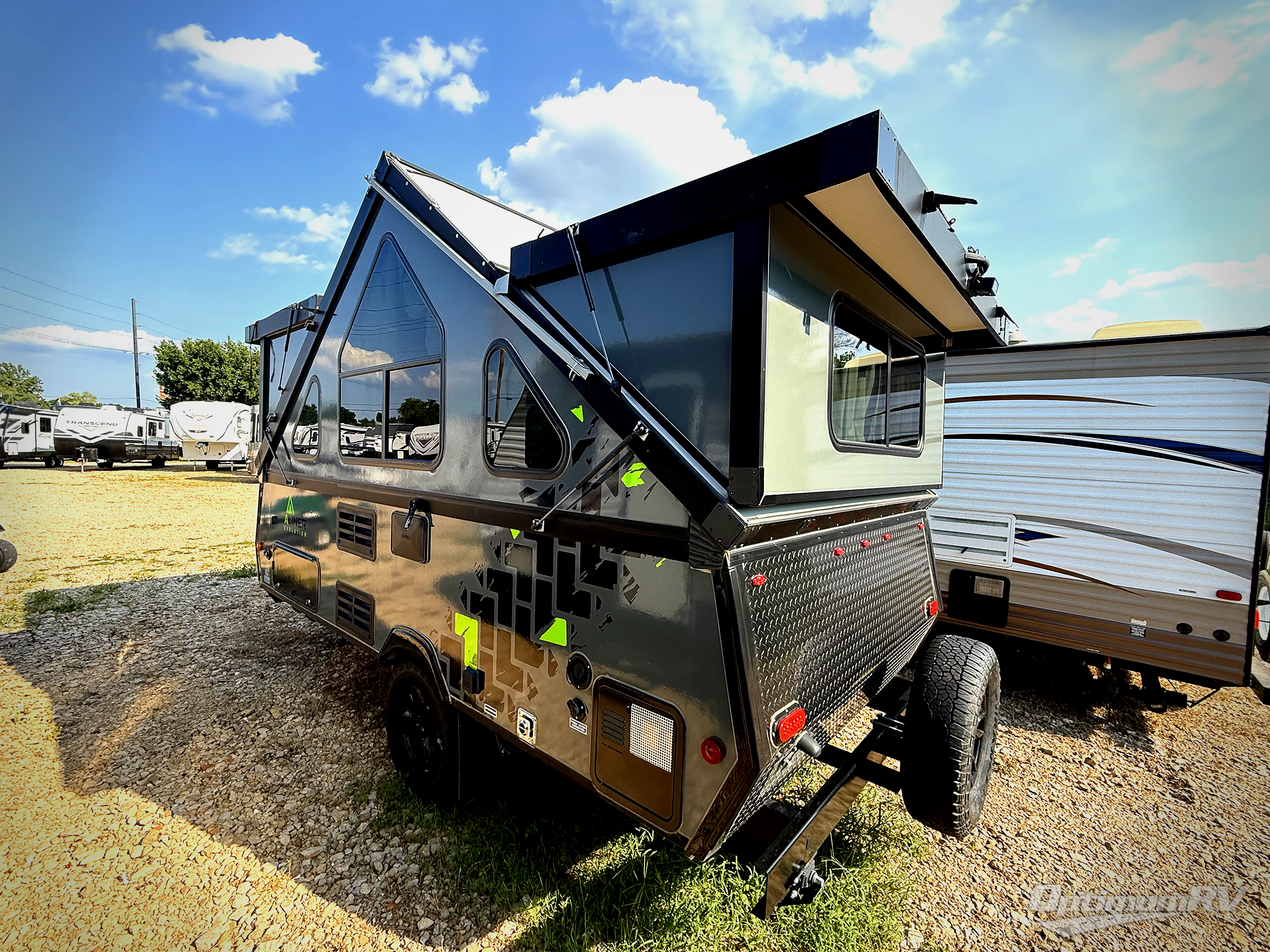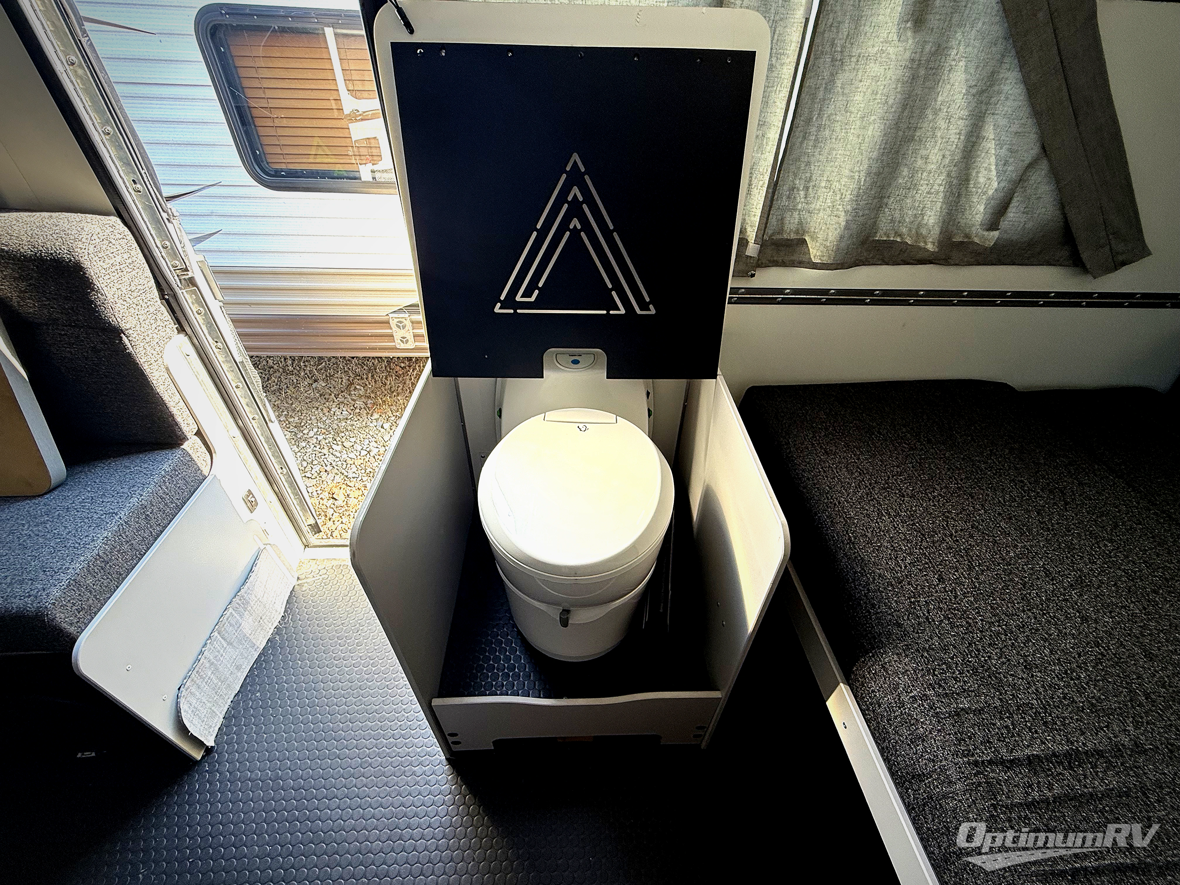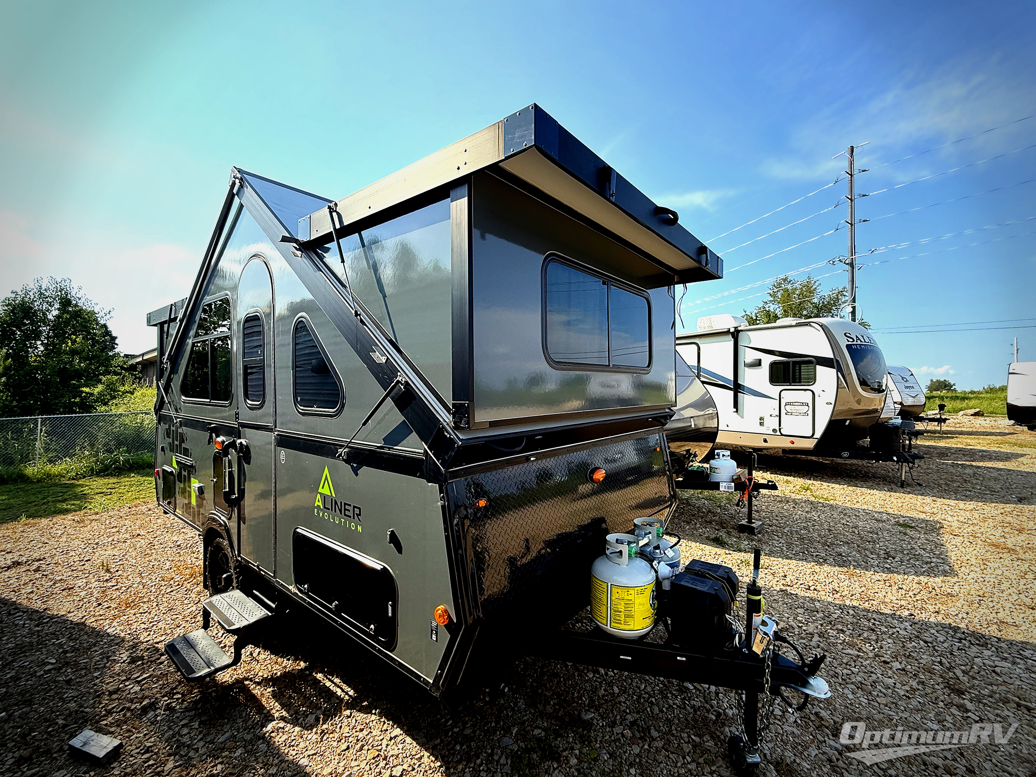 The Evolution A-frame camper by ALiner is coming to you with residential features and solid construction materials. You'll love the black and slate gray exterior package, and the Azdel composite panels included help prolong the life of your camper. There is a Sunflare 185 watt solar panel with a Victron charge controller, LED running lights, exterior baggage doors, plus many more exterior conveniences. The Evolution A-Frame camper comes with commercial grade, Midnight Black, raised coin 100% polyvinyl flooring, Simona boatboard interior cabinets and furniture with riveted construction, three indoor electrical outlets, and a Fantastic vent fan to name a few interior comforts.