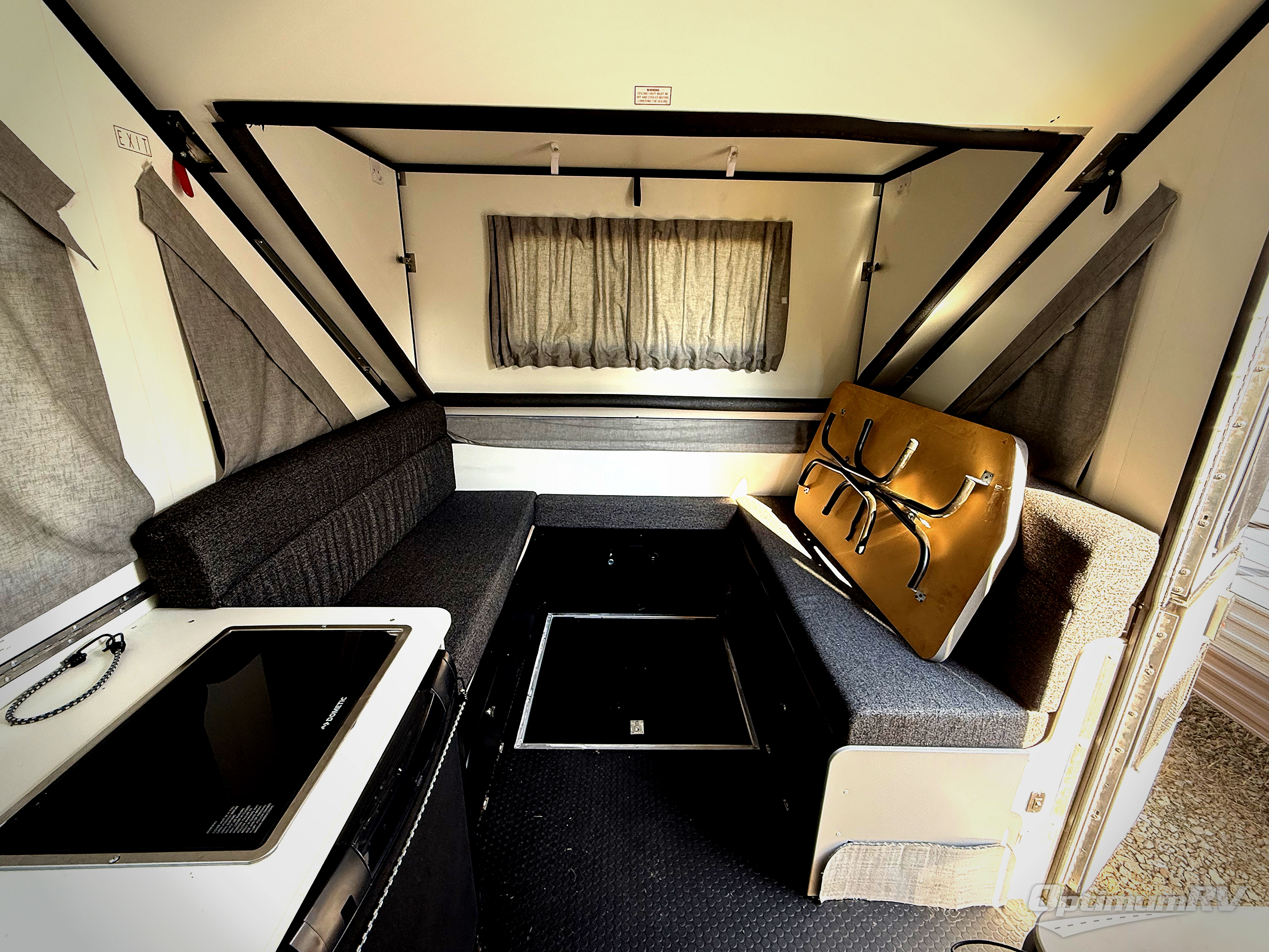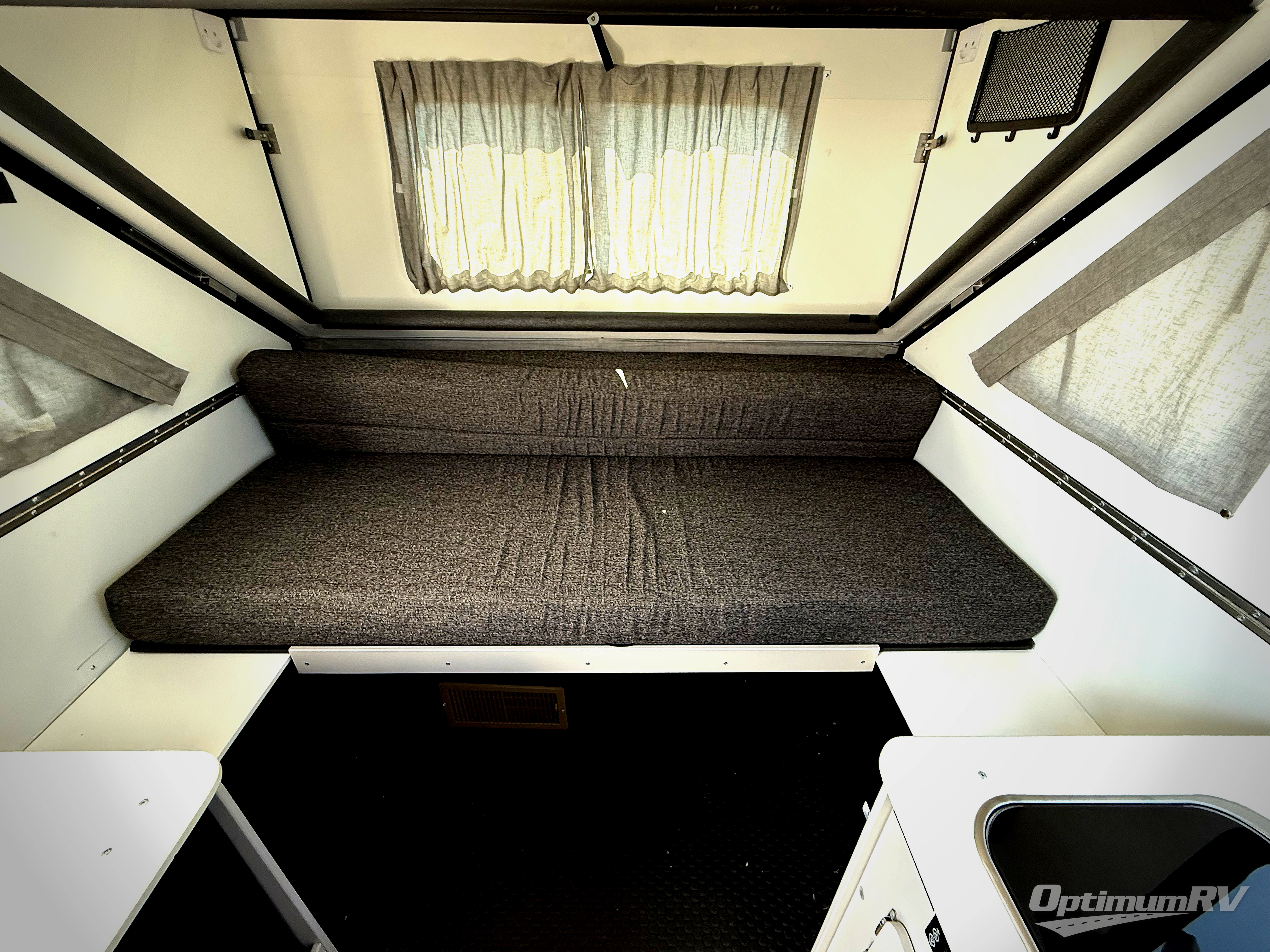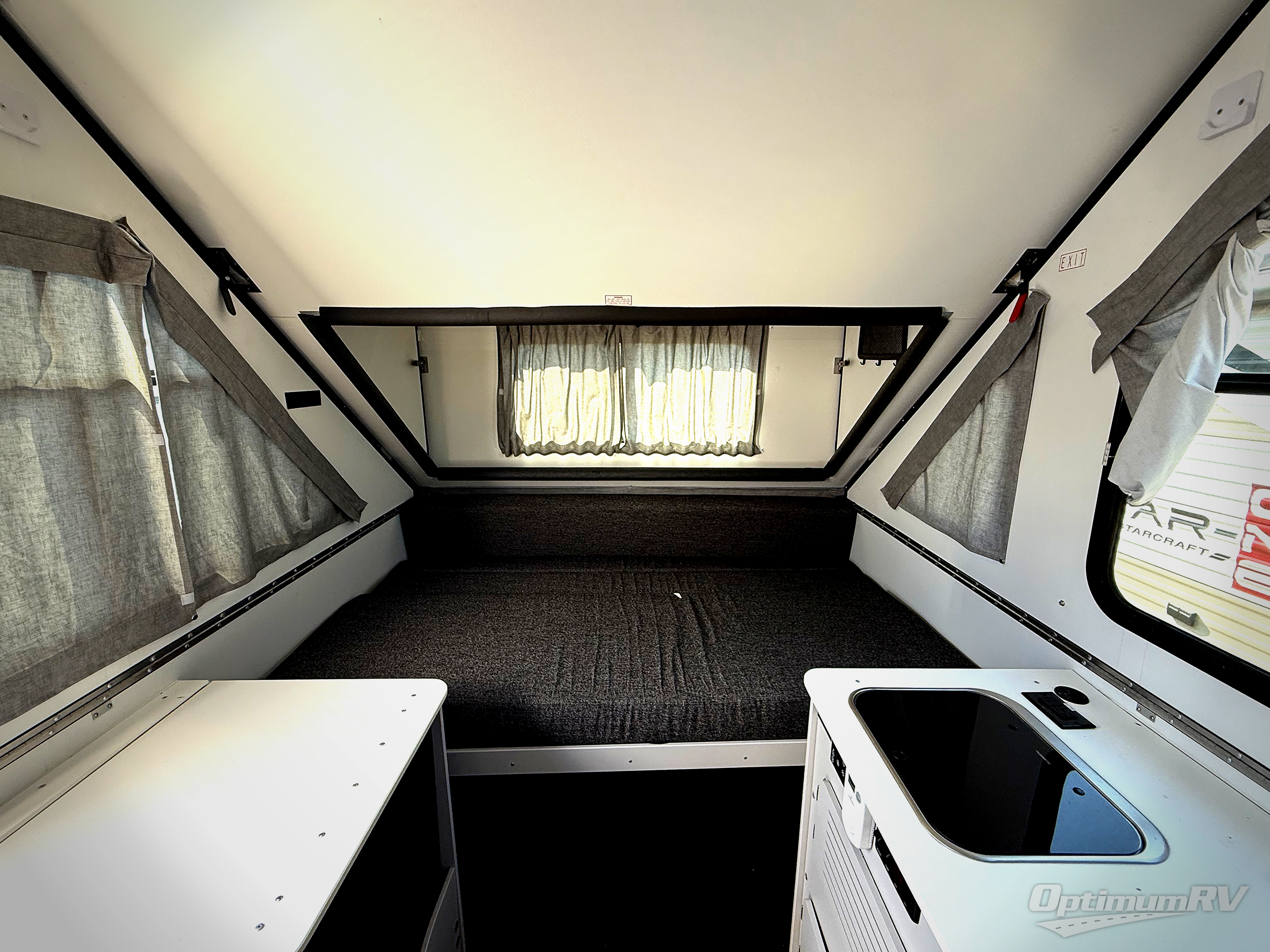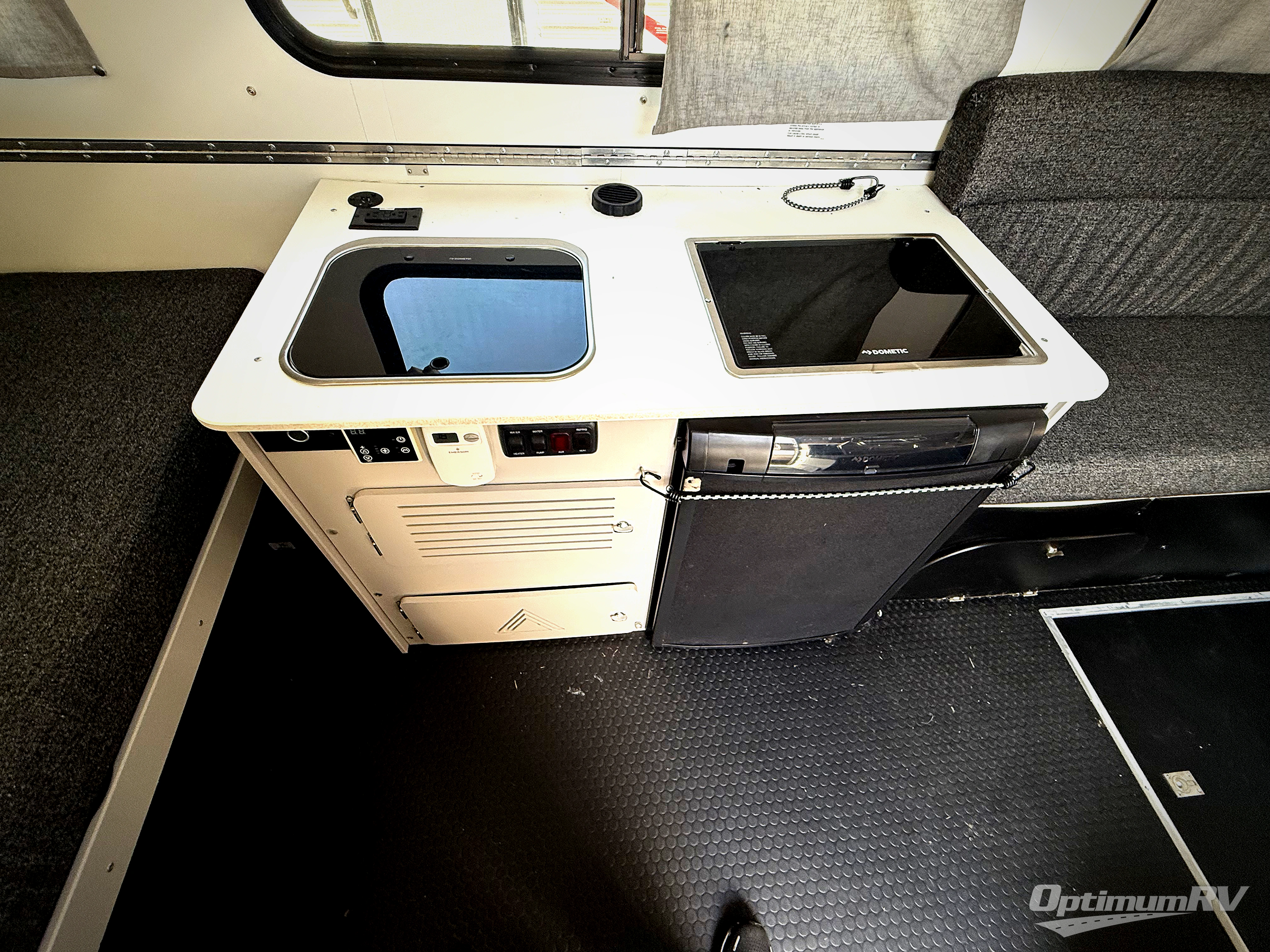 The Evolution A-frame camper by ALiner is coming to you with residential features and solid construction materials. You'll love the black and slate gray exterior package, and the Azdel composite panels included help prolong the life of your camper. There is a Sunflare 185 watt solar panel with a Victron charge controller, LED running lights, exterior baggage doors, plus many more exterior conveniences. The Evolution A-Frame camper comes with commercial grade, Midnight Black, raised coin 100% polyvinyl flooring, Simona boatboard interior cabinets and furniture with riveted construction, three indoor electrical outlets, and a Fantastic vent fan to name a few interior comforts.