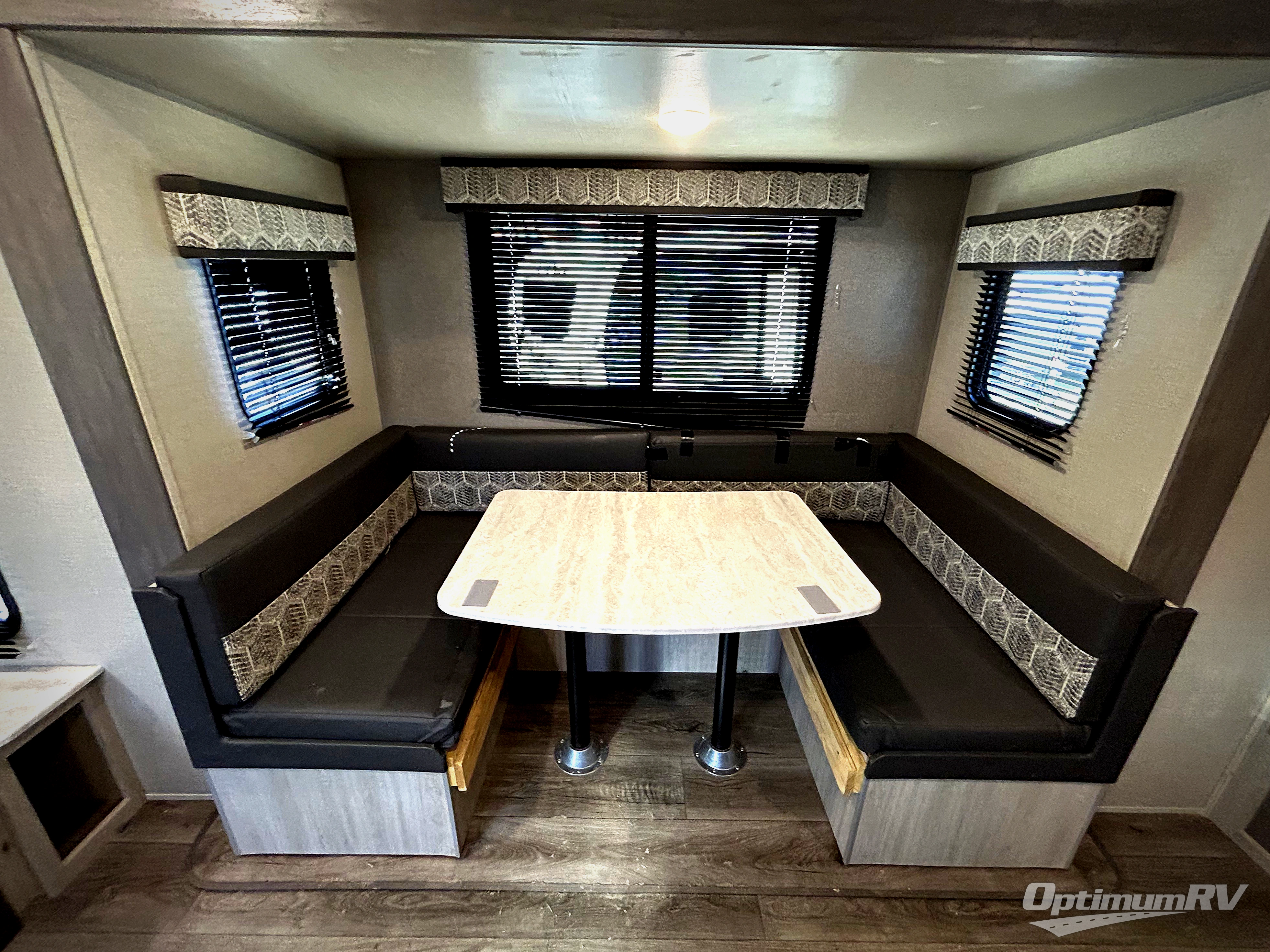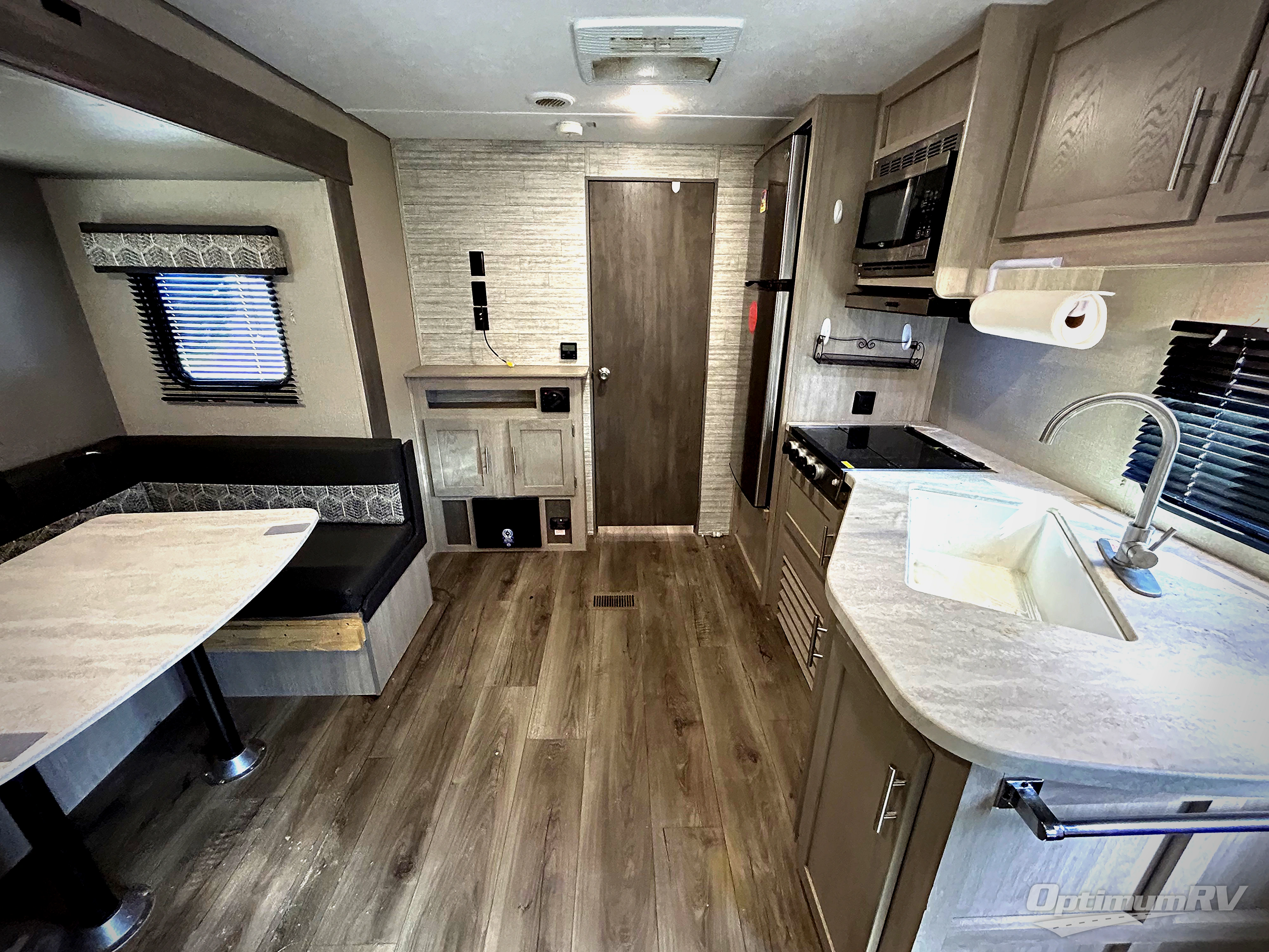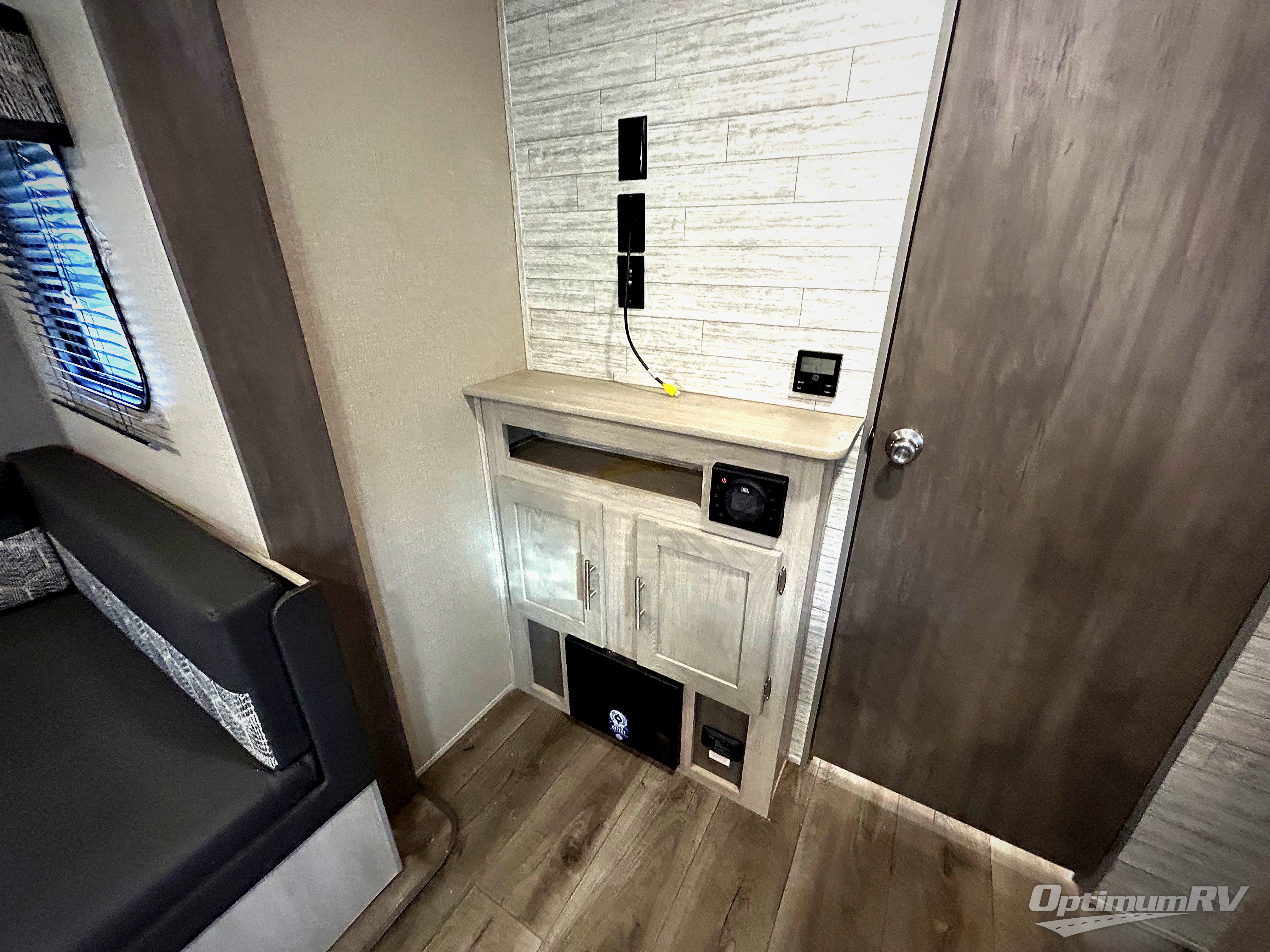 You and your spouse will love the layout of this trailer with a walk-through bathroom which is convenient for you when you are in the front bedroom, and handy for your guests when they stay overnight on the jiffy sofa. The sofa includes dual end tables to set your drink on, and the U-shaped dinette will be perfect to dine around or play games at. The galley kitchen offers all the appliances needed to make all your meals, such as a three burner cooktop, a stainless steel microwave, plus a 10 cu. ft. 12V refrigerator. You will have your own side of the walk-around queen bed and a wardrobe, as well as USB ports and 110V outlets in the nightstands.