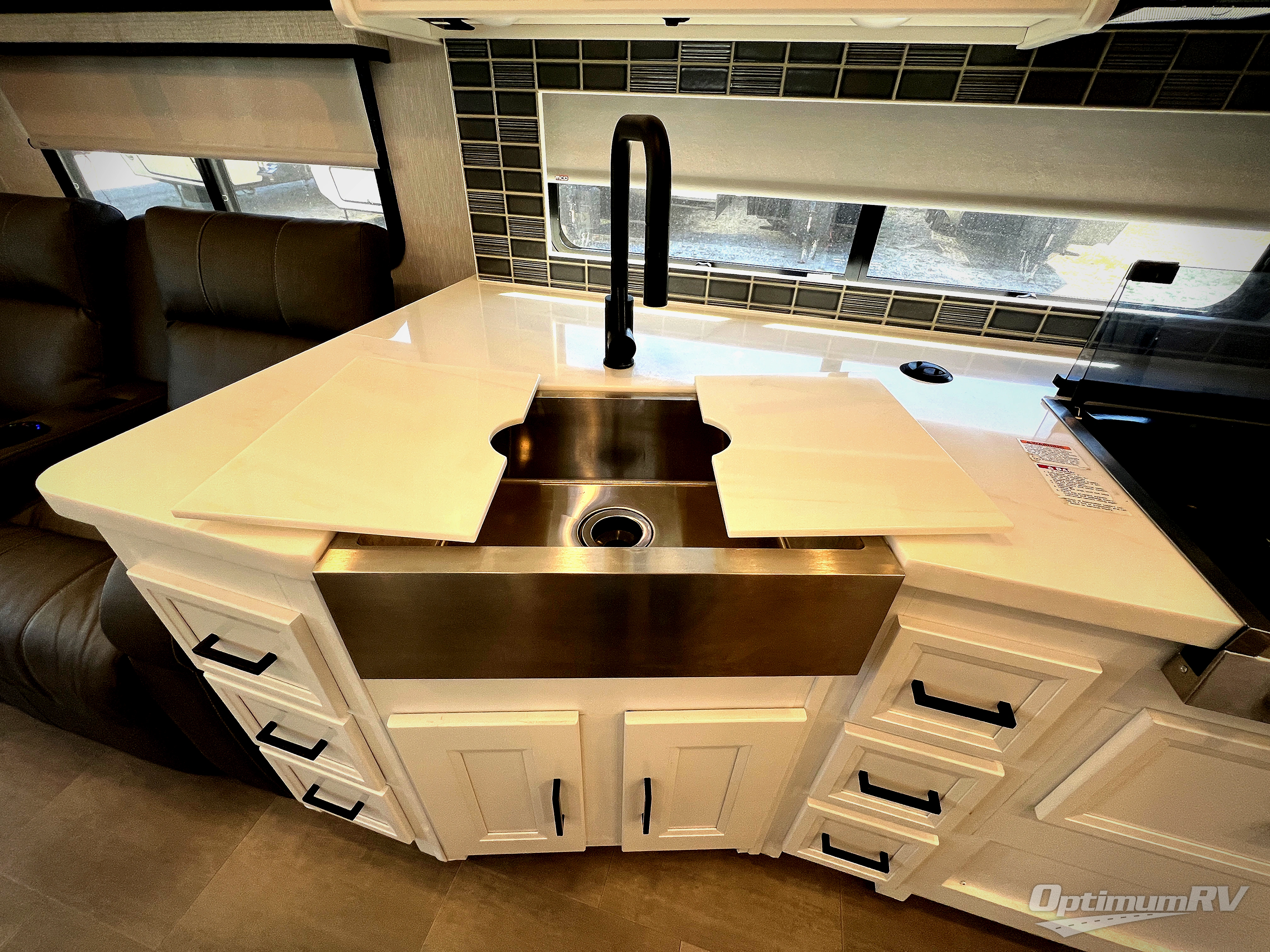 You won't even feel like you're on the road with this motorhome! The fully equipped kitchen has everything you need to prepare your delicious meals including a farm sink for easy clean up. There is a 42" x 76" booth dinette to enjoy your meals at then play a card game or two before relaxing on the 68" sofa bed. You can also add optional power theater seating for more seating space to watch movies with the 40" LED TV. If you need to get some work done while you're away then you can easily do so at the computer work station in front of the passenger seat. After a long day of traveling, you can get refreshed in the full bathroom featuring a 38" x 24" shower and if you add the optional stackable washer and dryer you can even do a load of laundry. You will be able to get a good night's rest each night sleeping on the 70" x 74" king bed with storage system and CPAP station above it!