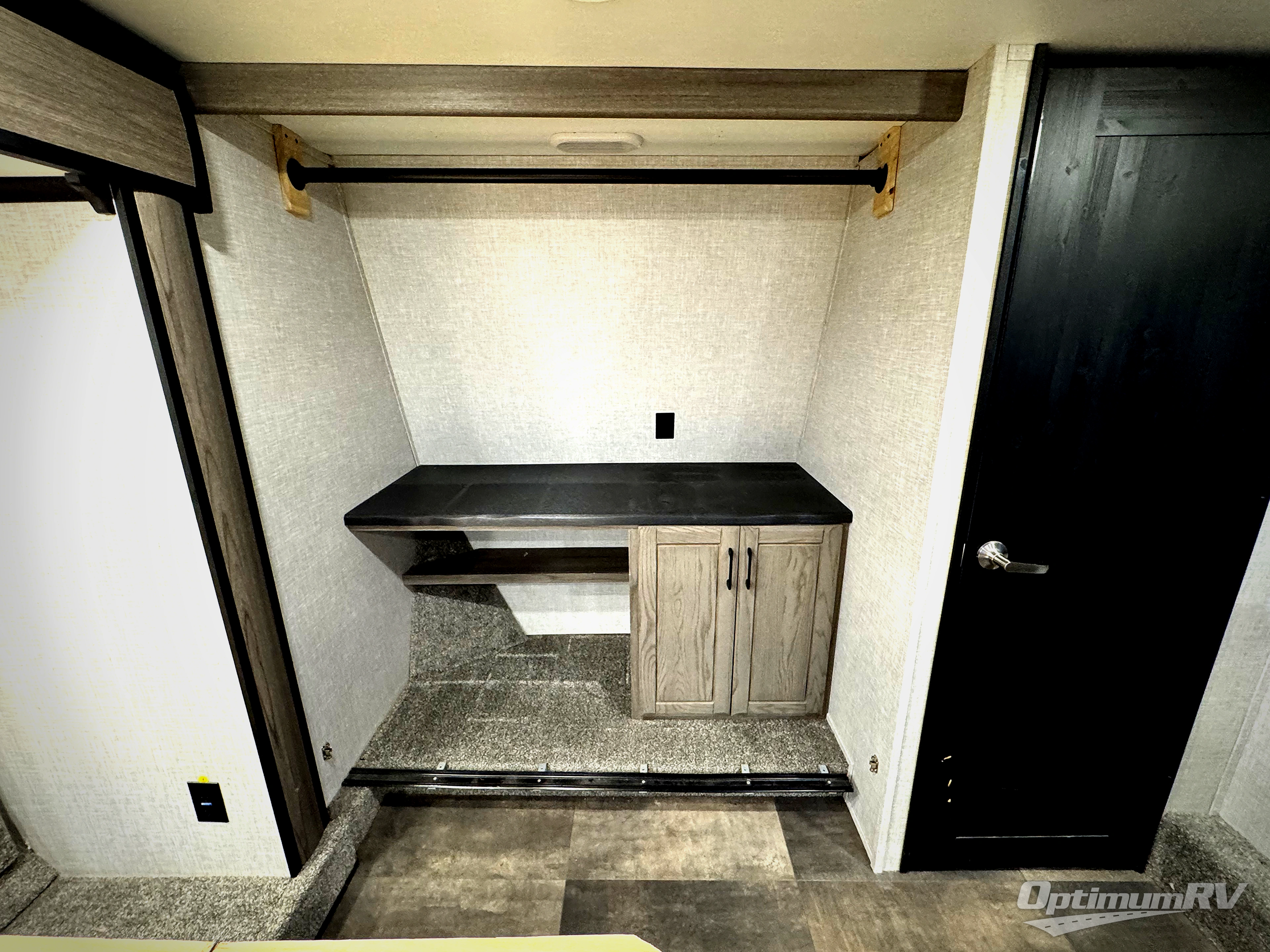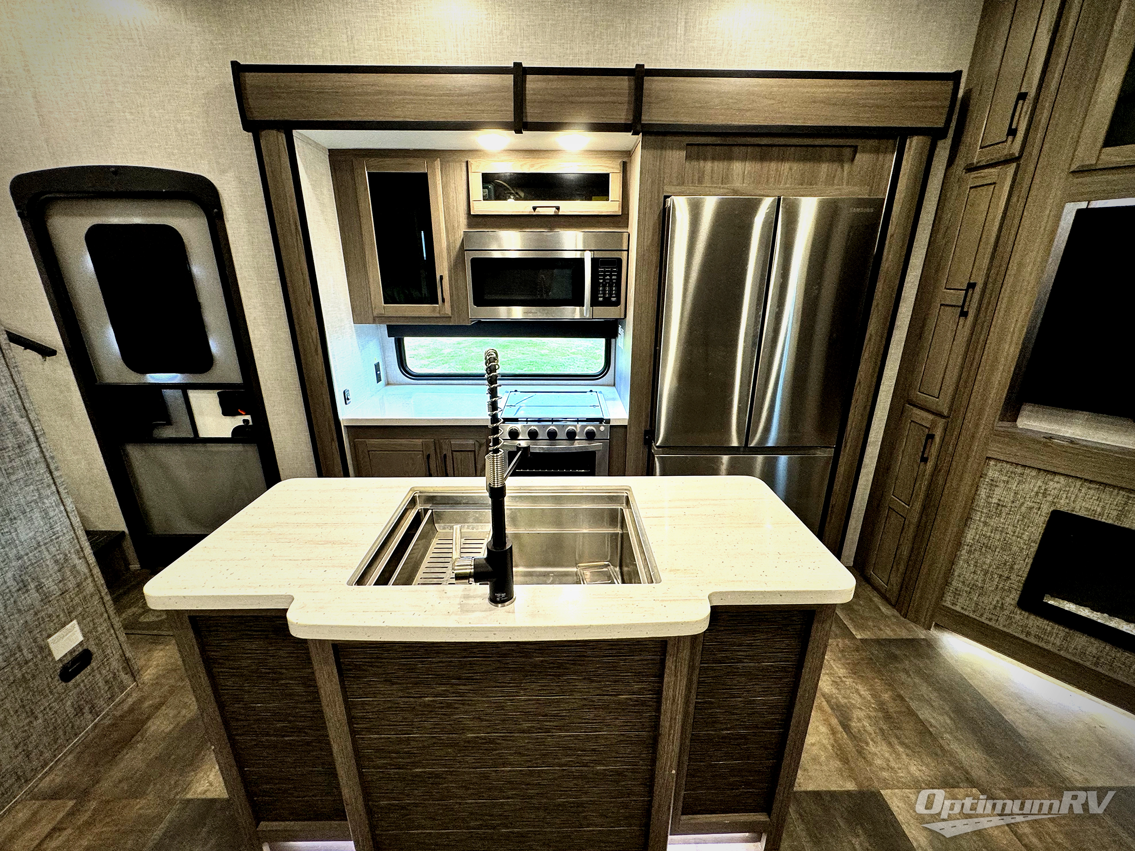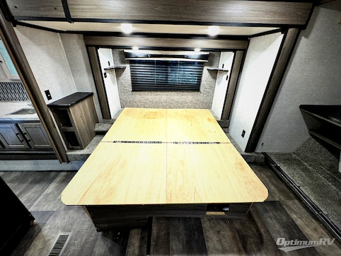 With dual entry doors, everyone can easily access this fifth wheel! One of the entrances leads directly into the half bathroom attached to the rear bedroom which has a tri-fold sofa slide and wardrobe below a 54" x 74" loft bunk mat. The chef can prepare their best home cooked meals either indoors with the Furrion kitchen collection and the kitchen island or at the outside kitchen with a refrigerator and griddle. Enjoy your meals together at the dinette with two chairs on one side and bench seating on the other side. The dual entry bathroom has a 48" shower with a seat to freshen up in each morning and a dual sink vanity for two to get ready at once, plus it enters into the front private bedroom. You will feel right at home in the bedroom with the king bed slide across from the dresser with a fireplace and 39" TV, and the front closet with a shoe shelf and an area prepped to add an optional washer and dryer!