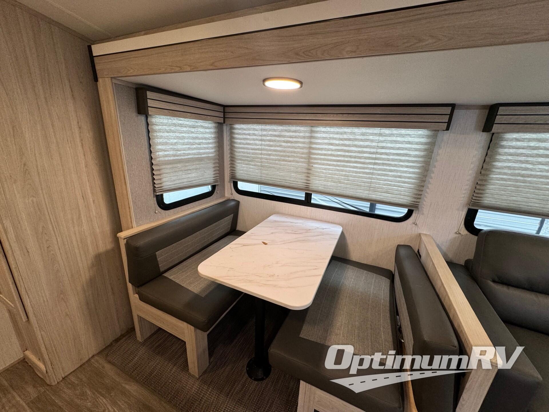 The kids or guests will love having their own privacy with the rear private bunkhouse in this travel trailer! The bunkhouse has a set of double bunk beds and a bunk above a dinette. The chef can prepare their best meals either indoors with the three burner cooktop or head to the outside kitchen and grill some burgers on the griddle. The sofa and booth dinette slide creates more walking around space, comfortable places to eat and socialize, and even extra sleeping spaces. The front private bedroom has a queen bed with wardrobes on either side to keep your clothes looking nice!