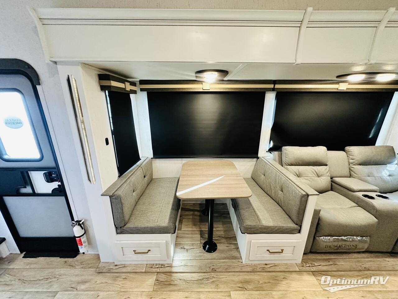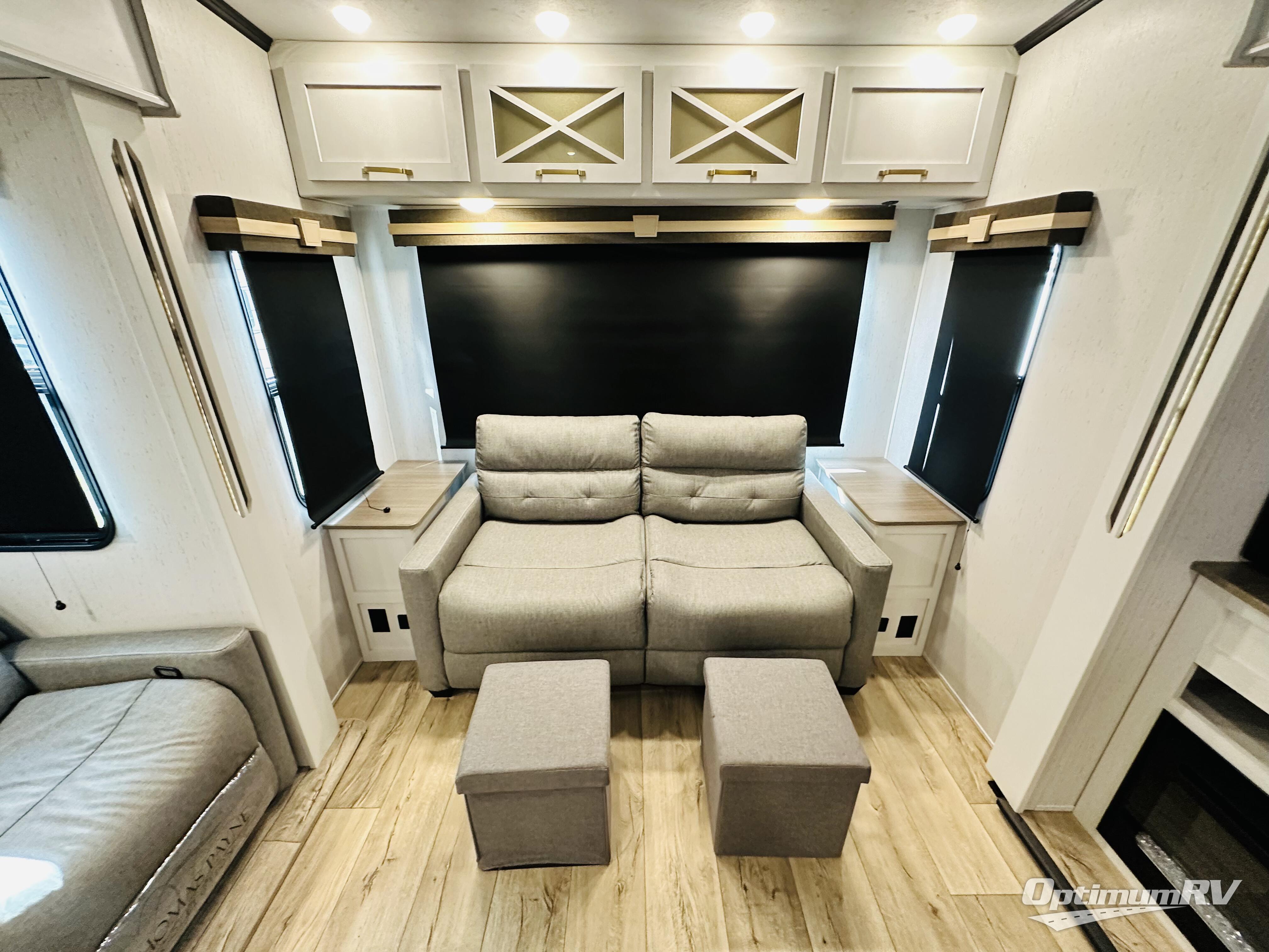 You won't even feel like you're camping with this fifth wheel! The rear living area has a tri-fold sofa to take an afternoon nap and theater seating across from the entertainment center which has a 50" LED TV and a fireplace below. Meal prepping will be easy with the extra countertop space below the hutch, and overhead cabinets can hold dishes and such, plus a kitchen island with a large sink that has a high-rise faucet with sprayer to make clean up easier. You can enjoy your meals at the free standing dinette then play a card game or two. Freshen up in the full bathroom then head to the front private bedroom and enjoy a good night's rest on the queen bed!