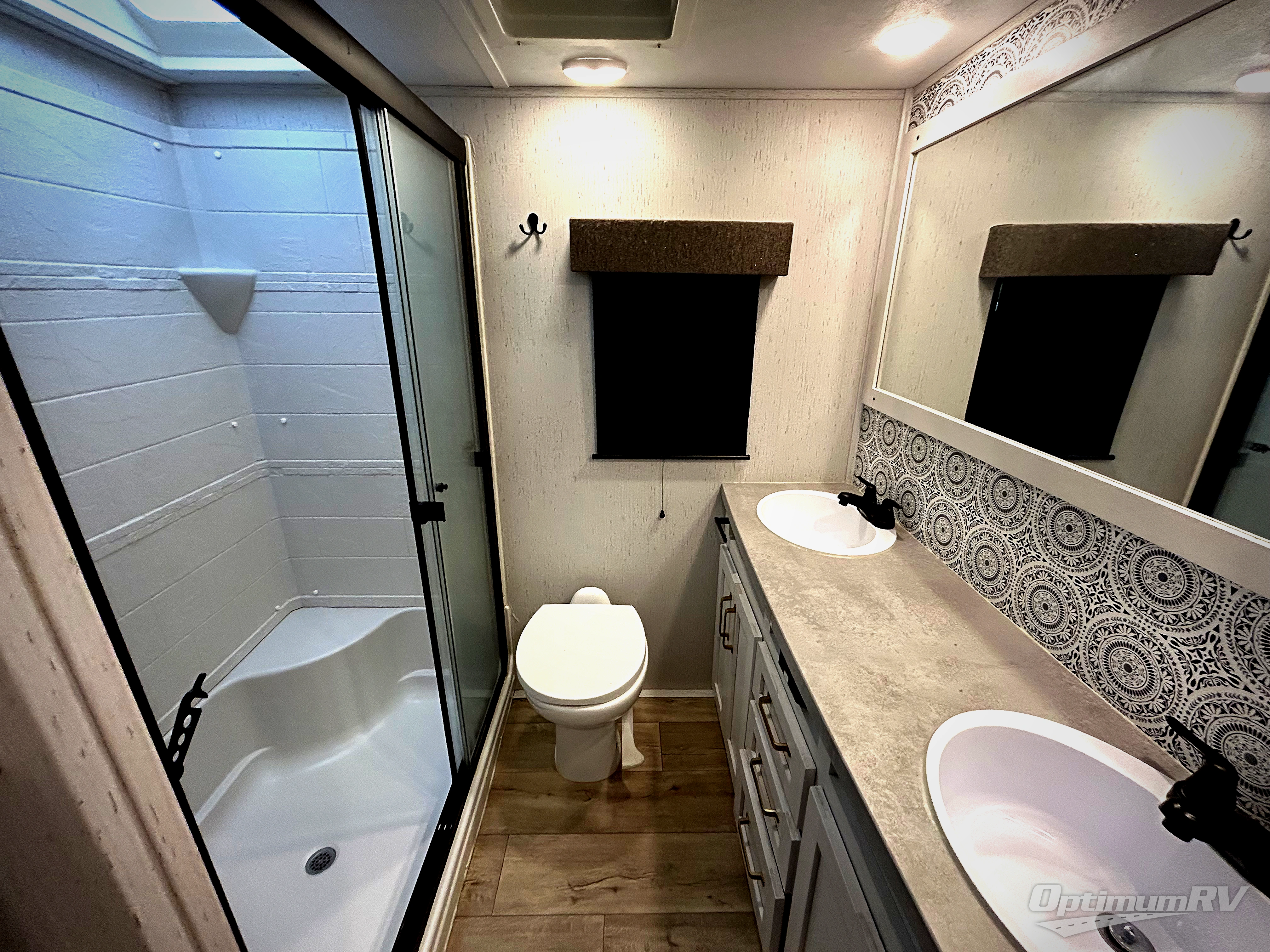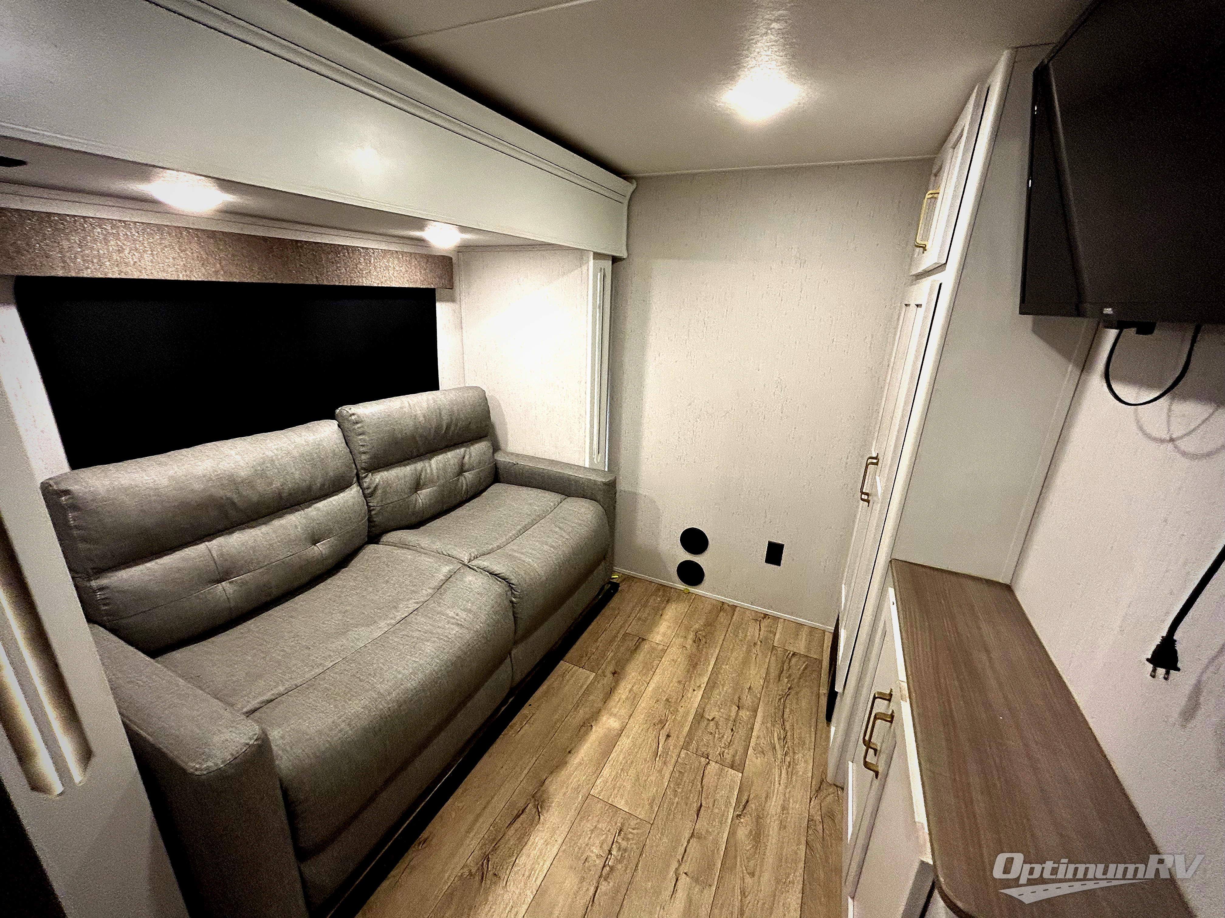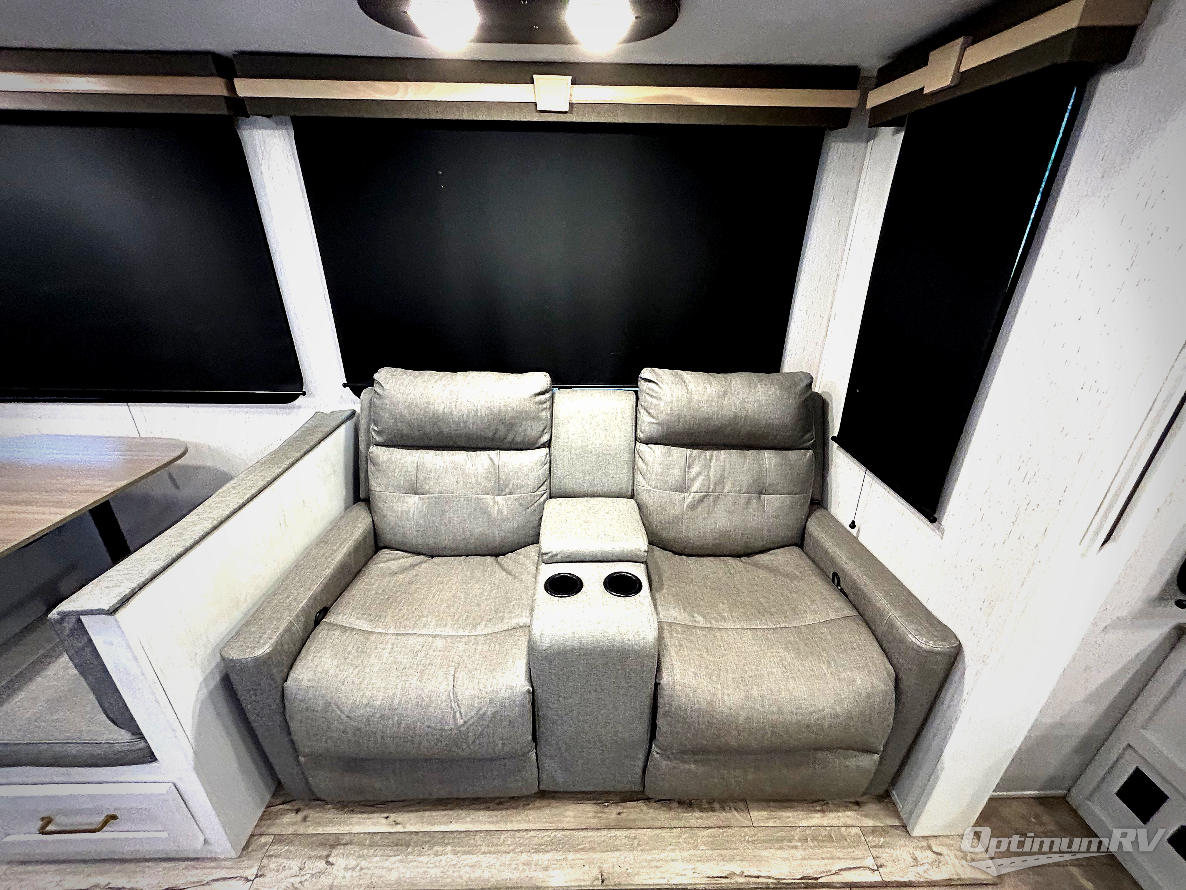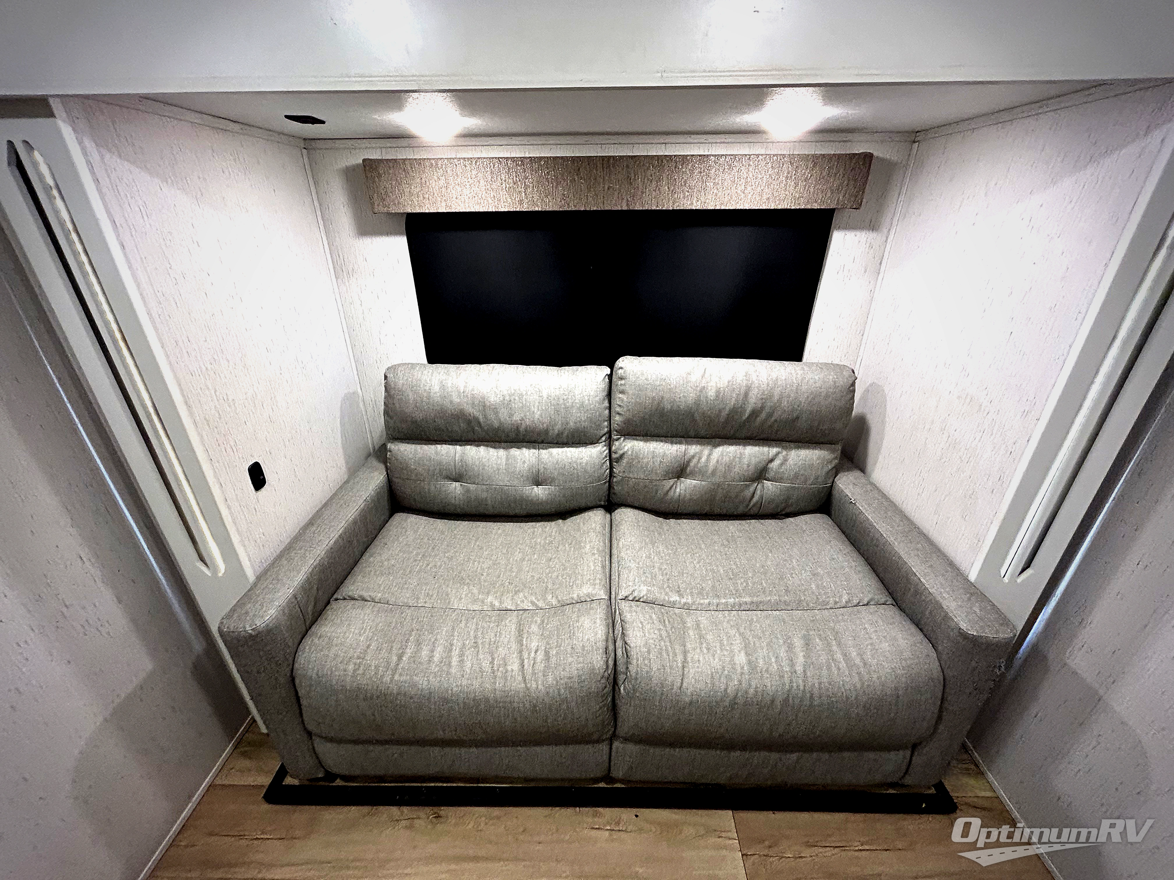 With a front bedroom and a middle multipurpose room in this fifth wheel, everyone will have a comfortable night's sleep when you include the living room furniture and the loft bed as sleeping space! The front private bedroom has a king bed slide and a front wardrobe to keep your clothes looking their best. The multipurpose room features a sofa slide and storage below a loft bed which can be used for sleeping or storage. A couple other guests can join in too and sleep on the rear tri-fold sofa and the booth dinette once they are converted. The full bathroom has a dual sink vanity to make it easier for everyone getting ready in the mornings. You can prepare your best meals with the glass top three burner cooktop with 21" oven, the 16 cu. ft. refrigerator, and the kitchen island. The theater seating is conveniently across from the entertainment center with a 50" LED TV and the fireplace.