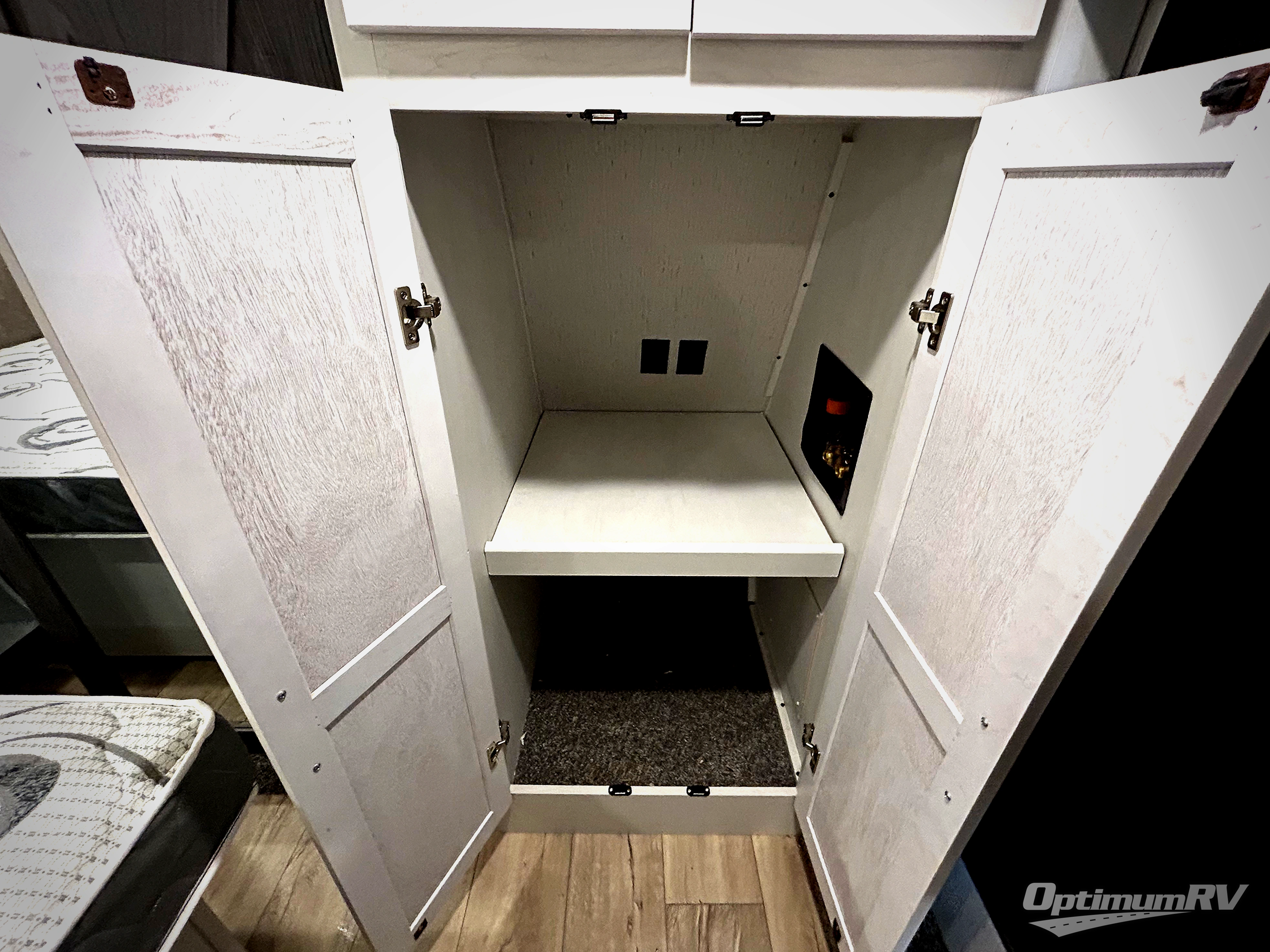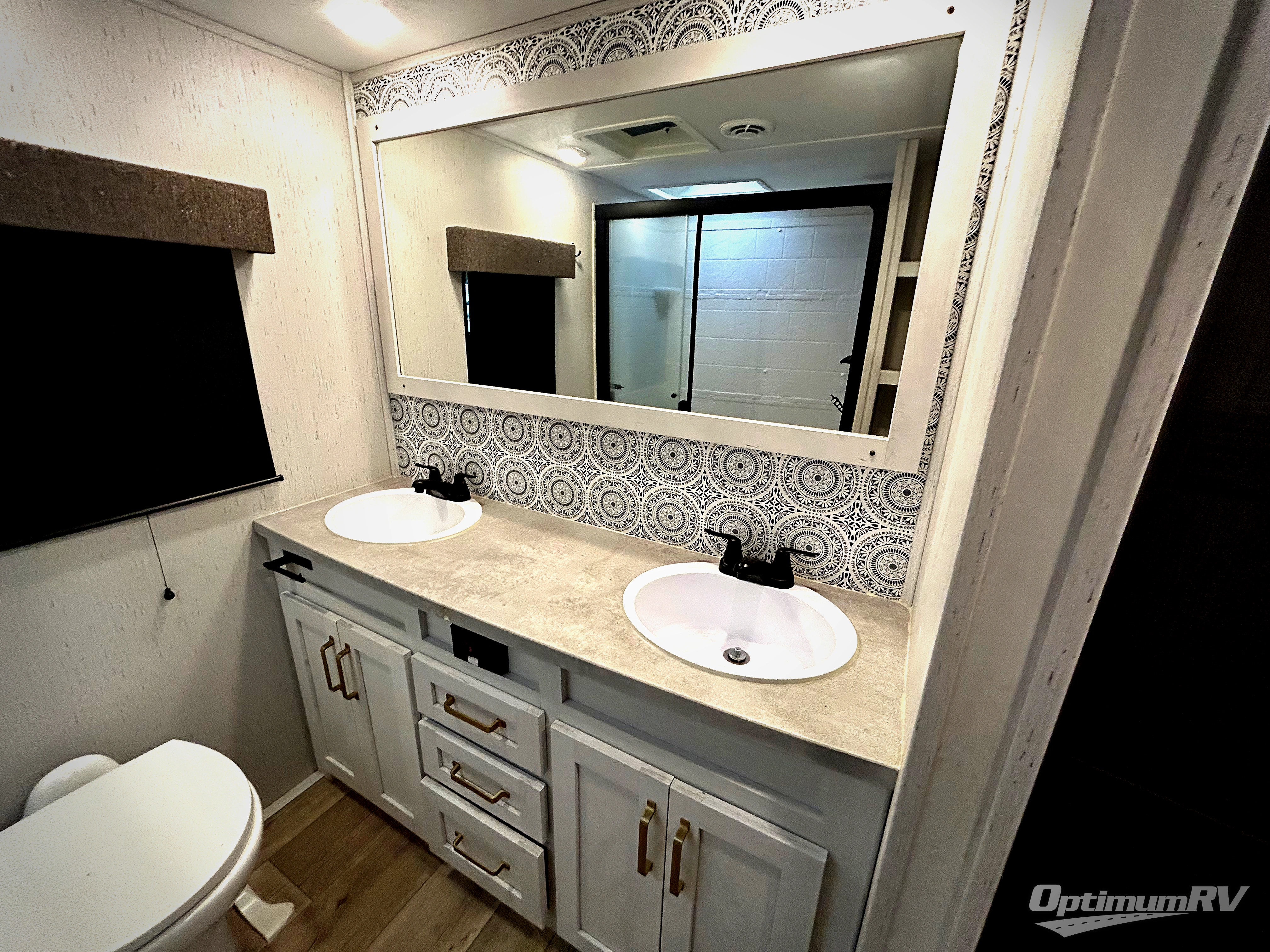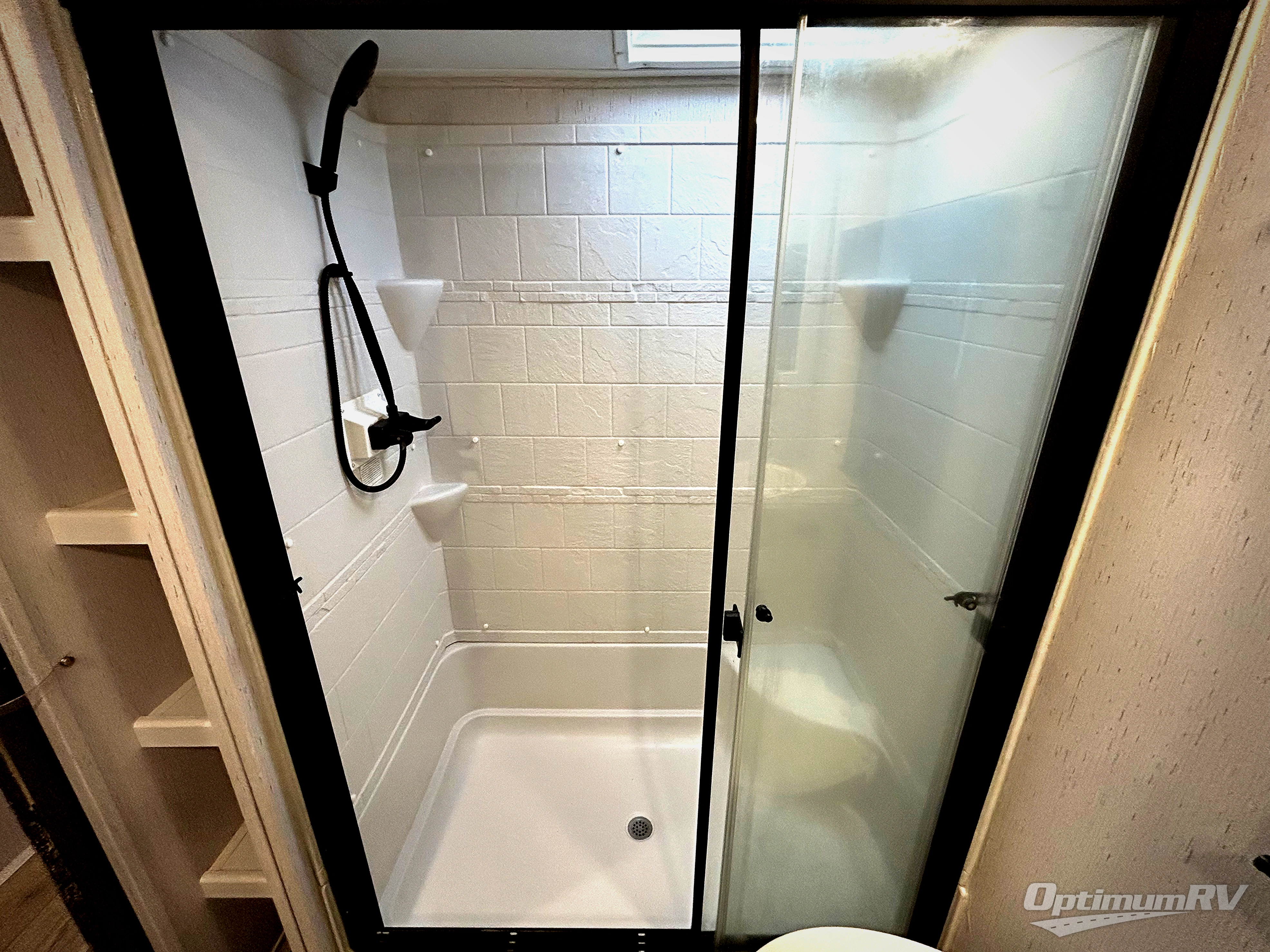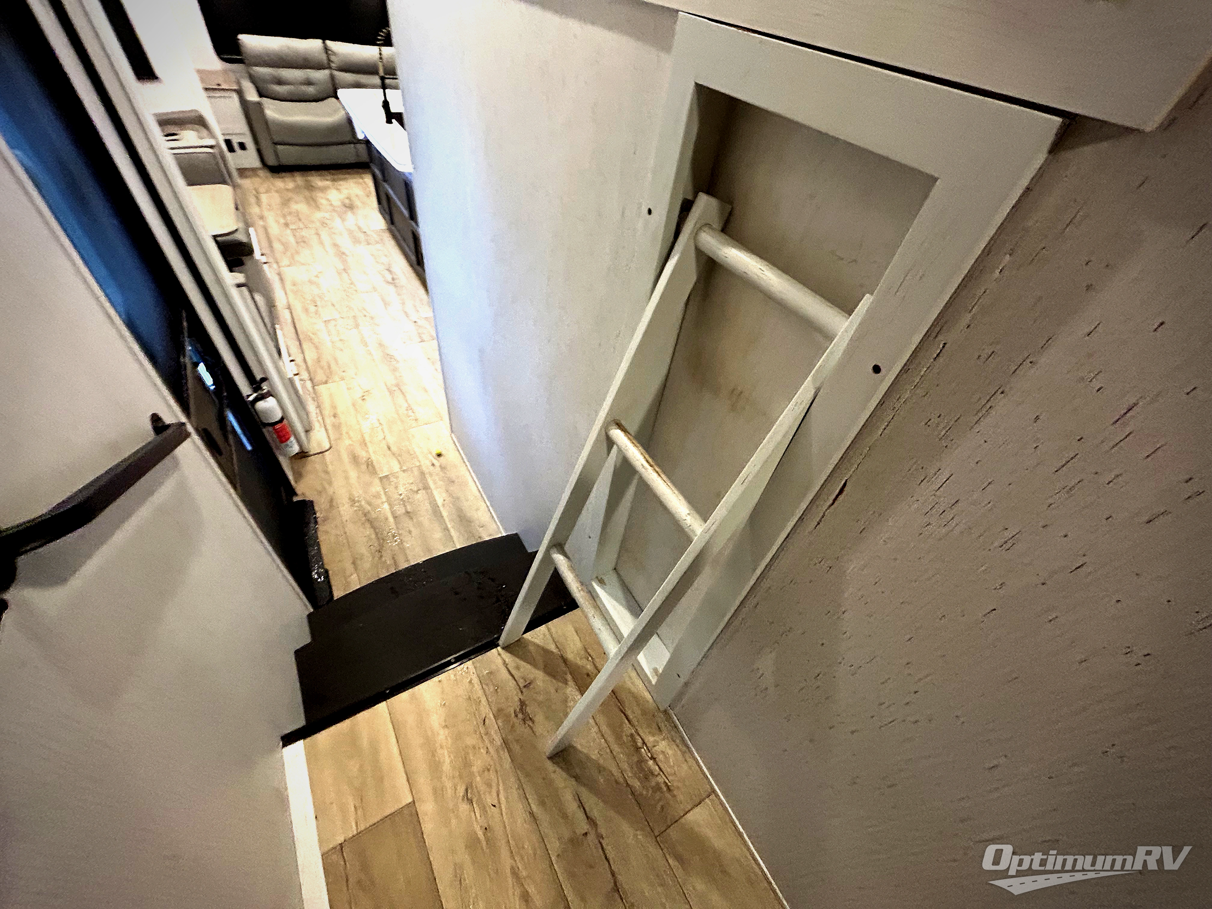 With a front bedroom and a middle multipurpose room in this fifth wheel, everyone will have a comfortable night's sleep when you include the living room furniture and the loft bed as sleeping space! The front private bedroom has a king bed slide and a front wardrobe to keep your clothes looking their best. The multipurpose room features a sofa slide and storage below a loft bed which can be used for sleeping or storage. A couple other guests can join in too and sleep on the rear tri-fold sofa and the booth dinette once they are converted. The full bathroom has a dual sink vanity to make it easier for everyone getting ready in the mornings. You can prepare your best meals with the glass top three burner cooktop with 21" oven, the 16 cu. ft. refrigerator, and the kitchen island. The theater seating is conveniently across from the entertainment center with a 50" LED TV and the fireplace.