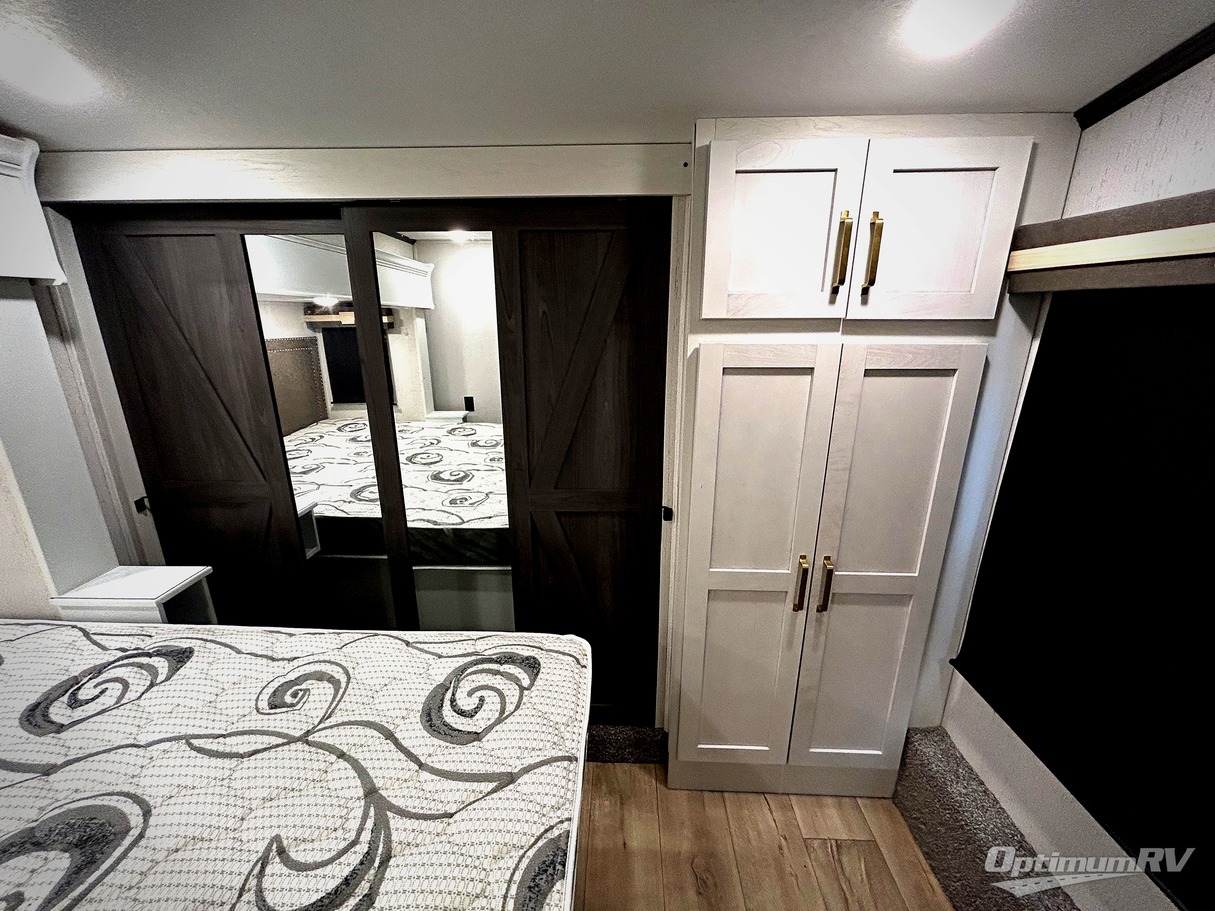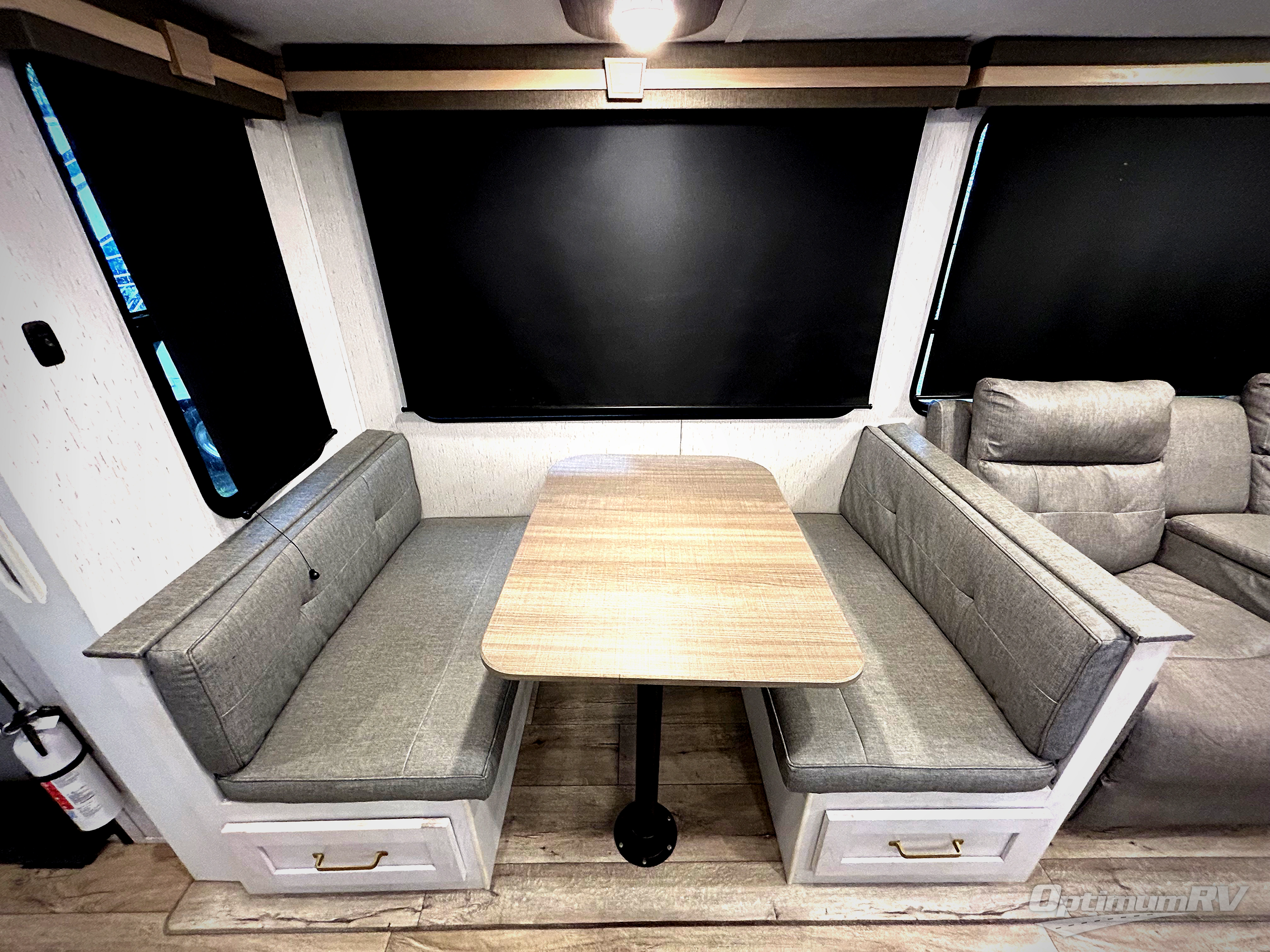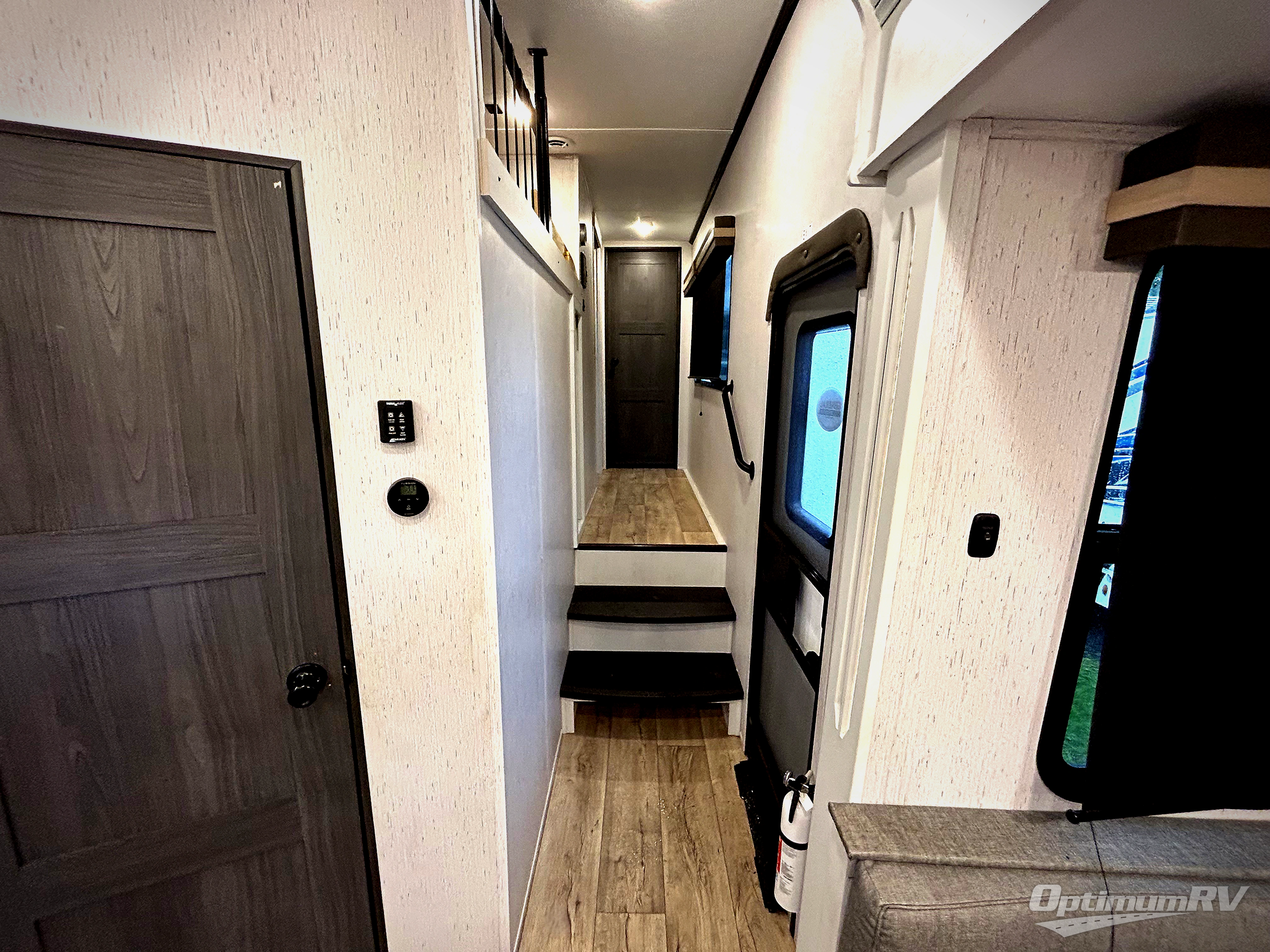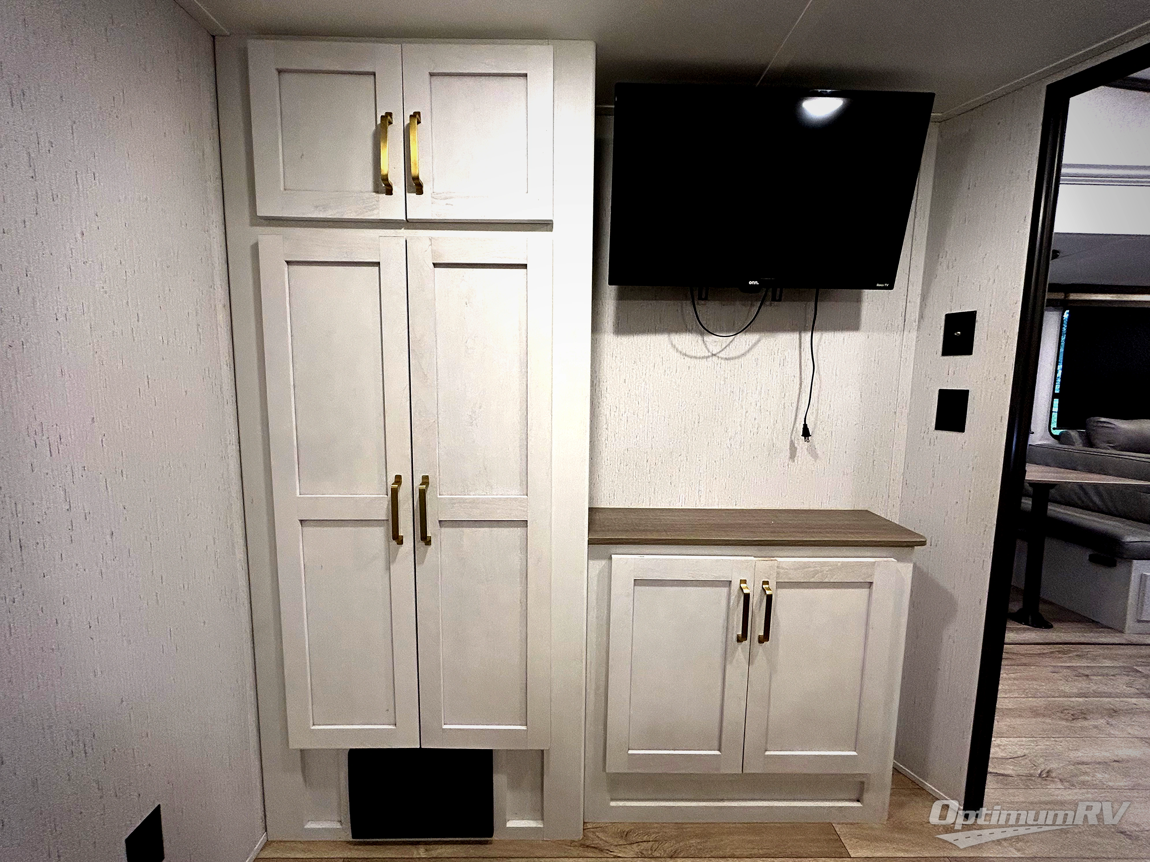 With a front bedroom and a middle multipurpose room in this fifth wheel, everyone will have a comfortable night's sleep when you include the living room furniture and the loft bed as sleeping space! The front private bedroom has a king bed slide and a front wardrobe to keep your clothes looking their best. The multipurpose room features a sofa slide and storage below a loft bed which can be used for sleeping or storage. A couple other guests can join in too and sleep on the rear tri-fold sofa and the booth dinette once they are converted. The full bathroom has a dual sink vanity to make it easier for everyone getting ready in the mornings. You can prepare your best meals with the glass top three burner cooktop with 21" oven, the 16 cu. ft. refrigerator, and the kitchen island. The theater seating is conveniently across from the entertainment center with a 50" LED TV and the fireplace.