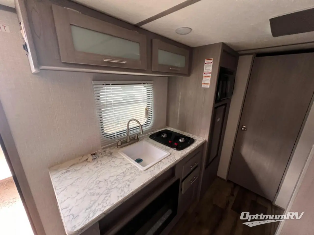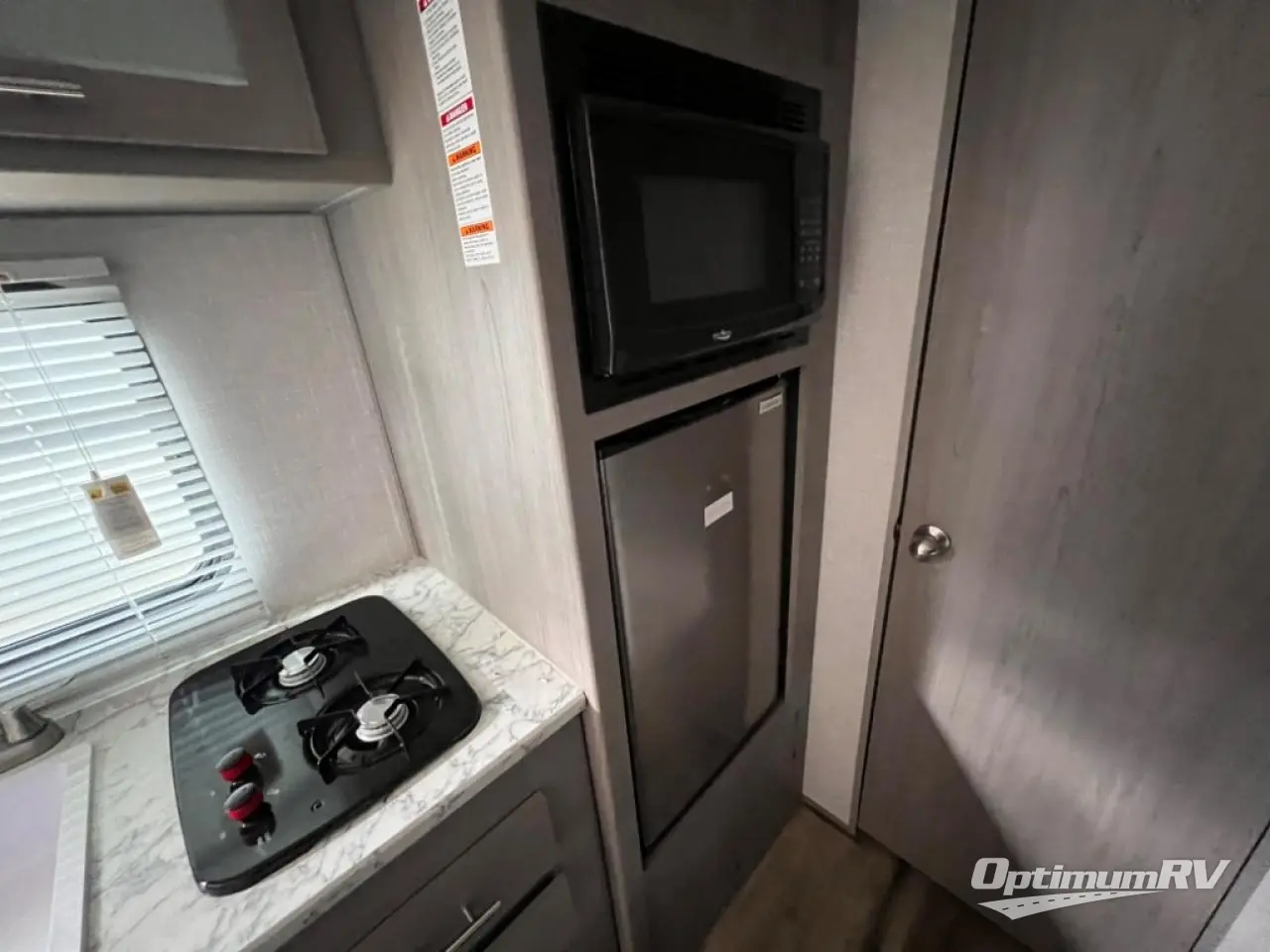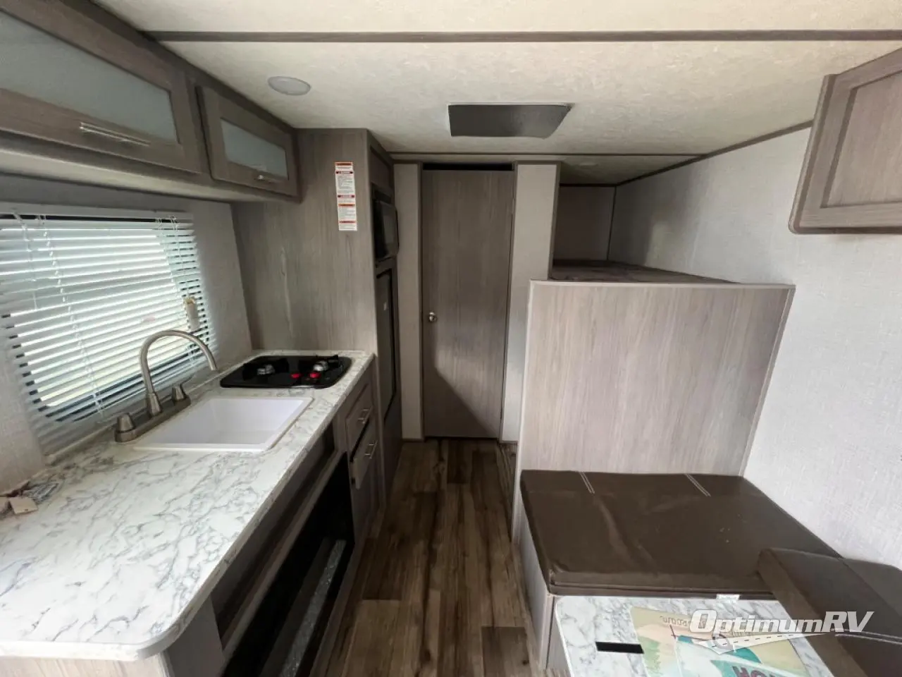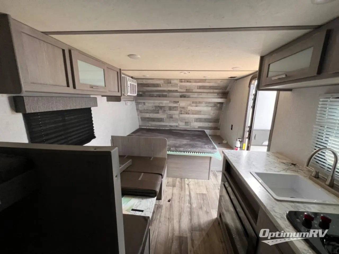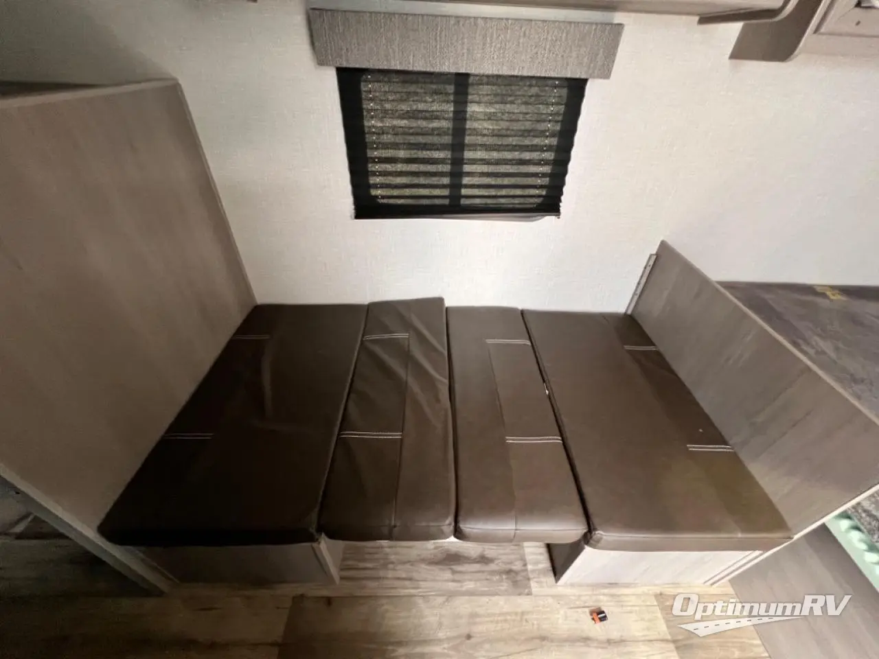 After making dinner on the two burner cooktop or inside the microwave, you can dine at the booth dinette or outside under the 8' power awning if you brought along your camping chairs. Either way you will be comfortable and the dinette may even sleep one person if needed. After playing outdoors all day, everyone can return to get cleaned up in the private toilet and shower room then fall asleep on the queen bed up front or the bunk beds in the rear. And everyone can wake up the next morning to do it over again.
