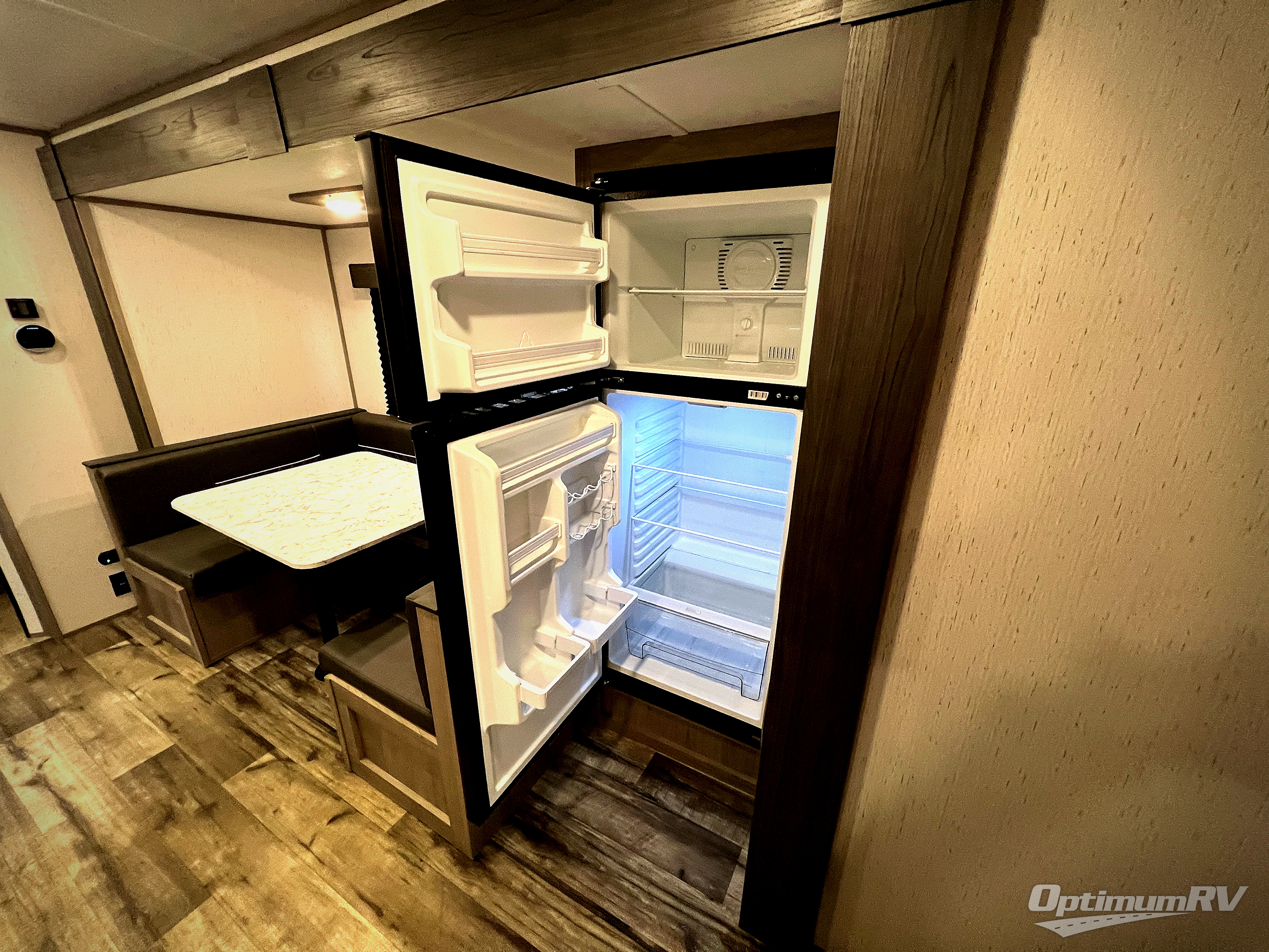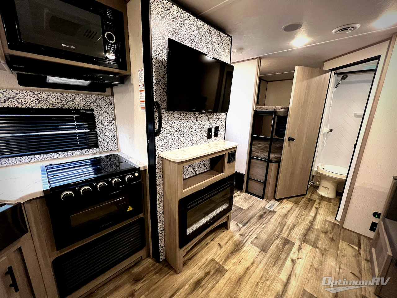 If you enjoy making memories and telling lots of stories, then take this trailer with you on your next trip! You will be able to offer sleeping space for four on the double-size bunks in the rear next to the entry and the full bathroom, plus the conventional U-shaped dinette once easily setup for bedtime gives two more a space to call theirs. Of course, the front bedroom with a queen bed and dual wardrobes will be all yours especially when you want privacy. Everyone can gather around the U-shaped dinette to visit, plan the day's activities, and enjoy the fireplace while the cook makes meals using the kitchen appliances. And don't forget about the outside kitchen when cooking, and the power awning when you want to relax outside.