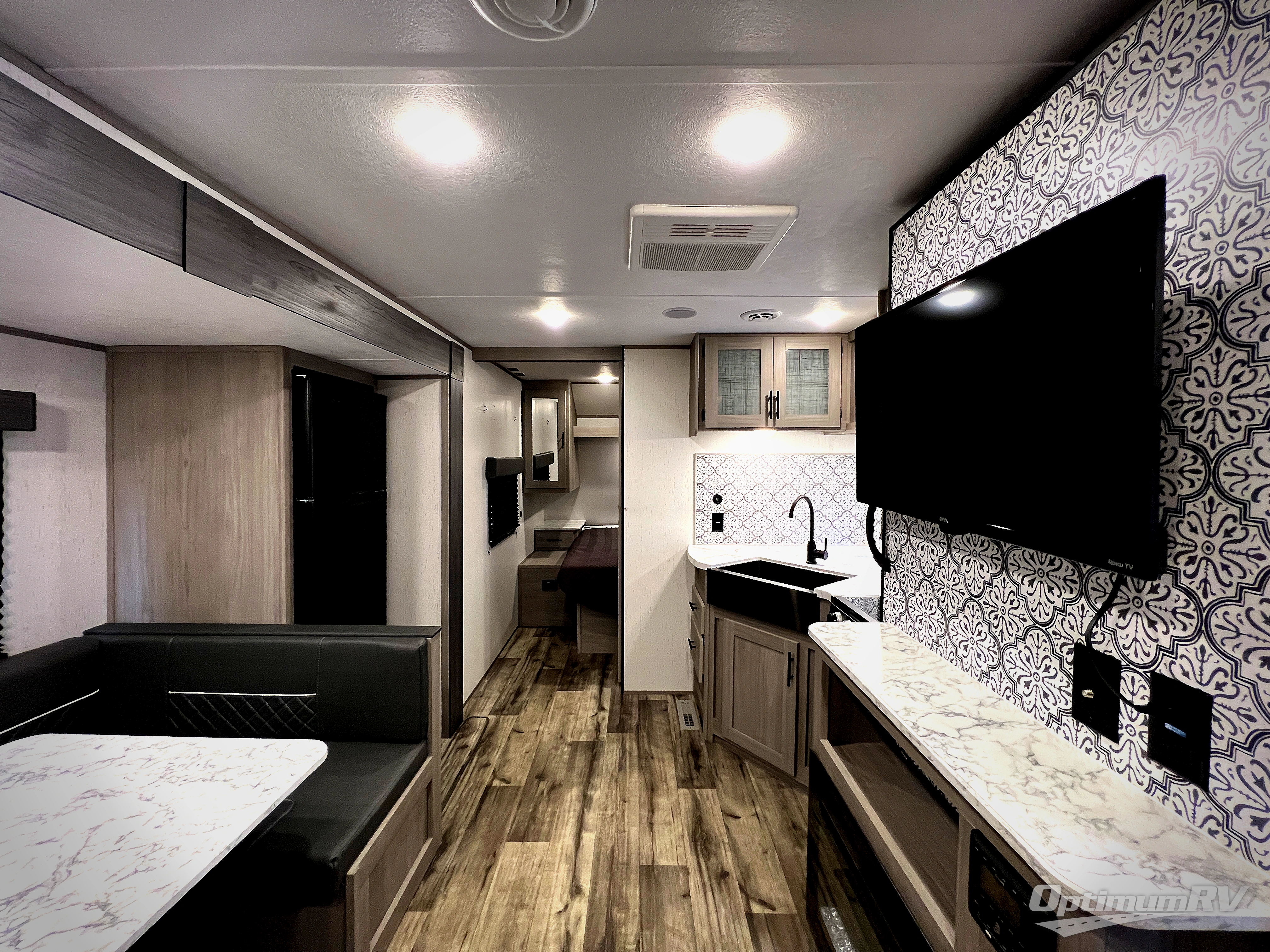 With any Coleman Lantern Series travel trailer and toy hauler travel trailer, the interior will impress with upgraded residential grade linoleum and Eyewear luxury furniture for style and durability, the undermounted large kitchen sink with stainless steel high-rise kitchen faucet, and seamless countertops, plus the hard valances in the living room and master bedroom and the AM/FM/CD/AUX/Bluetooth stereo. The Dutchmen construction advantage is included and provides a durable roof structure with a TPO roof, 3/8" decking, fiberglass insulation, and a lauan interior panel, plus an insulated structure with a metal exterior panel, a wood frame with R7 thermal insulation and an lauan interior panel. Also included is the Blade air flow system which helps reduce air turbulence and noise with duct elbows and wyes that feature enlarged inlets. Choose a Coleman Lantern Series because you appreciate quality, value and design when you camp!