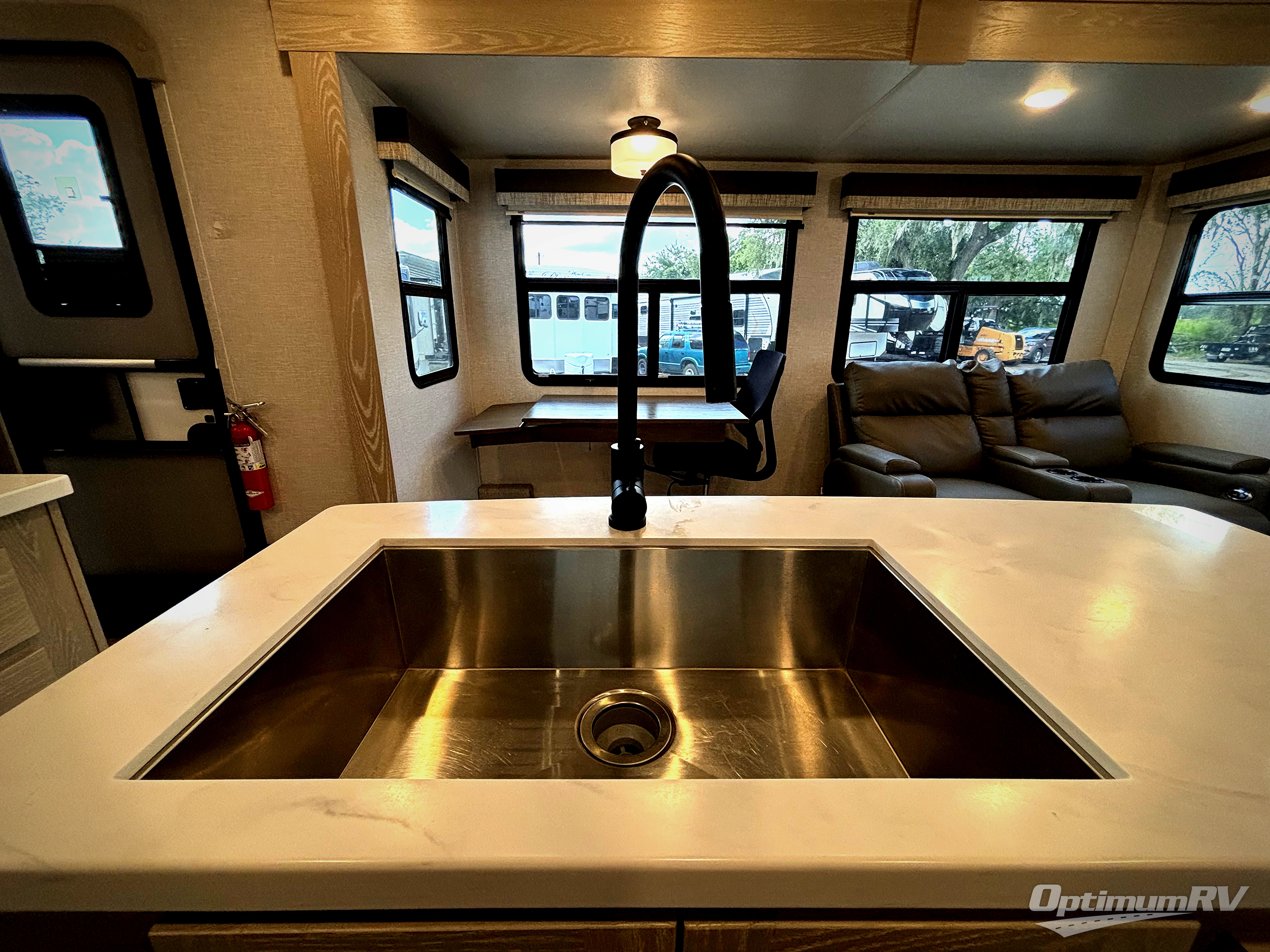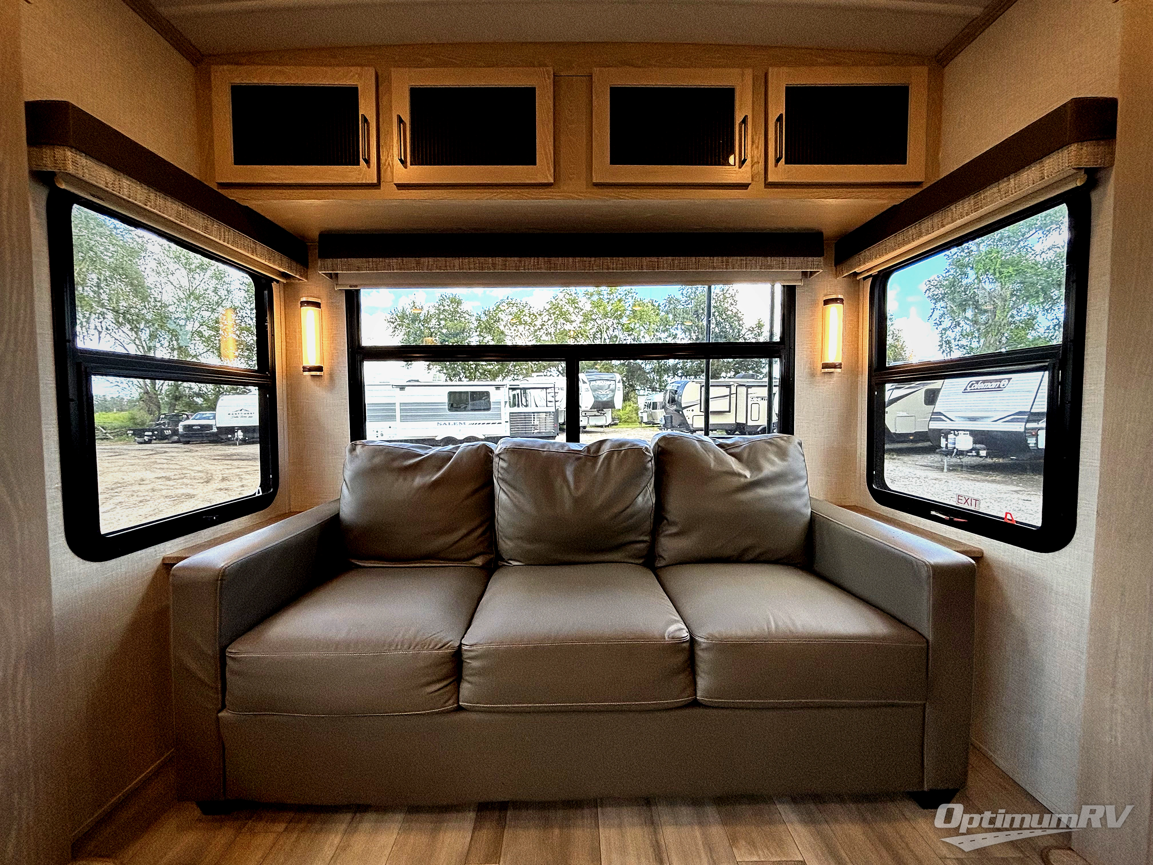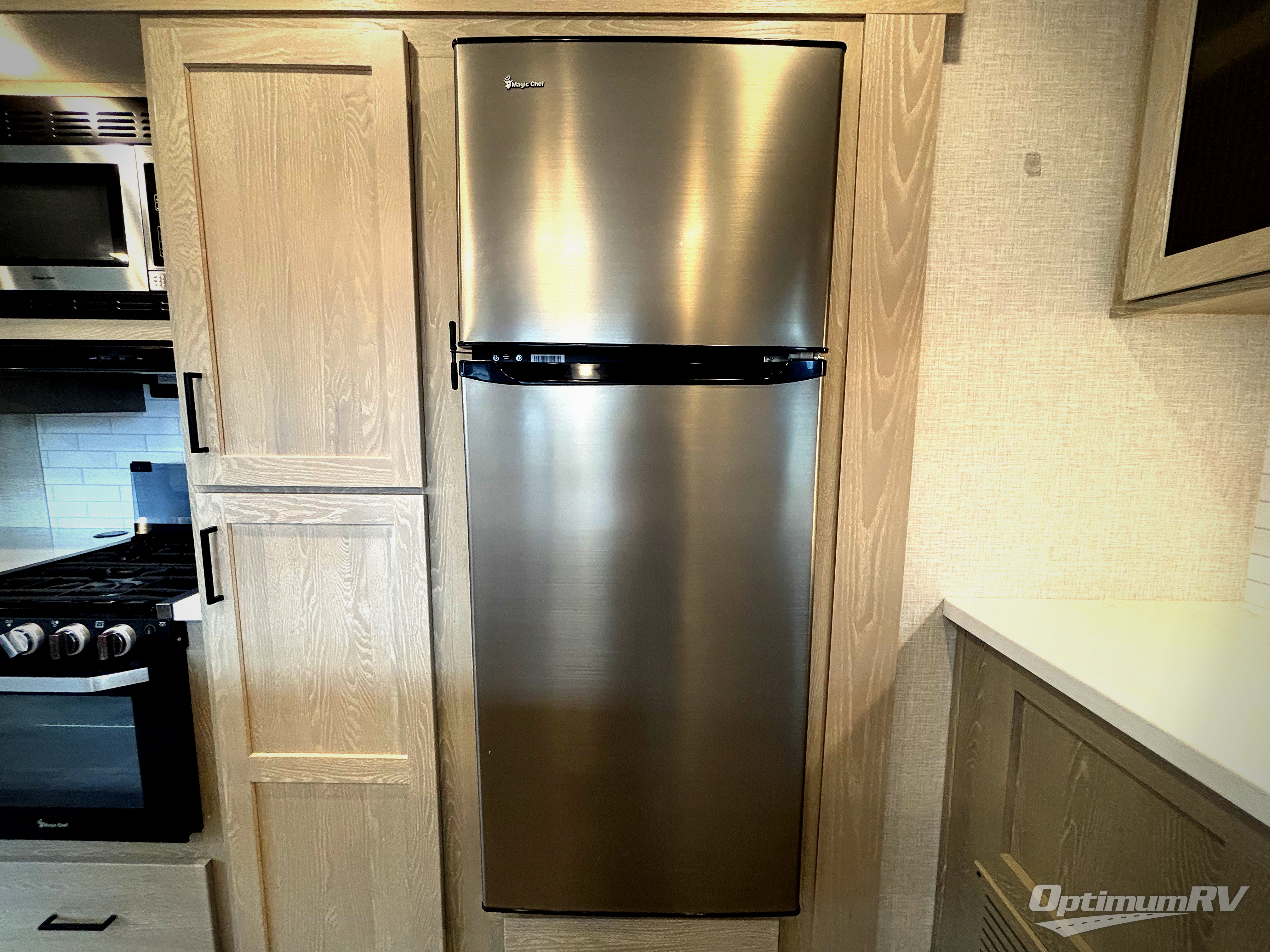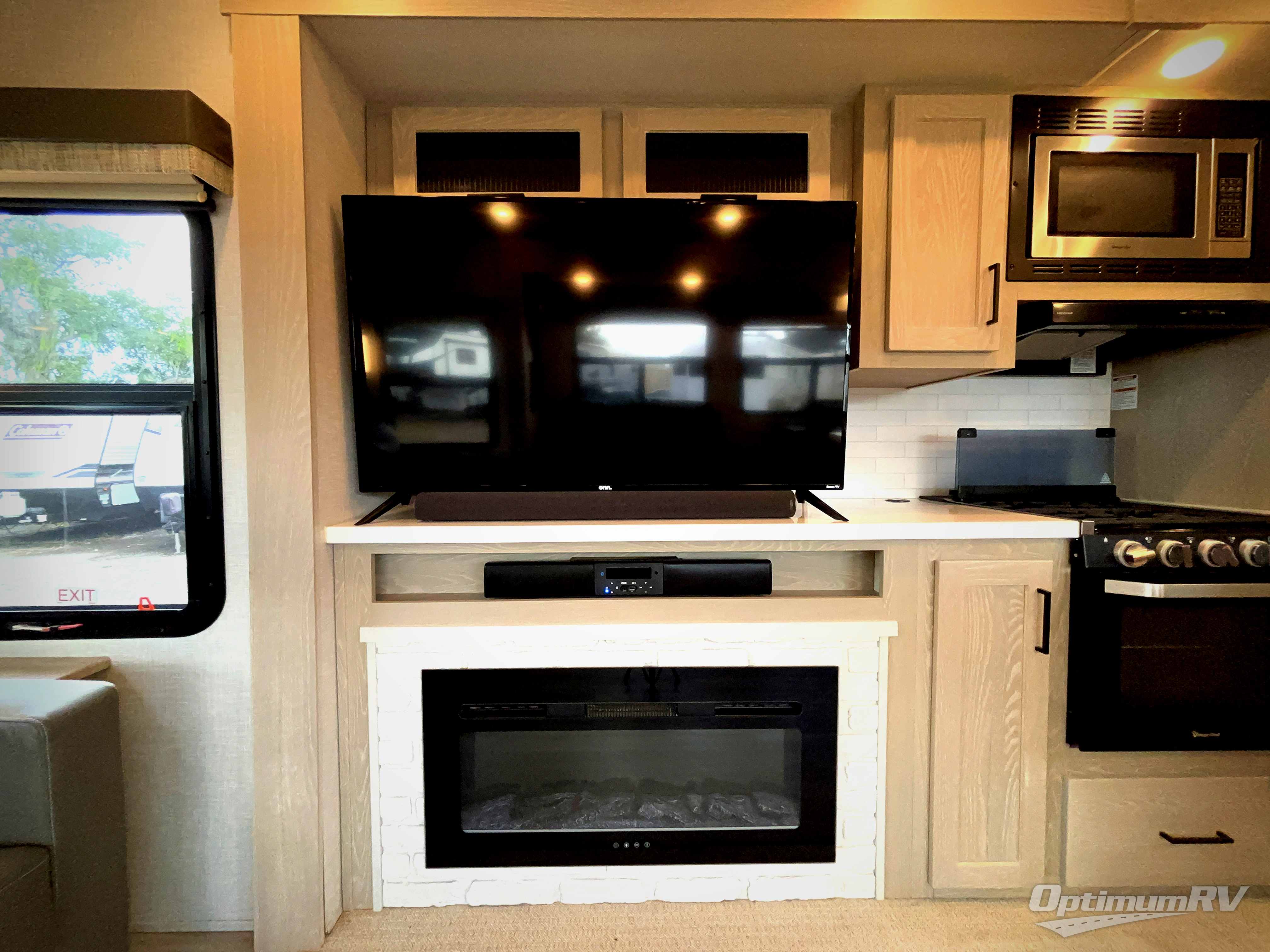 The large windows in the rear and door side slide will bring nature's scenery indoors with this travel trailer! Everyone can relax together in the rear living area with the 76" hide-a-bed sofa and the 60" theater seating across from the entertainment center with a fireplace. Meal prepping will be even easier with the kitchen island, and the 39" booth dinette is a comfortable place to enjoy your meals. The full bathroom has a shower with a seat and a linen closet to keep your towels close. You will feel well rested each morning after sleeping on the king bed slide in the front private bedroom which also has a wardrobe that is prepped to add an optional washer and dryer and an area to add an optional TV!