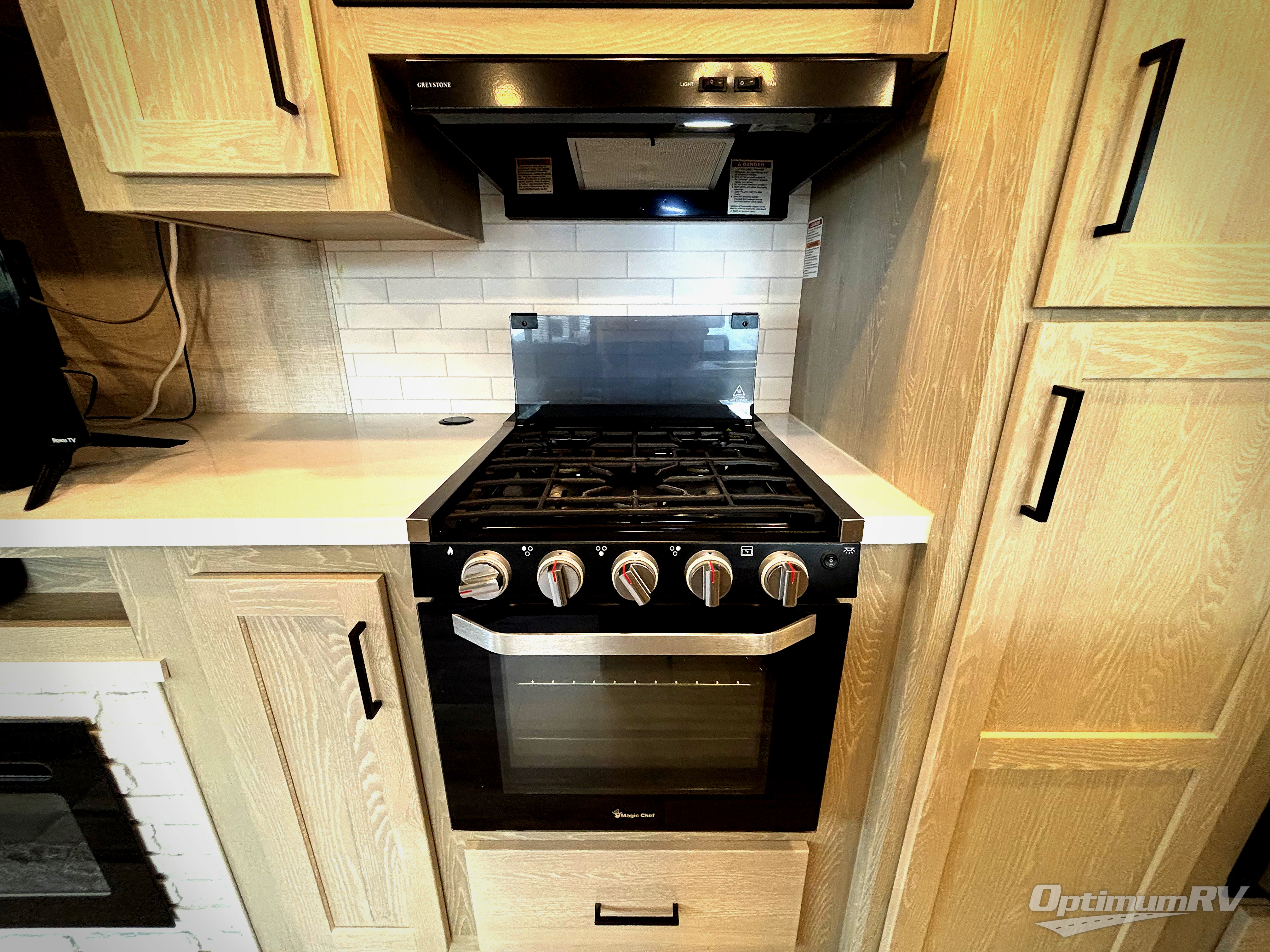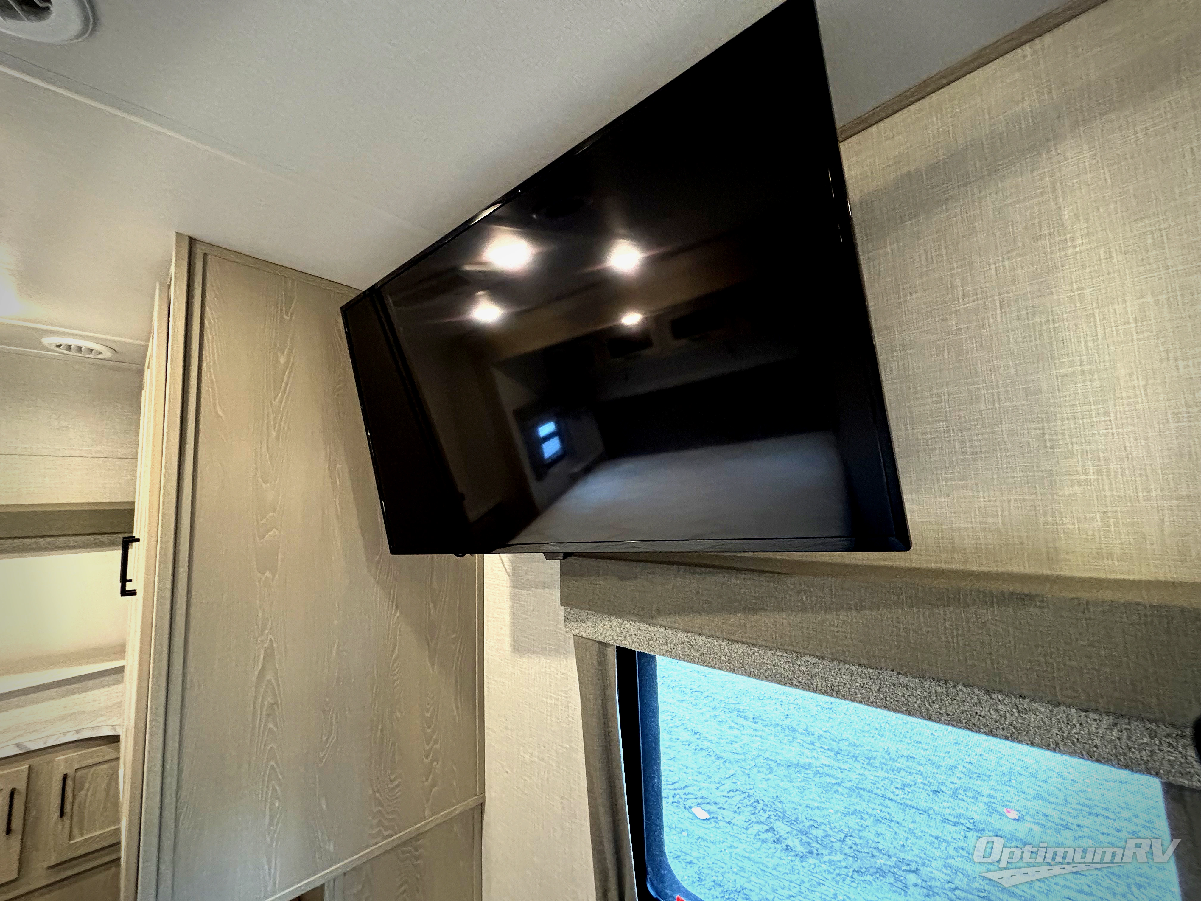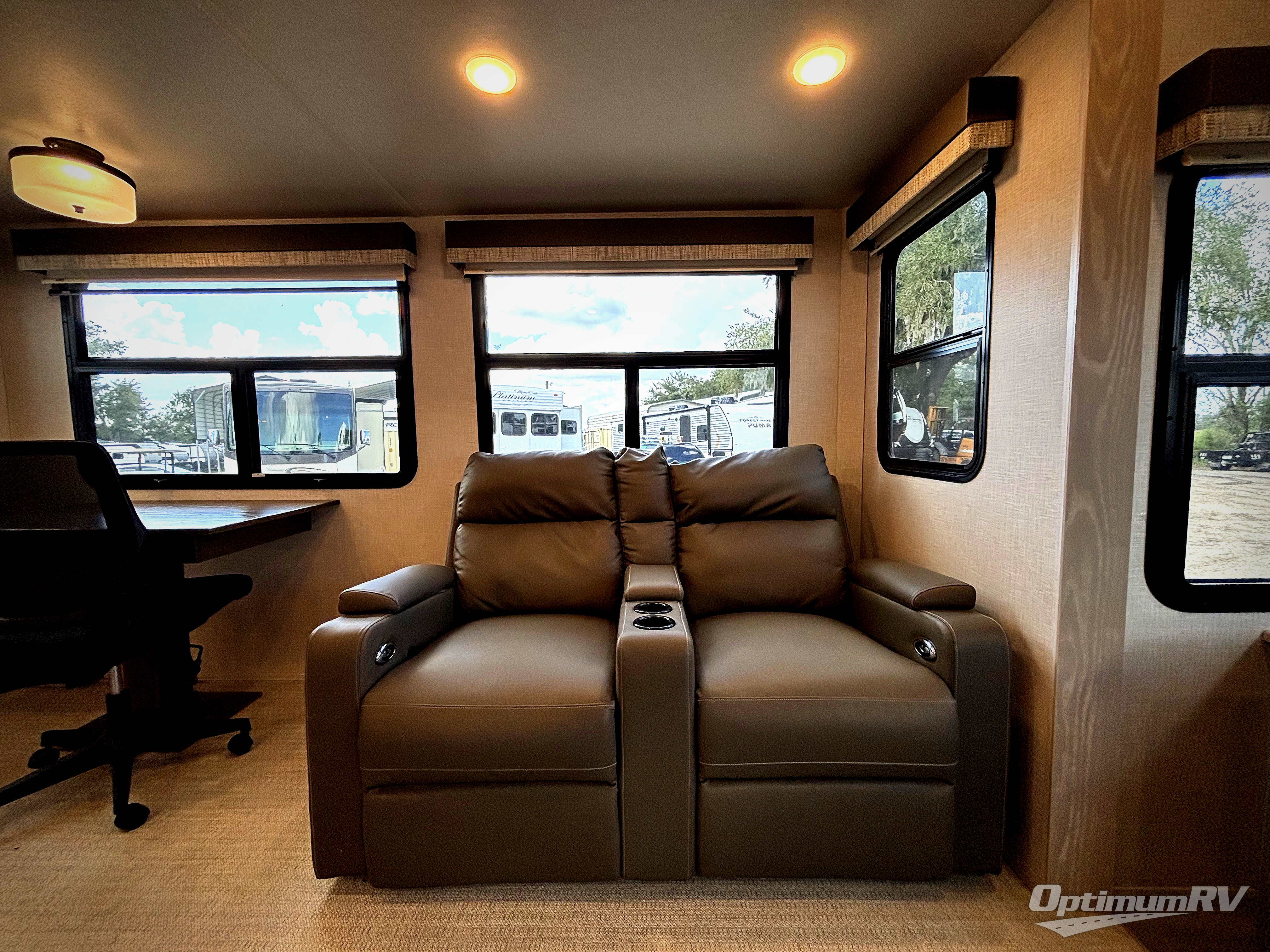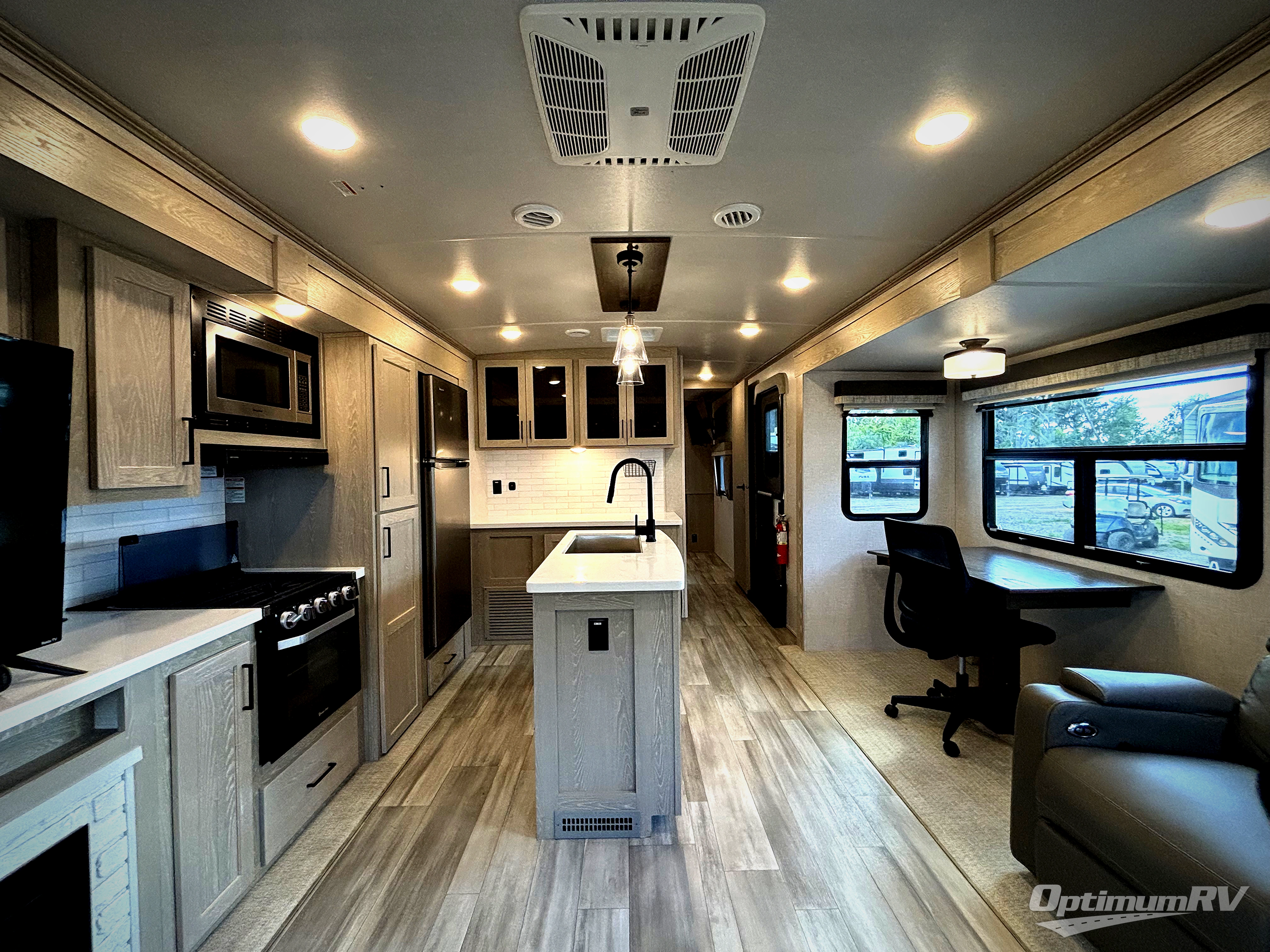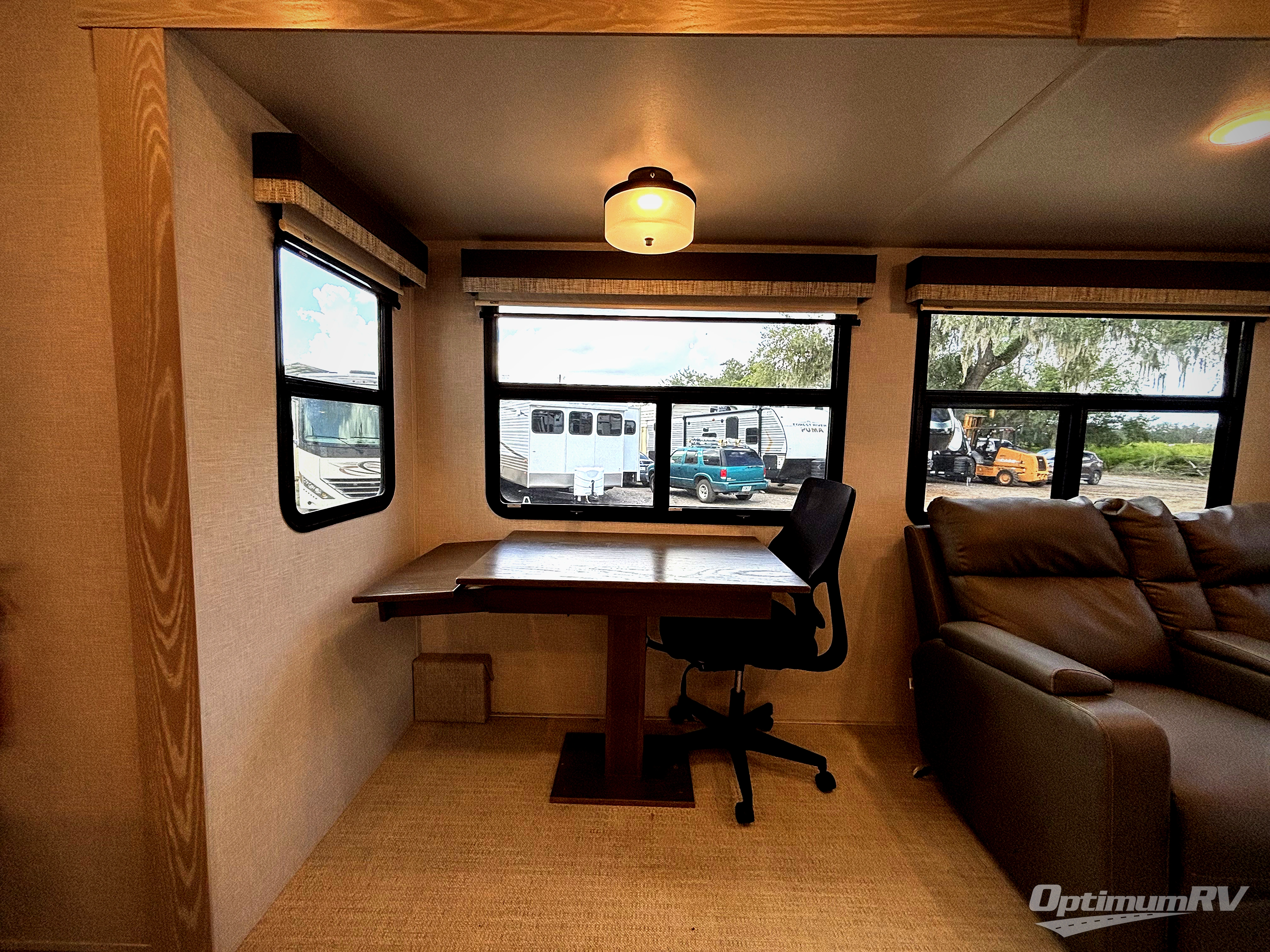 The large windows in the rear and door side slide will bring nature's scenery indoors with this travel trailer! Everyone can relax together in the rear living area with the 76" hide-a-bed sofa and the 60" theater seating across from the entertainment center with a fireplace. Meal prepping will be even easier with the kitchen island, and the 39" booth dinette is a comfortable place to enjoy your meals. The full bathroom has a shower with a seat and a linen closet to keep your towels close. You will feel well rested each morning after sleeping on the king bed slide in the front private bedroom which also has a wardrobe that is prepped to add an optional washer and dryer and an area to add an optional TV!
