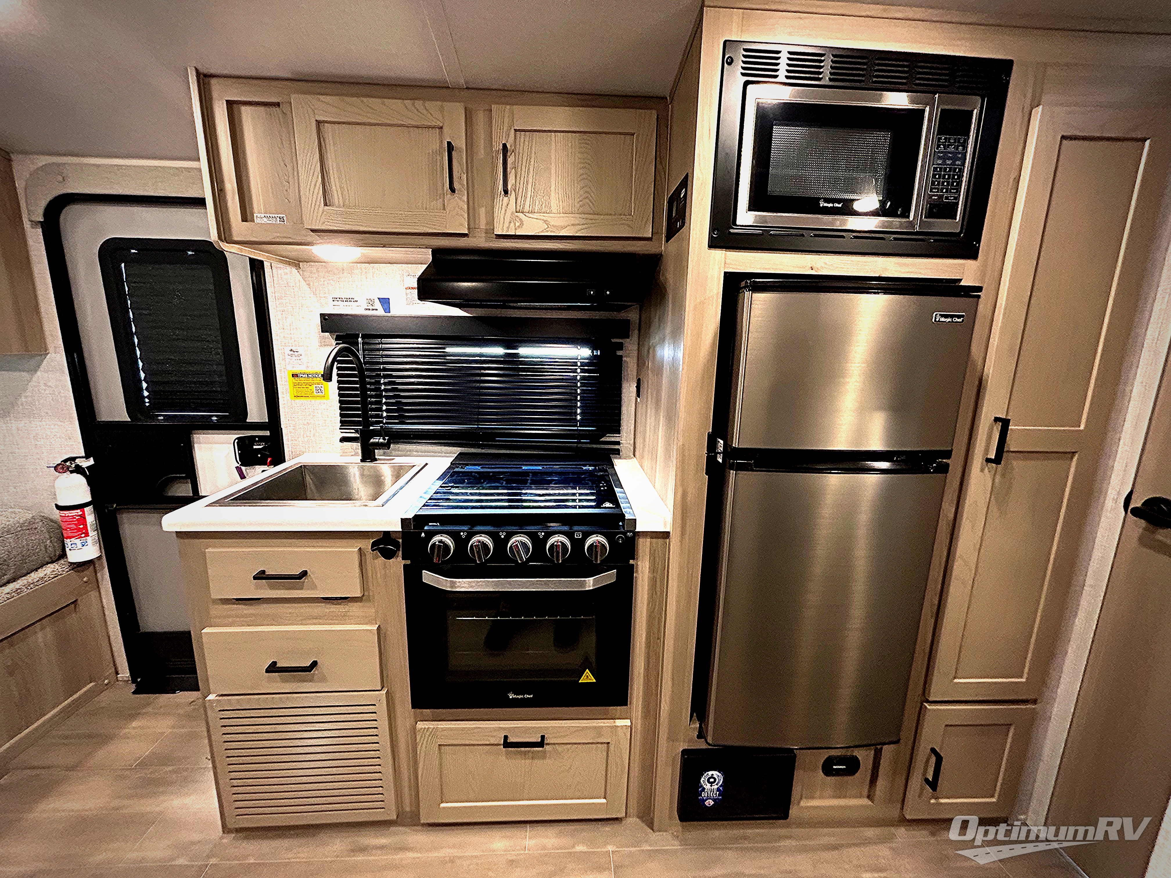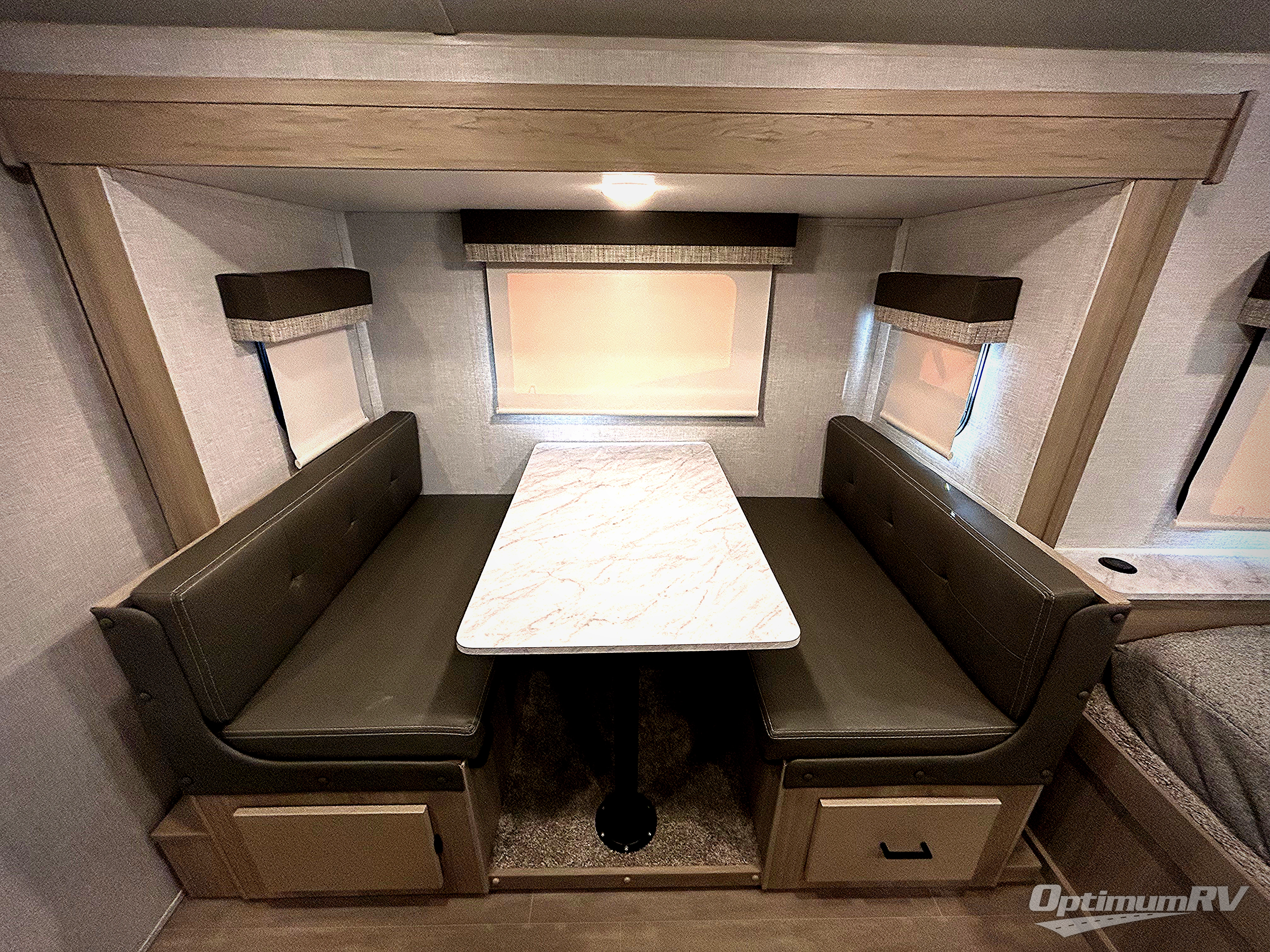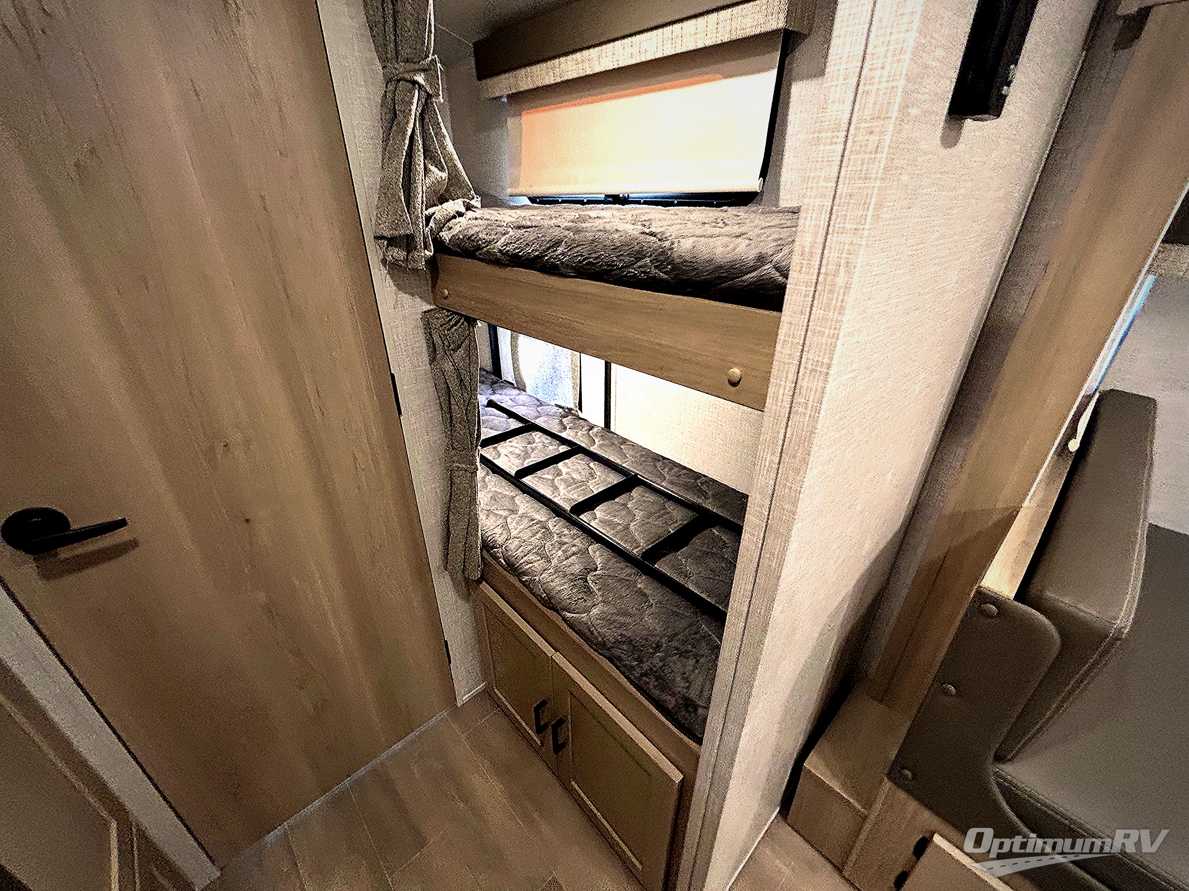 The largest bunk trailer in the E-Pro lineup will work perfectly for a family or friend group that enjoys their own sleeping space, plus more floor space with the dinette slide out that can sleep one to two. The bottom bunk even flips up so you can stow away your bikes, totes and such through the bike door for secure travels. There is exterior storage for more outdoor gear, and interior storage found throughout. The cook will love having a pantry and overhead cabinets for snacks, canned goods, dishes and more. After making a warm meal, the 12V refrigerator can hold the leftovers. The private toilet and shower/tub room gives you privacy and a place to get cleaned up after a fun day outdoors.