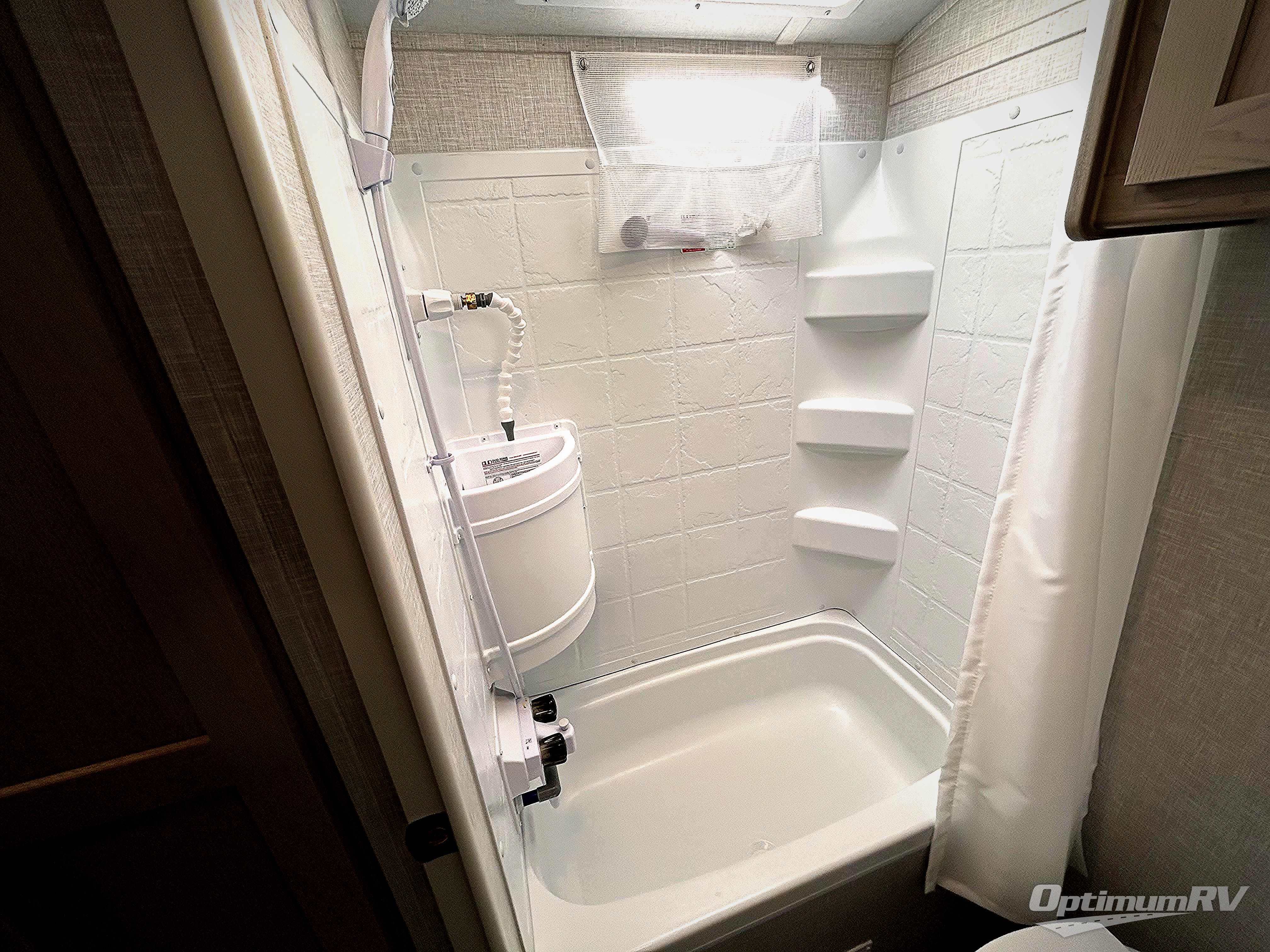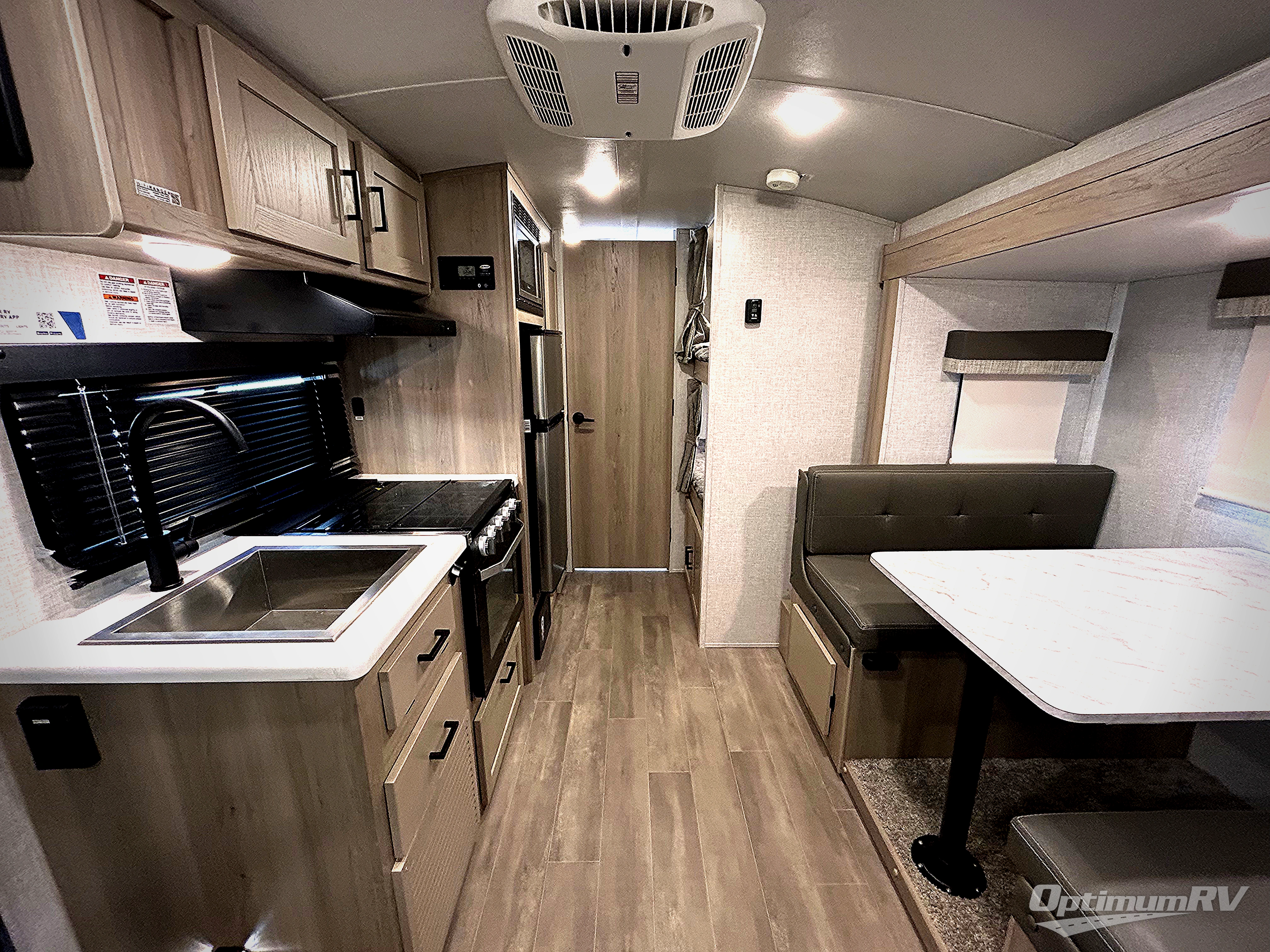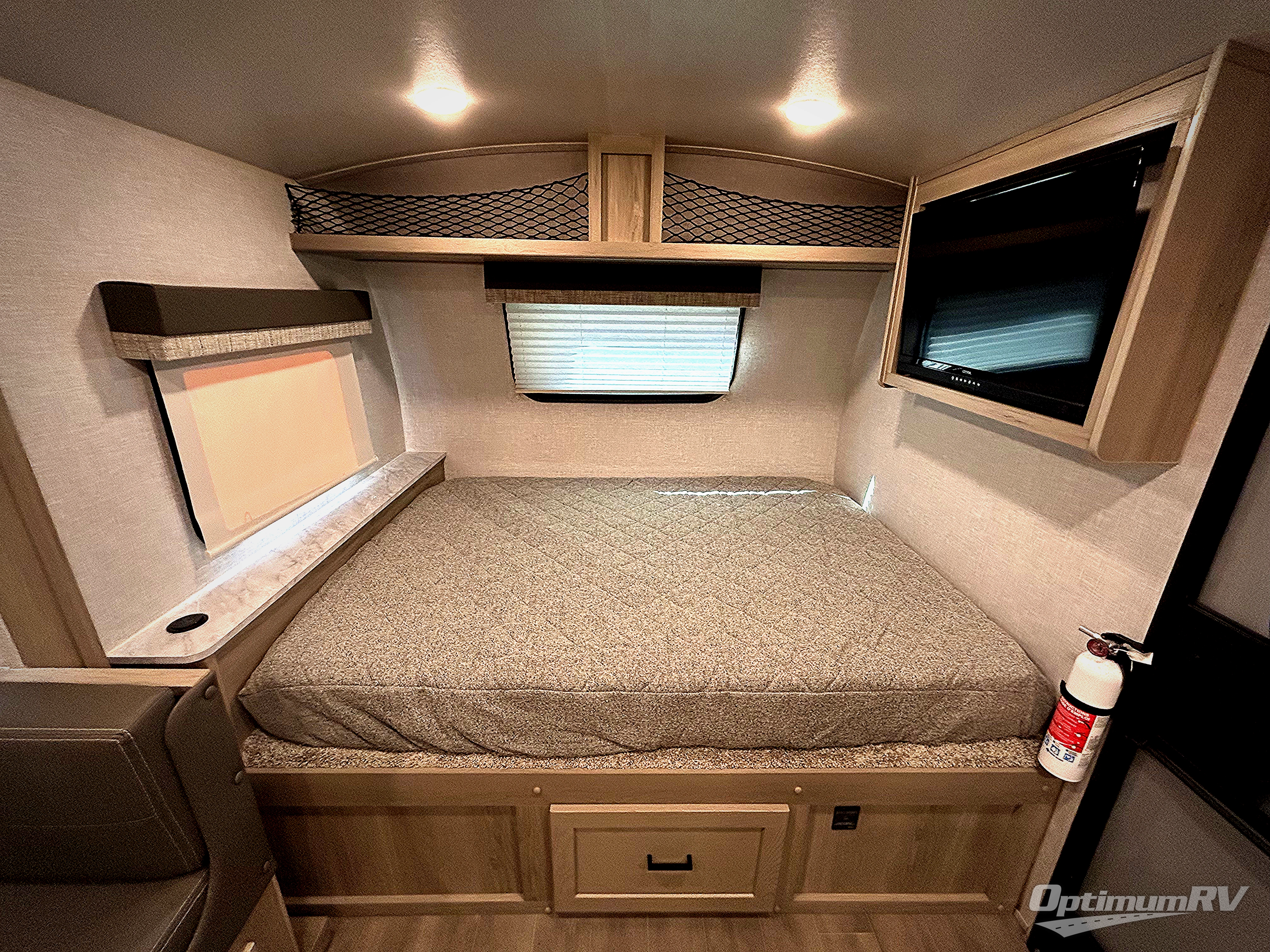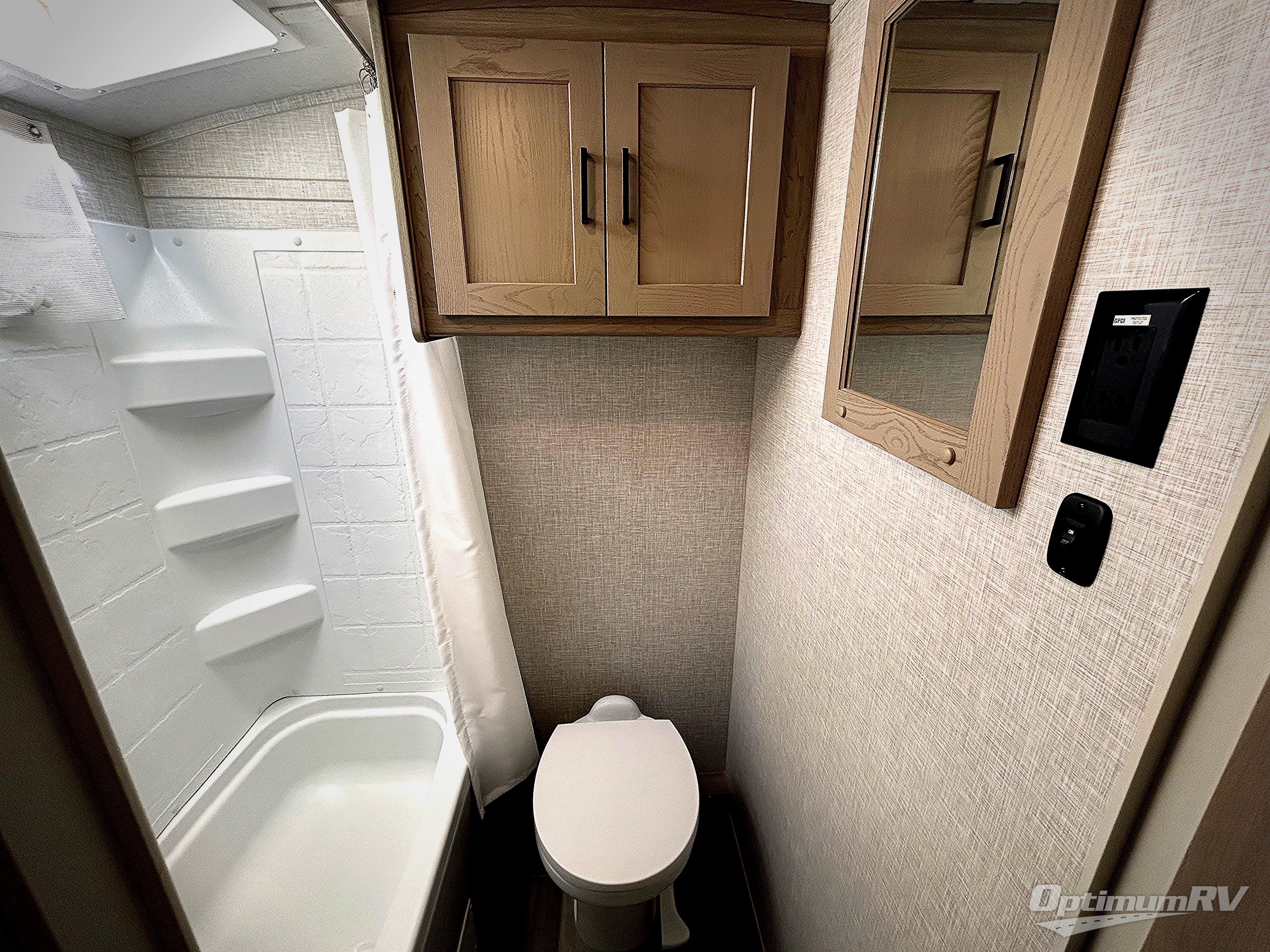 The largest bunk trailer in the E-Pro lineup will work perfectly for a family or friend group that enjoys their own sleeping space, plus more floor space with the dinette slide out that can sleep one to two. The bottom bunk even flips up so you can stow away your bikes, totes and such through the bike door for secure travels. There is exterior storage for more outdoor gear, and interior storage found throughout. The cook will love having a pantry and overhead cabinets for snacks, canned goods, dishes and more. After making a warm meal, the 12V refrigerator can hold the leftovers. The private toilet and shower/tub room gives you privacy and a place to get cleaned up after a fun day outdoors.